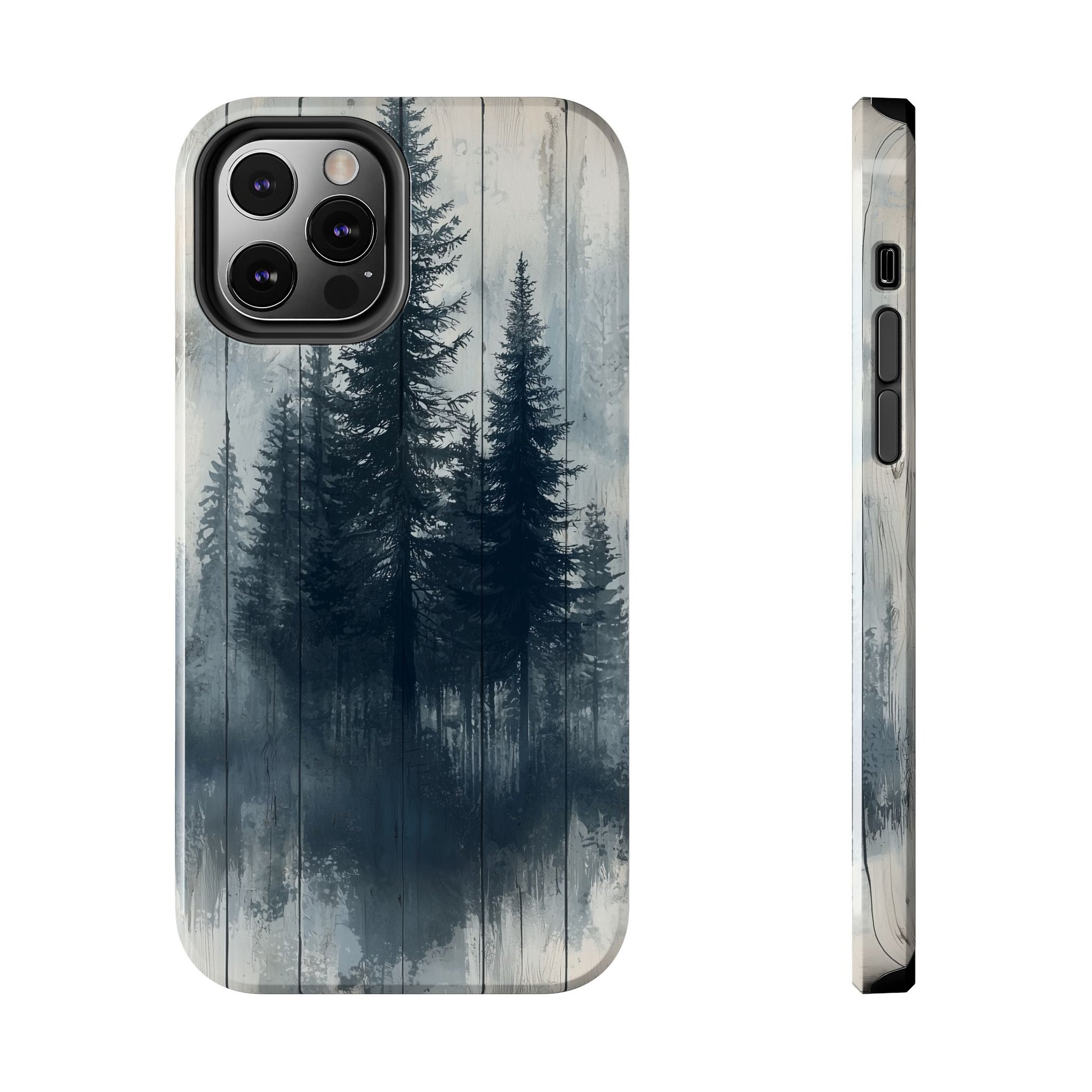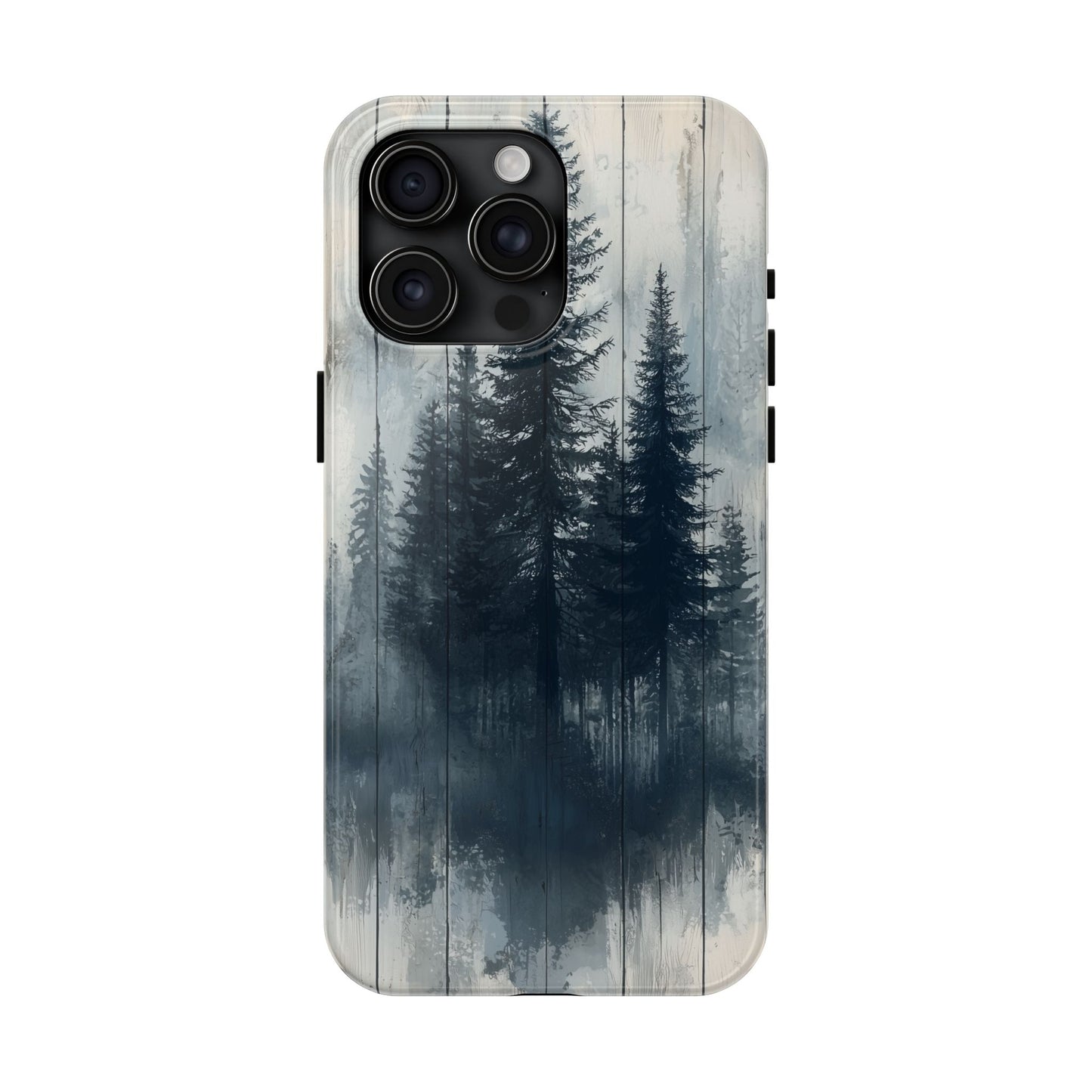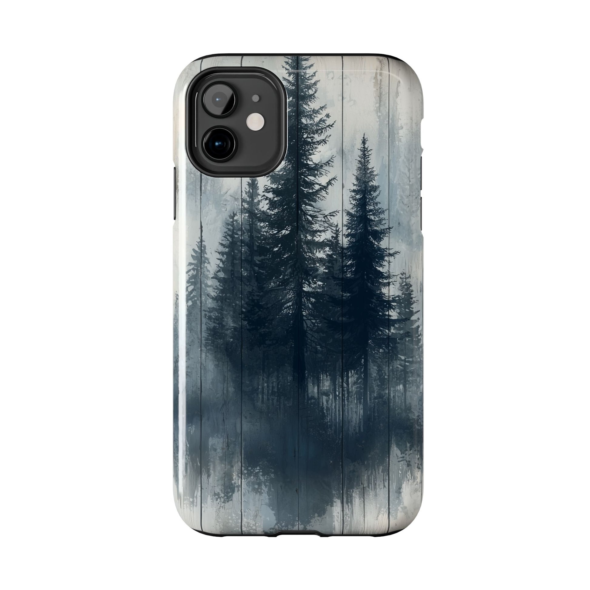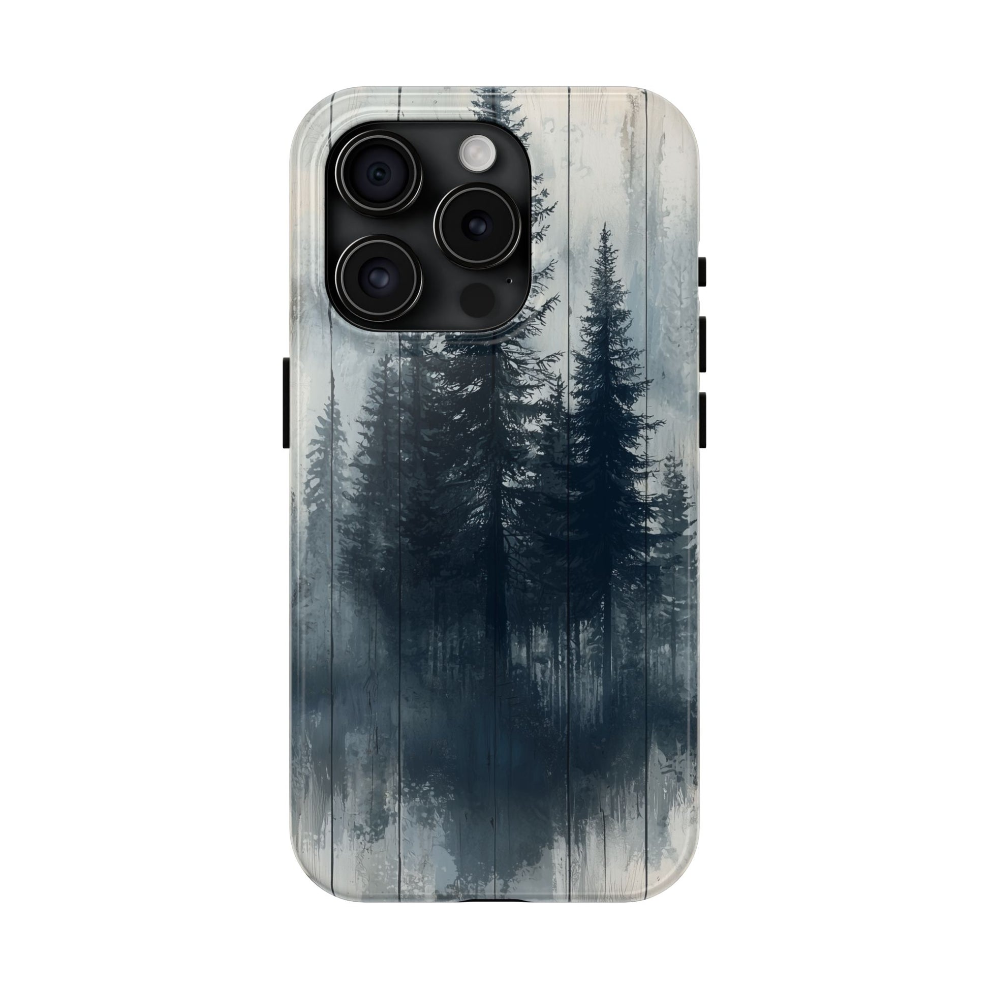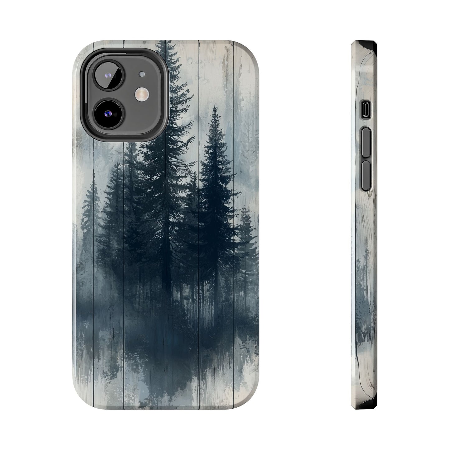Experience nature's calm with our Rustic Pine Forest iPhone Case. The design showcases a misty, blue-toned pine forest, artfully printed on a rustic wood-textured background, perfect for outdoor enthusiasts or lovers of tranquil landscapes.