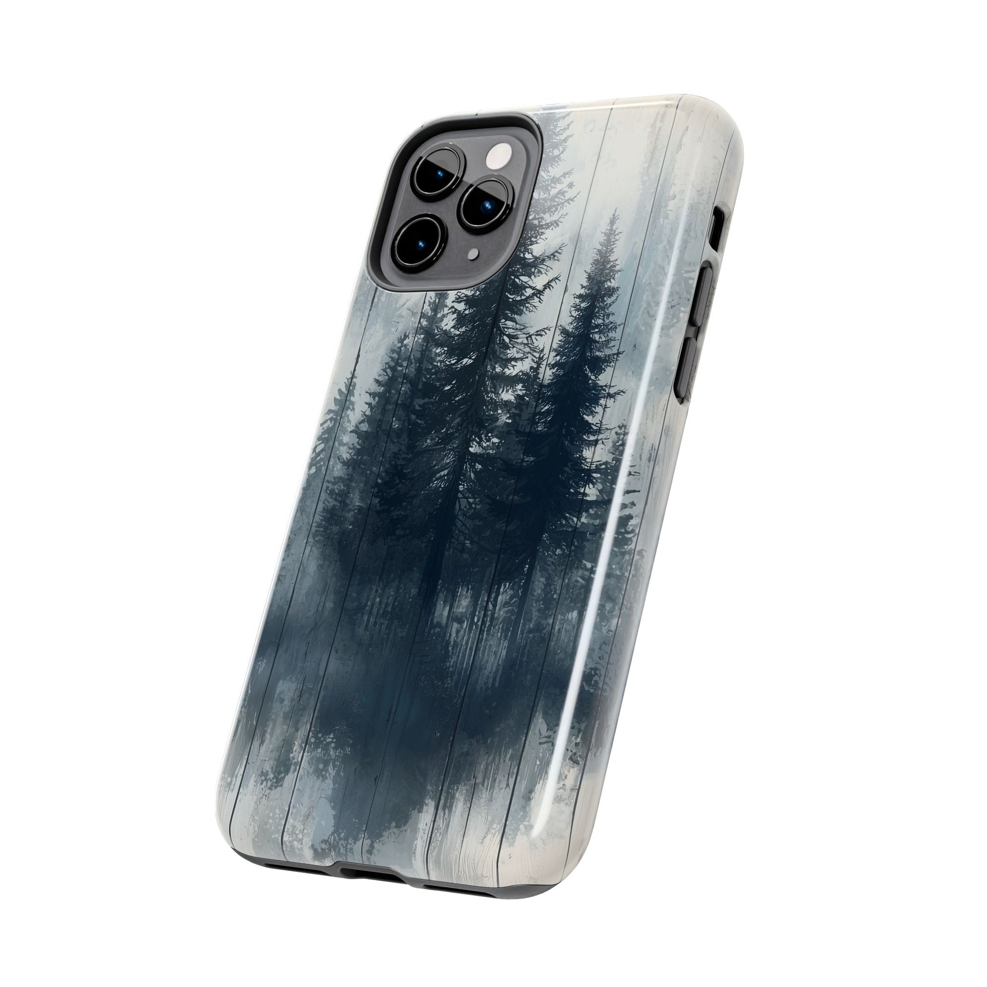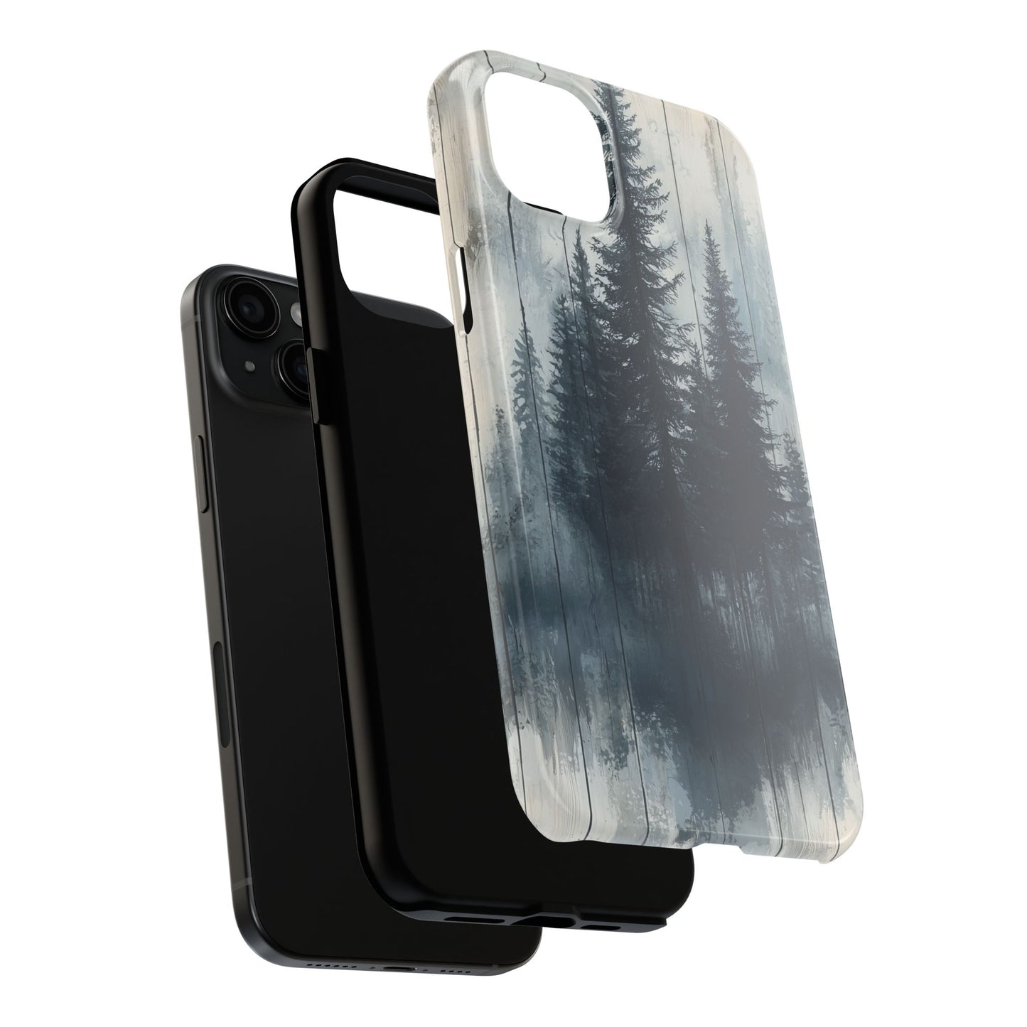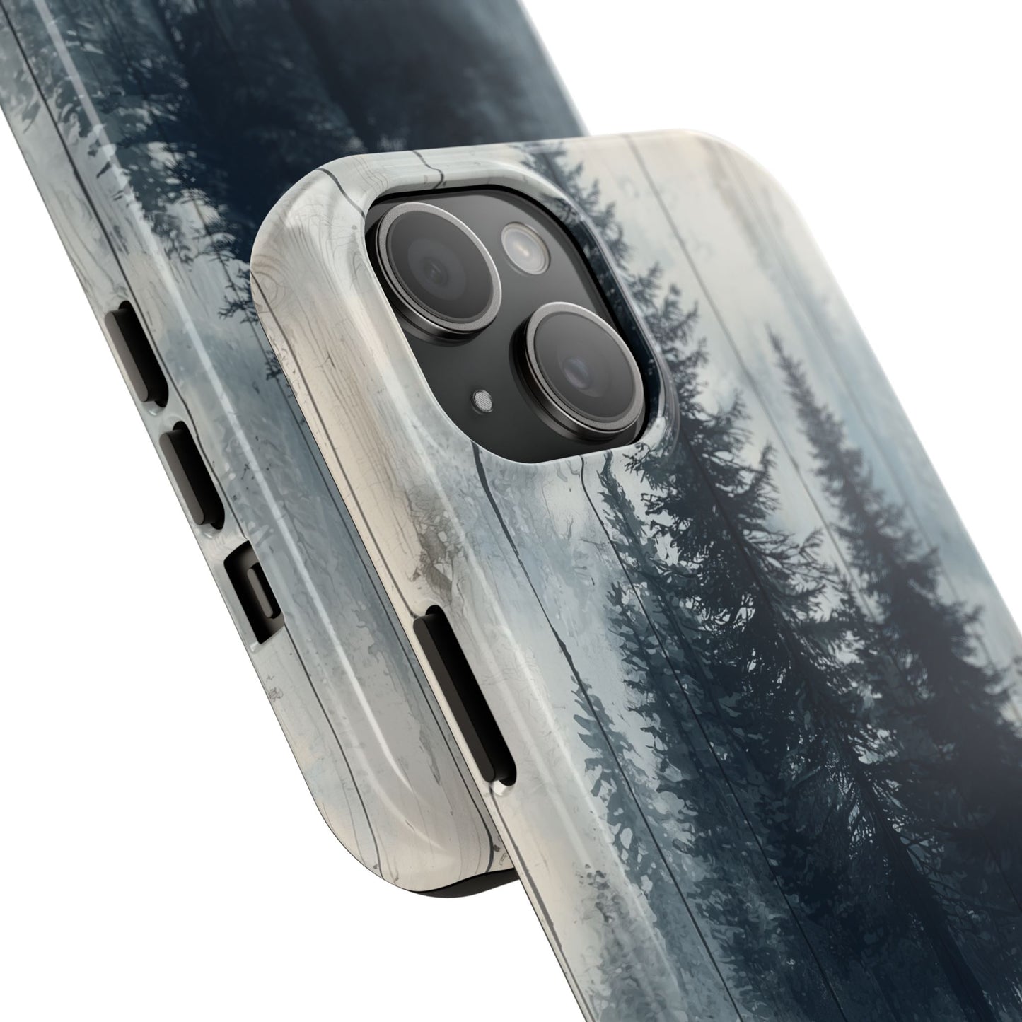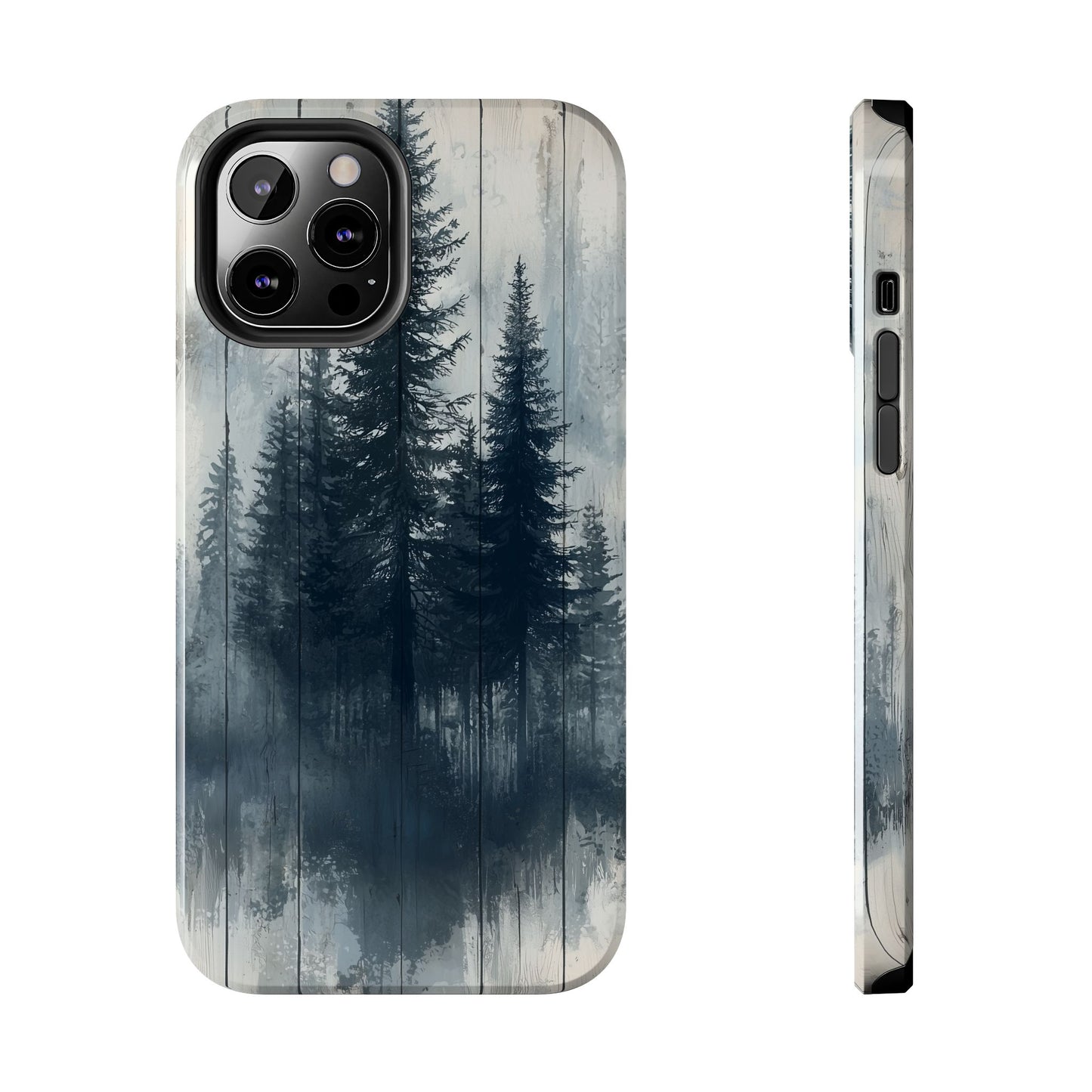 Experience nature's calm with our Rustic Pine Forest iPhone Case. The design showcases a misty, blue-toned pine forest, artfully printed on a rustic wood-textured background, perfect for outdoor enthusiasts or lovers of tranquil landscapes.