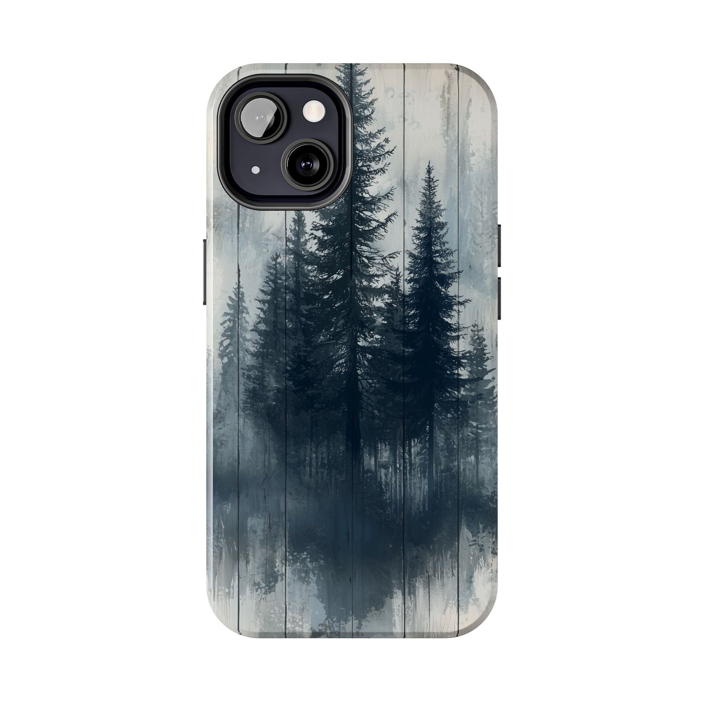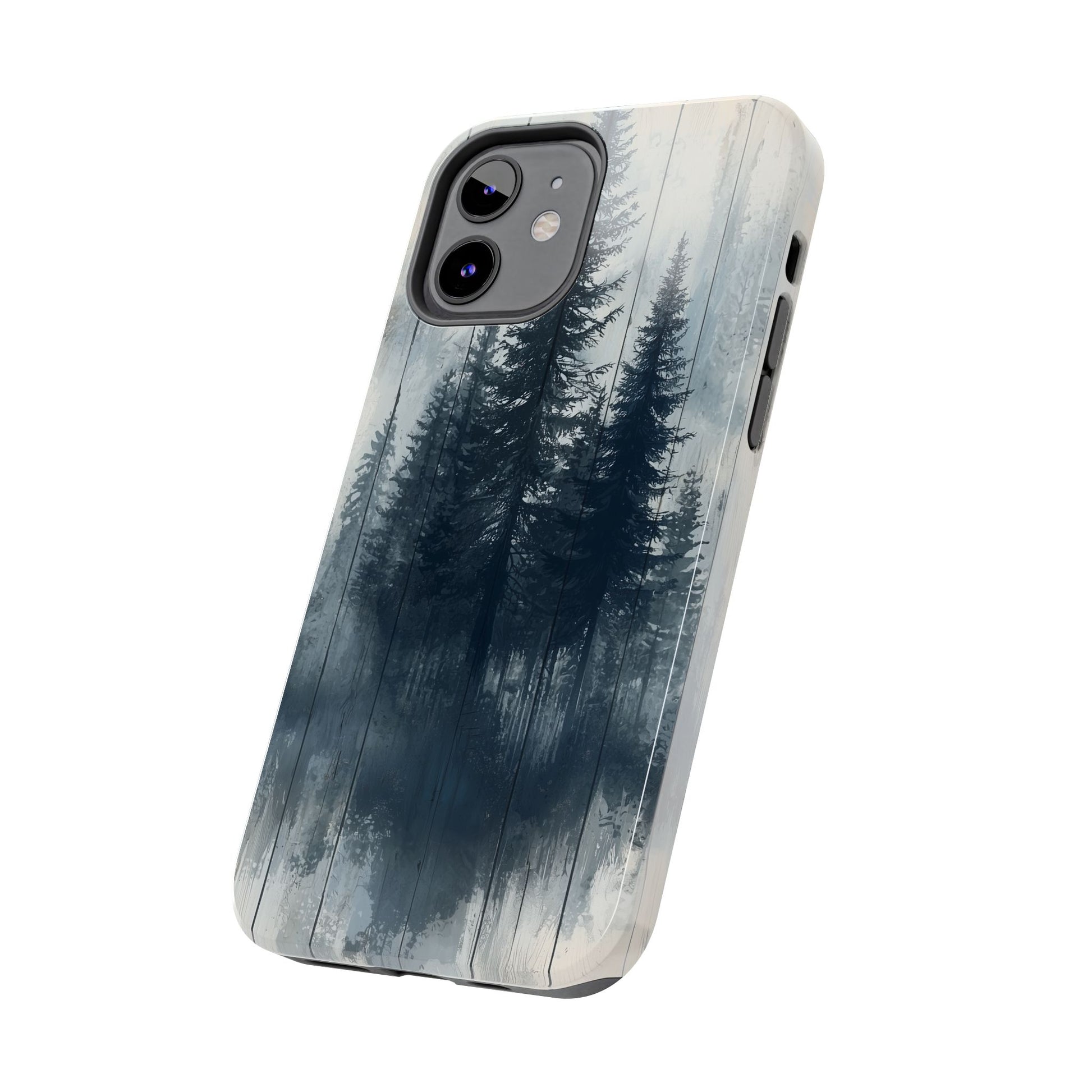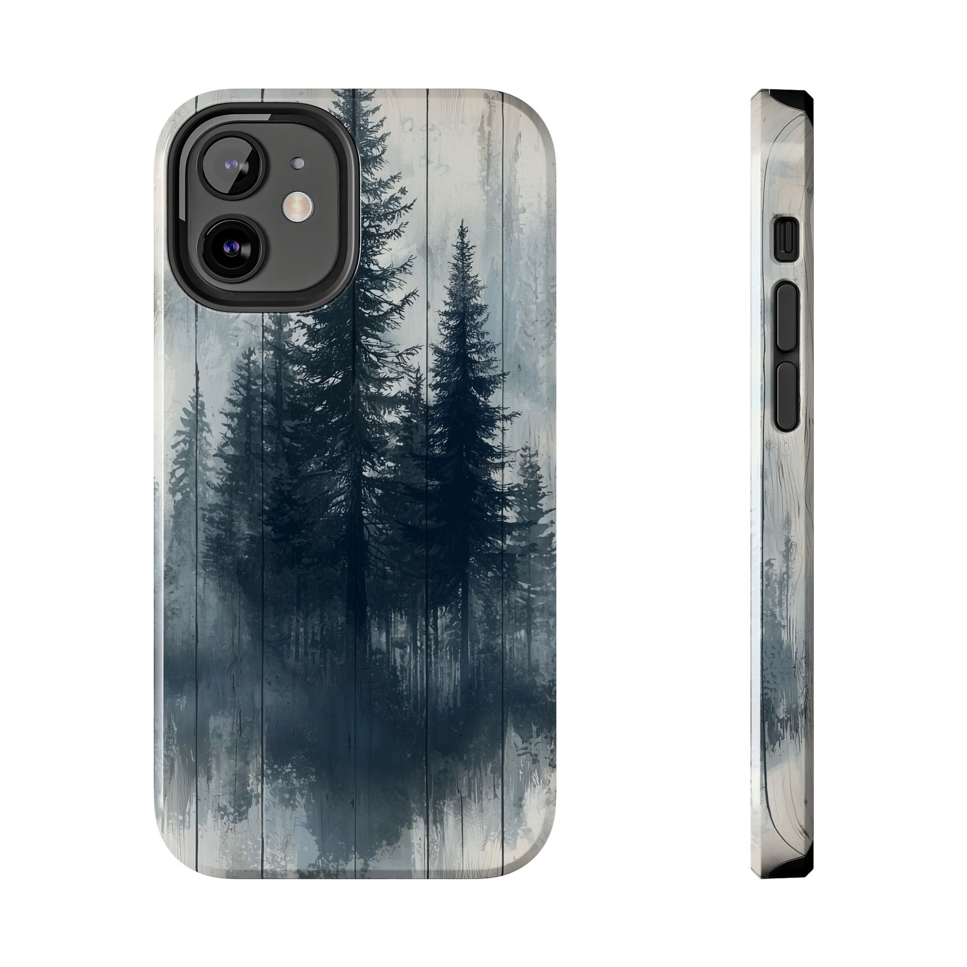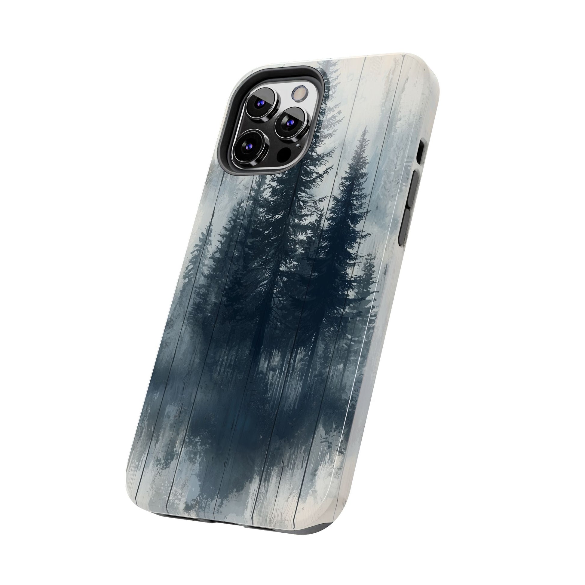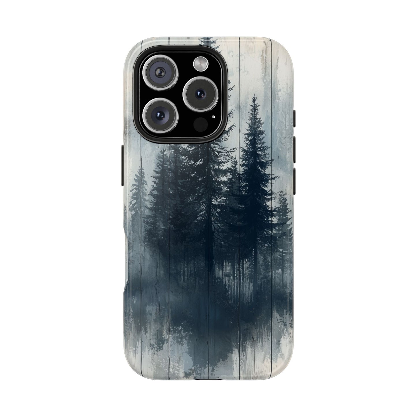 Experience nature's calm with our Rustic Pine Forest iPhone Case. The design showcases a misty, blue-toned pine forest, artfully printed on a rustic wood-textured background, perfect for outdoor enthusiasts or lovers of tranquil landscapes.
