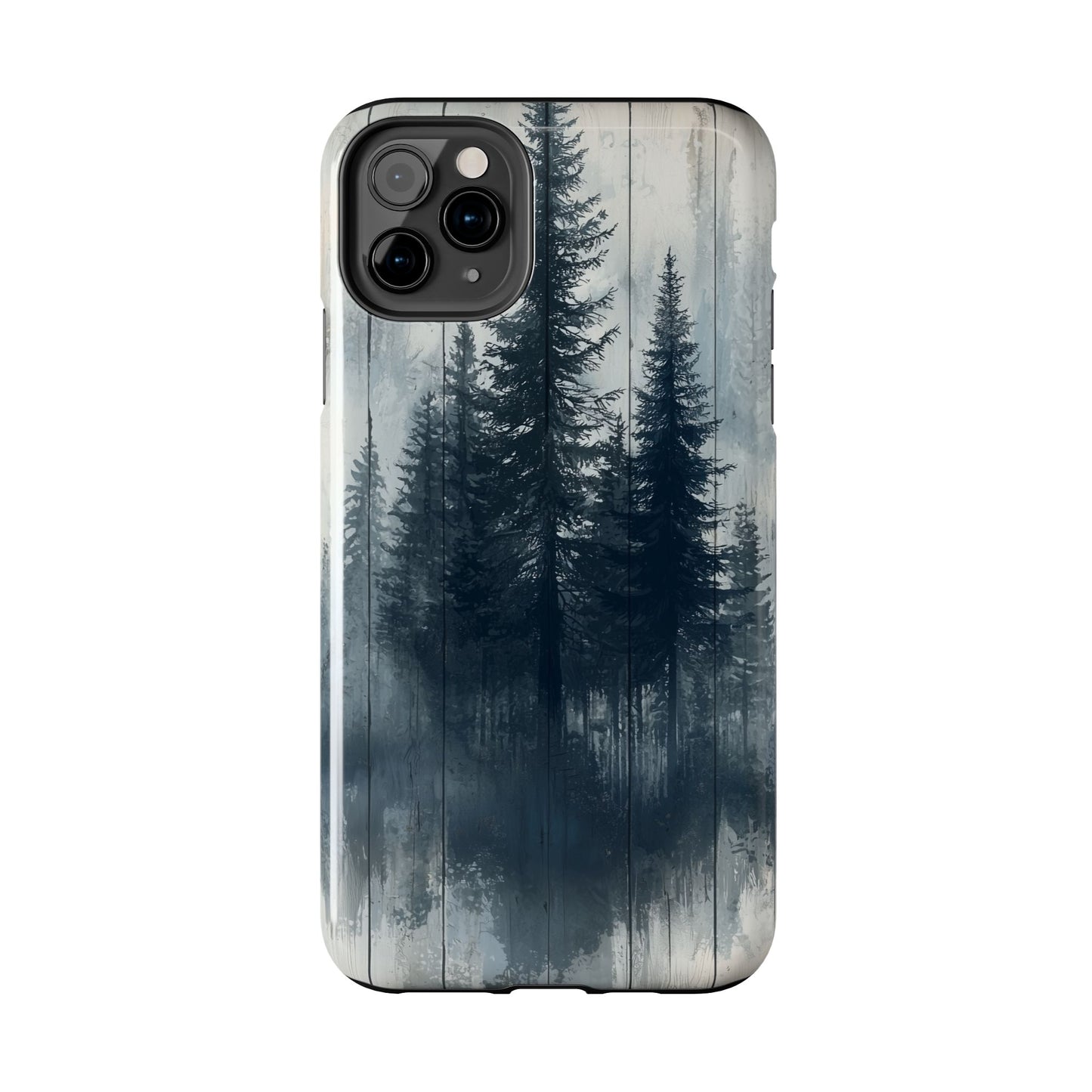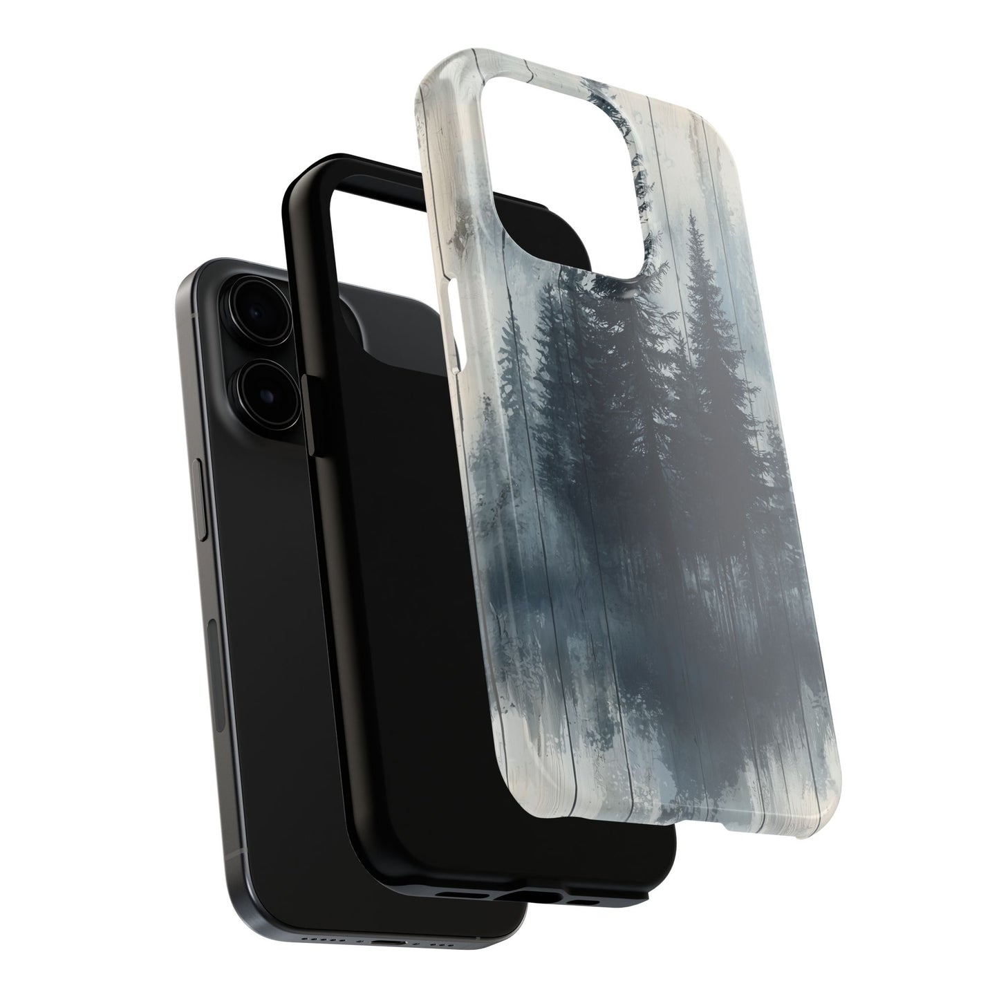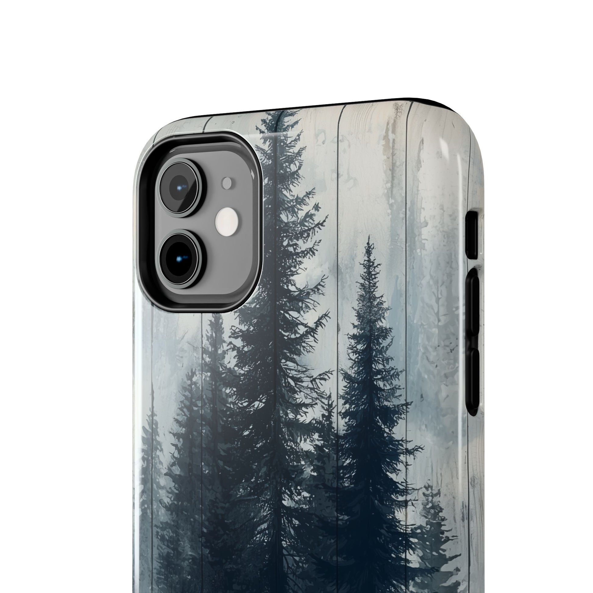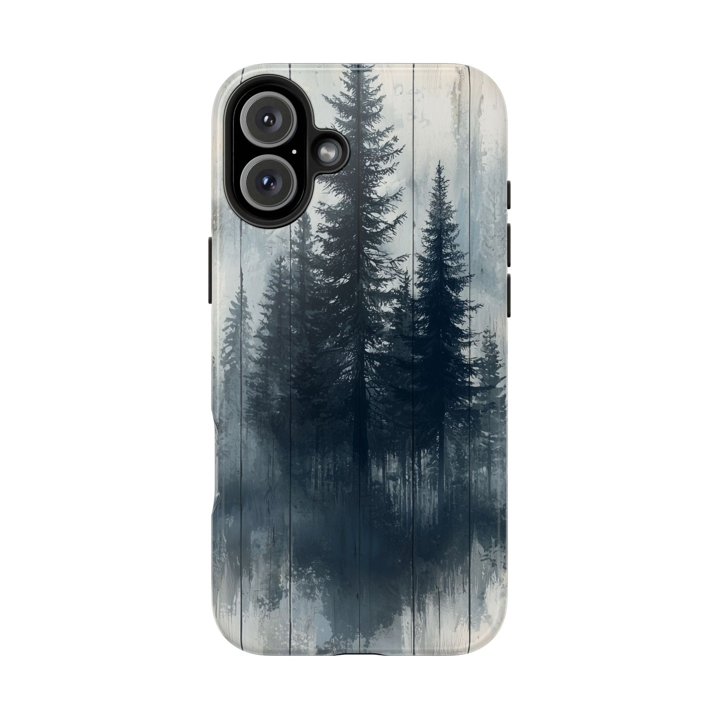 Experience nature's calm with our Rustic Pine Forest iPhone Case. The design showcases a misty, blue-toned pine forest, artfully printed on a rustic wood-textured background, perfect for outdoor enthusiasts or lovers of tranquil landscapes.