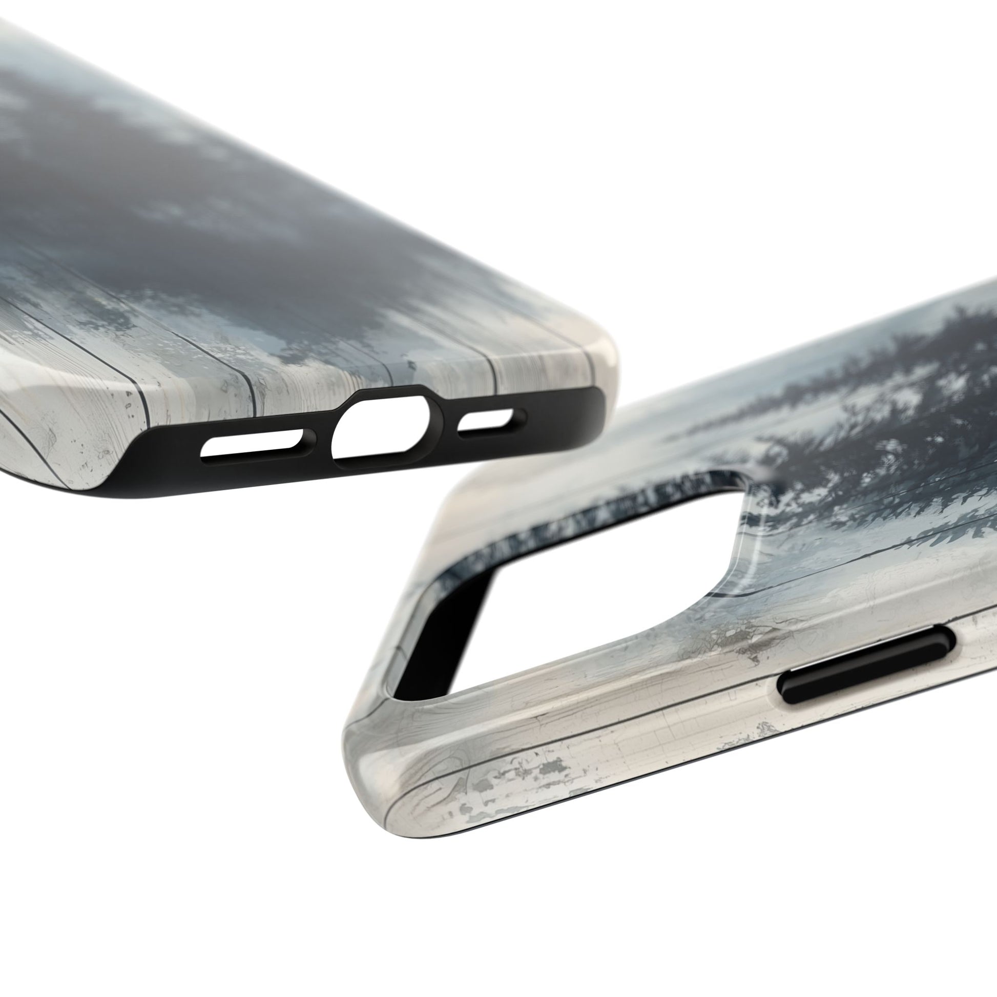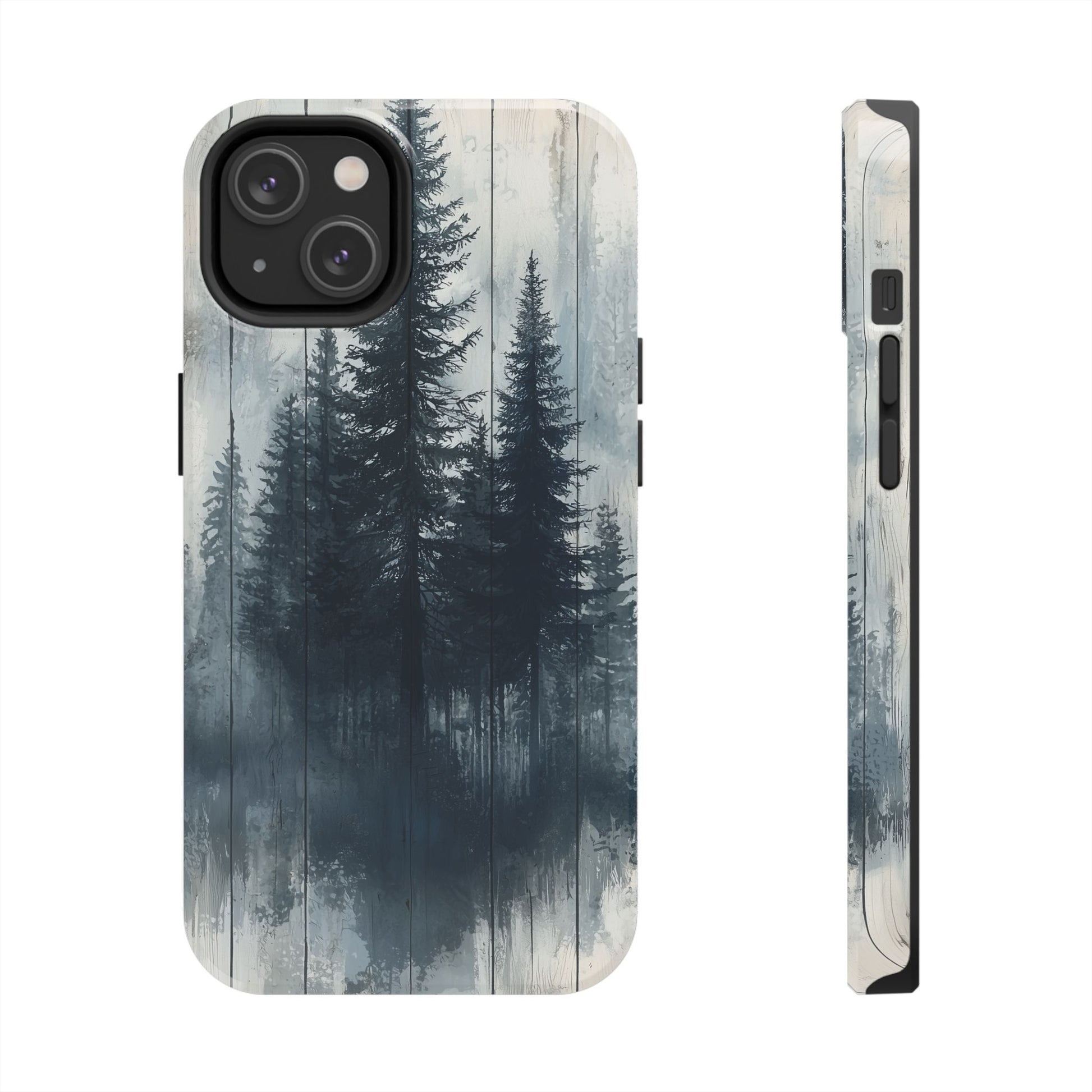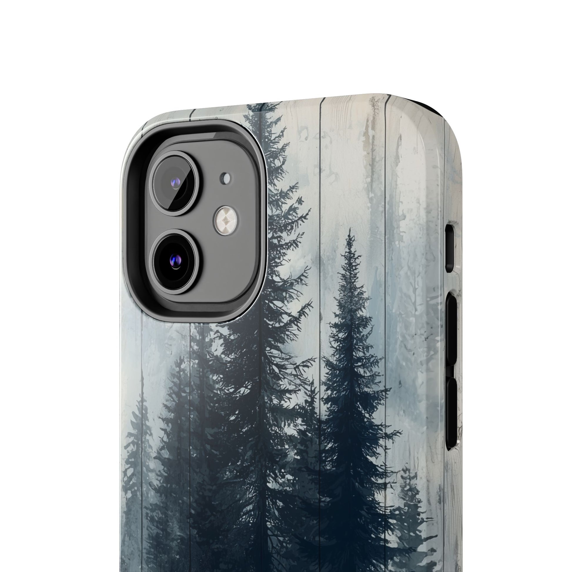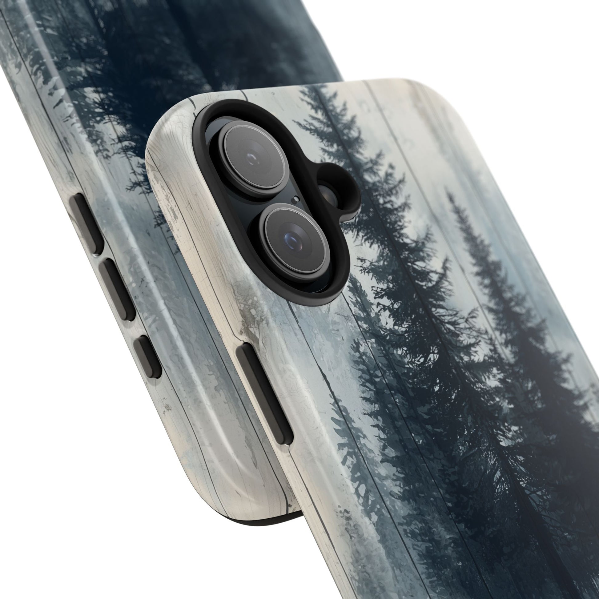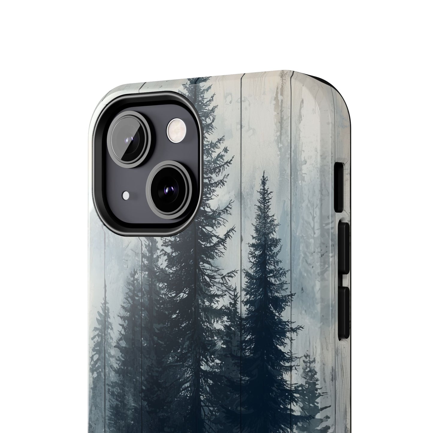 Experience nature's calm with our Rustic Pine Forest iPhone Case. The design showcases a misty, blue-toned pine forest, artfully printed on a rustic wood-textured background, perfect for outdoor enthusiasts or lovers of tranquil landscapes.