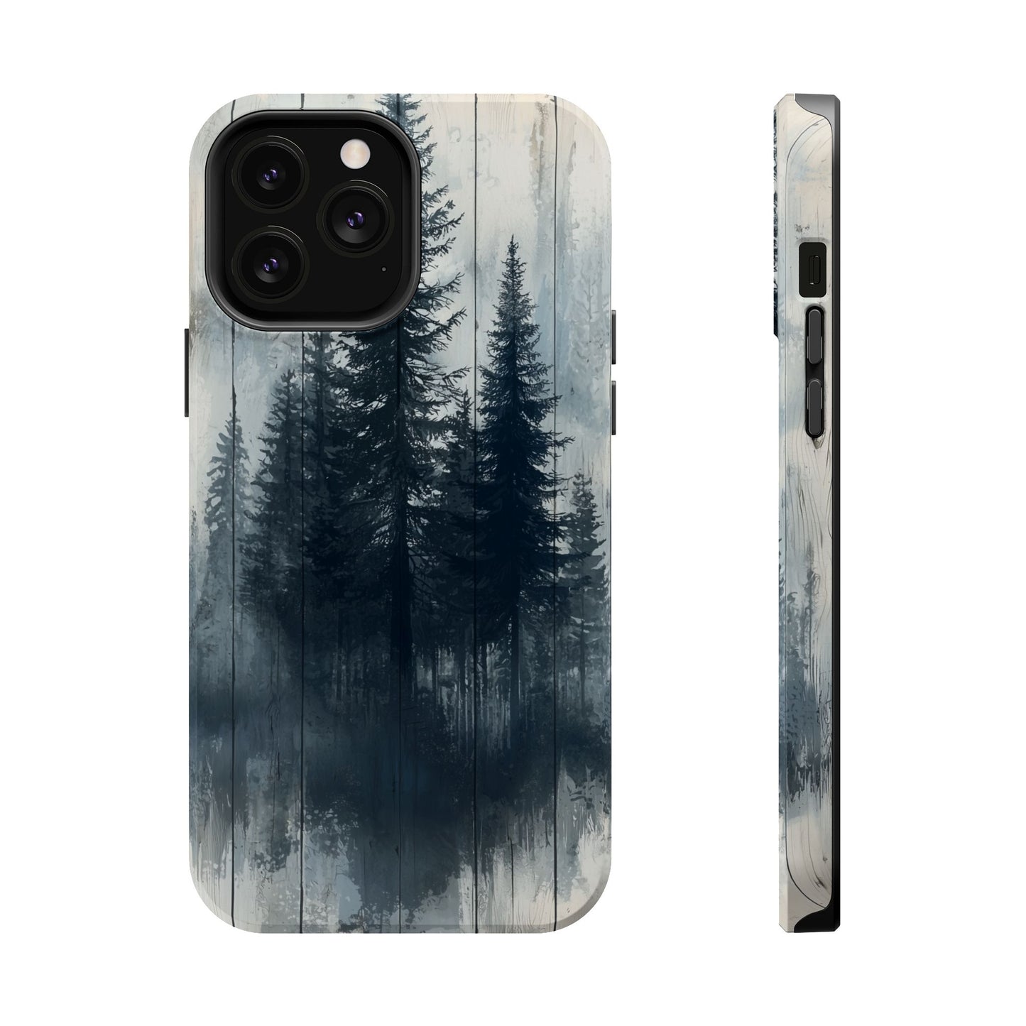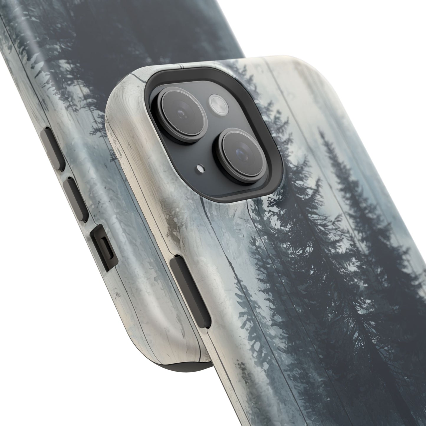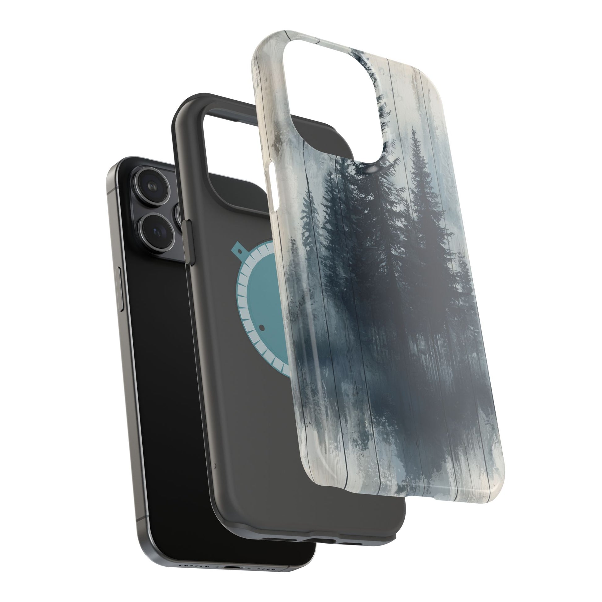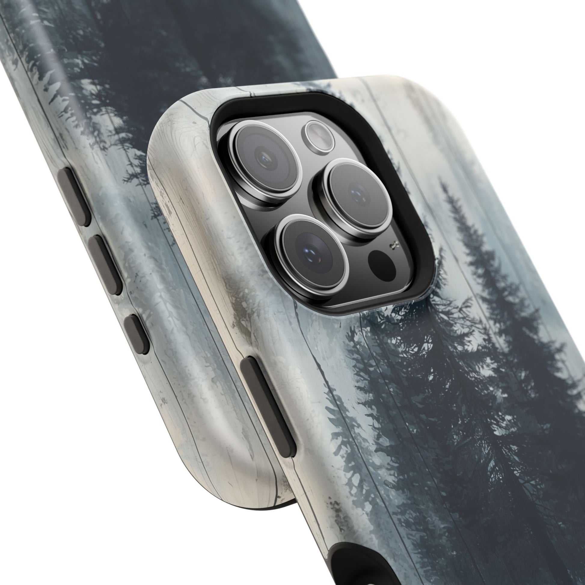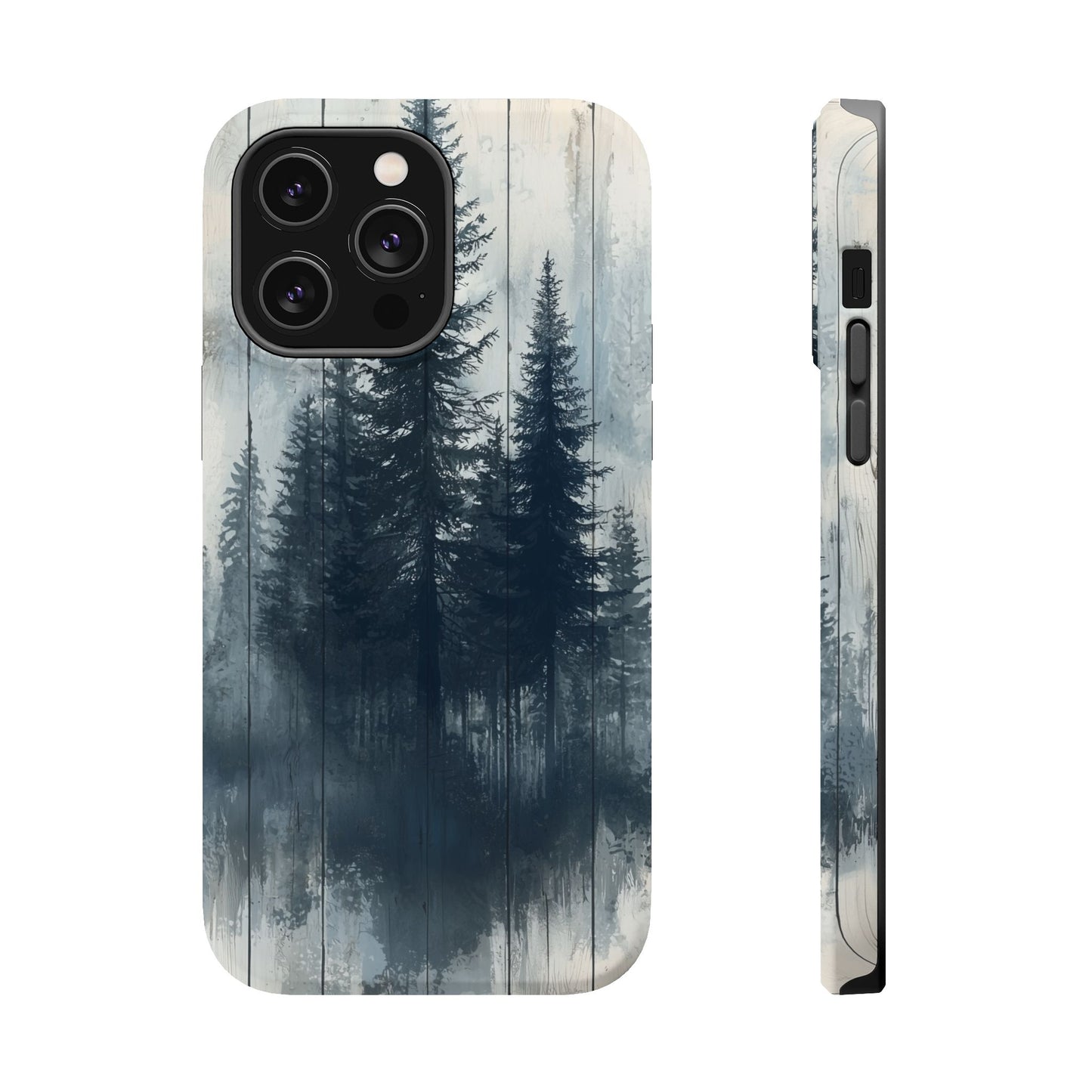 Experience nature's calm with our Rustic Pine Forest MagSafe iPhone Case. The design showcases a misty, blue-toned pine forest, artfully printed on a rustic wood-textured background, perfect for outdoor enthusiasts or lovers of tranquil landscapes.