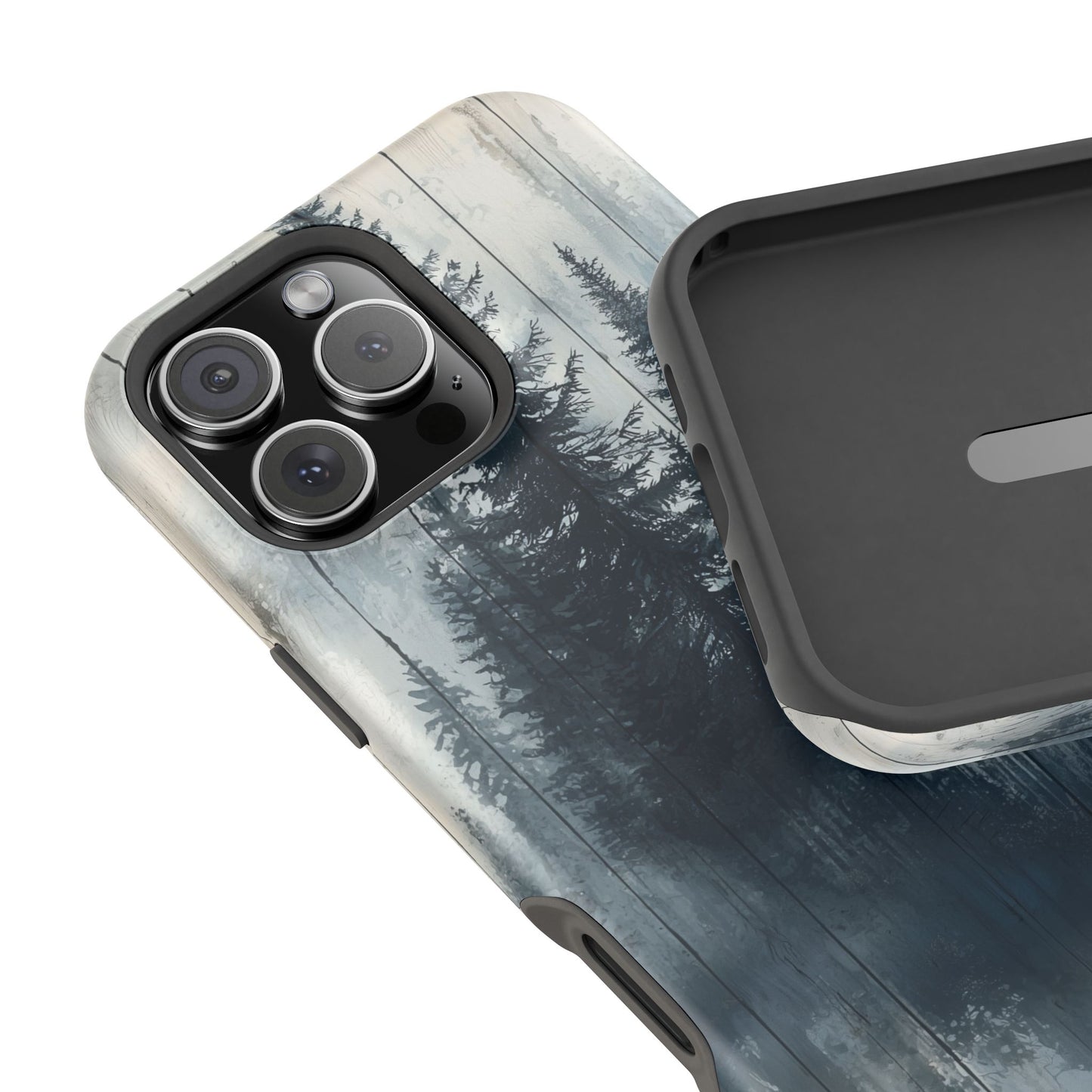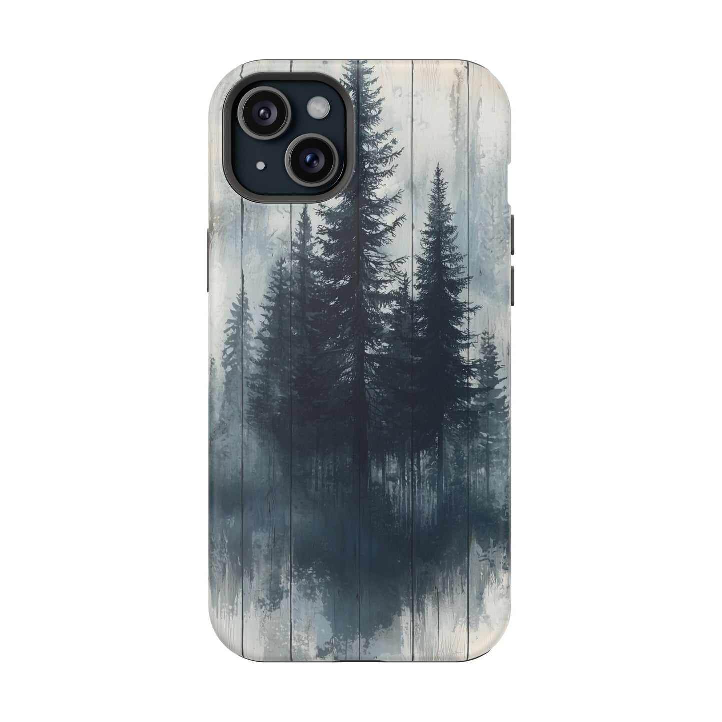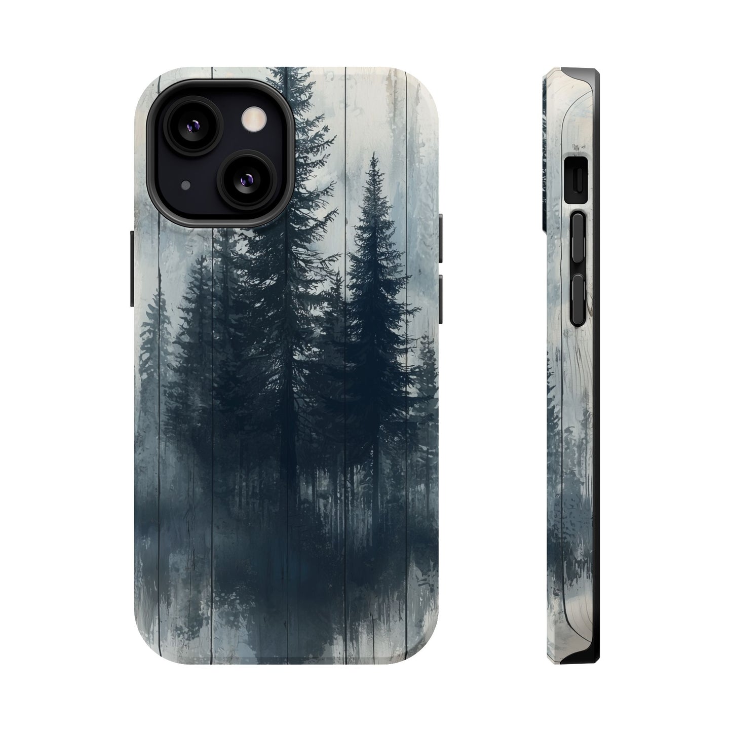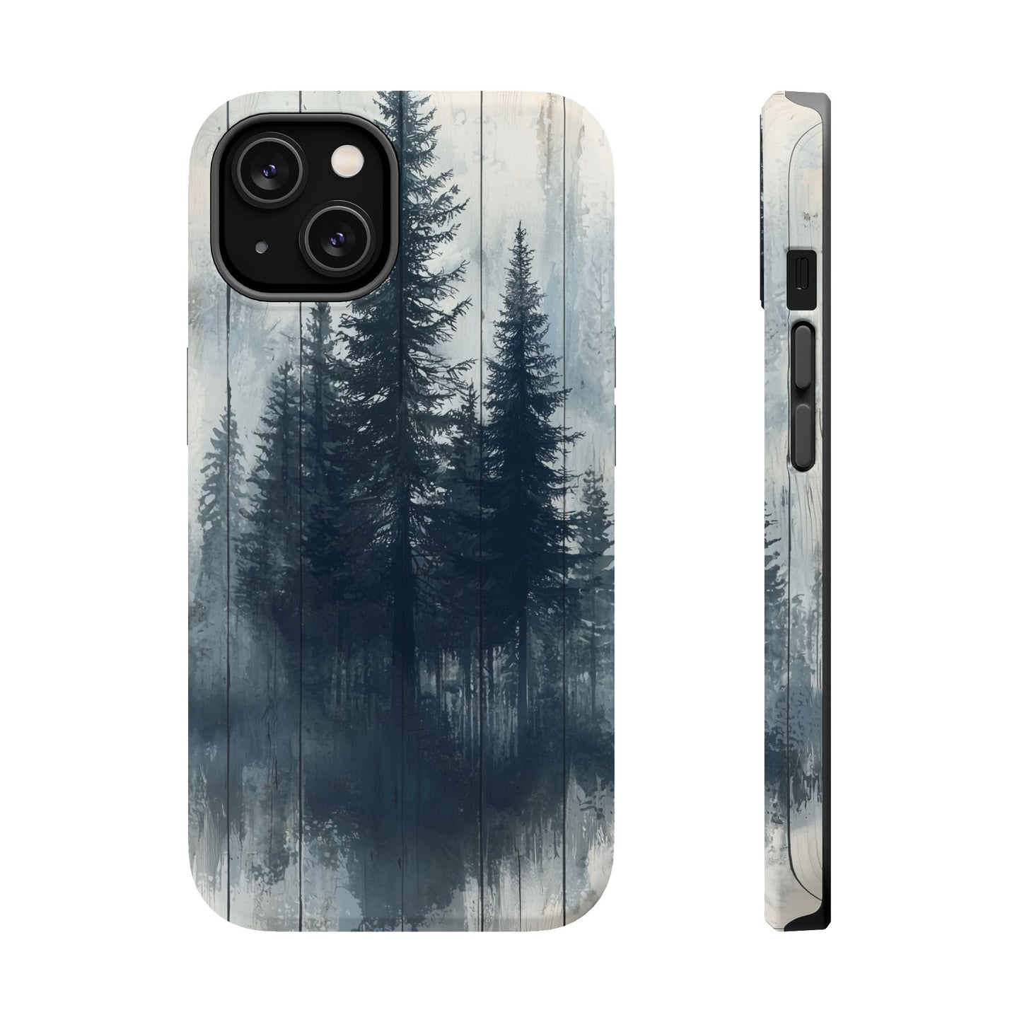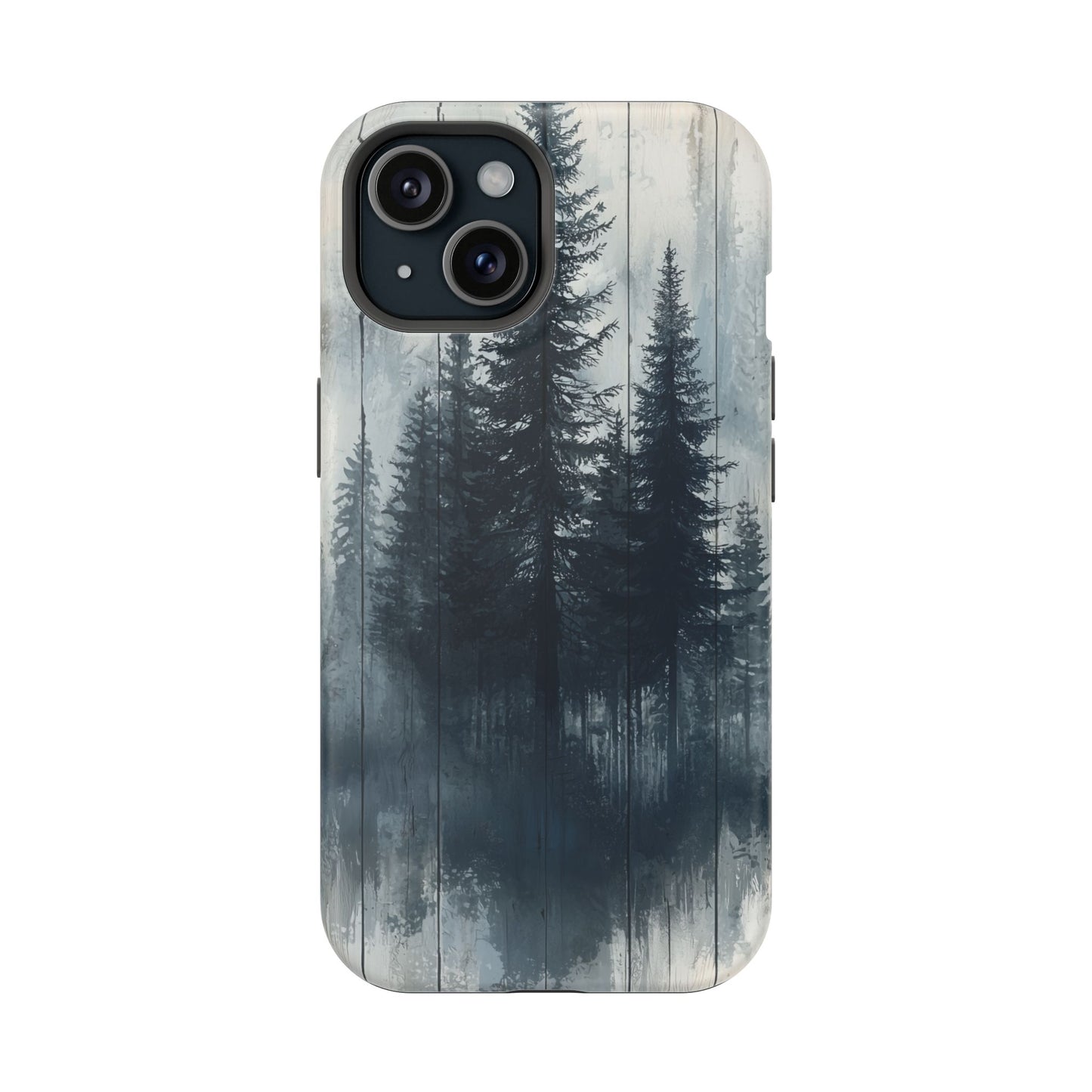 Experience nature's calm with our Rustic Pine Forest MagSafe iPhone Case. The design showcases a misty, blue-toned pine forest, artfully printed on a rustic wood-textured background, perfect for outdoor enthusiasts or lovers of tranquil landscapes.