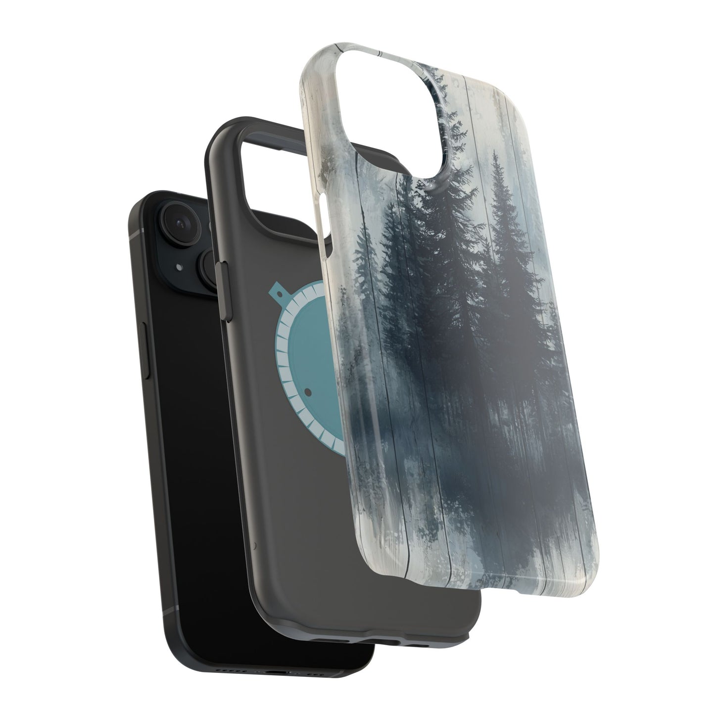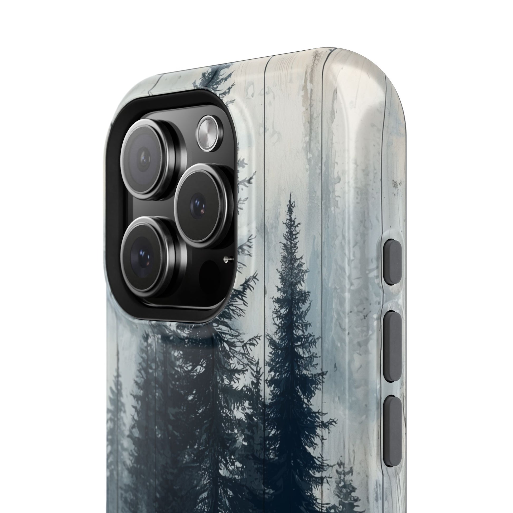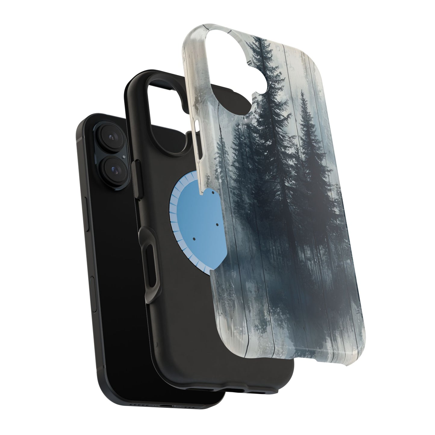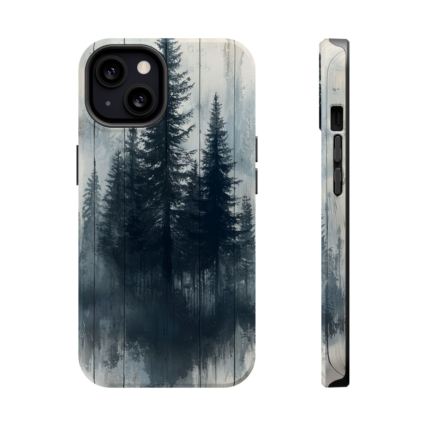 Experience nature's calm with our Rustic Pine Forest MagSafe iPhone Case. The design showcases a misty, blue-toned pine forest, artfully printed on a rustic wood-textured background, perfect for outdoor enthusiasts or lovers of tranquil landscapes.