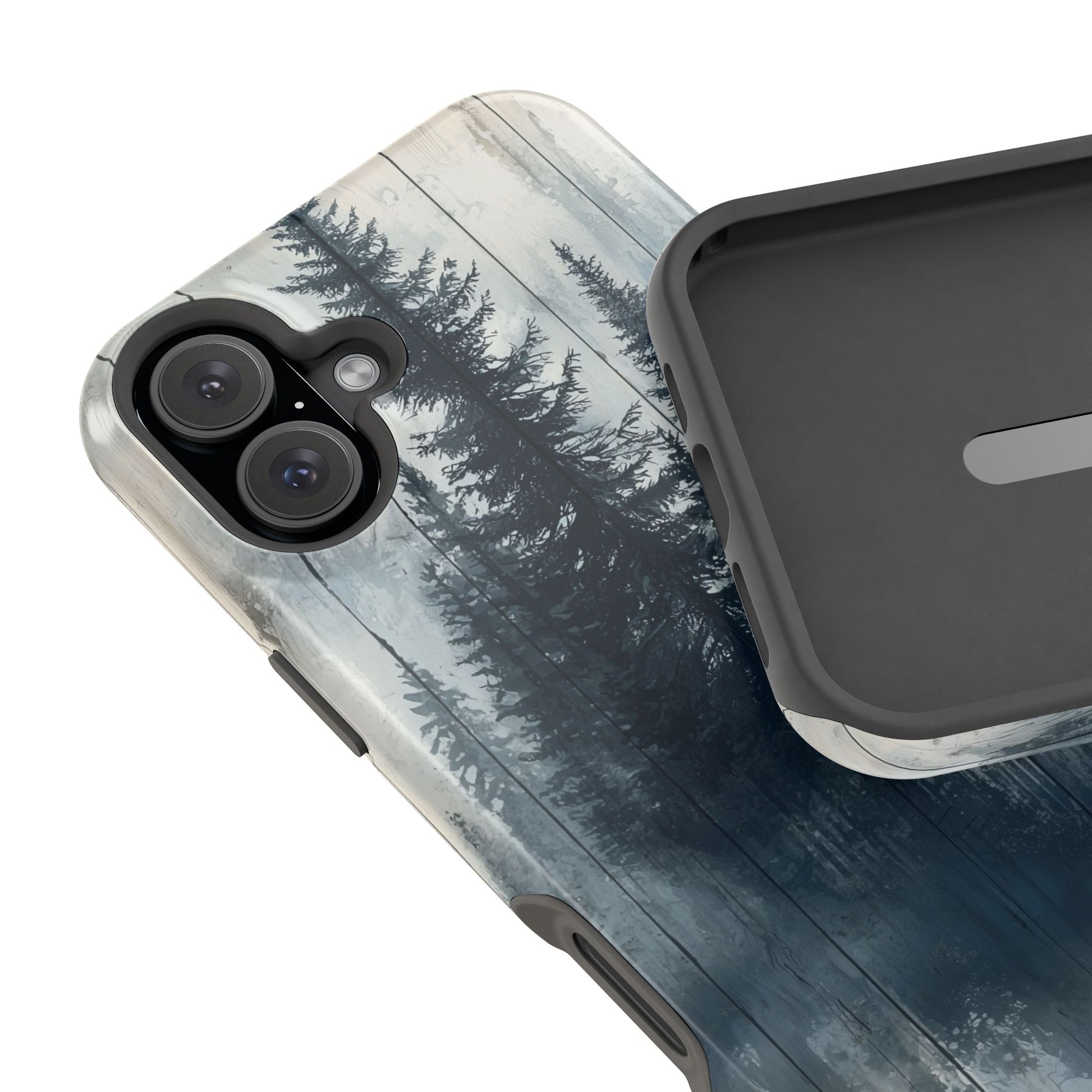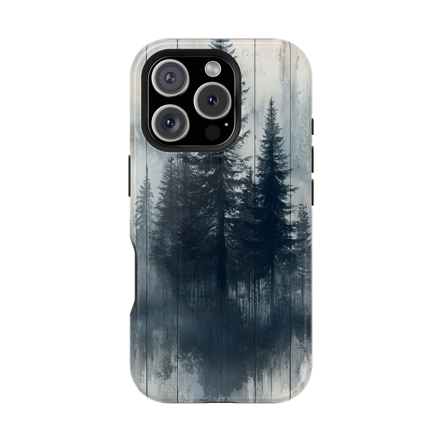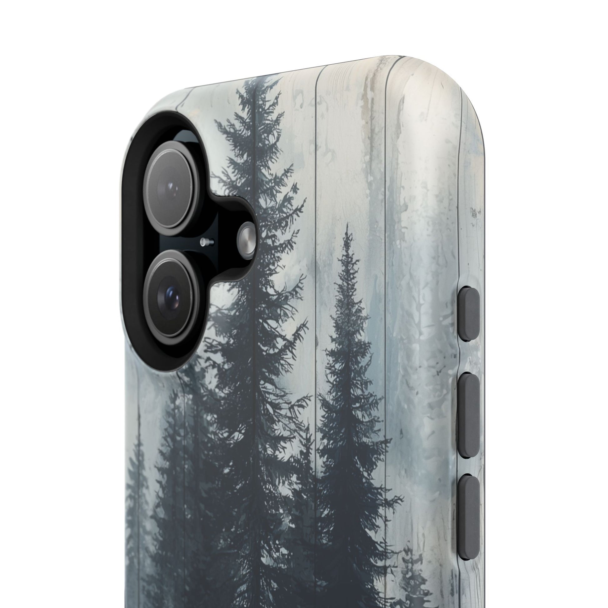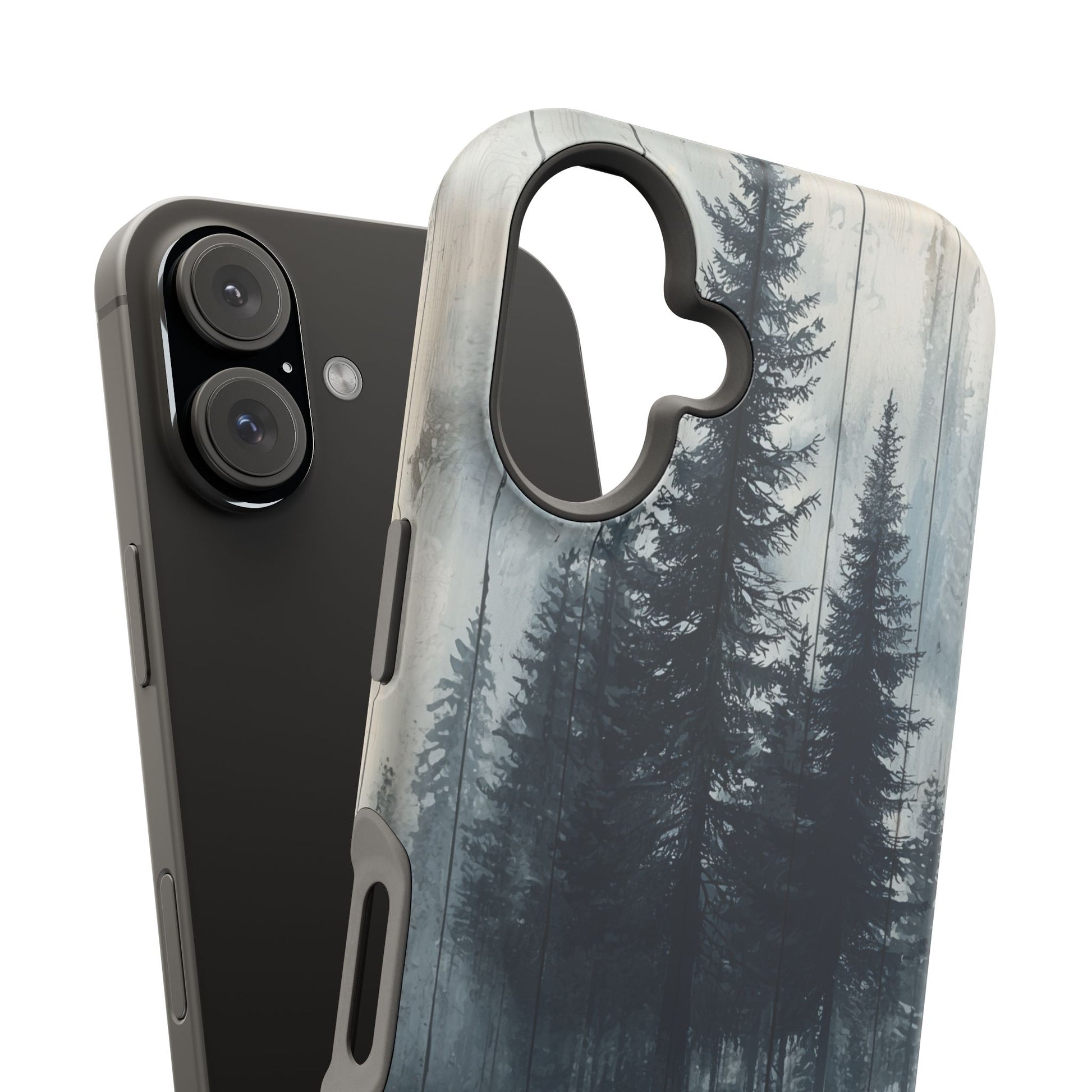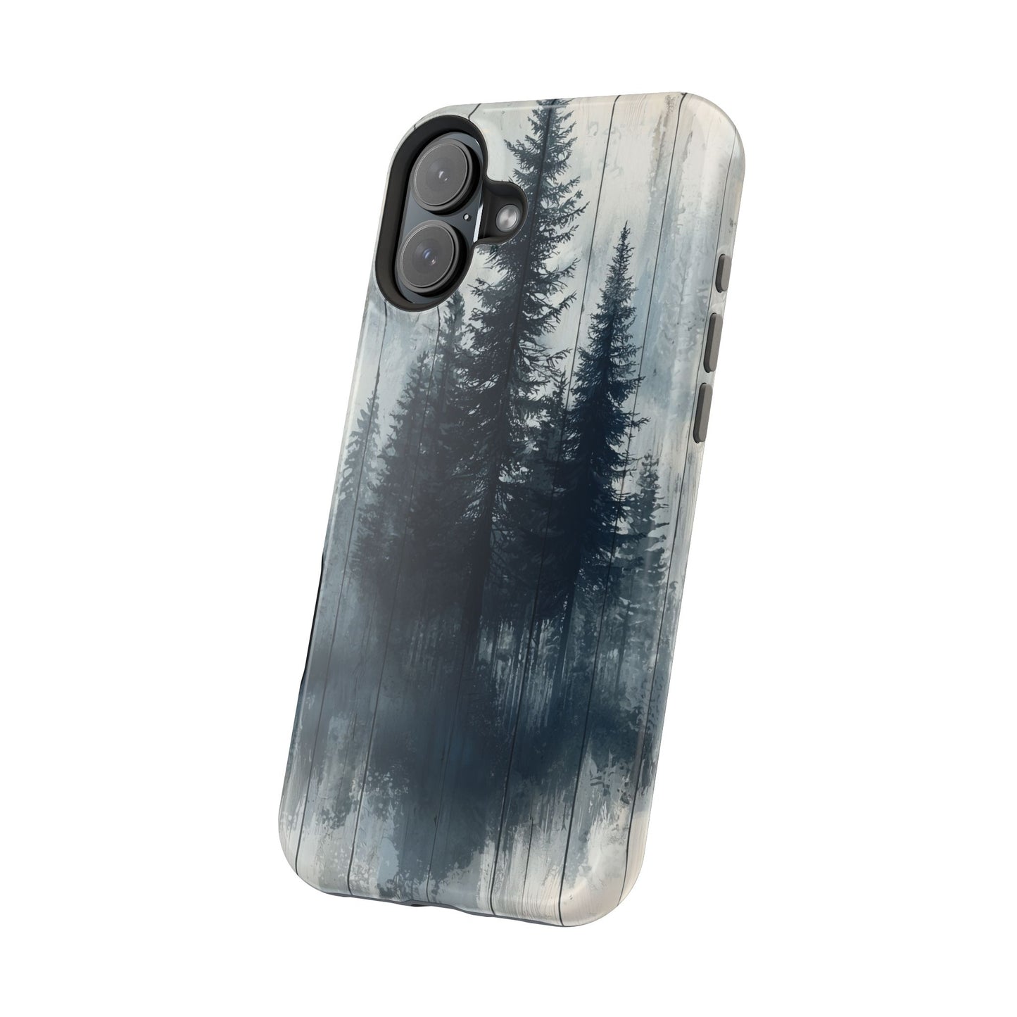 Experience nature's calm with our Rustic Pine Forest MagSafe iPhone Case. The design showcases a misty, blue-toned pine forest, artfully printed on a rustic wood-textured background, perfect for outdoor enthusiasts or lovers of tranquil landscapes.