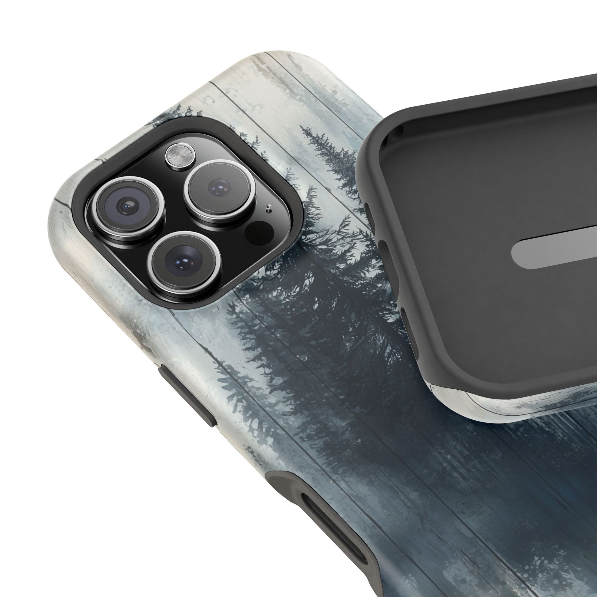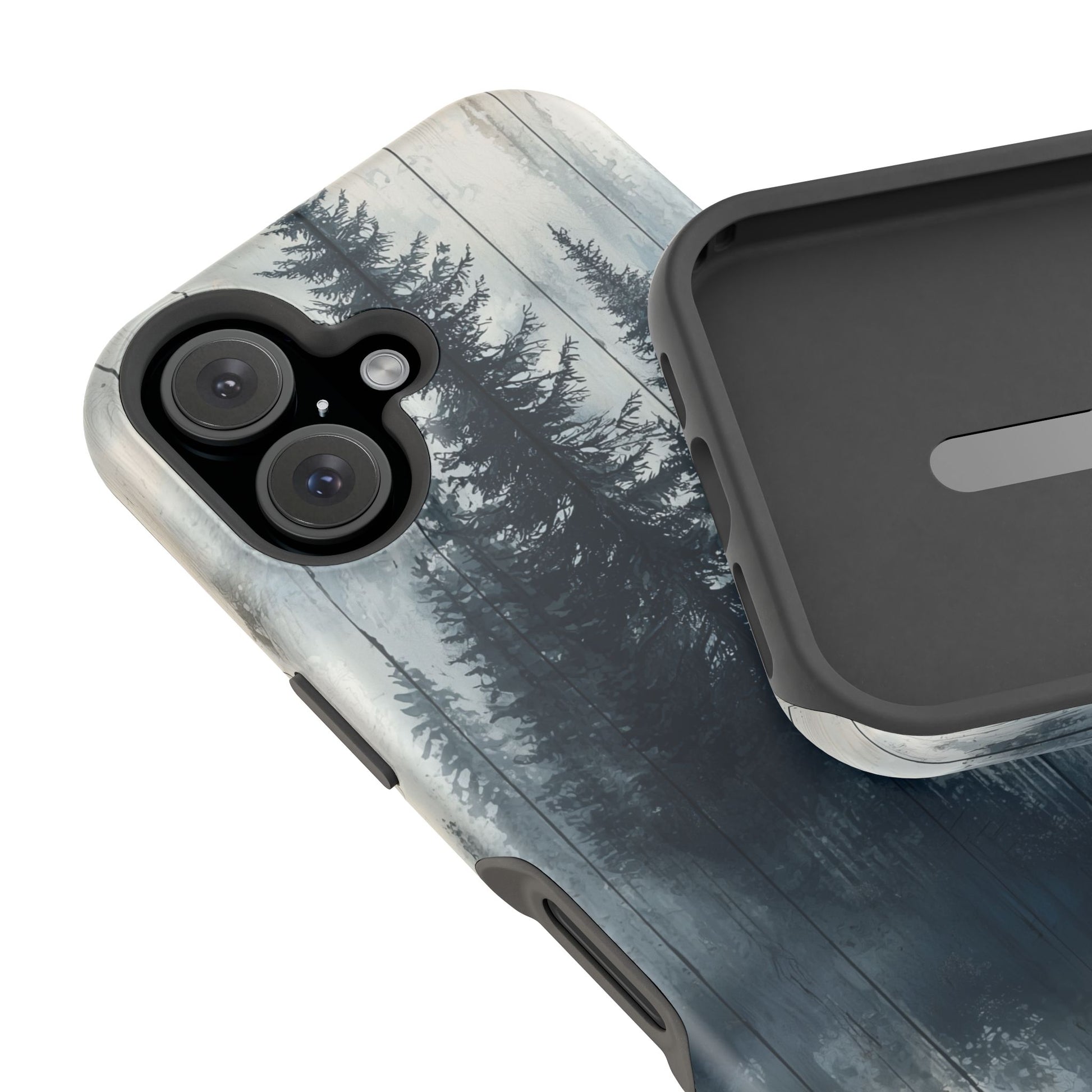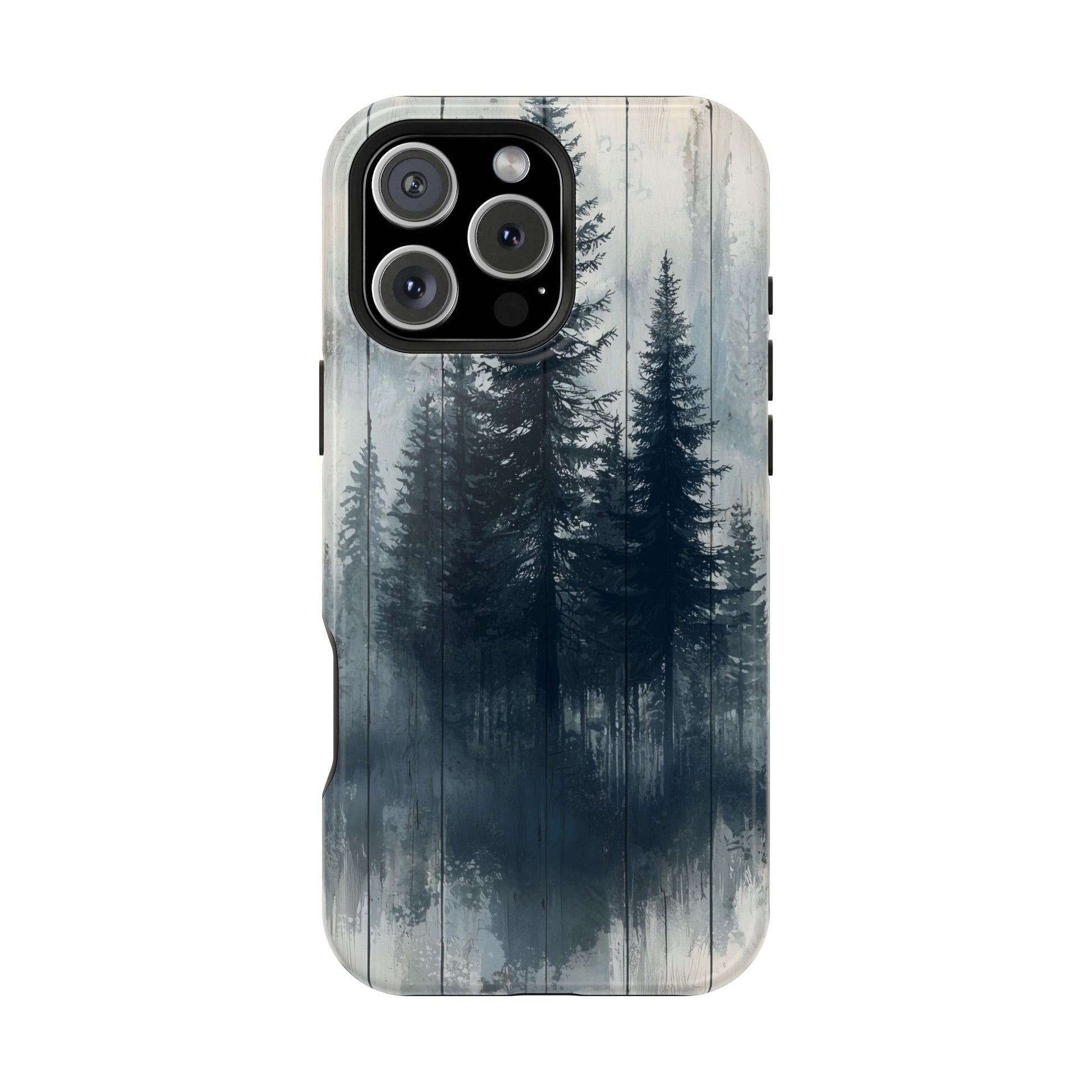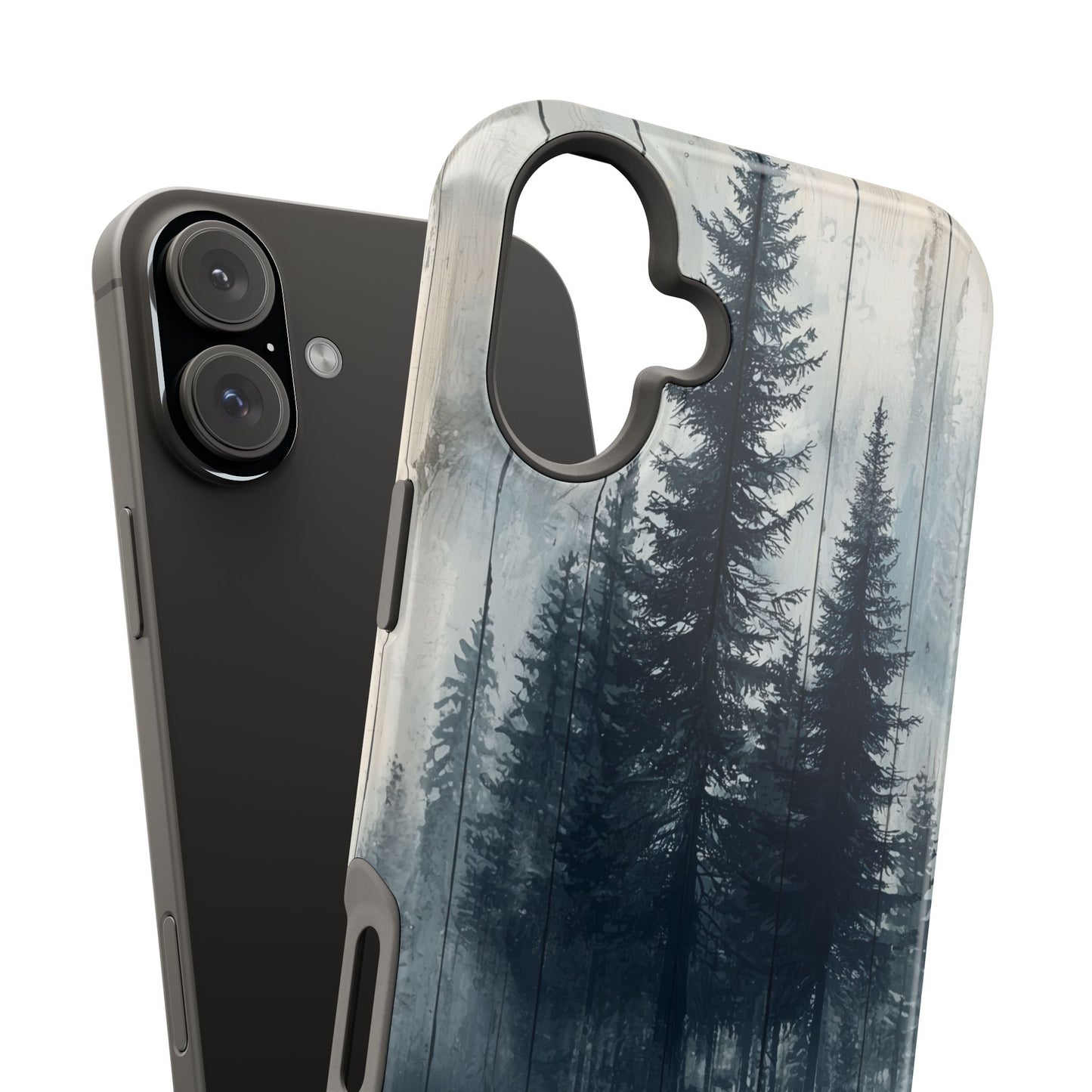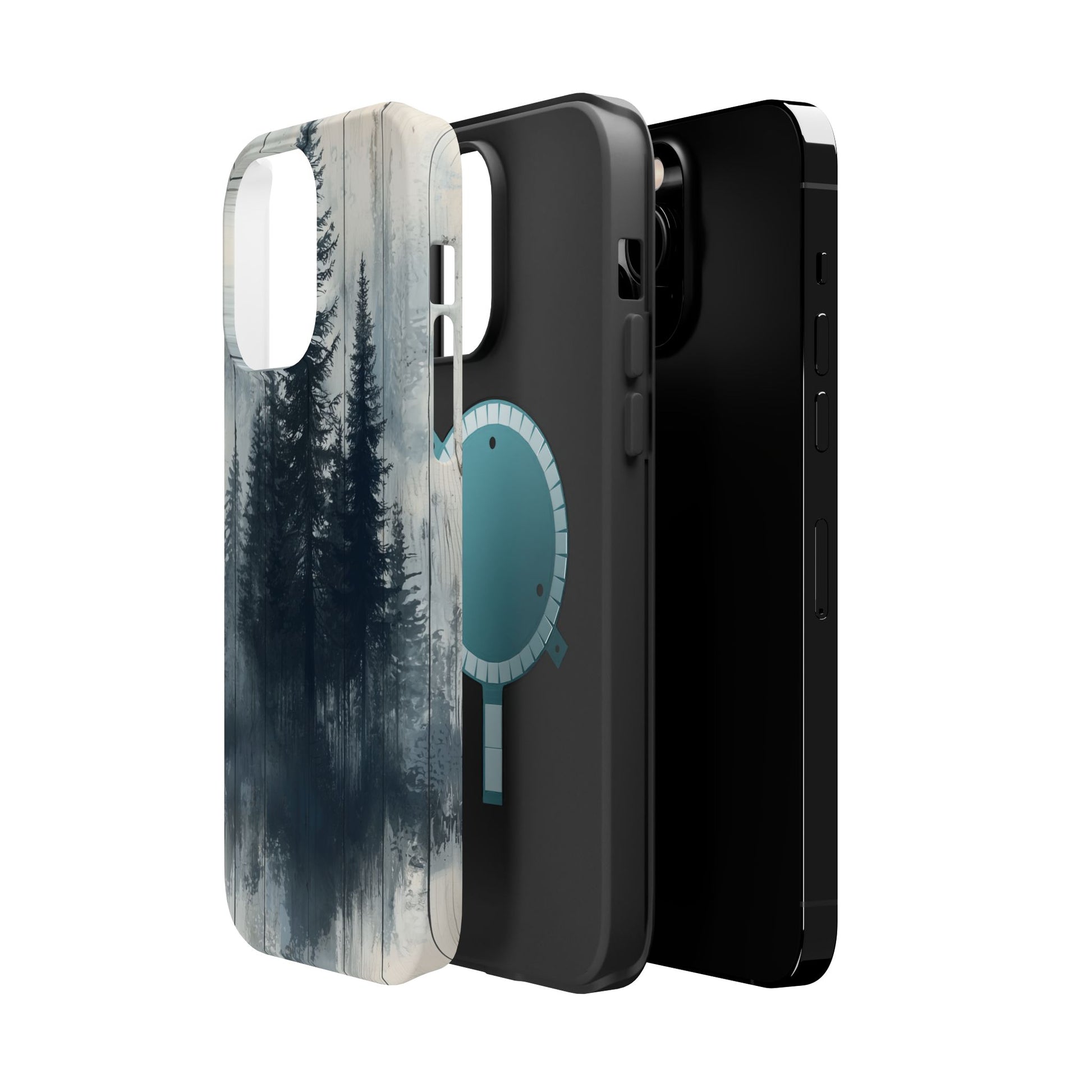 Experience nature's calm with our Rustic Pine Forest MagSafe iPhone Case. The design showcases a misty, blue-toned pine forest, artfully printed on a rustic wood-textured background, perfect for outdoor enthusiasts or lovers of tranquil landscapes.