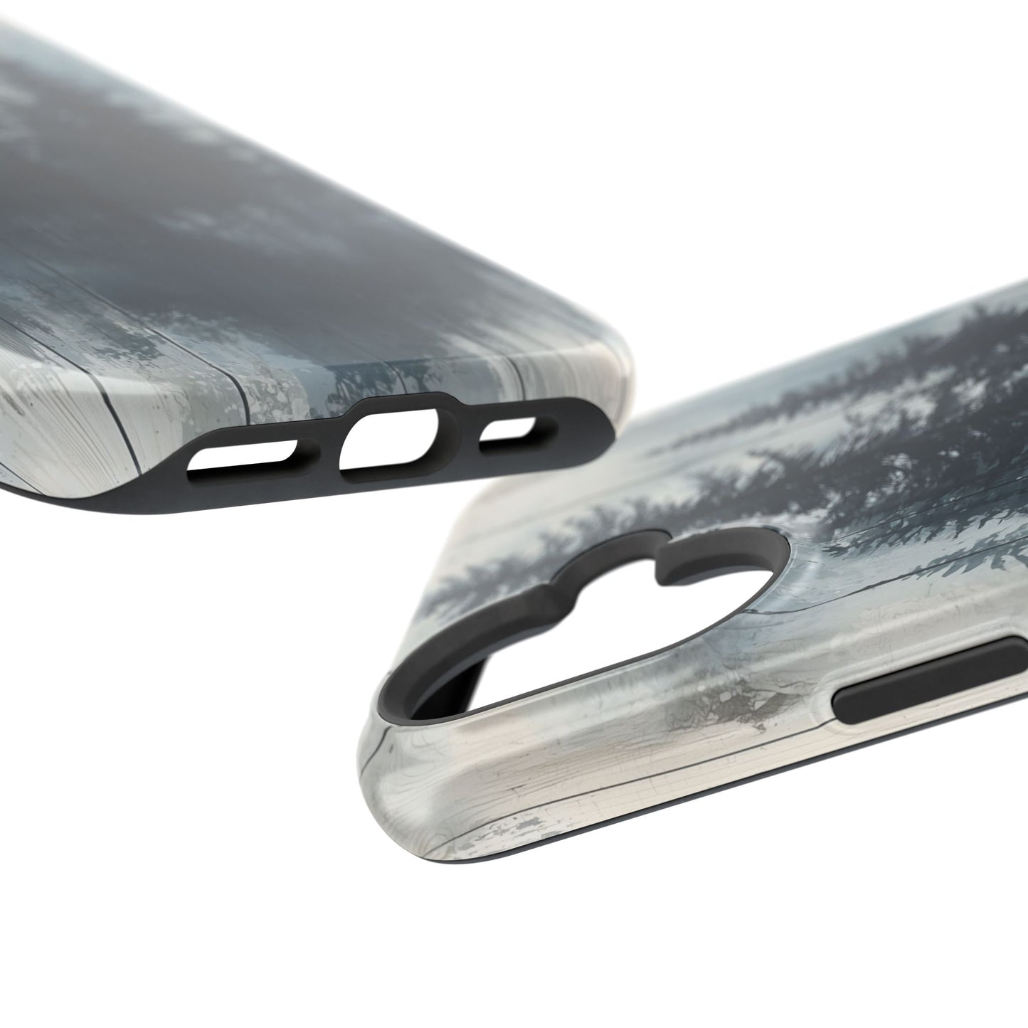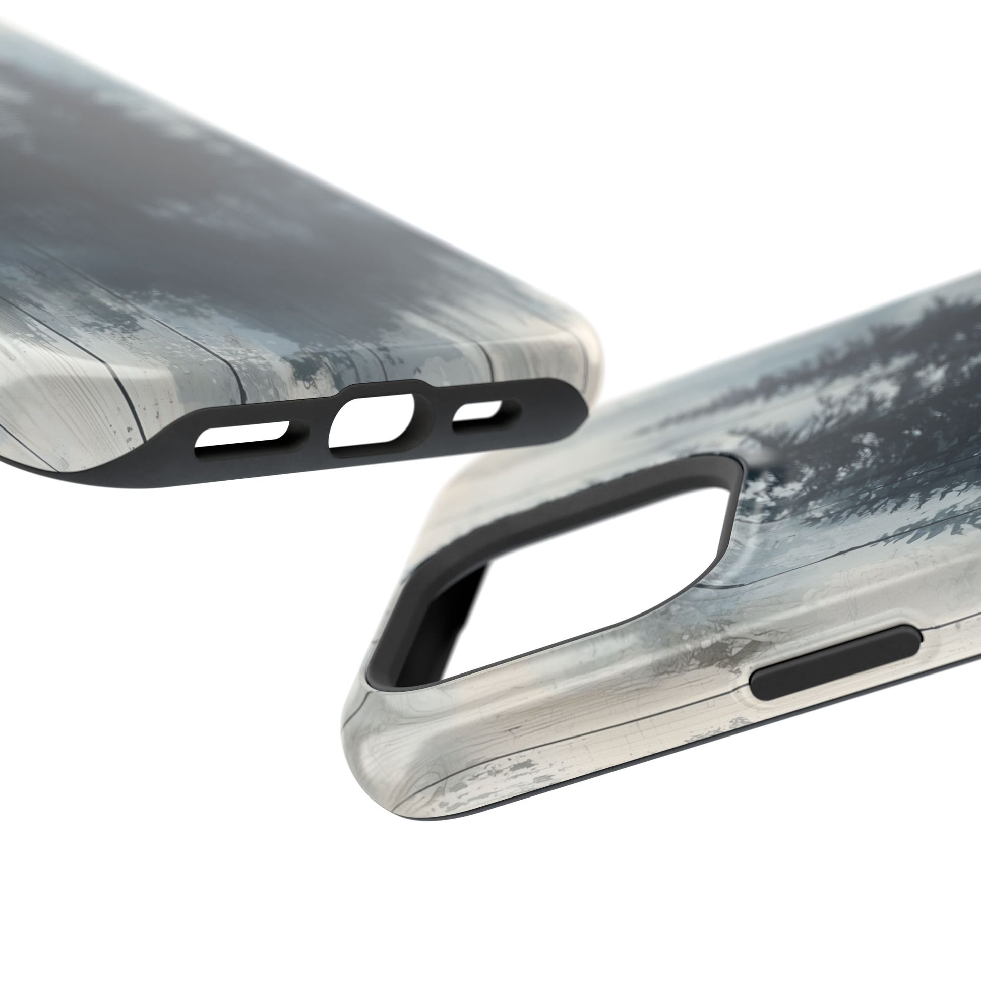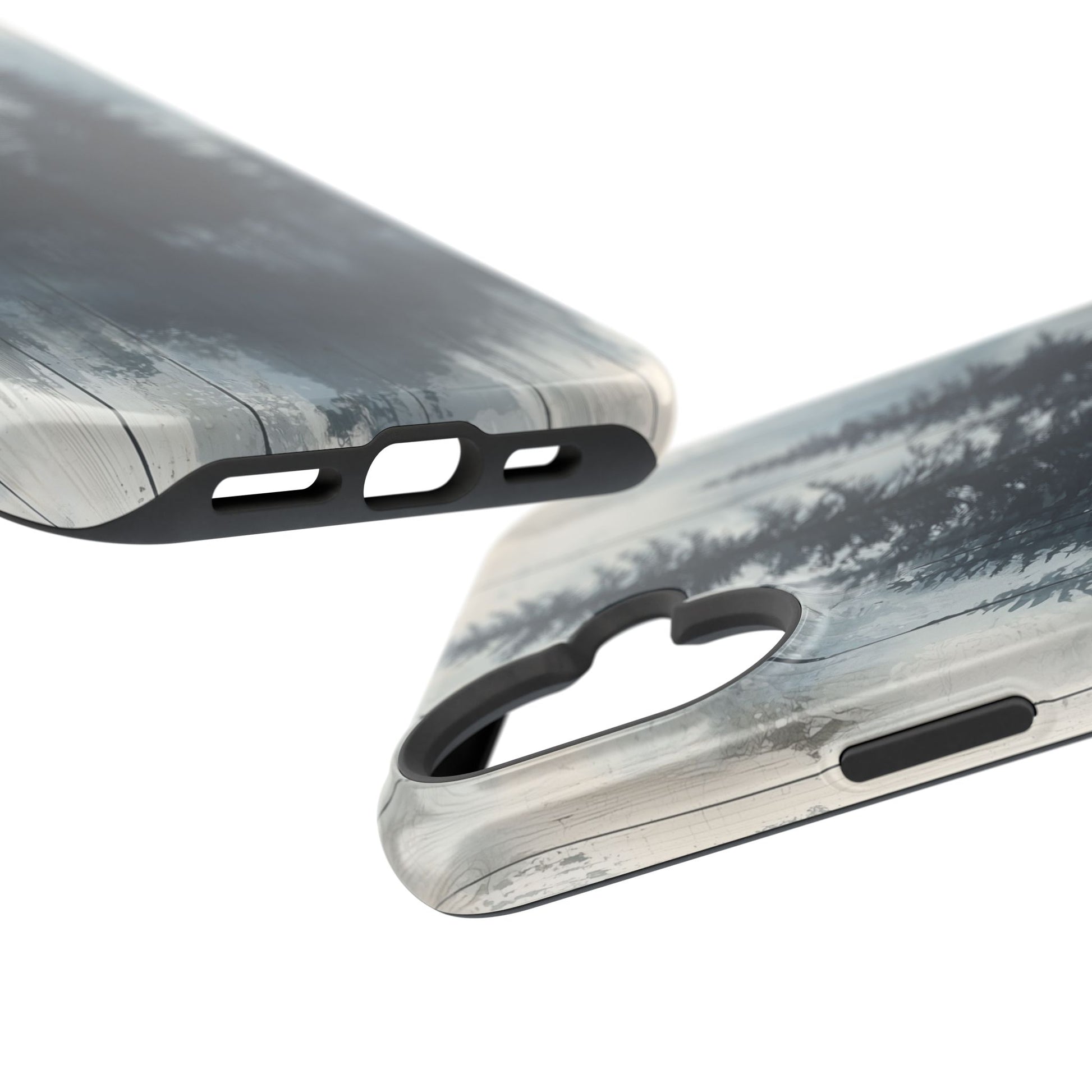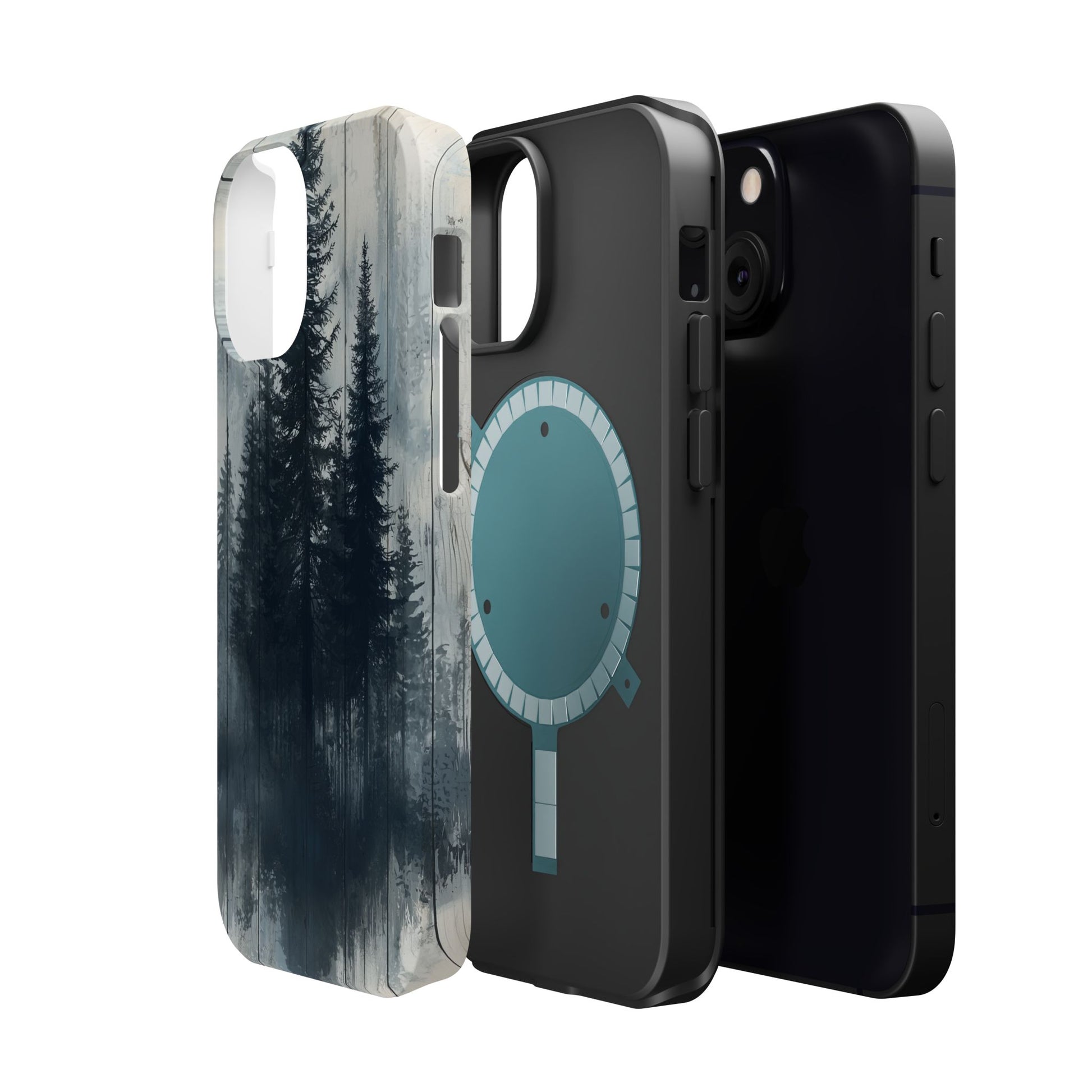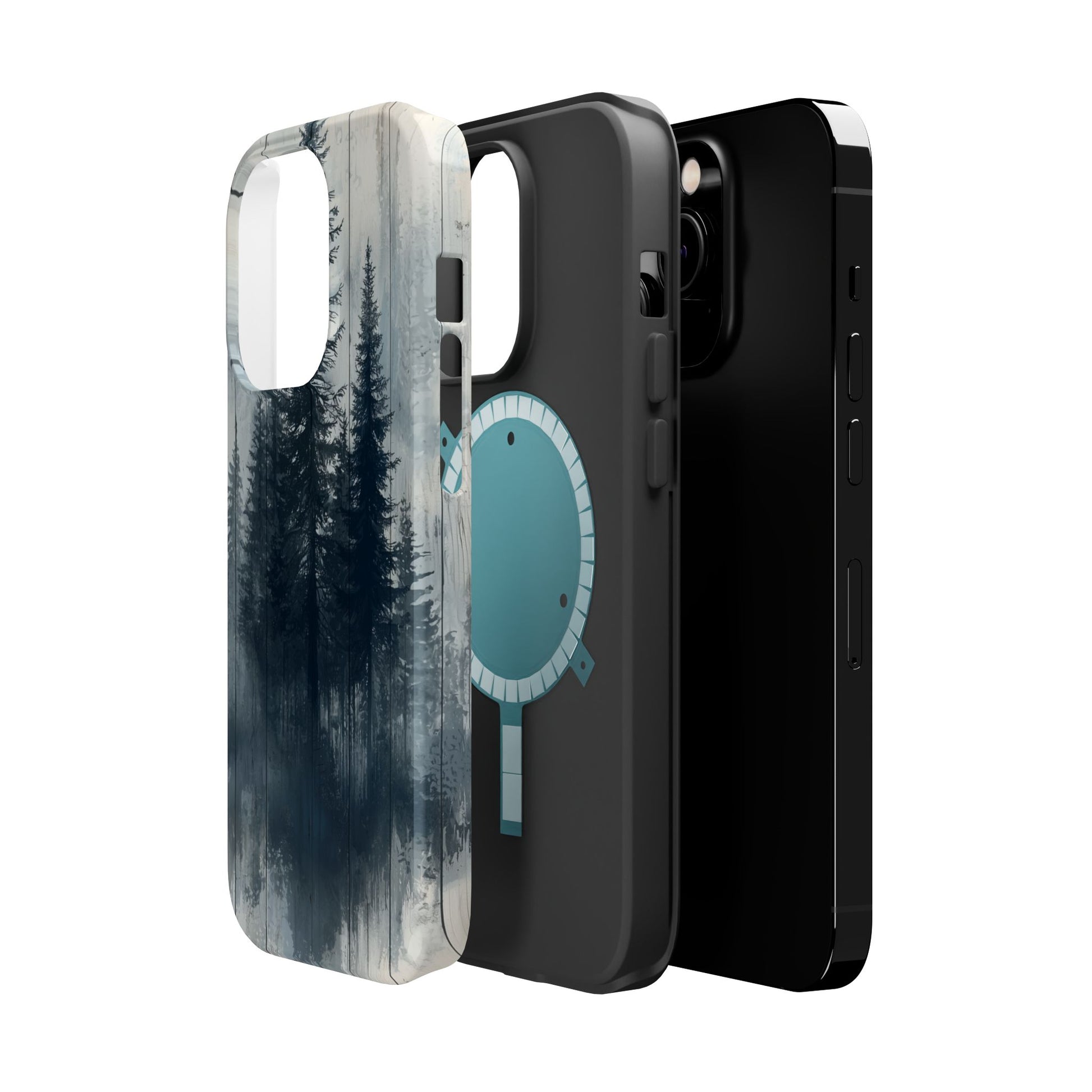 Experience nature's calm with our Rustic Pine Forest MagSafe iPhone Case. The design showcases a misty, blue-toned pine forest, artfully printed on a rustic wood-textured background, perfect for outdoor enthusiasts or lovers of tranquil landscapes.