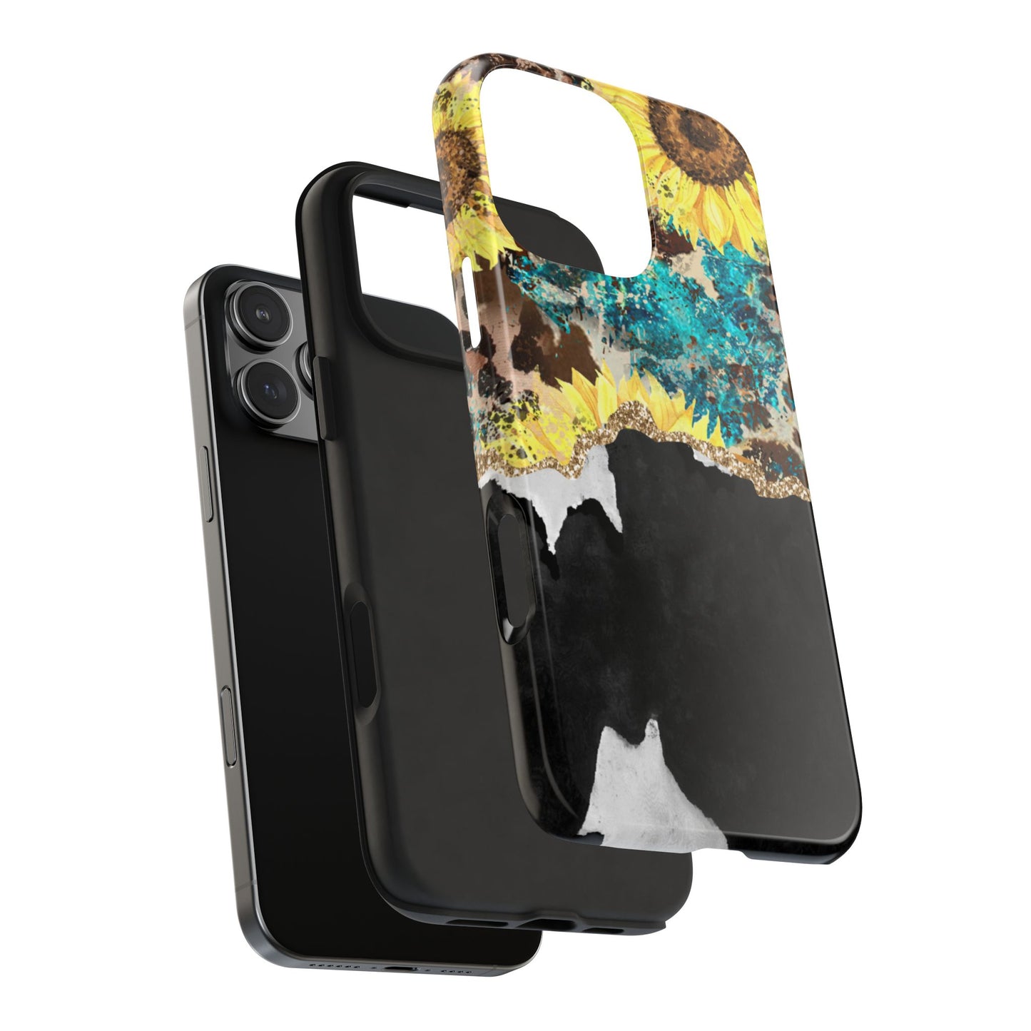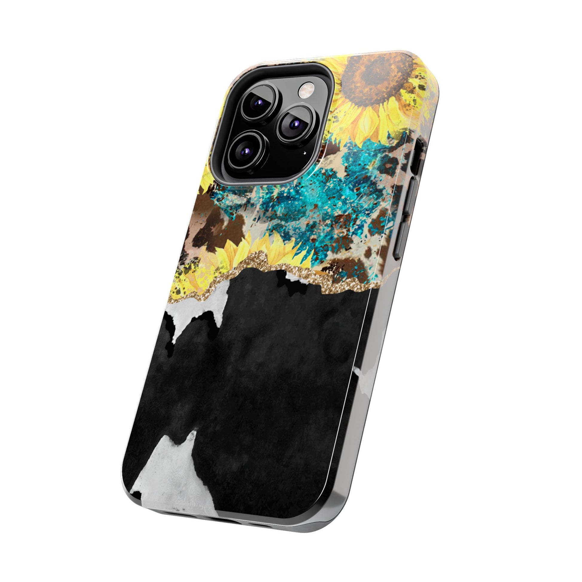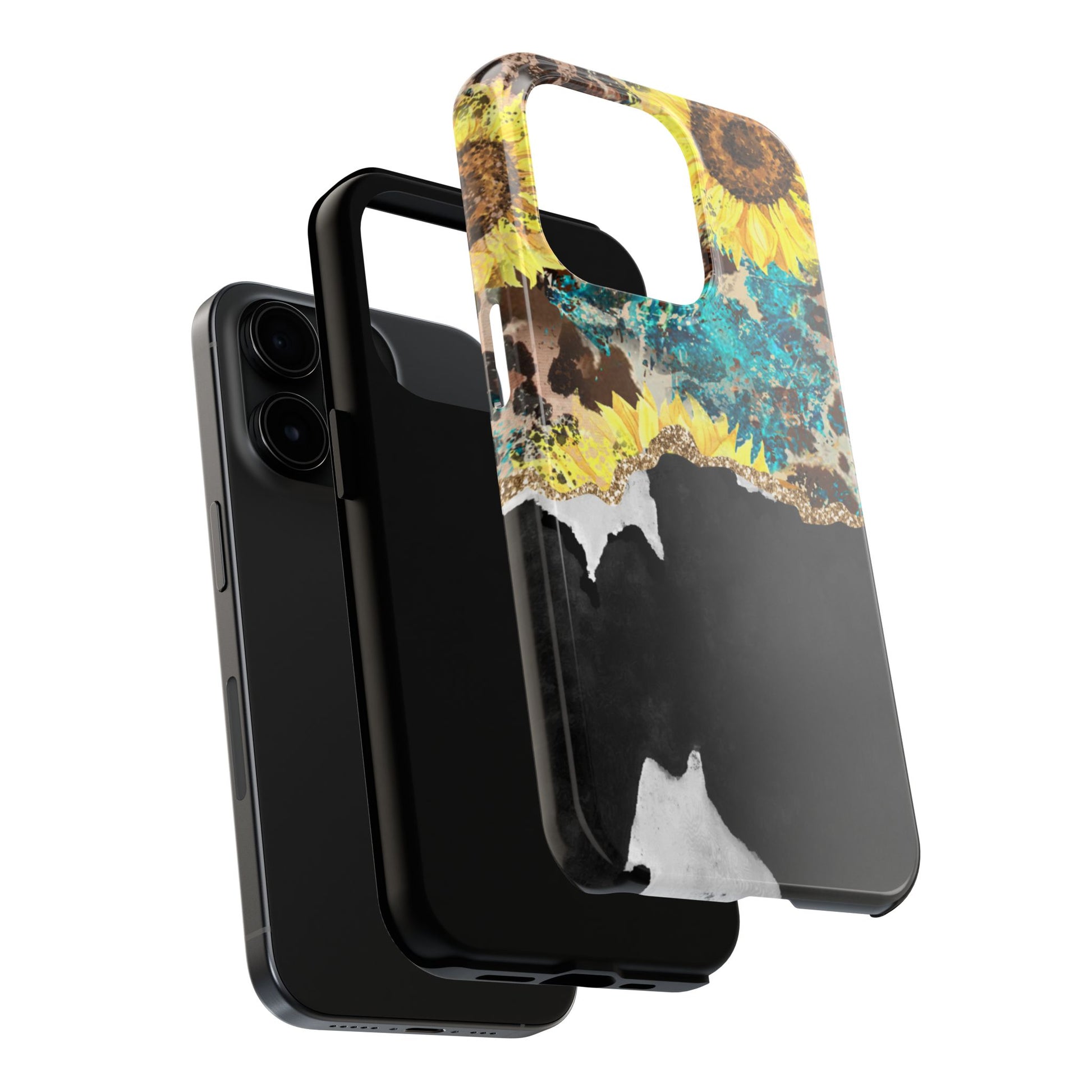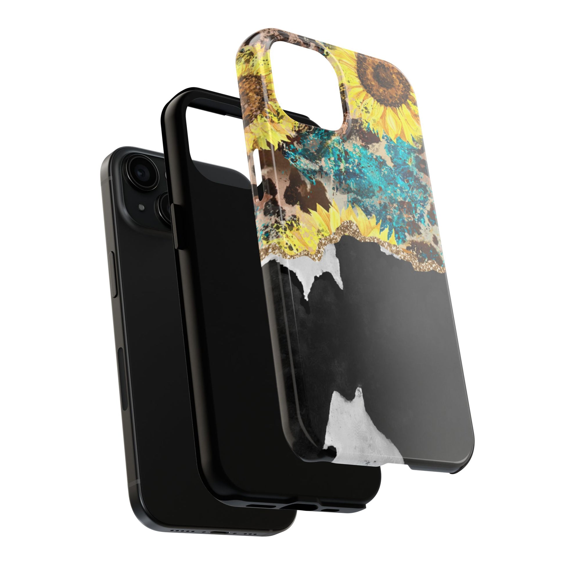 Embrace rustic elegance with our Rustic Sunflower Leopard Glam iPhone Case! This striking design combines wild leopard print with vibrant sunflowers, turquoise splashes, and a chic black-and-gold glitter accent for an edgy, layered look. The combination of textures and colors gives off a boho-glam vibe, perfect for those who love a unique, artistic style. Made with a tough polycarbonate shell and cushioned TPU liner, this case protects your phone while letting your personality shine. It’s the ideal accessory for anyone with a bold and adventurous spirit!