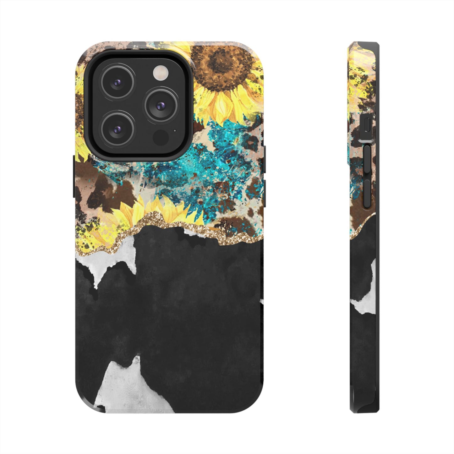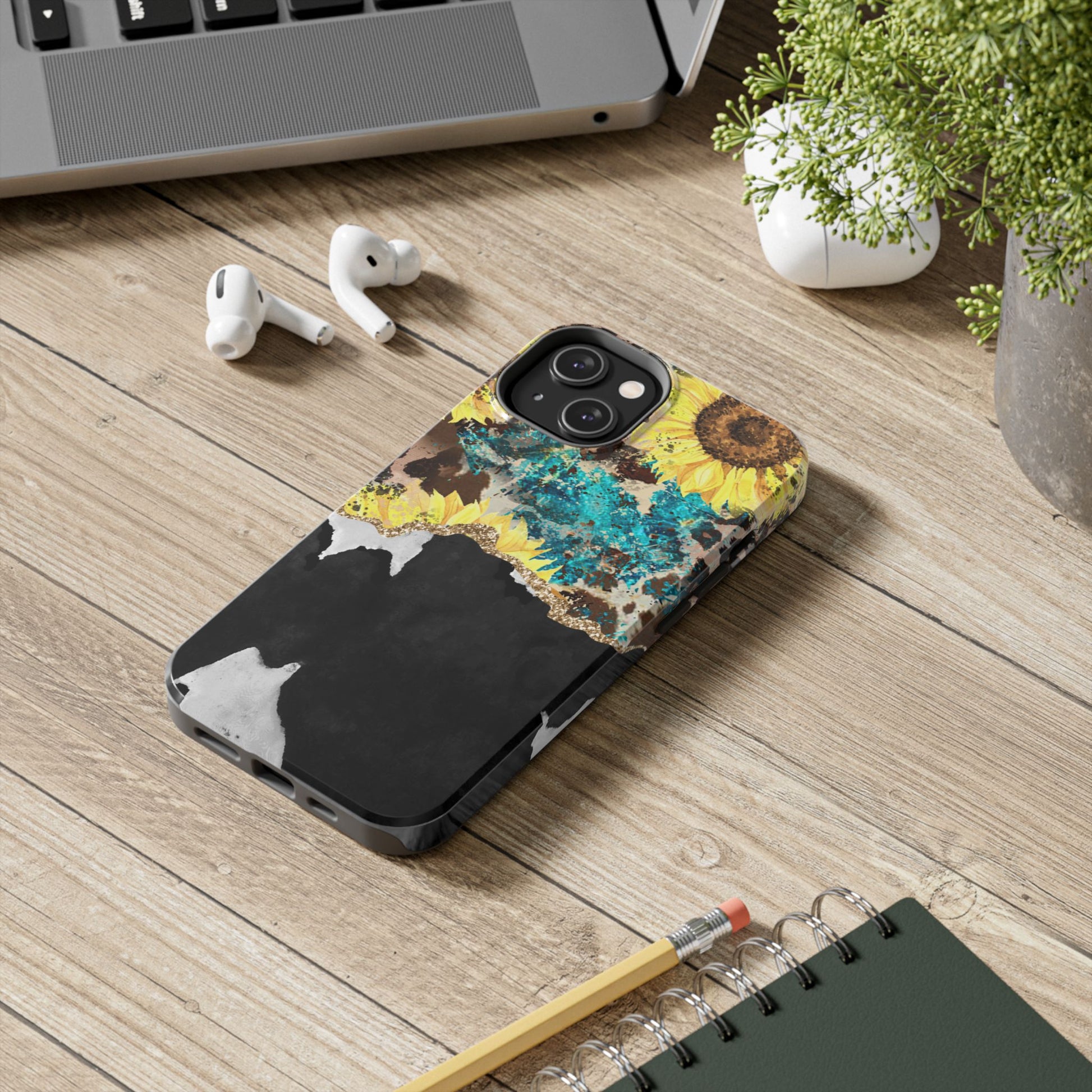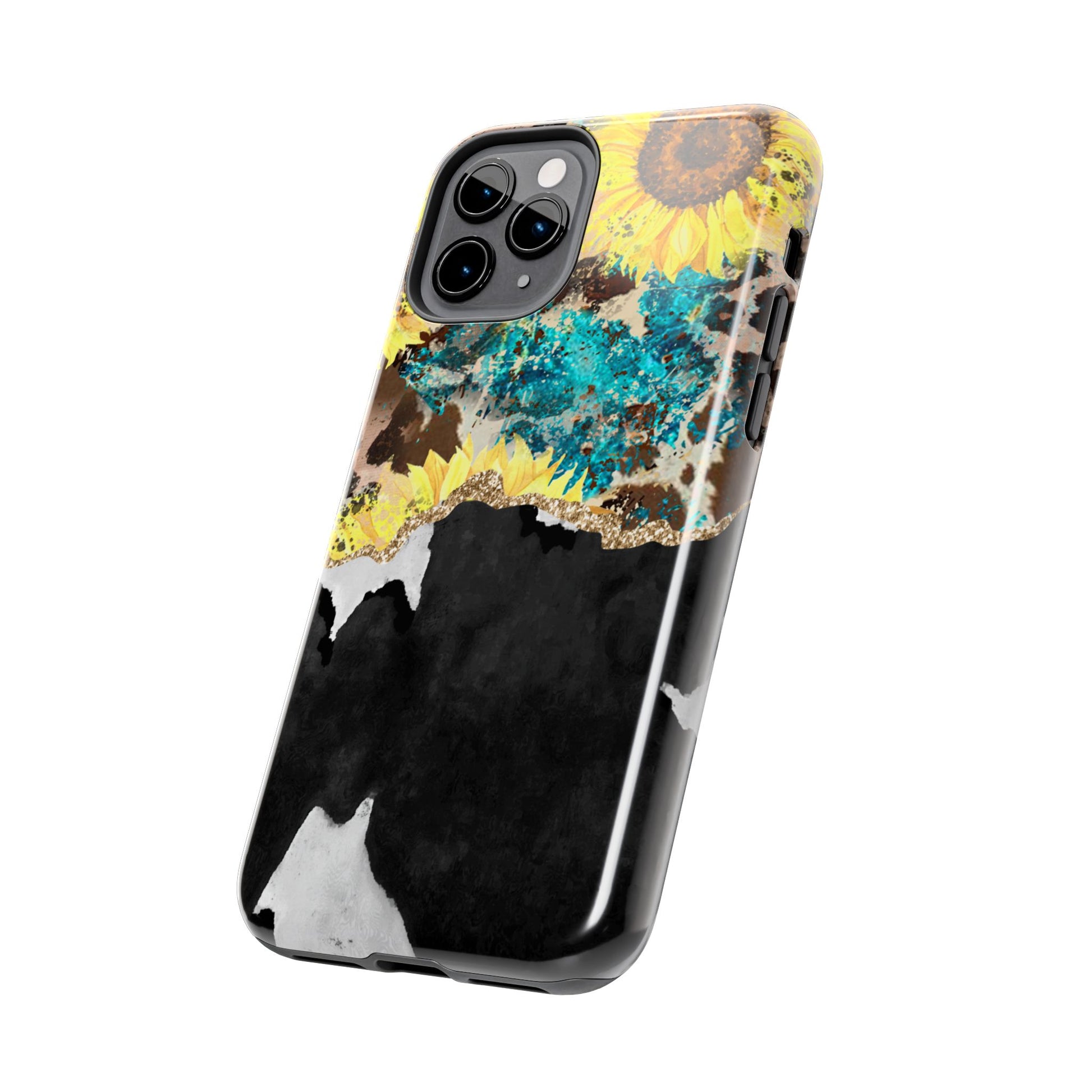 Embrace rustic elegance with our Rustic Sunflower Leopard Glam iPhone Case! This striking design combines wild leopard print with vibrant sunflowers, turquoise splashes, and a chic black-and-gold glitter accent for an edgy, layered look. The combination of textures and colors gives off a boho-glam vibe, perfect for those who love a unique, artistic style. Made with a tough polycarbonate shell and cushioned TPU liner, this case protects your phone while letting your personality shine. It’s the ideal accessory for anyone with a bold and adventurous spirit!