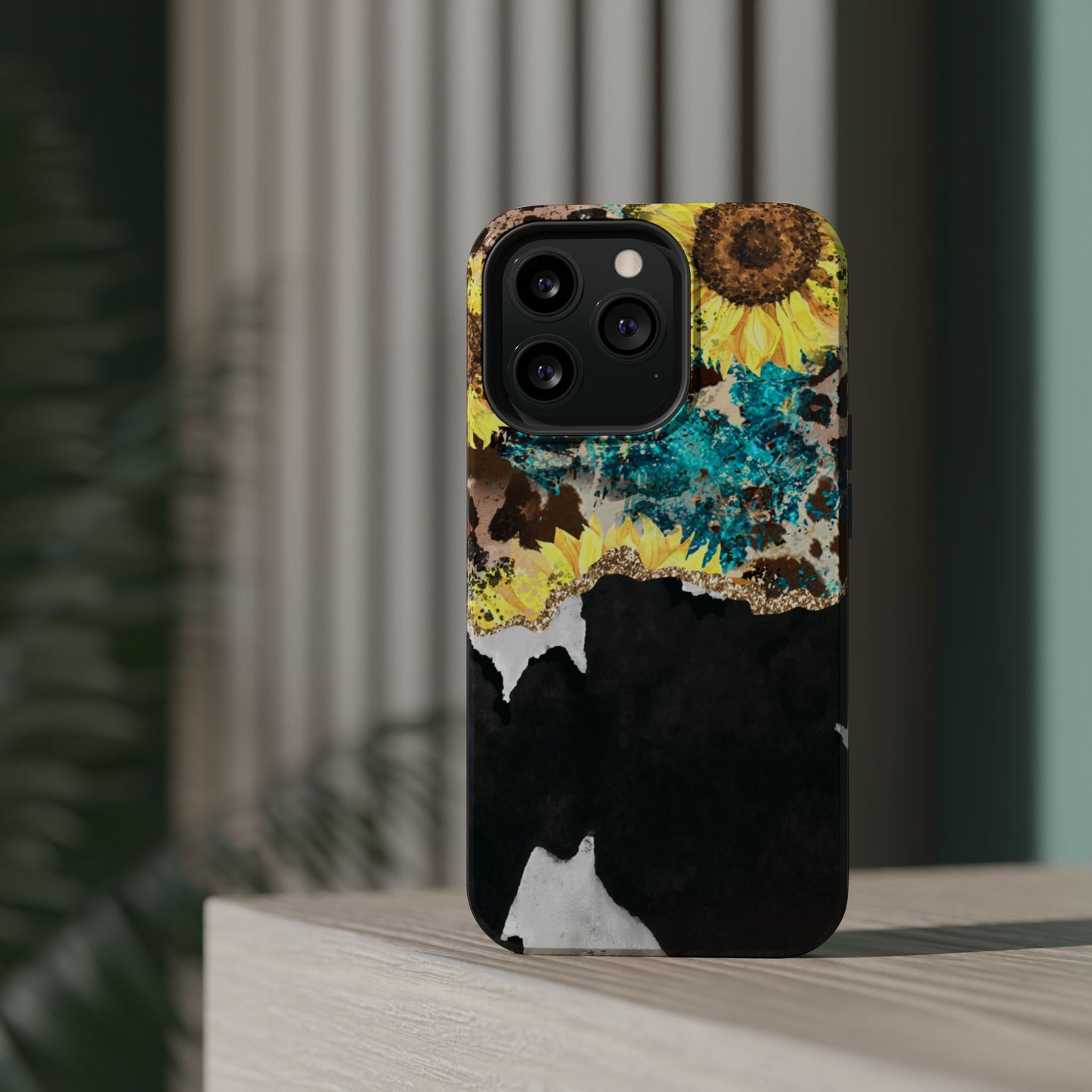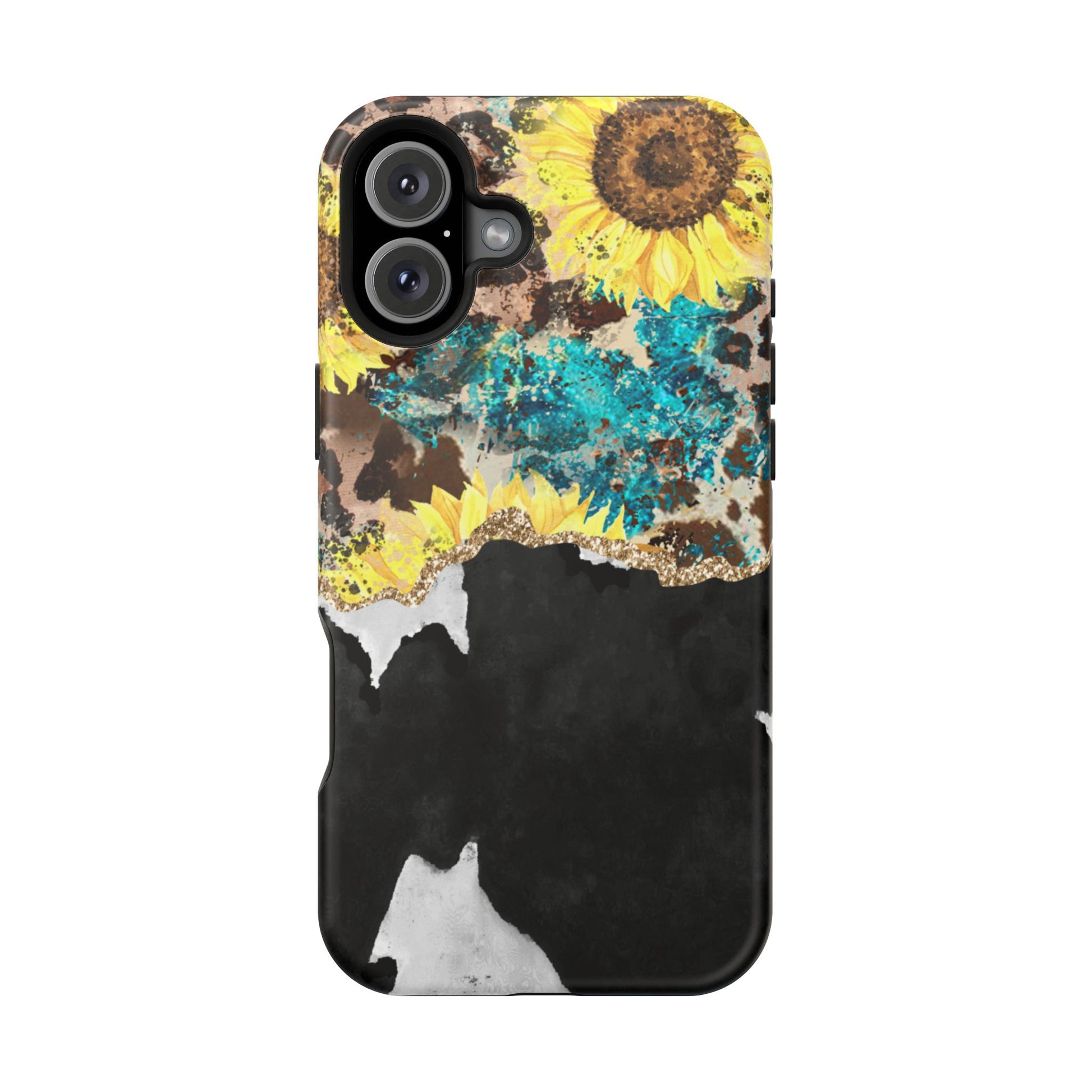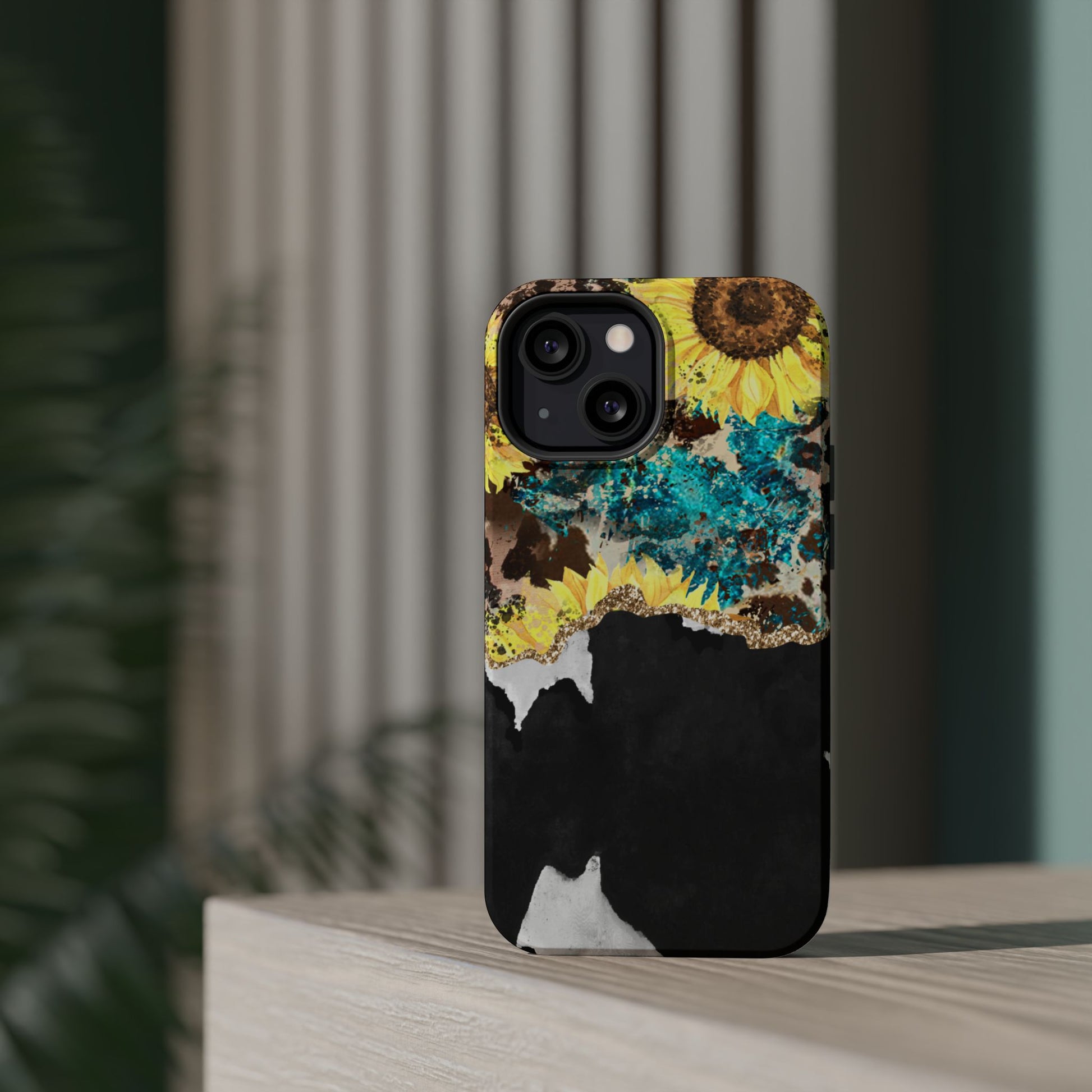 Embrace rustic elegance with our Rustic Sunflower Leopard Glam MagSafe iPhone Case! This striking design combines wild leopard print with vibrant sunflowers, turquoise splashes, and a chic black-and-gold glitter accent for an edgy, layered look. The combination of textures and colors gives off a boho-glam vibe, perfect for those who love a unique, artistic style. Made with a tough polycarbonate shell and cushioned TPU liner, this case protects your phone while letting your personality shine. It’s the ideal accessory for anyone with a bold and adventurous spirit!
