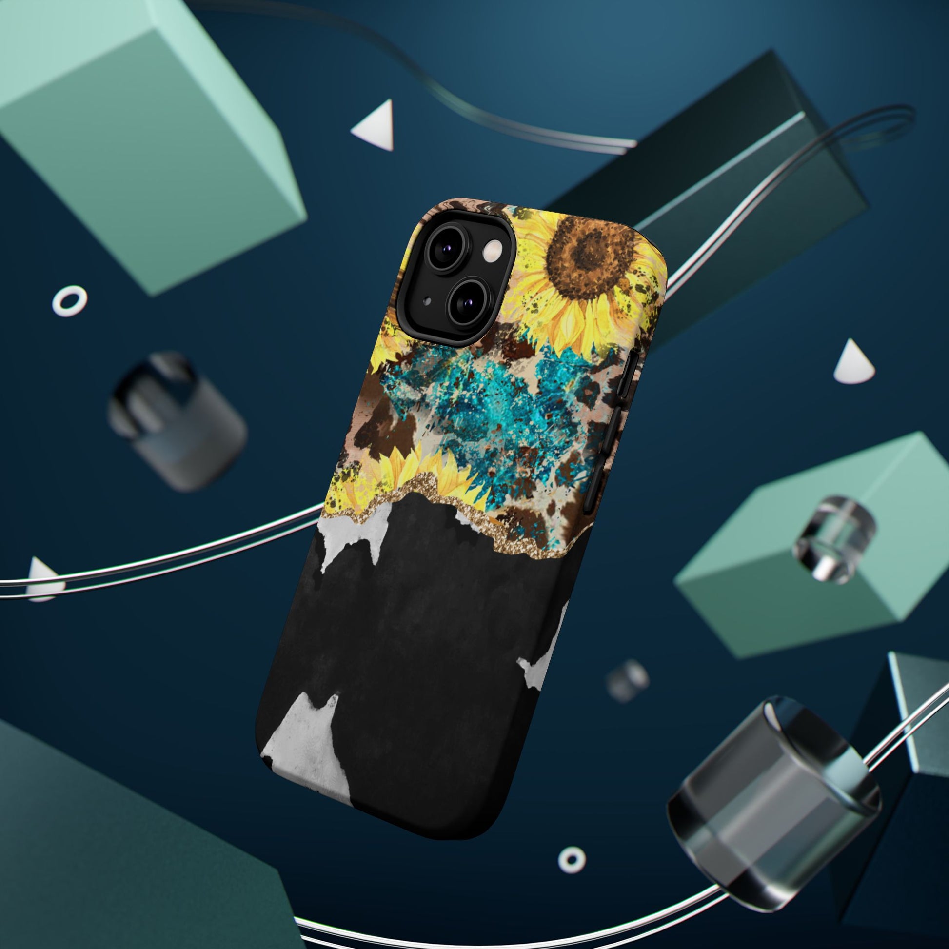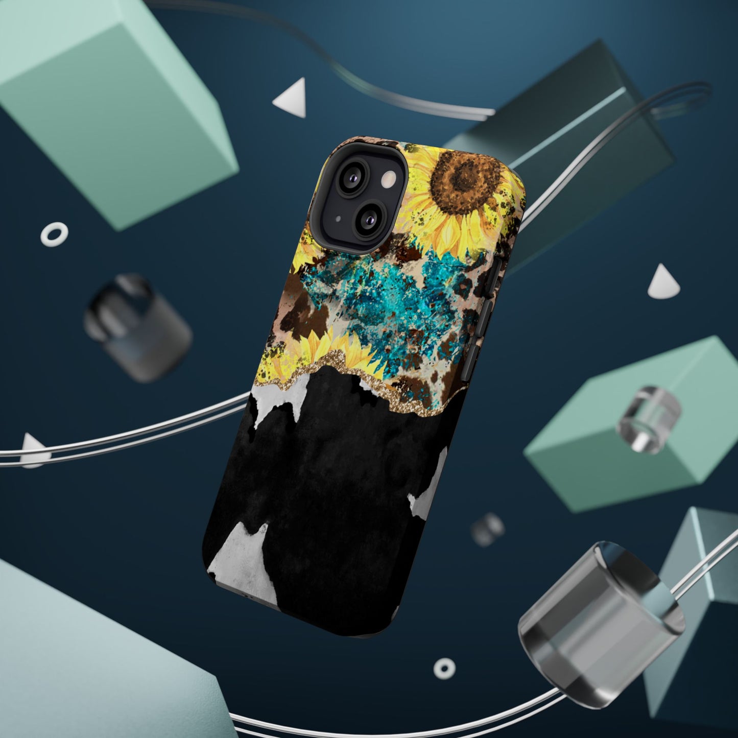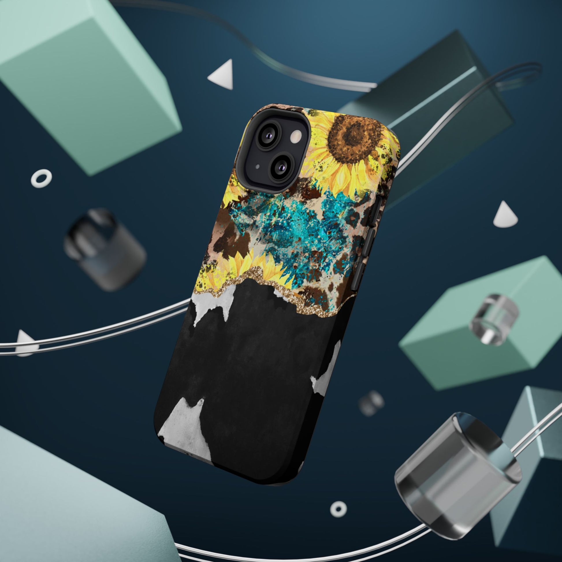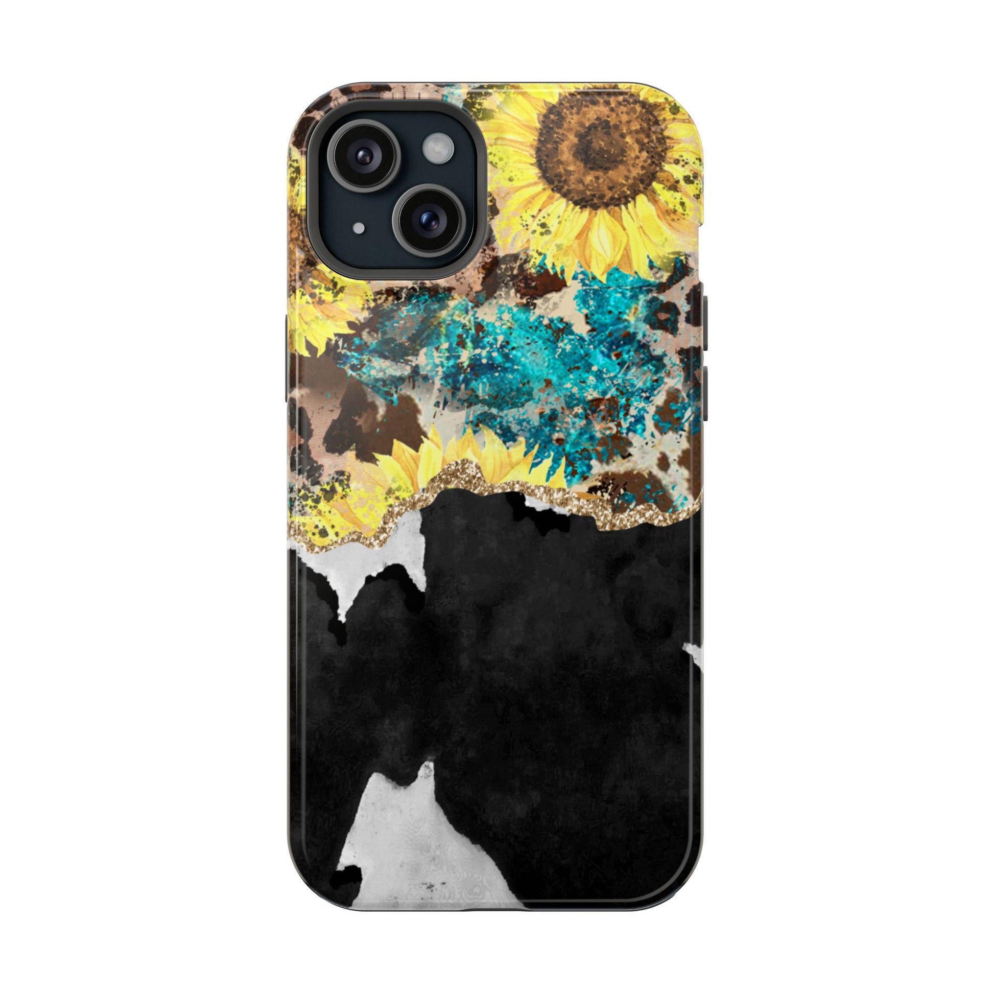 Embrace rustic elegance with our Rustic Sunflower Leopard Glam MagSafe iPhone Case! This striking design combines wild leopard print with vibrant sunflowers, turquoise splashes, and a chic black-and-gold glitter accent for an edgy, layered look. The combination of textures and colors gives off a boho-glam vibe, perfect for those who love a unique, artistic style. Made with a tough polycarbonate shell and cushioned TPU liner, this case protects your phone while letting your personality shine. It’s the ideal accessory for anyone with a bold and adventurous spirit!