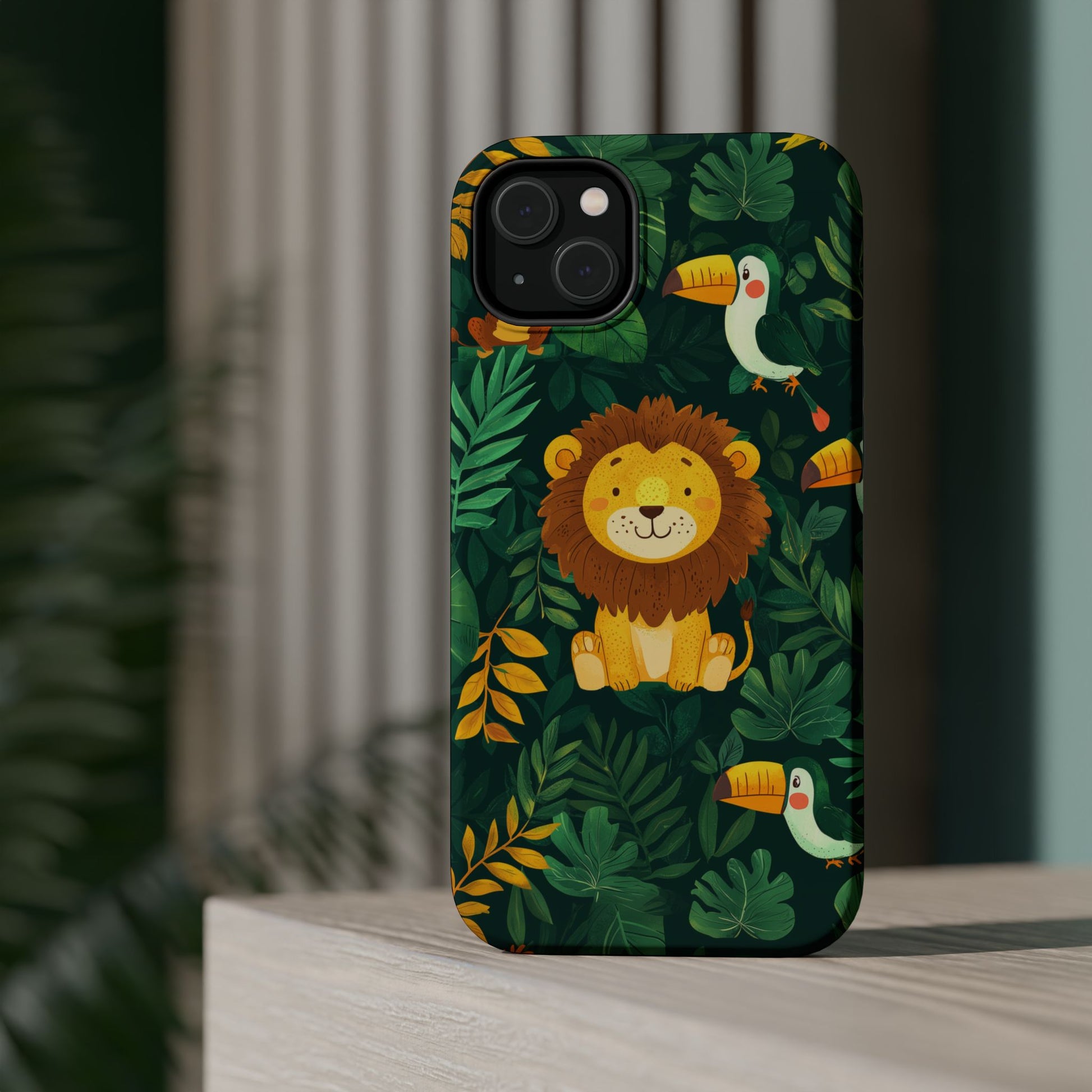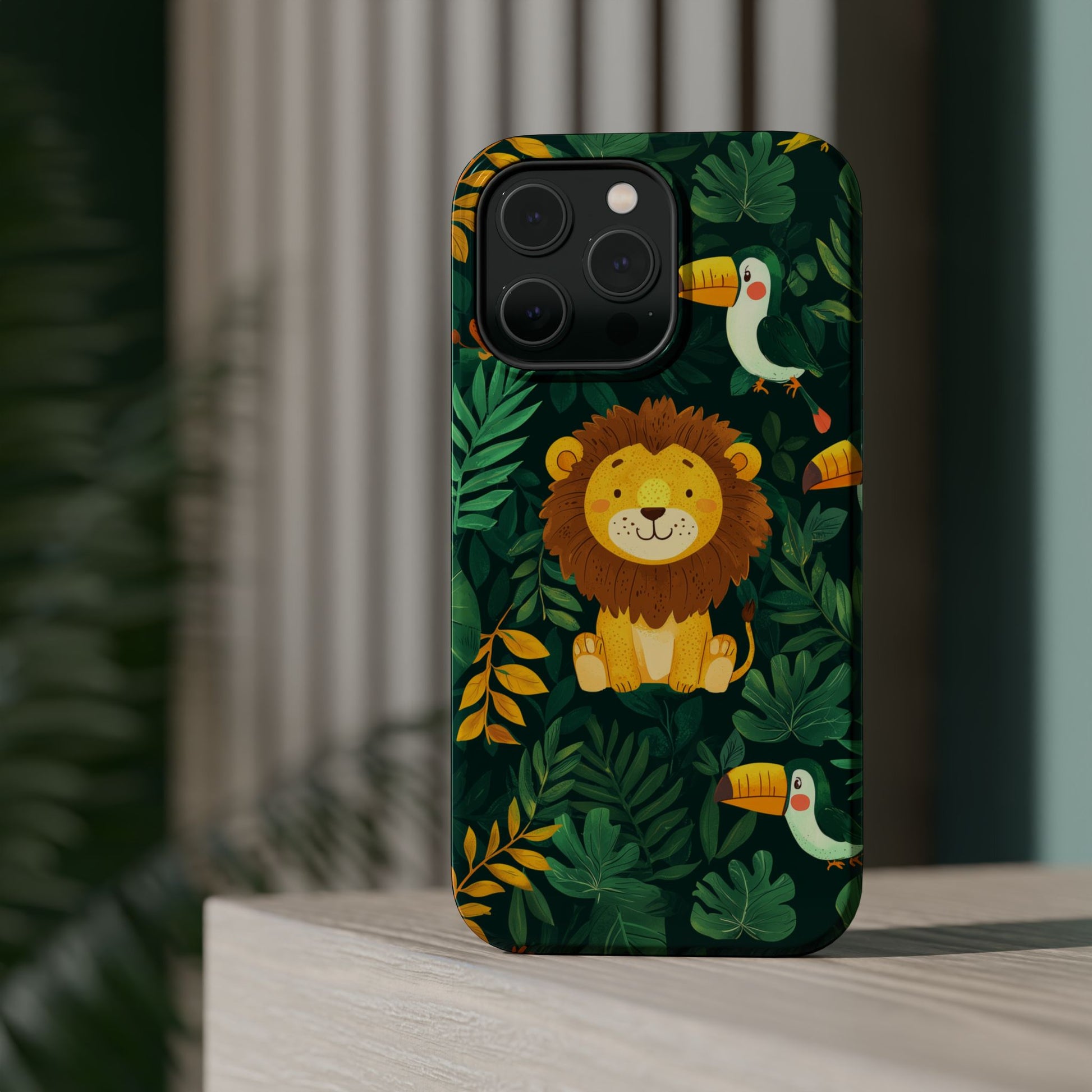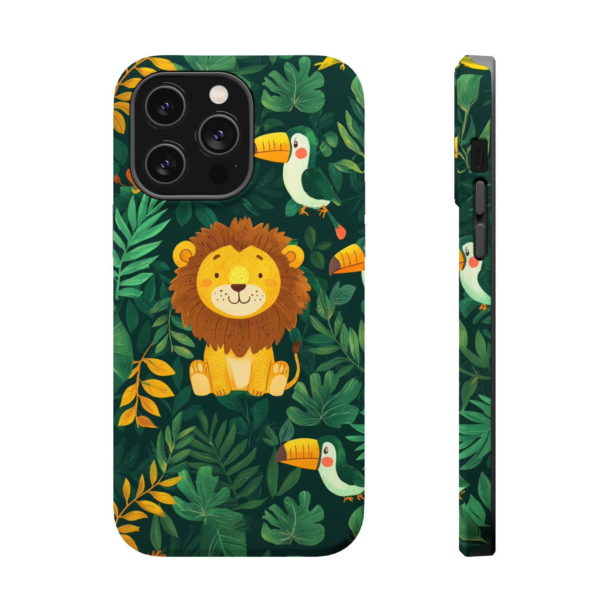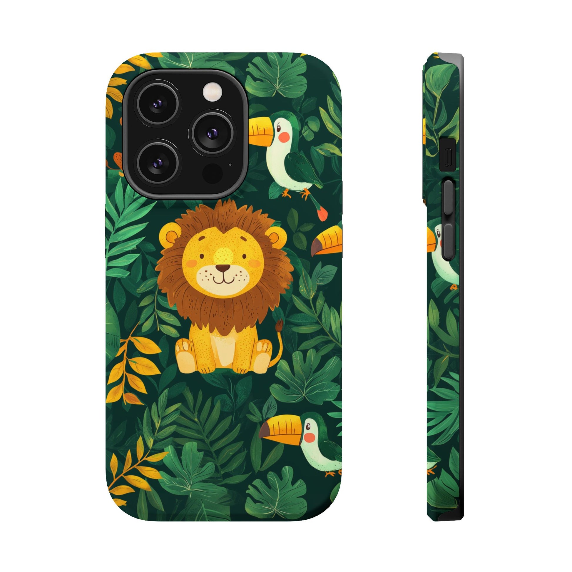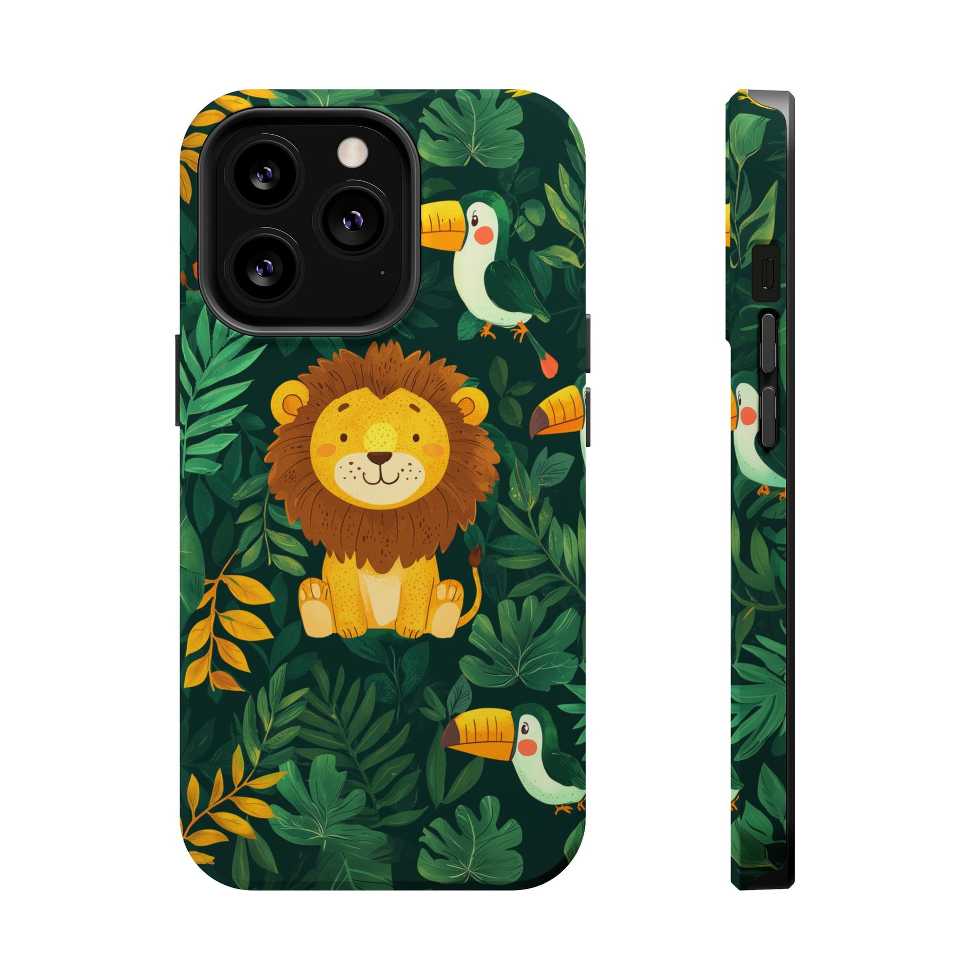Embrace the wild with our Safari Jungle Animals MagSafe iPhone Case! This charming design features a friendly lion, playful monkeys, and vibrant toucans nestled among lush jungle leaves in deep greens and pops of yellow. Perfect for animal lovers or anyone looking to add a bit of adventure to their everyday look, this case combines cuteness with a rugged, durable build to keep your phone safe. Made to endure daily bumps and drops, this case is as tough as it is adorable, bringing a piece of the jungle to your pocket!
