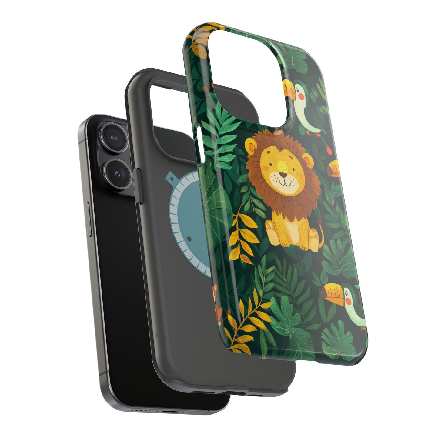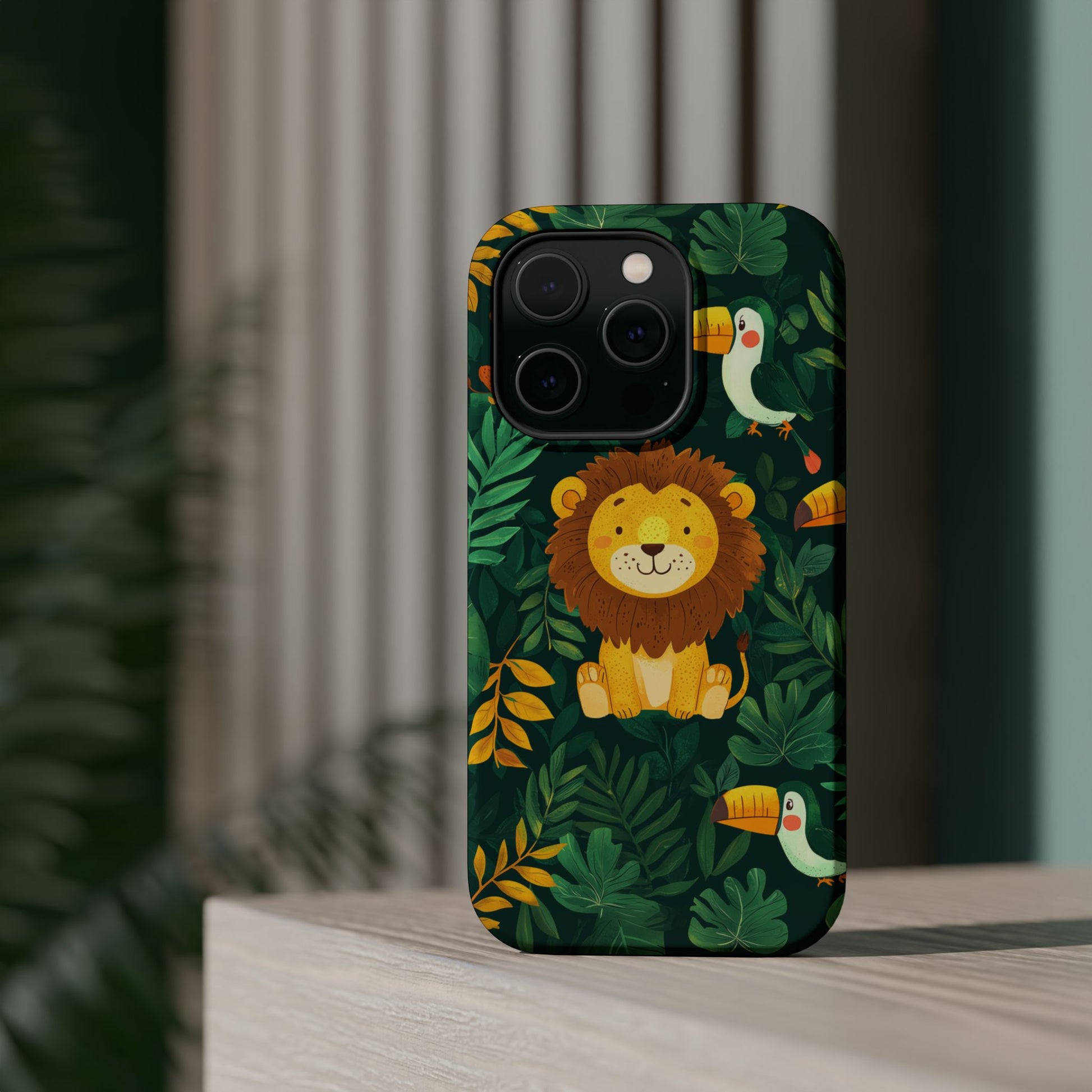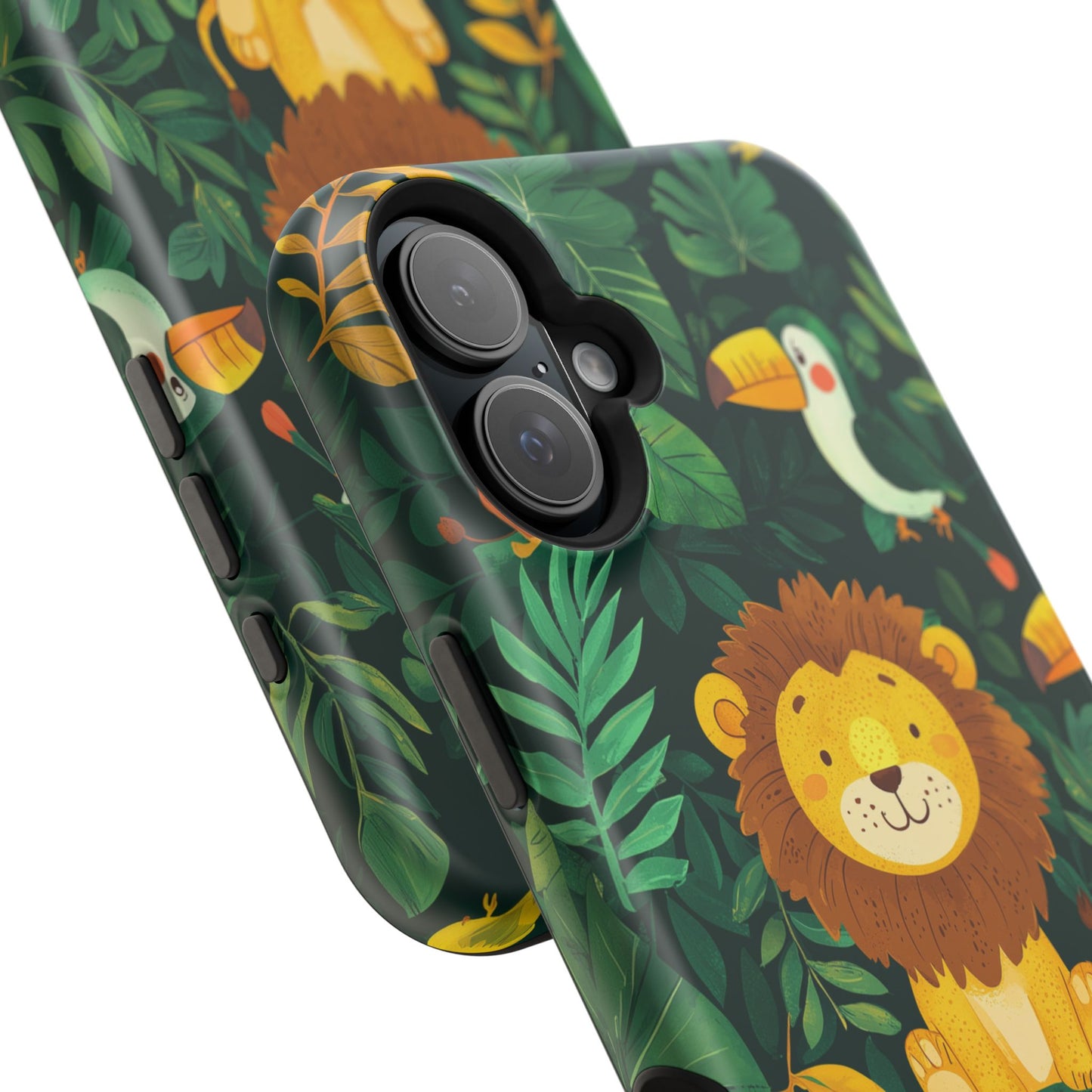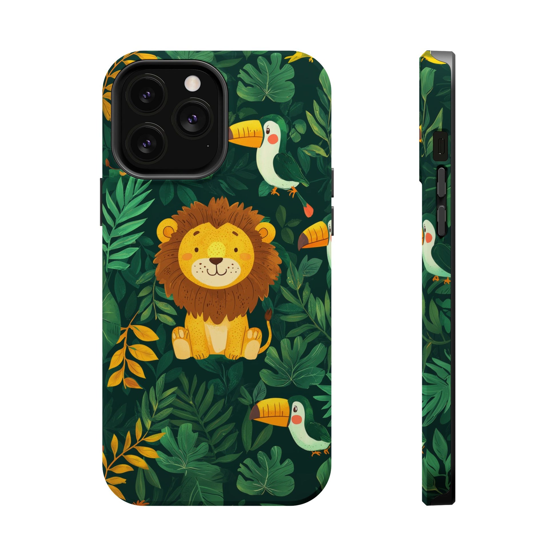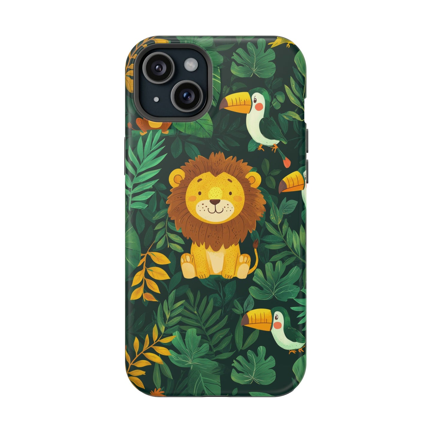 Embrace the wild with our Safari Jungle Animals MagSafe iPhone Case! This charming design features a friendly lion, playful monkeys, and vibrant toucans nestled among lush jungle leaves in deep greens and pops of yellow. Perfect for animal lovers or anyone looking to add a bit of adventure to their everyday look, this case combines cuteness with a rugged, durable build to keep your phone safe. Made to endure daily bumps and drops, this case is as tough as it is adorable, bringing a piece of the jungle to your pocket!