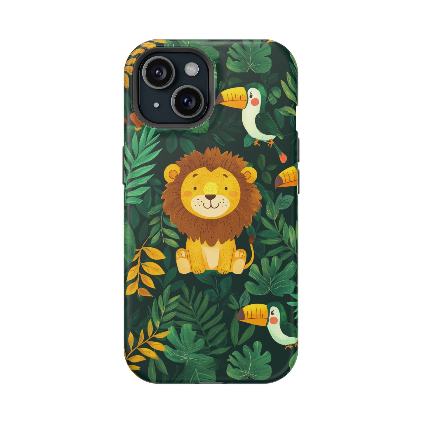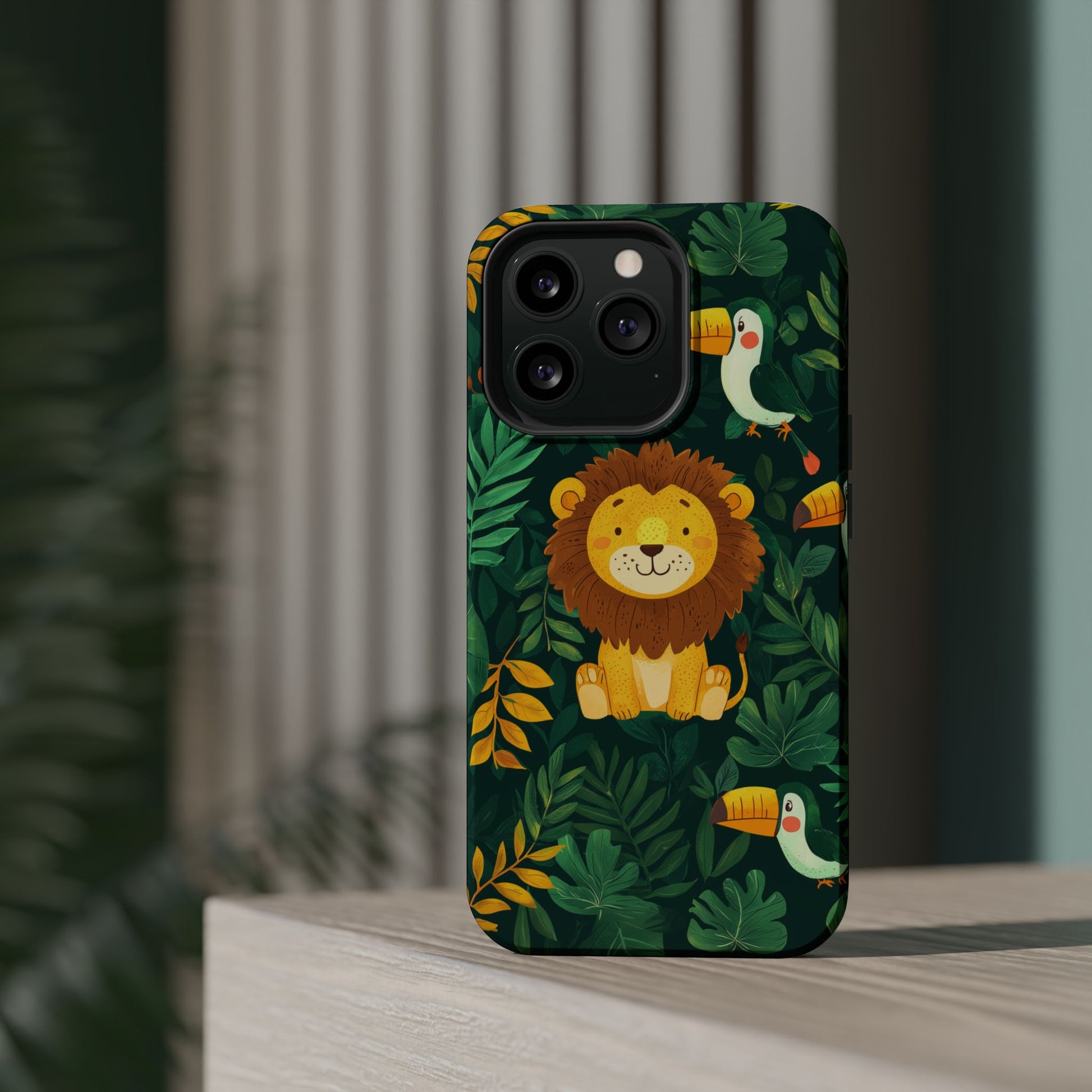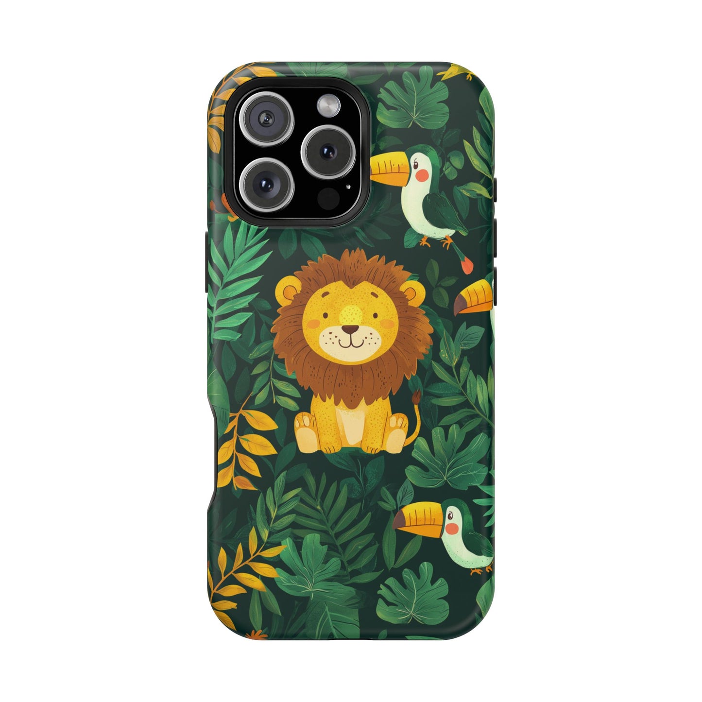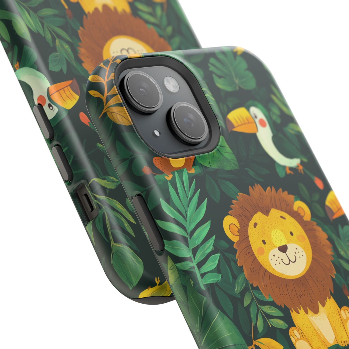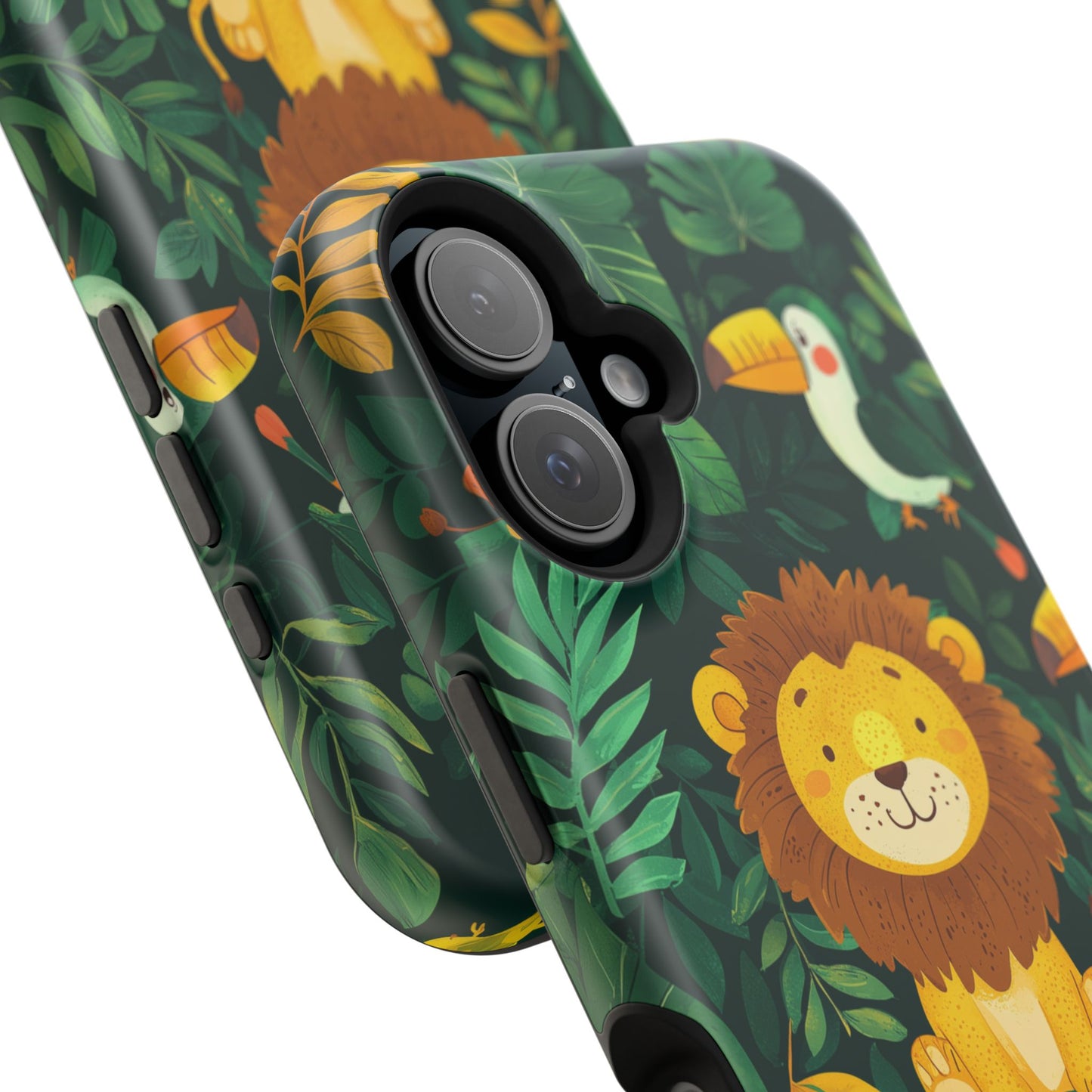Embrace the wild with our Safari Jungle Animals MagSafe iPhone Case! This charming design features a friendly lion, playful monkeys, and vibrant toucans nestled among lush jungle leaves in deep greens and pops of yellow. Perfect for animal lovers or anyone looking to add a bit of adventure to their everyday look, this case combines cuteness with a rugged, durable build to keep your phone safe. Made to endure daily bumps and drops, this case is as tough as it is adorable, bringing a piece of the jungle to your pocket!