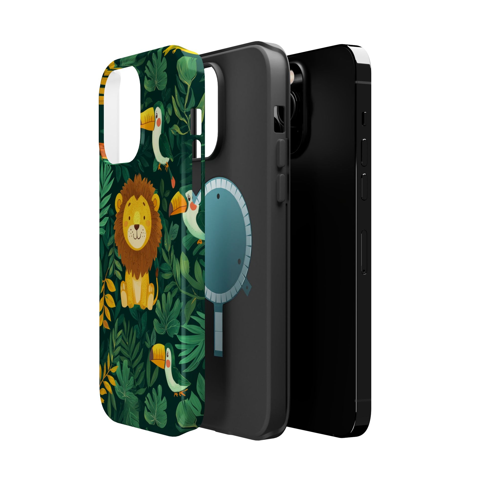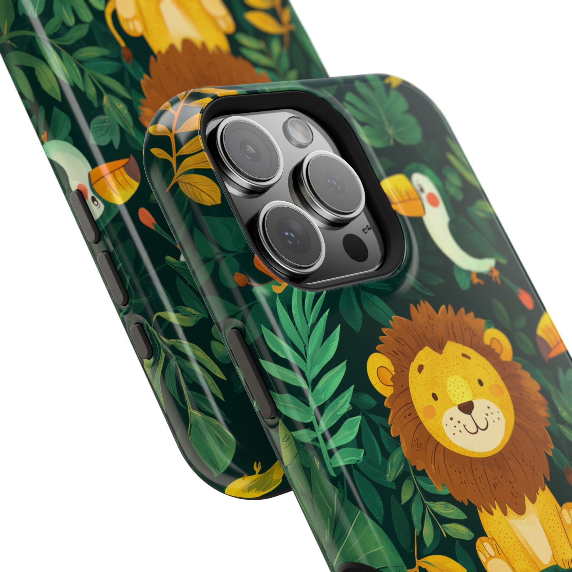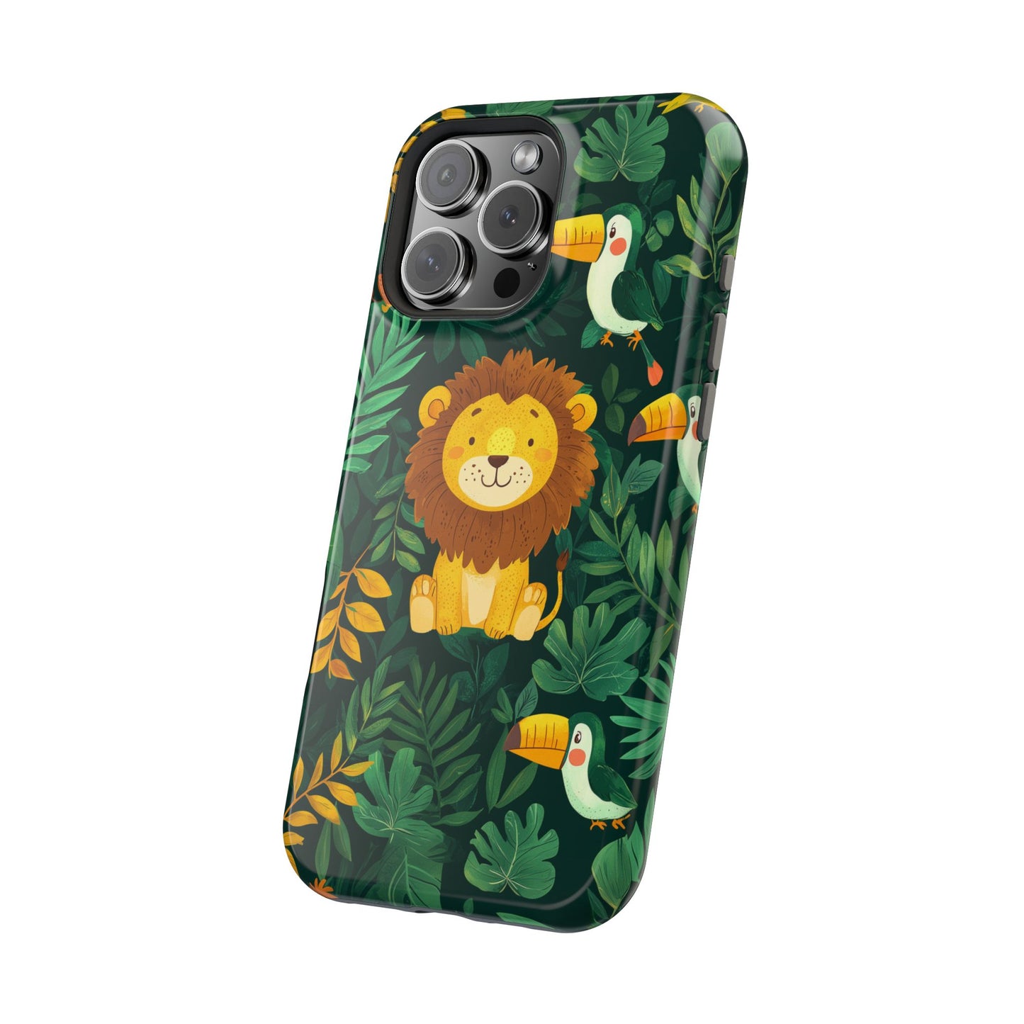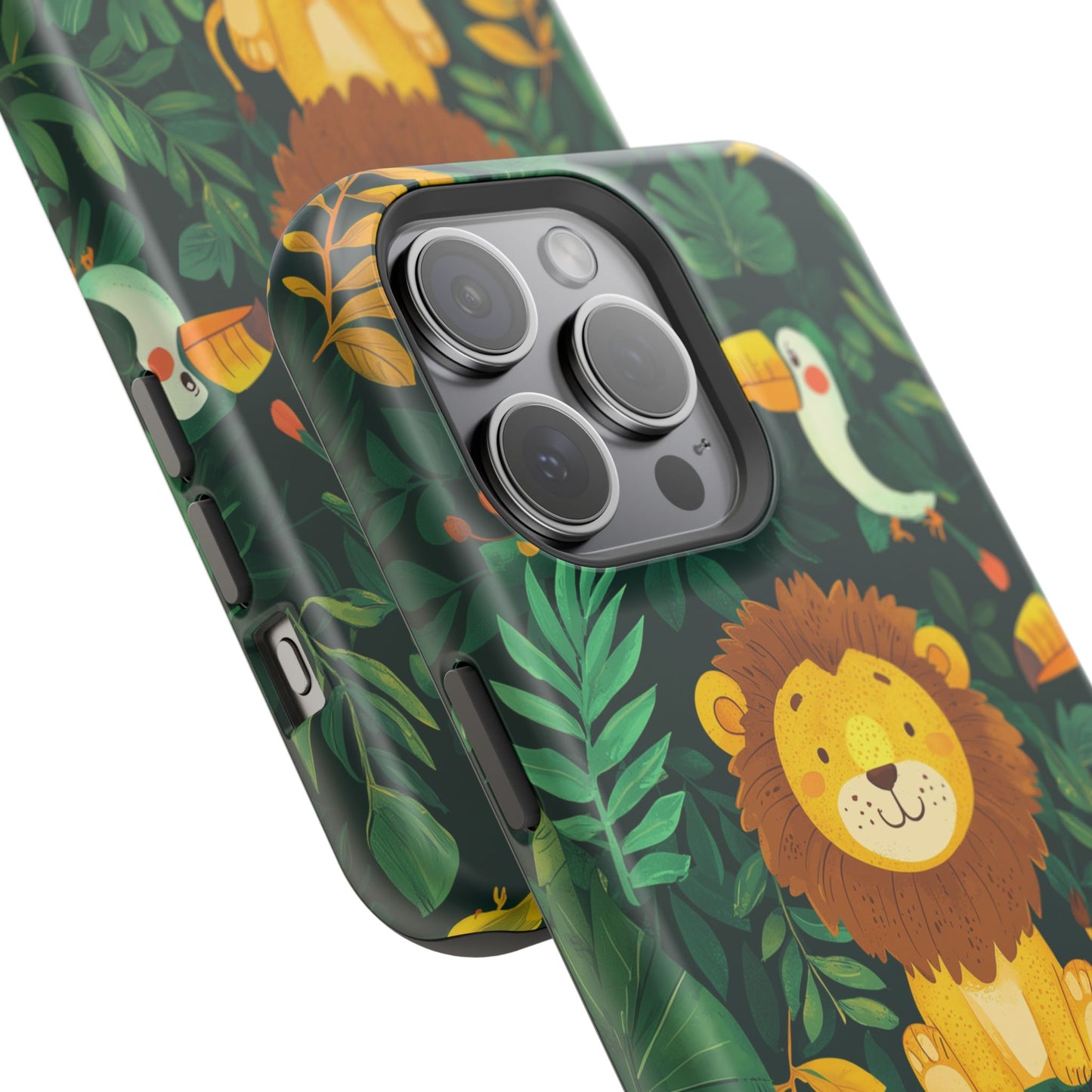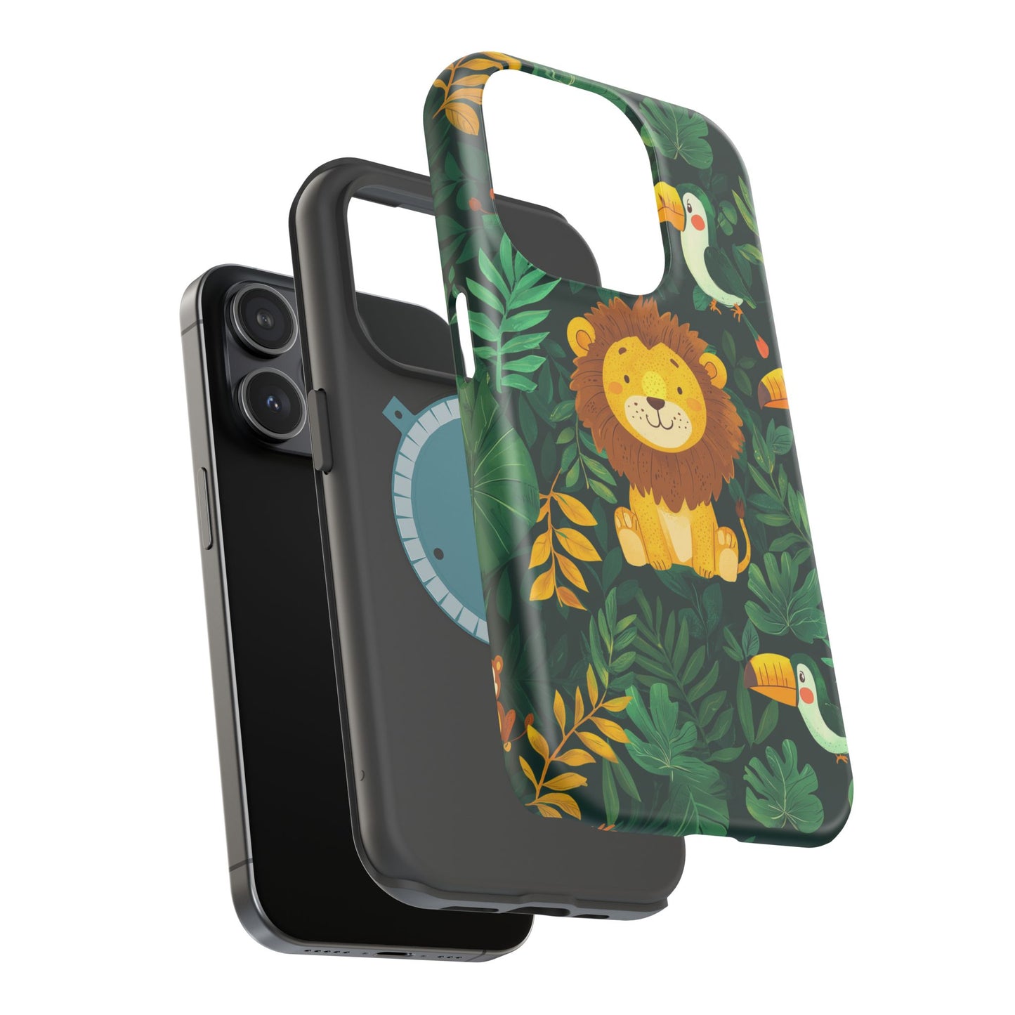 Embrace the wild with our Safari Jungle Animals MagSafe iPhone Case! This charming design features a friendly lion, playful monkeys, and vibrant toucans nestled among lush jungle leaves in deep greens and pops of yellow. Perfect for animal lovers or anyone looking to add a bit of adventure to their everyday look, this case combines cuteness with a rugged, durable build to keep your phone safe. Made to endure daily bumps and drops, this case is as tough as it is adorable, bringing a piece of the jungle to your pocket!