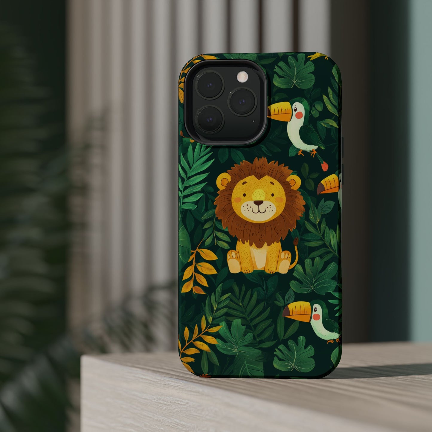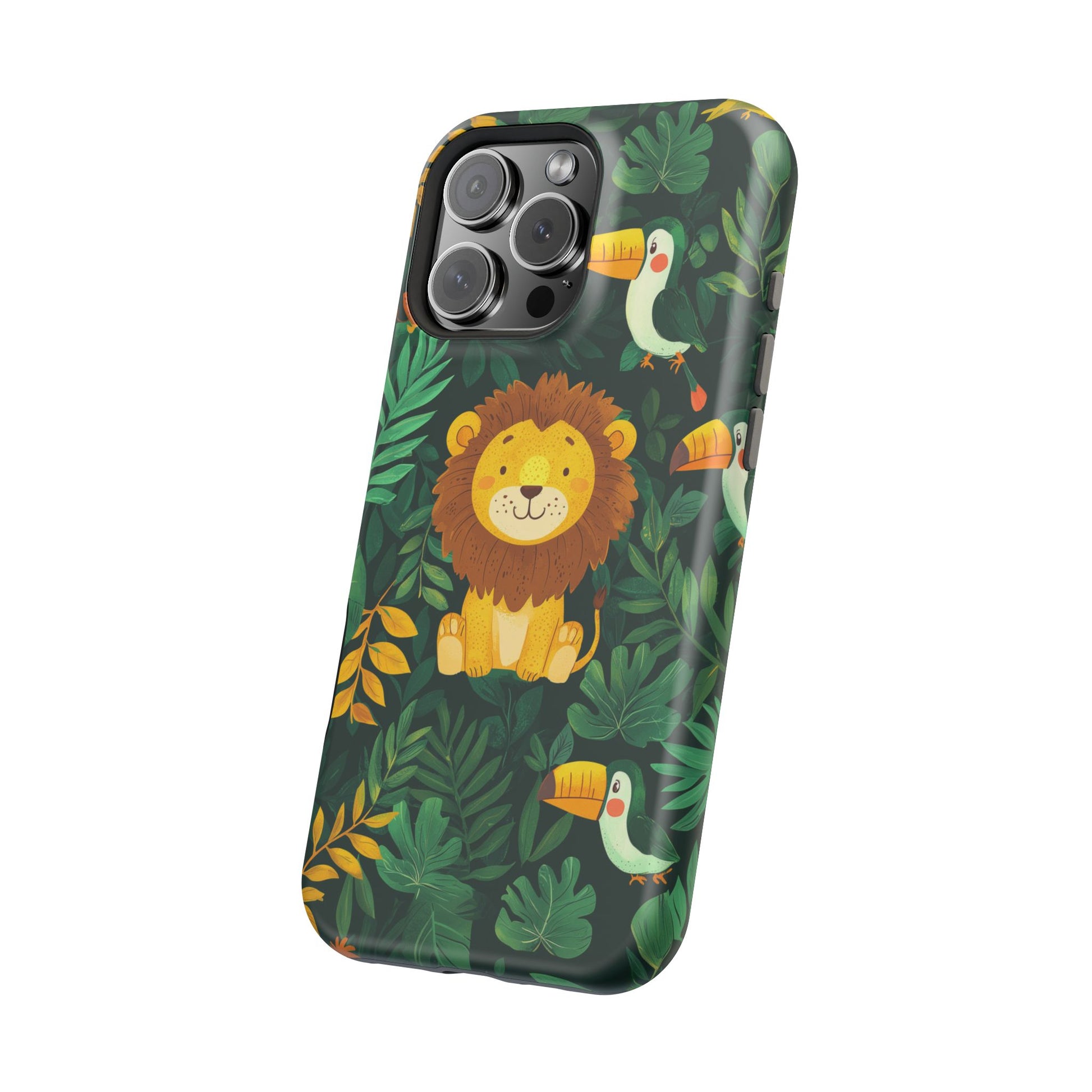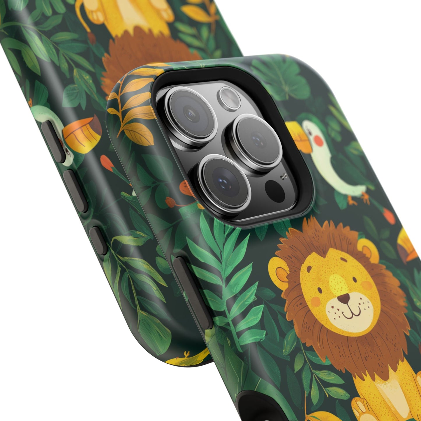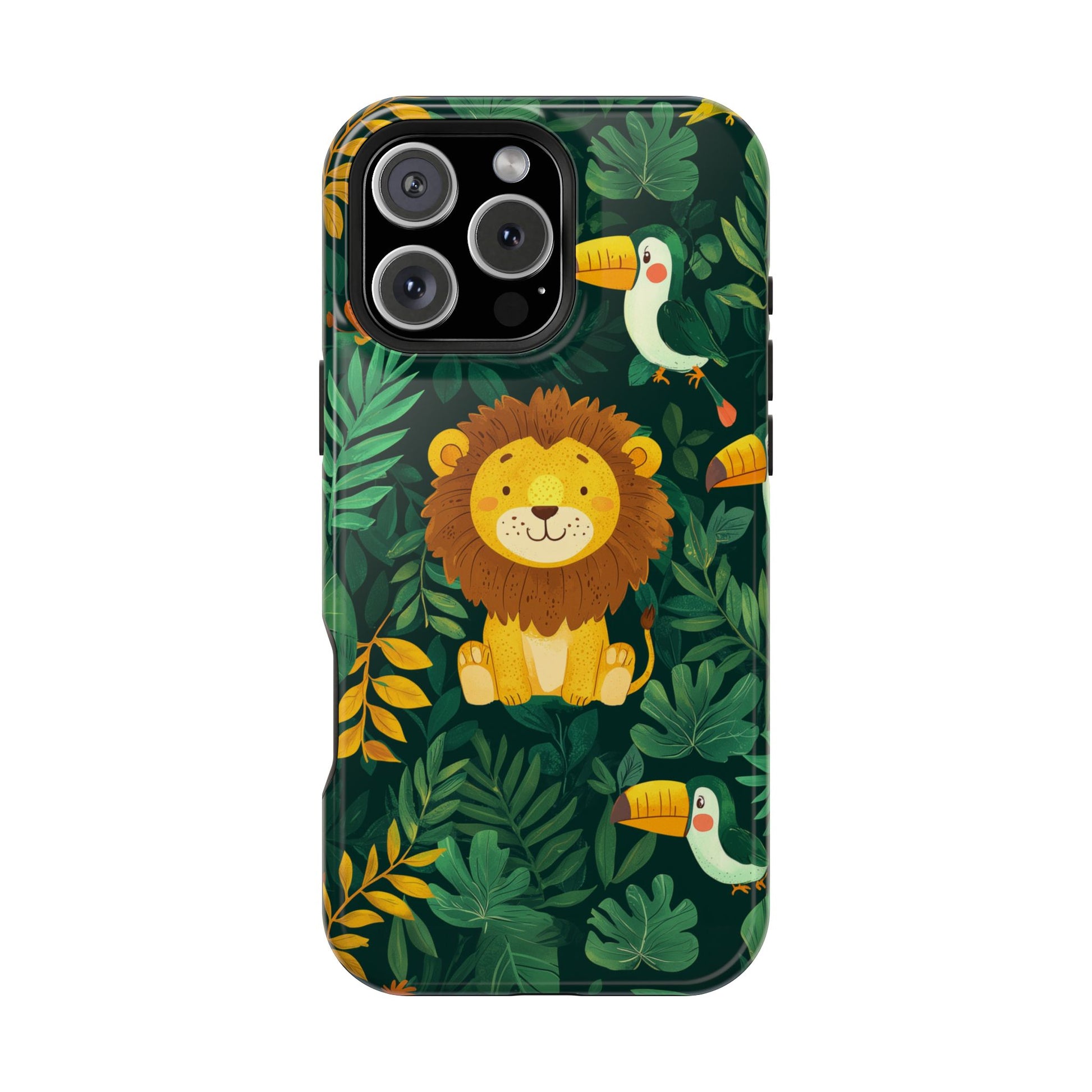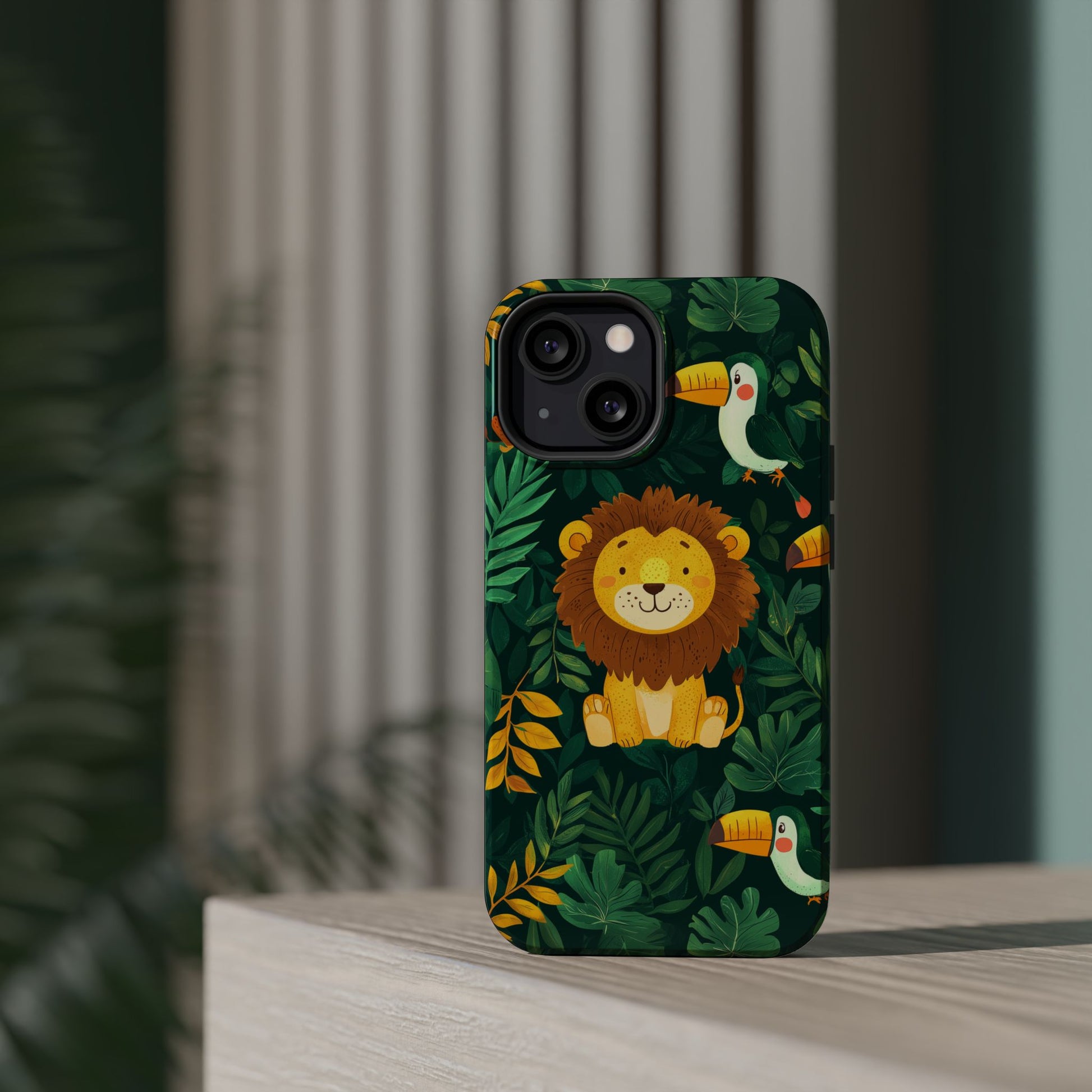 Embrace the wild with our Safari Jungle Animals MagSafe iPhone Case! This charming design features a friendly lion, playful monkeys, and vibrant toucans nestled among lush jungle leaves in deep greens and pops of yellow. Perfect for animal lovers or anyone looking to add a bit of adventure to their everyday look, this case combines cuteness with a rugged, durable build to keep your phone safe. Made to endure daily bumps and drops, this case is as tough as it is adorable, bringing a piece of the jungle to your pocket!