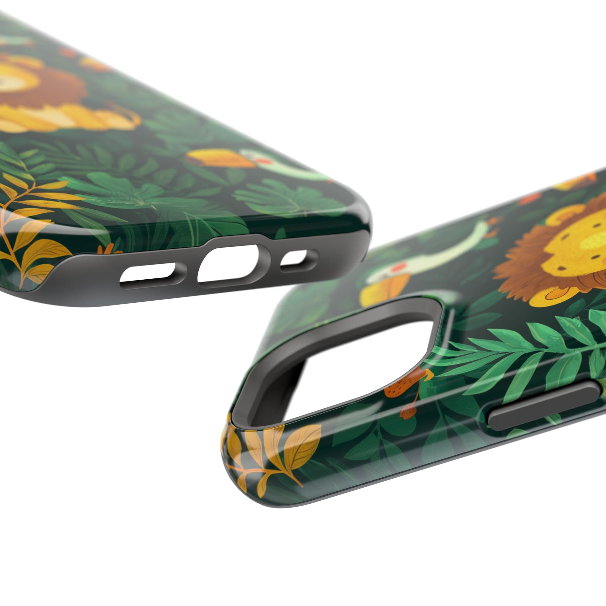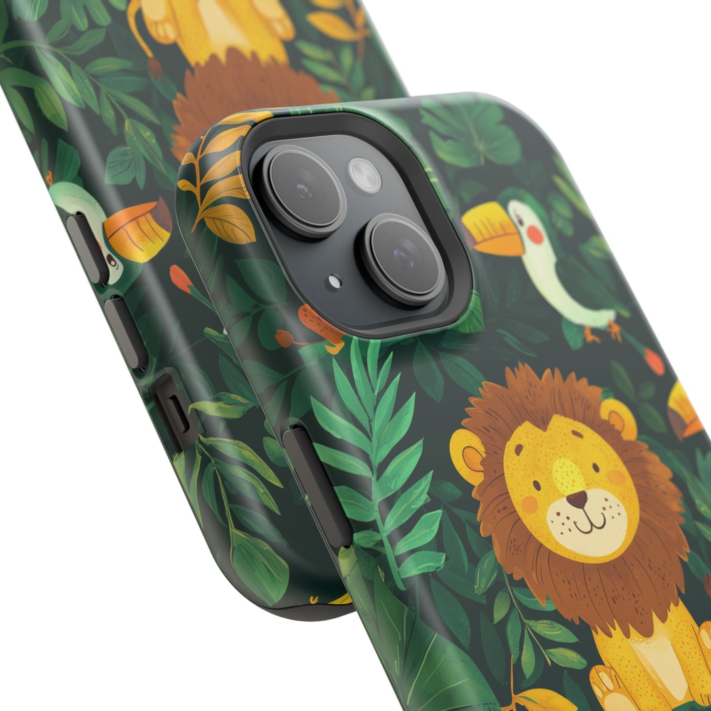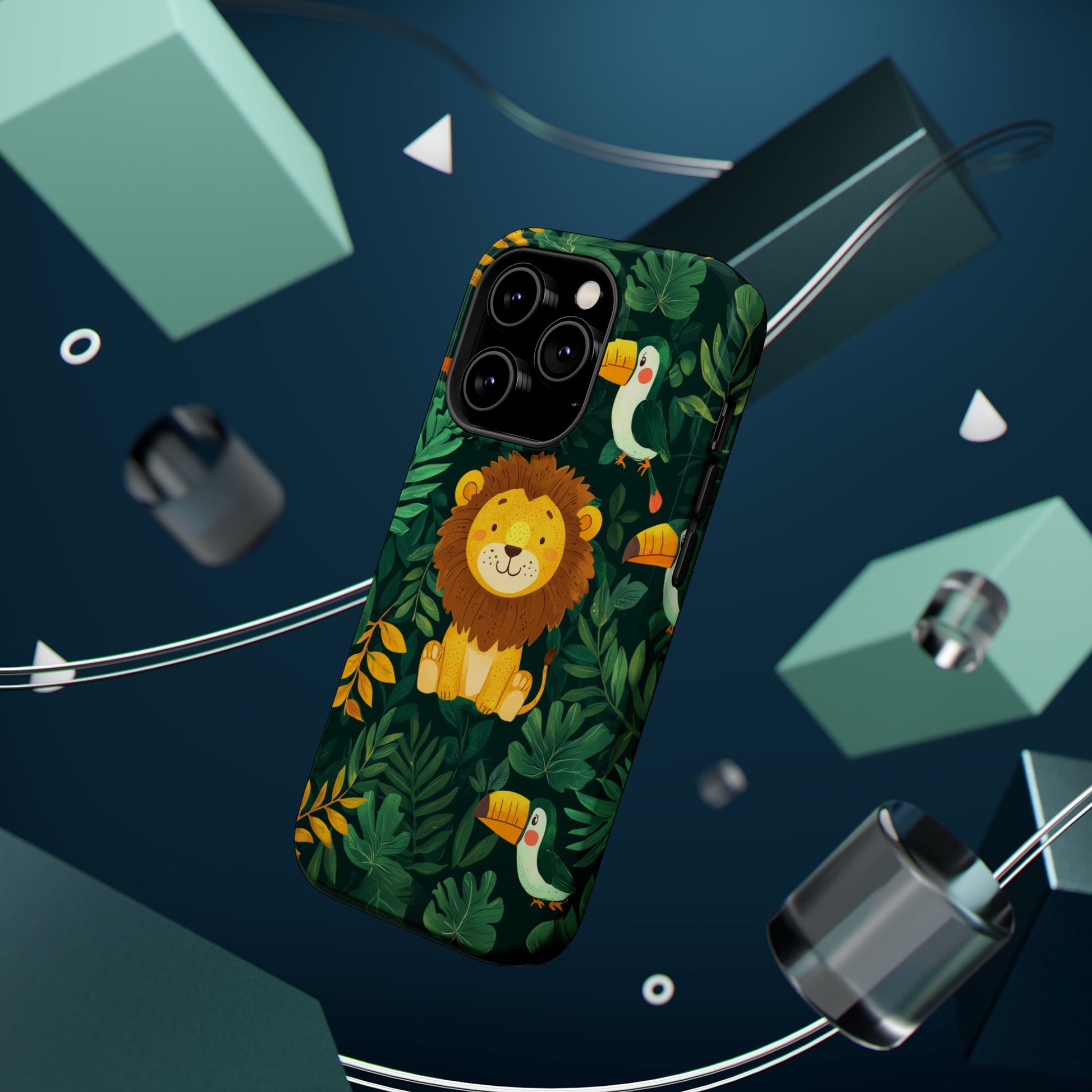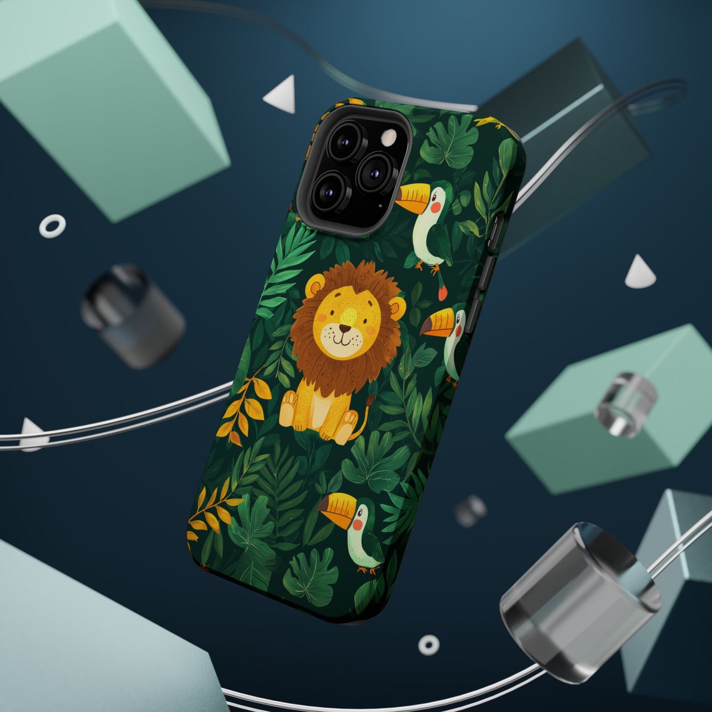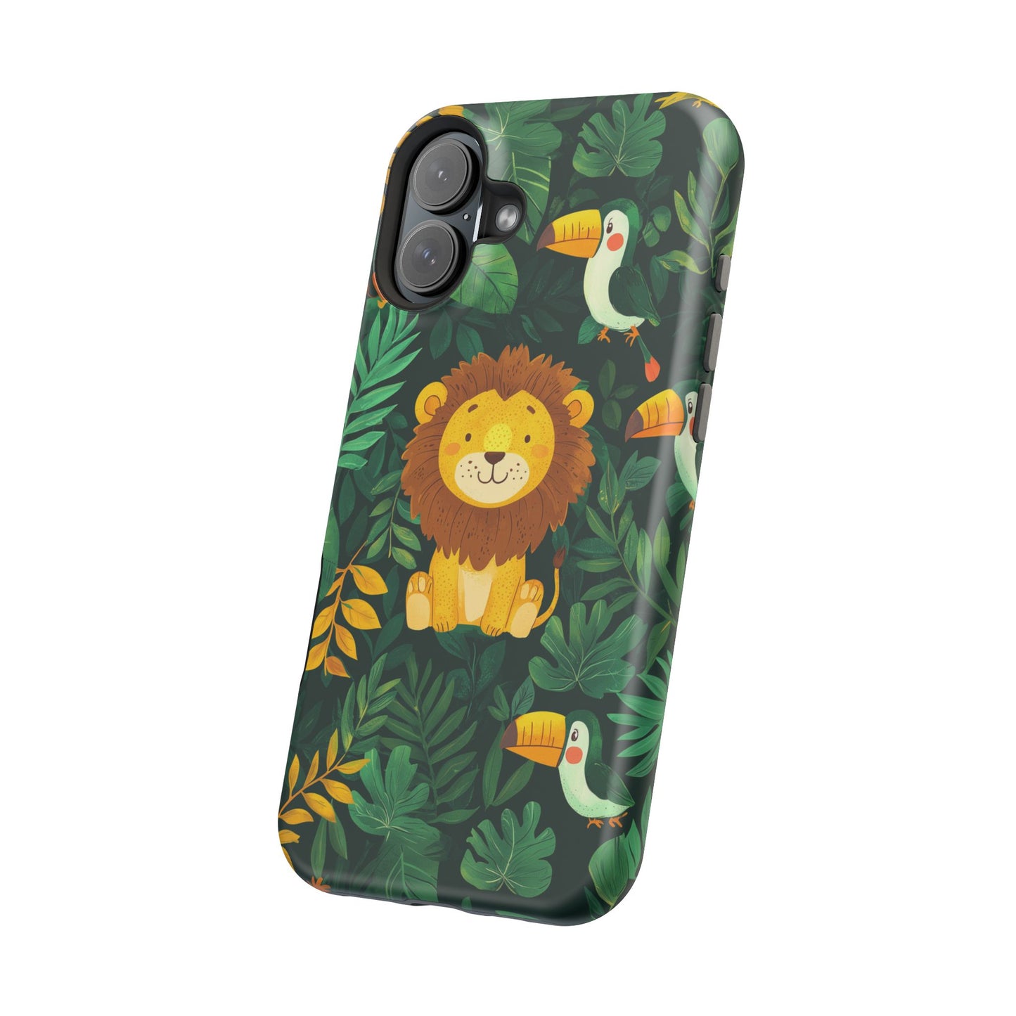 Embrace the wild with our Safari Jungle Animals MagSafe iPhone Case! This charming design features a friendly lion, playful monkeys, and vibrant toucans nestled among lush jungle leaves in deep greens and pops of yellow. Perfect for animal lovers or anyone looking to add a bit of adventure to their everyday look, this case combines cuteness with a rugged, durable build to keep your phone safe. Made to endure daily bumps and drops, this case is as tough as it is adorable, bringing a piece of the jungle to your pocket!