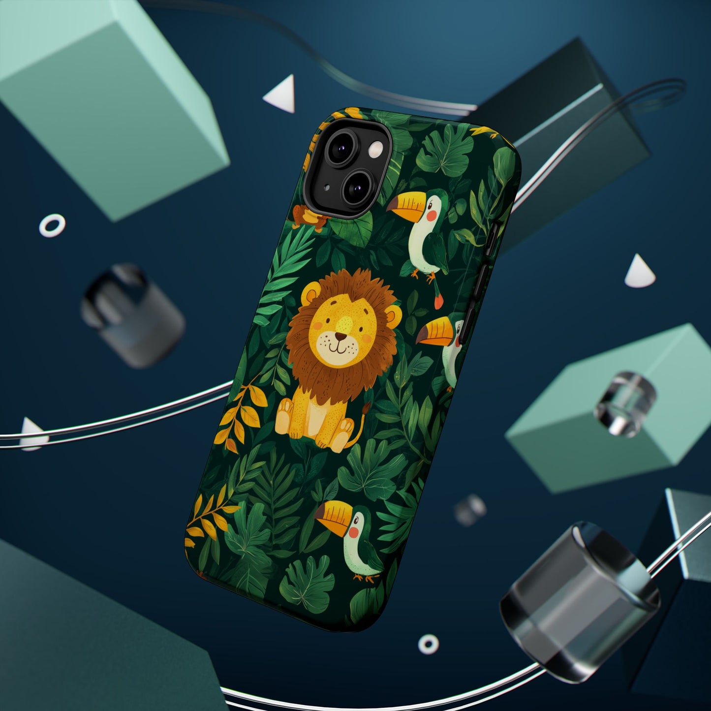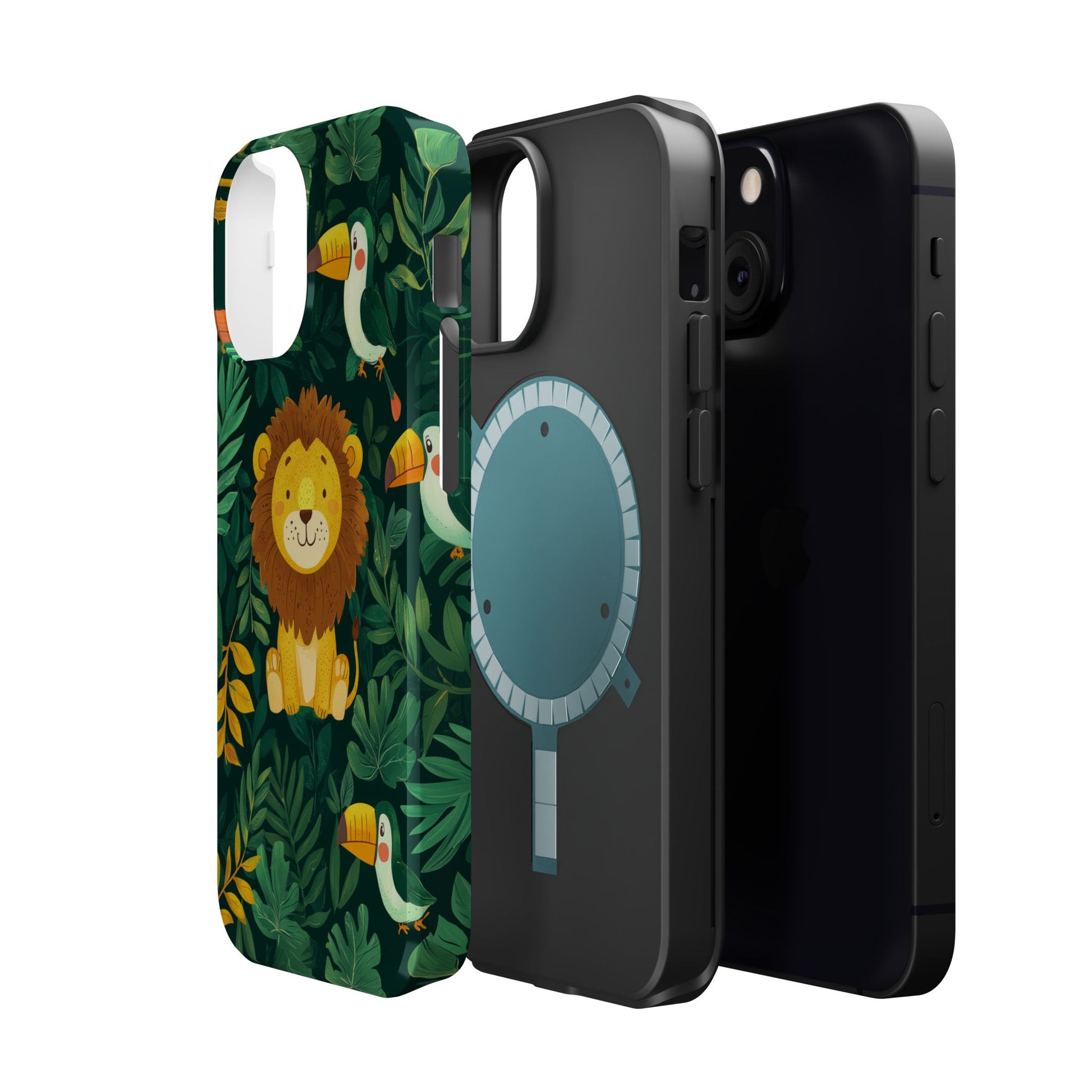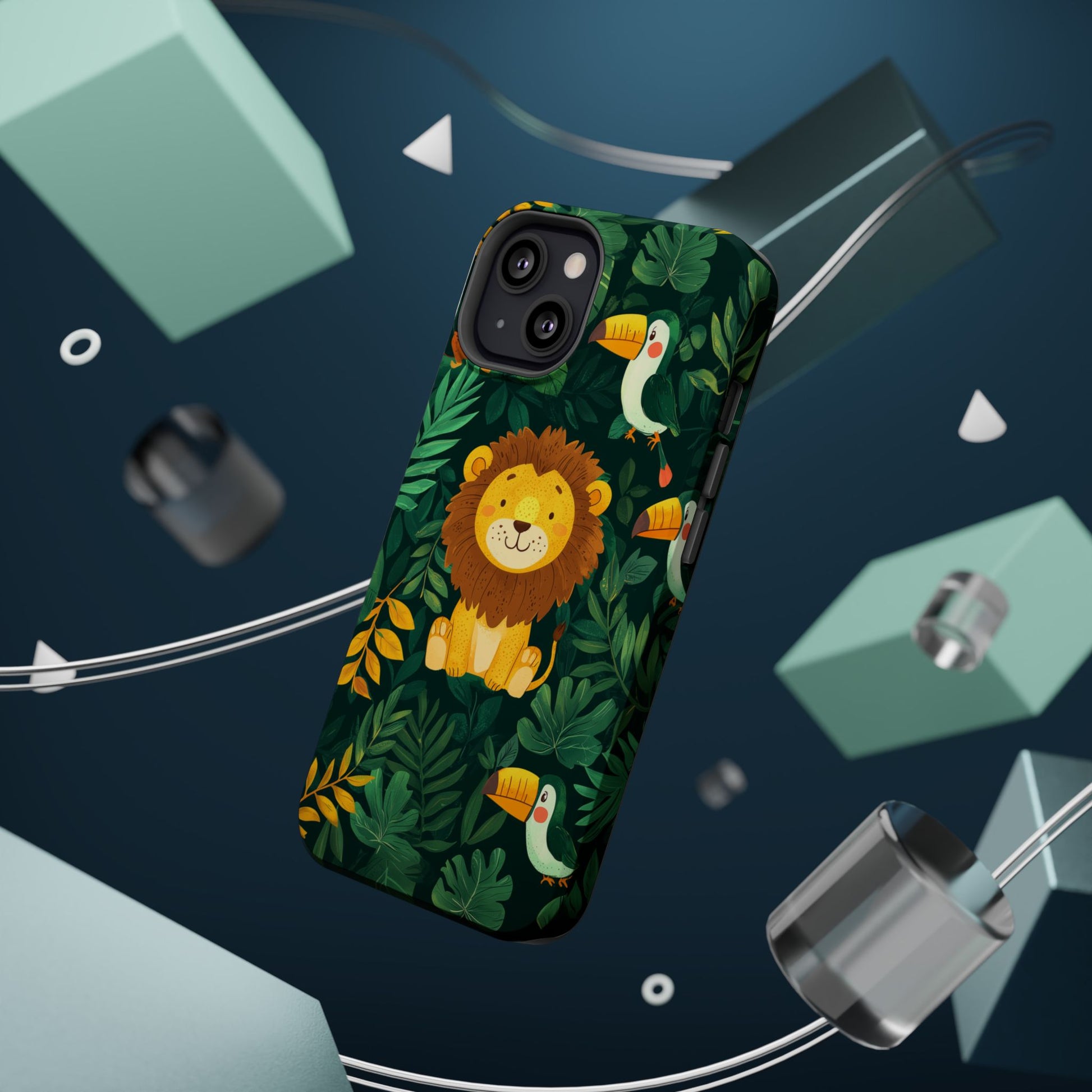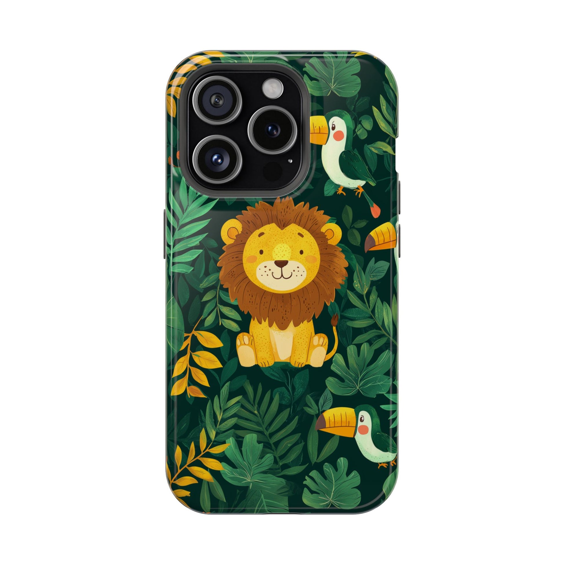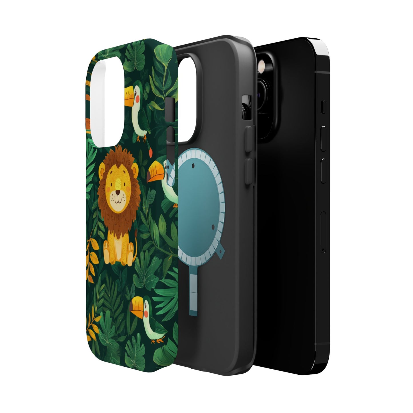 Embrace the wild with our Safari Jungle Animals MagSafe iPhone Case! This charming design features a friendly lion, playful monkeys, and vibrant toucans nestled among lush jungle leaves in deep greens and pops of yellow. Perfect for animal lovers or anyone looking to add a bit of adventure to their everyday look, this case combines cuteness with a rugged, durable build to keep your phone safe. Made to endure daily bumps and drops, this case is as tough as it is adorable, bringing a piece of the jungle to your pocket!