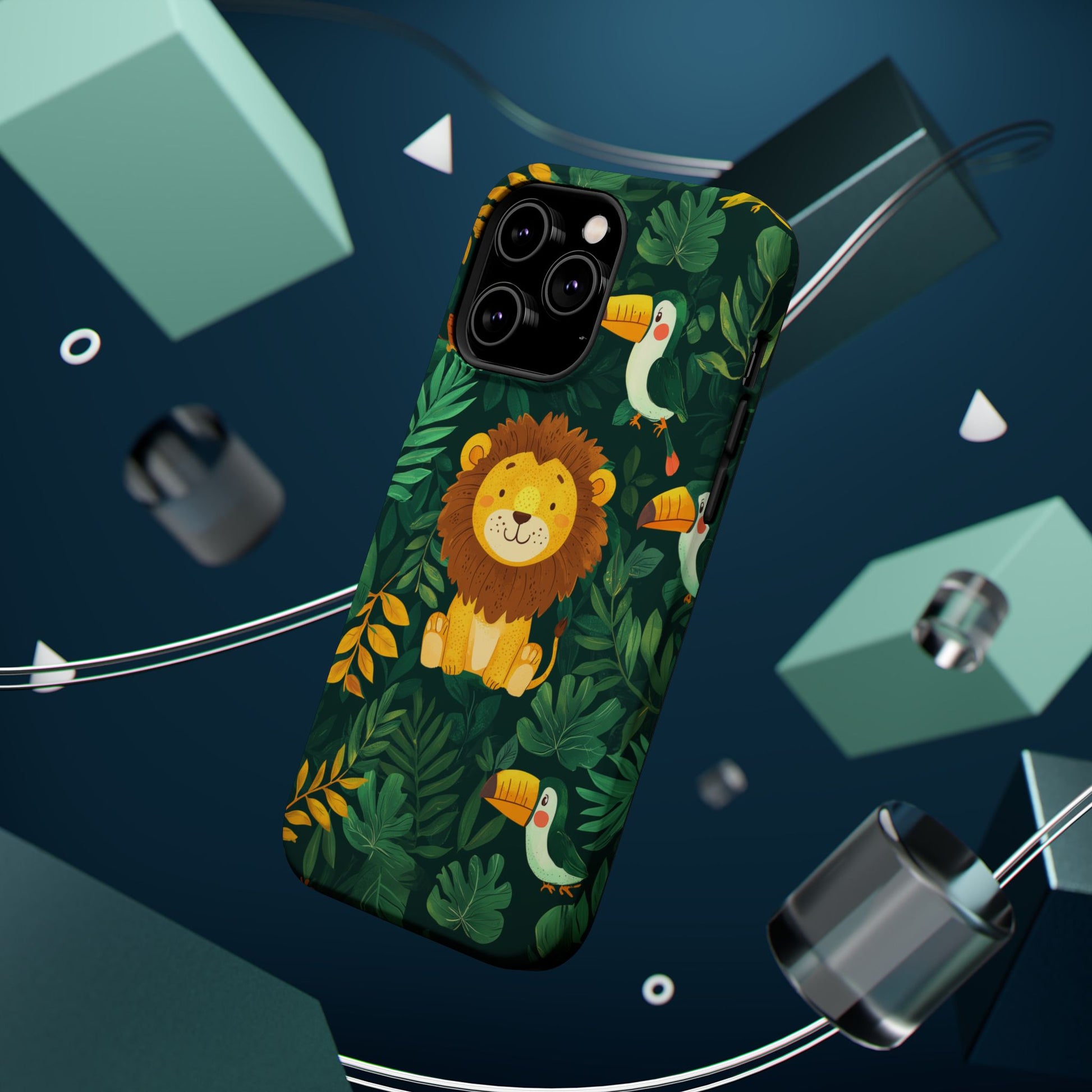 Embrace the wild with our Safari Jungle Animals MagSafe iPhone Case! This charming design features a friendly lion, playful monkeys, and vibrant toucans nestled among lush jungle leaves in deep greens and pops of yellow. Perfect for animal lovers or anyone looking to add a bit of adventure to ...