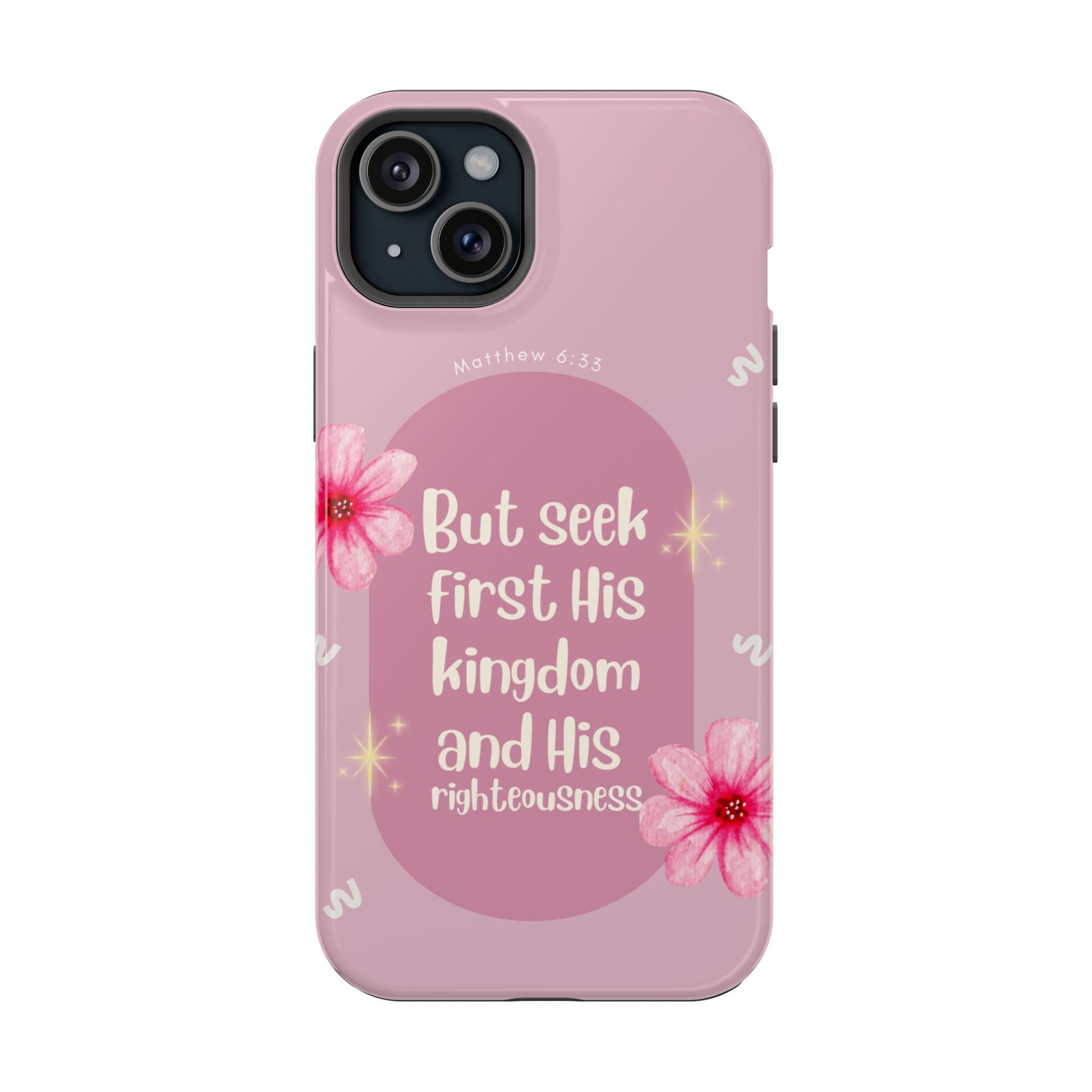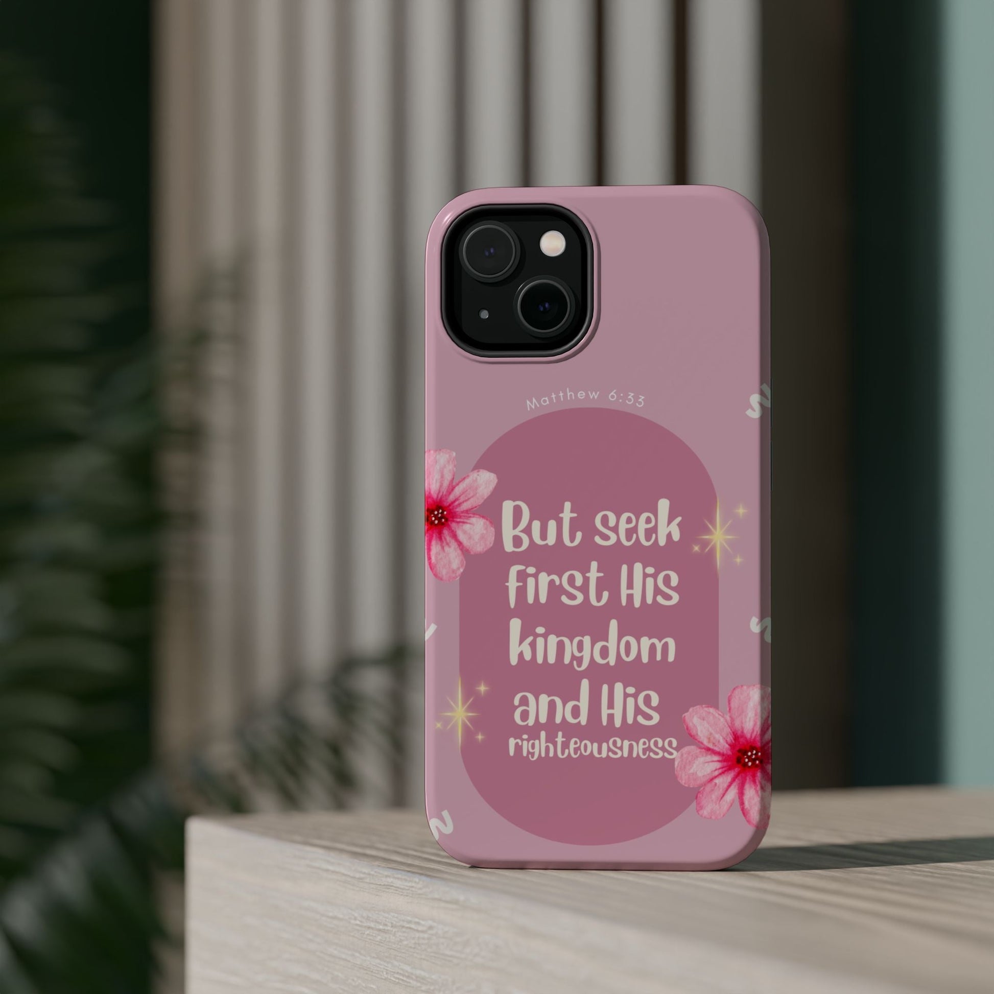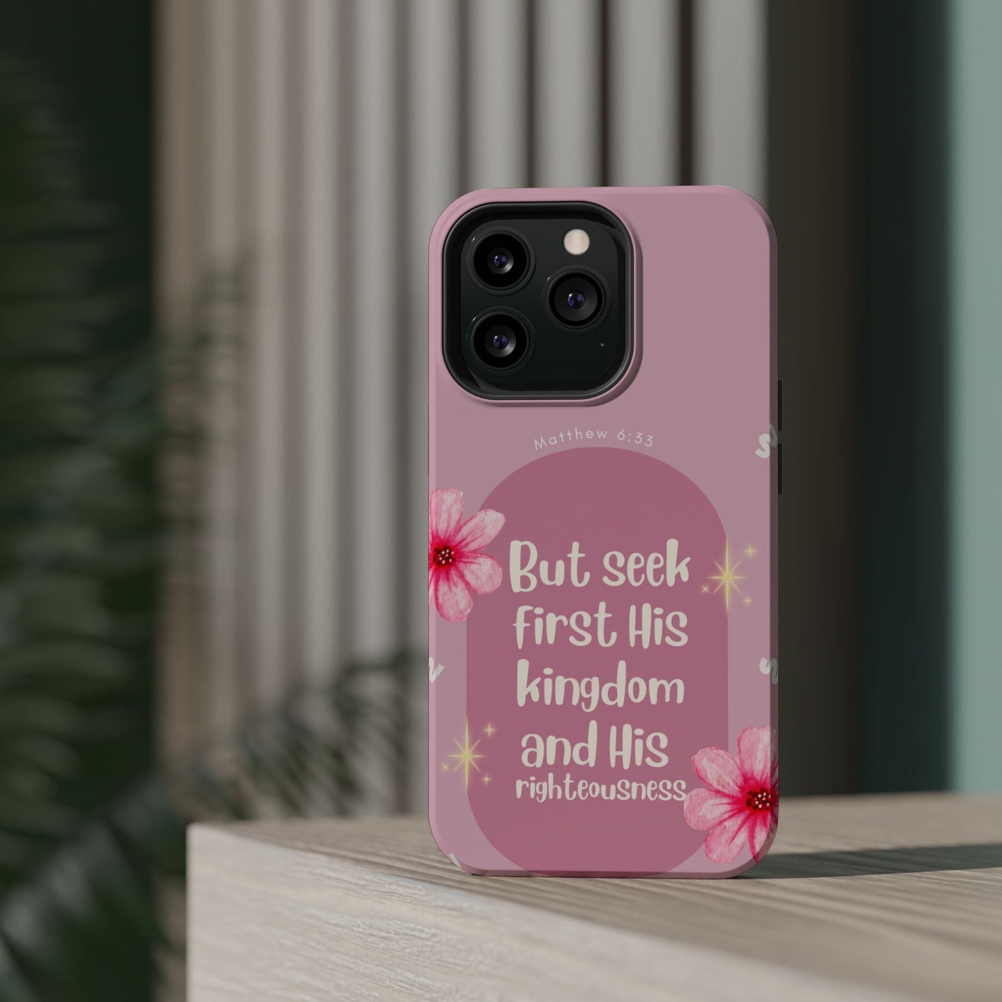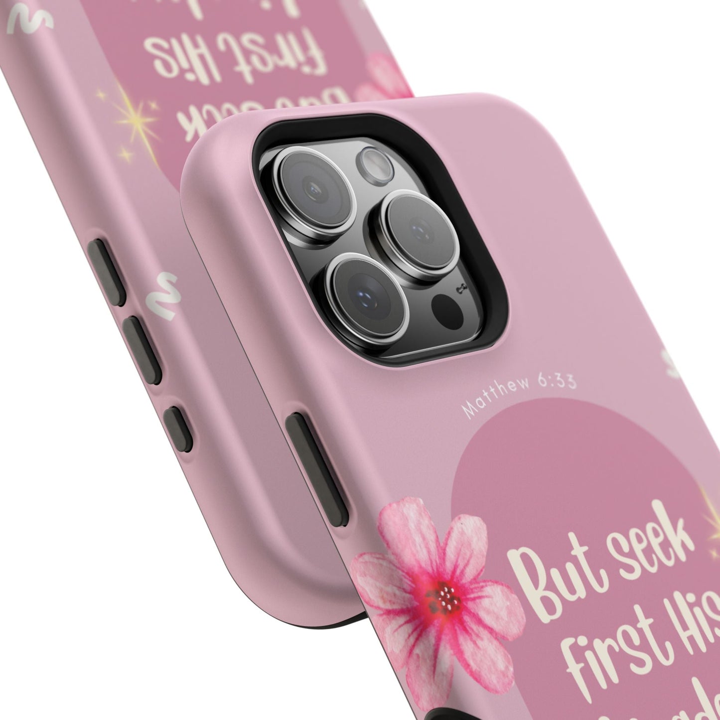 Keep your device secure while staying inspired with this beautiful MagSafe-compatible case. The floral design and calming pink tones, paired with the uplifting message from Matthew 6:33, make it perfect for those who seek both faith and function.