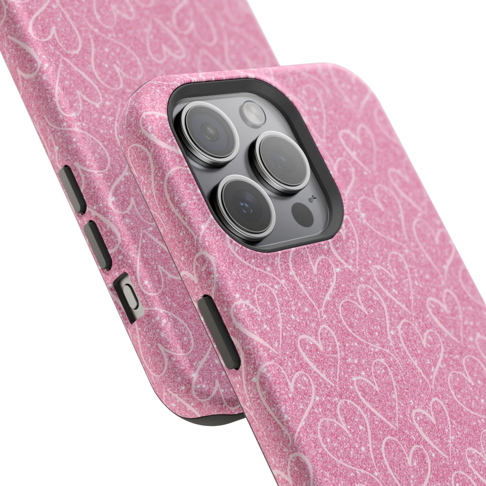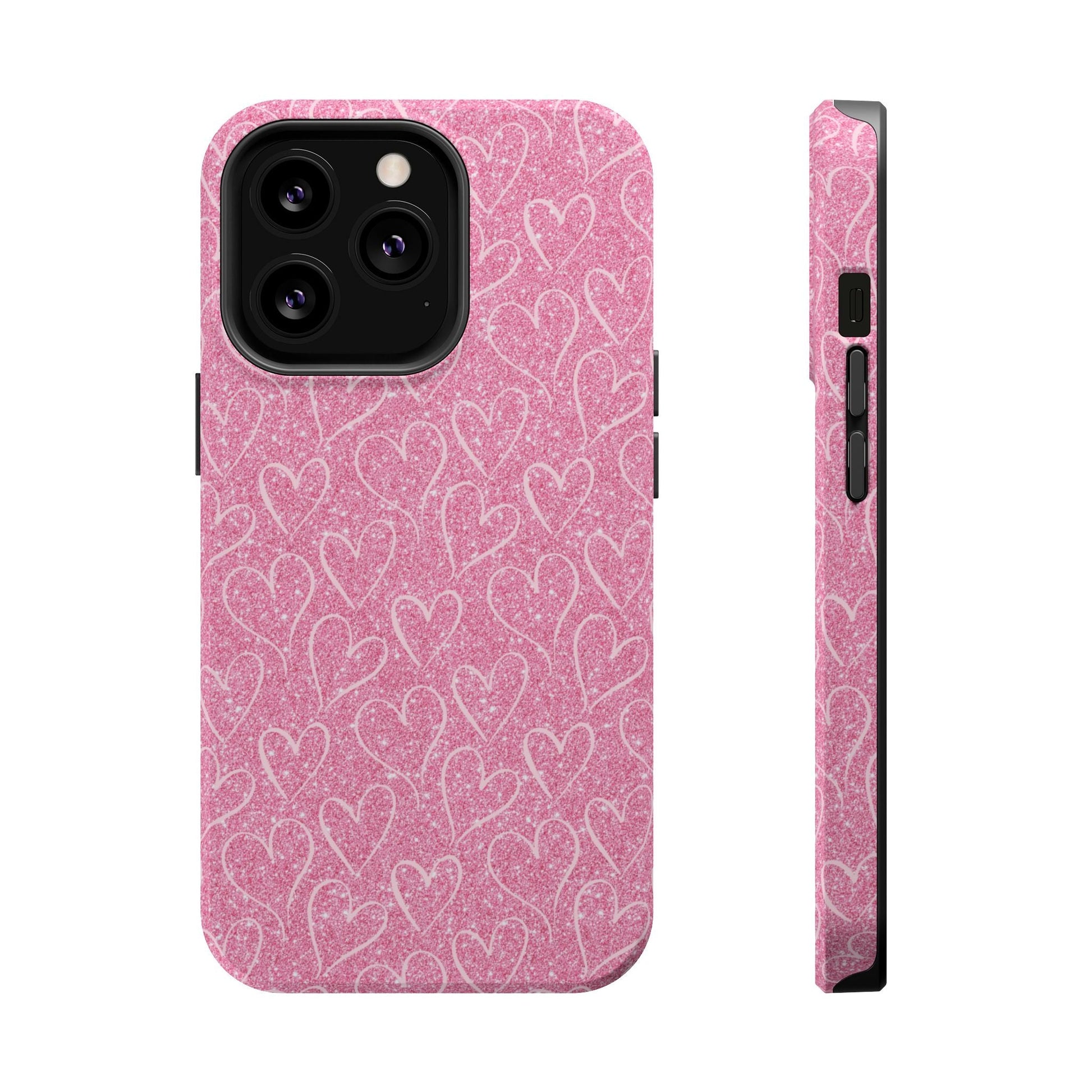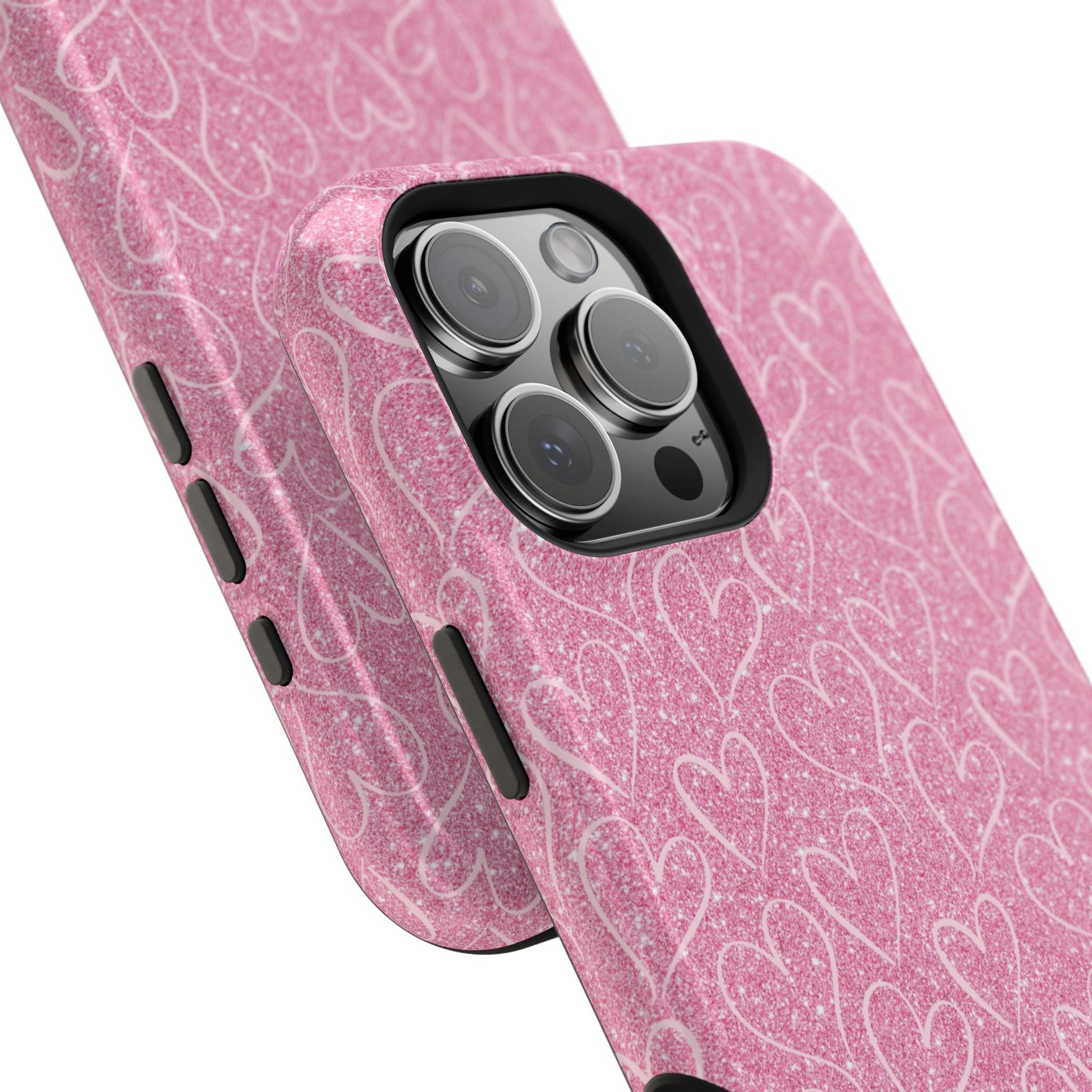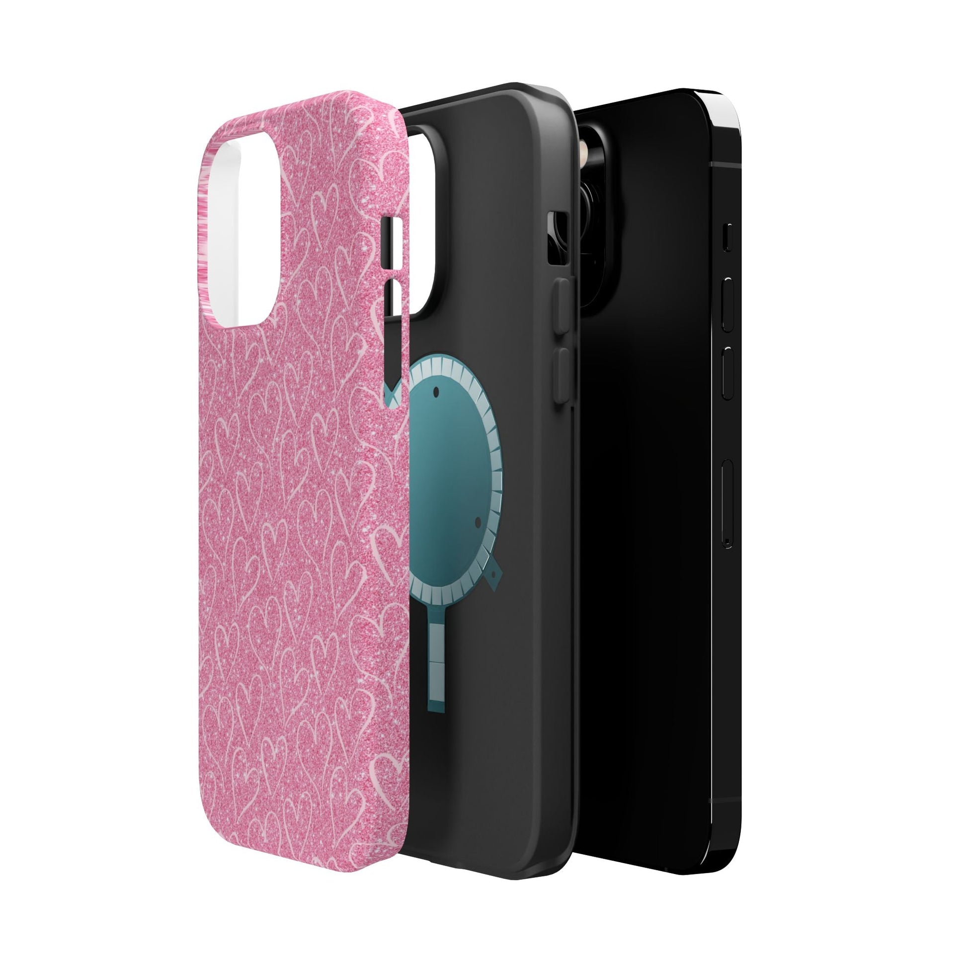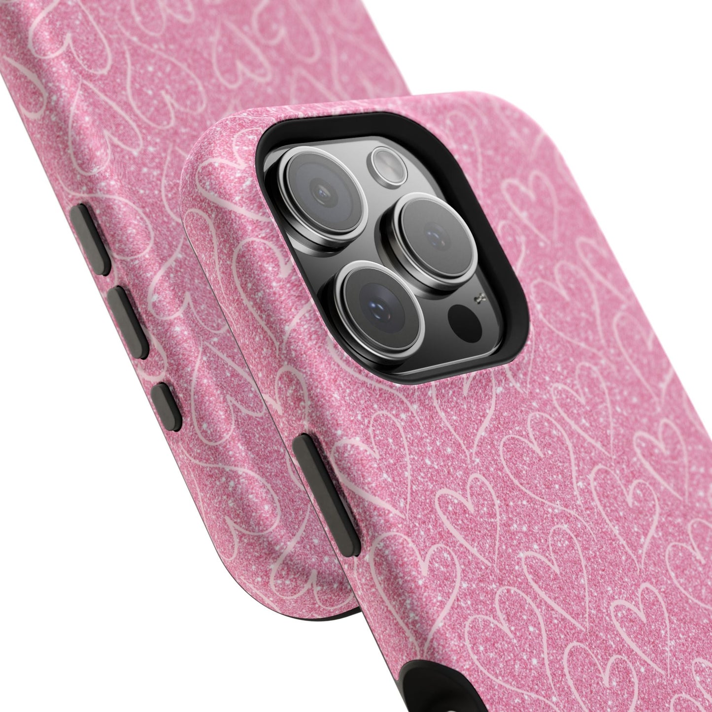 Embrace the allure of romance with our Shimmering Hearts MagSafe iPhone Case! This captivating design features a playful pattern of pink glitter hearts on a soft pink background, creating a dreamy and romantic vibe. It's the perfect case for those who love all thi...