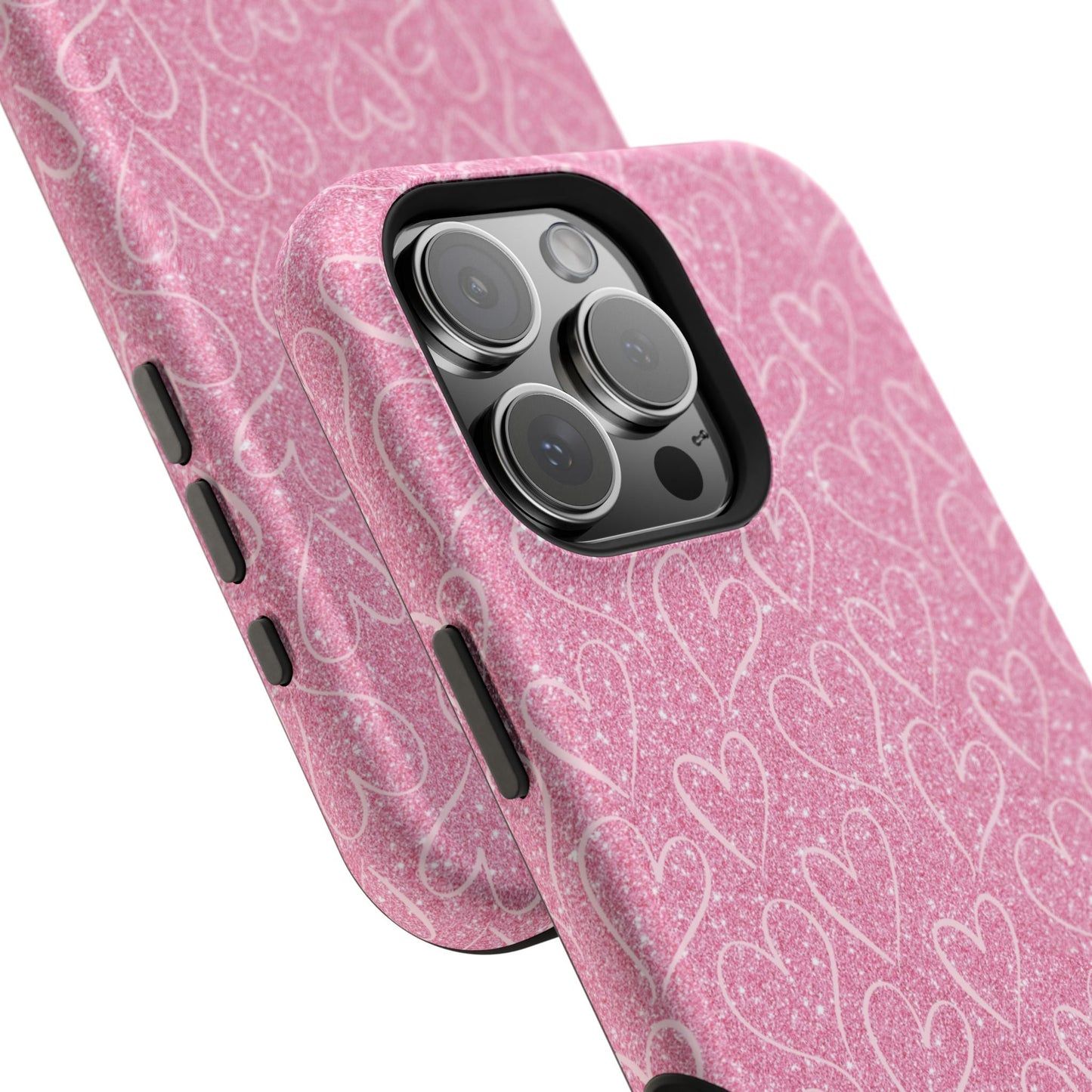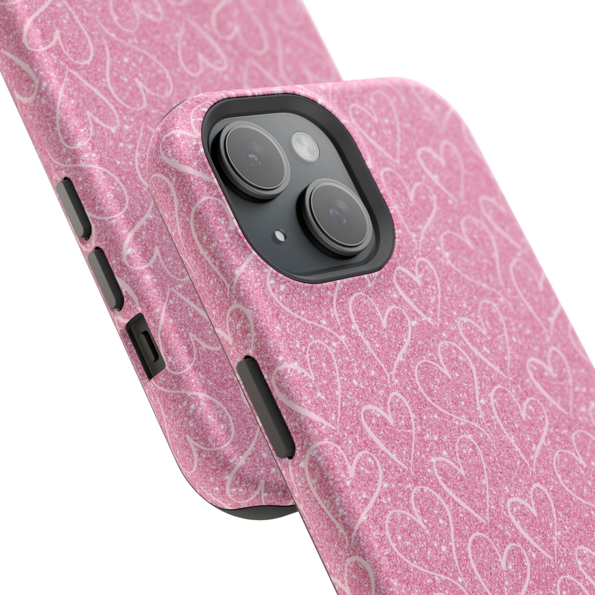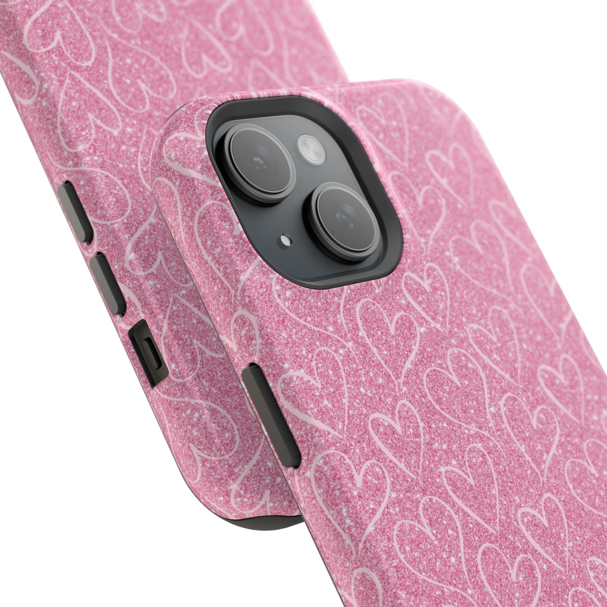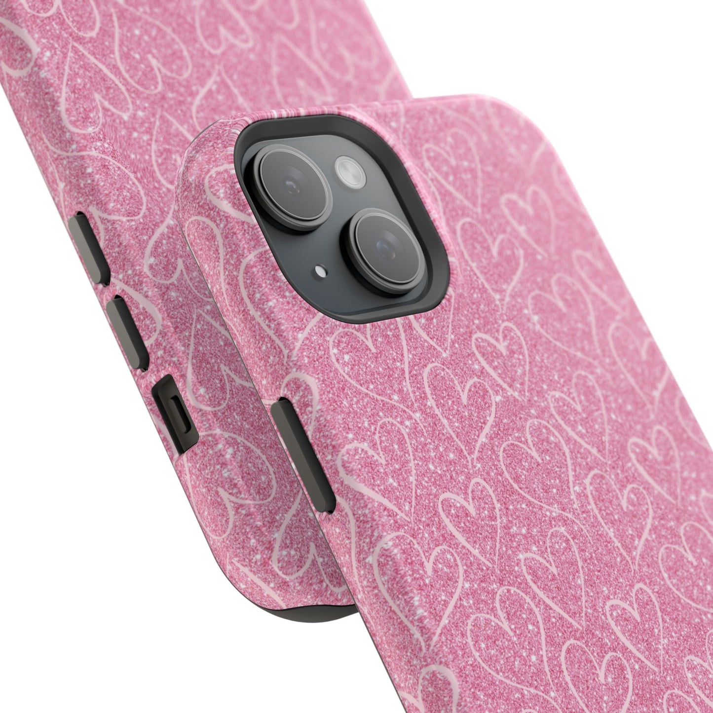 Embrace the allure of romance with our Shimmering Hearts MagSafe iPhone Case! This captivating design features a playful pattern of pink glitter hearts on a soft pink background, creating a dreamy and romantic vibe. It's the perfect case for those who love all thi...