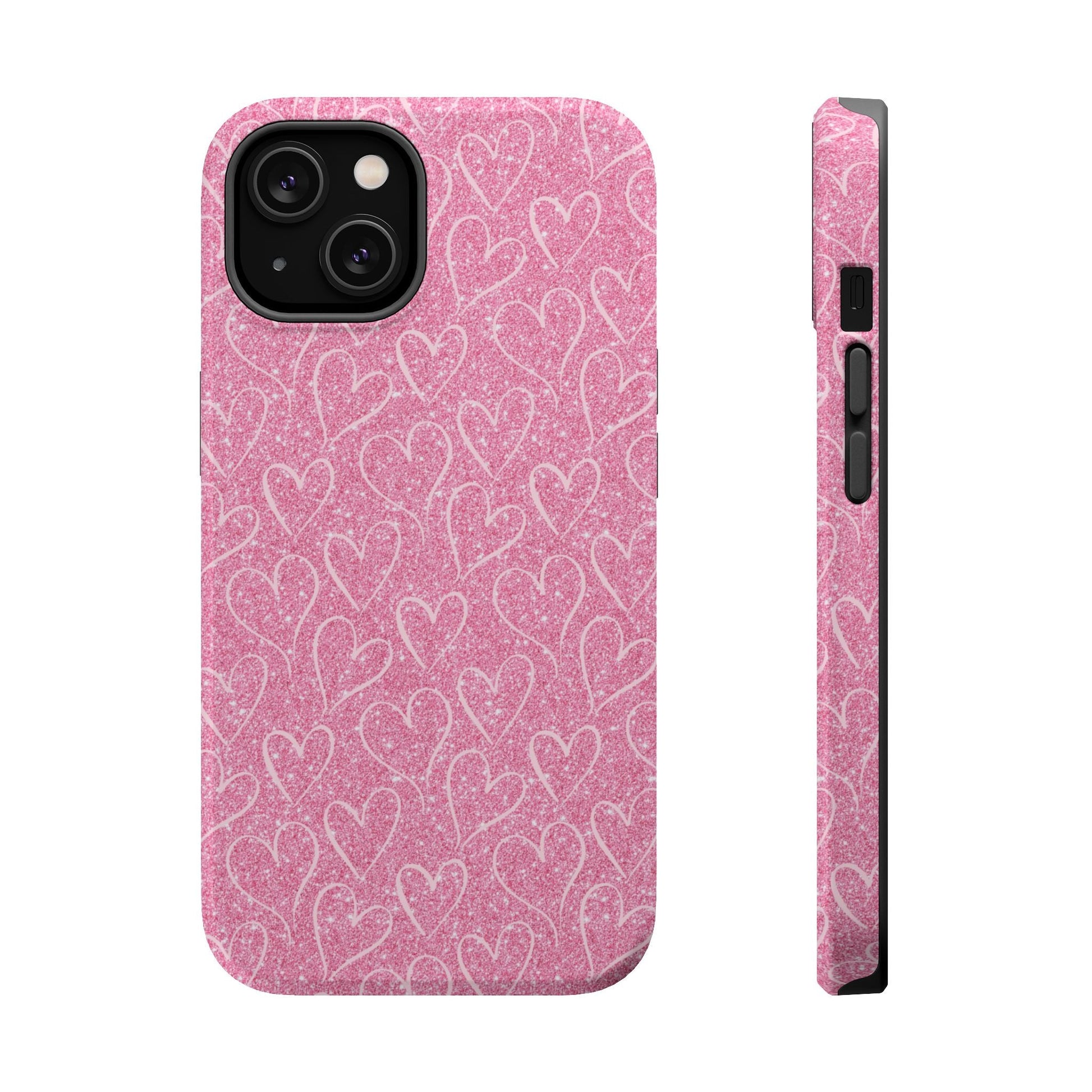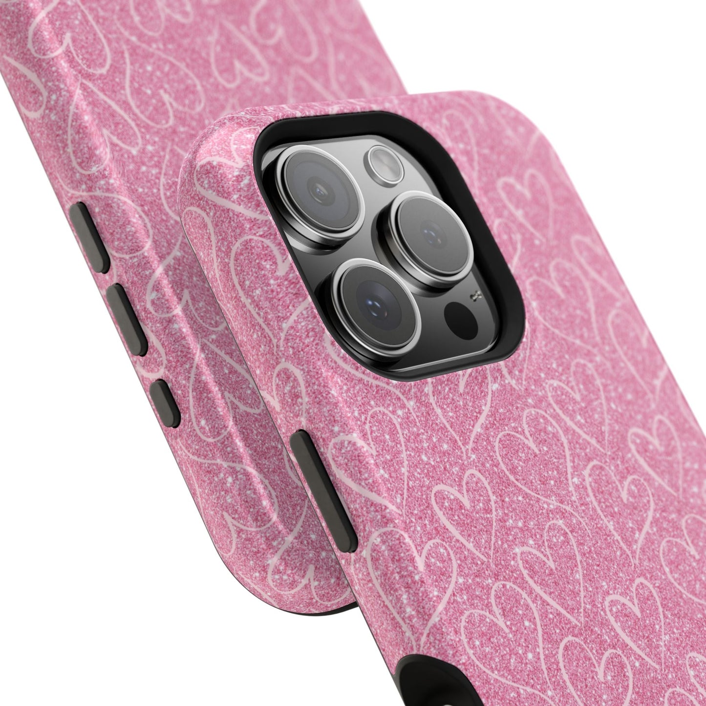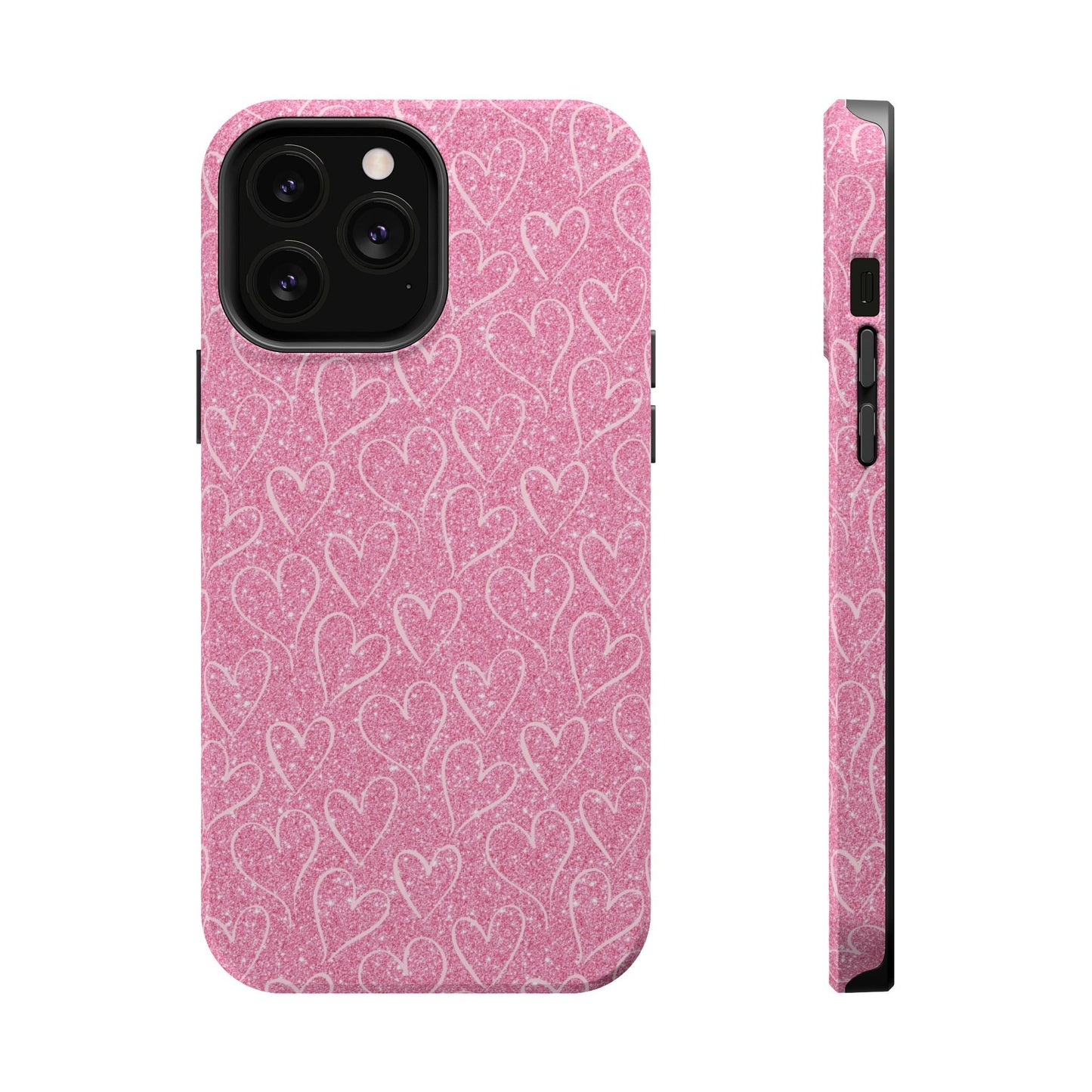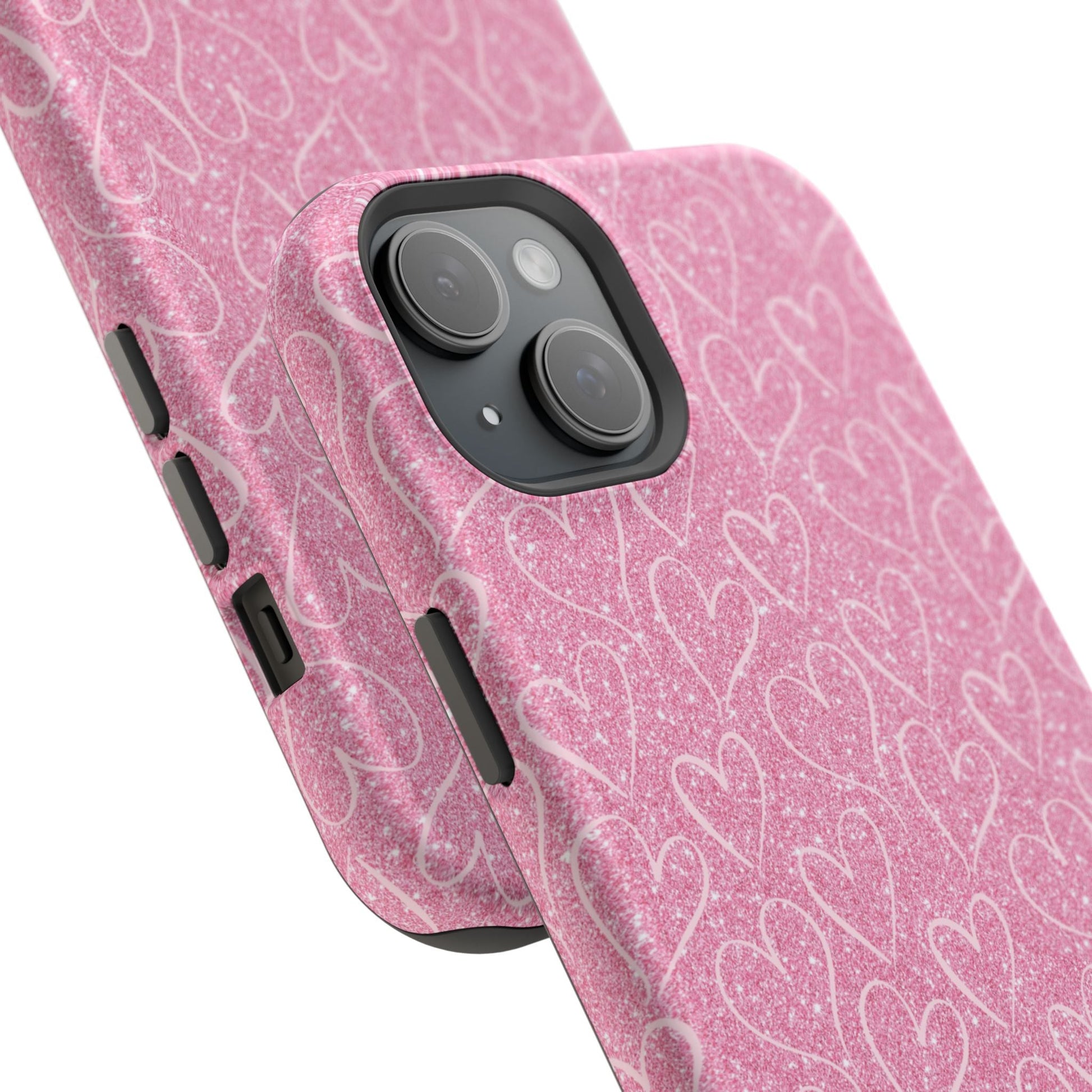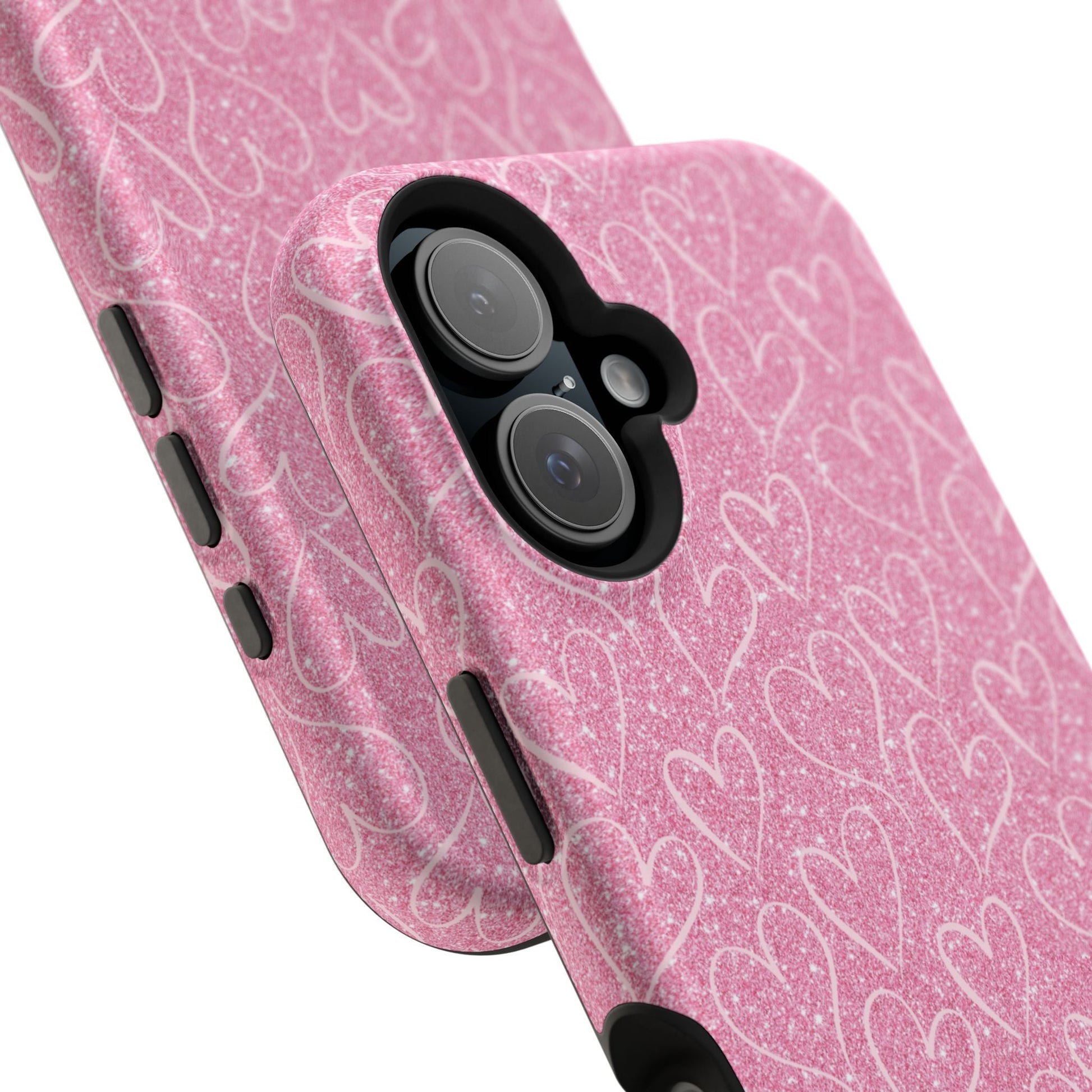 Embrace the allure of romance with our Shimmering Hearts MagSafe iPhone Case! This captivating design features a playful pattern of pink glitter hearts on a soft pink background, creating a dreamy and romantic vibe. It's the perfect case for those who love all thi...