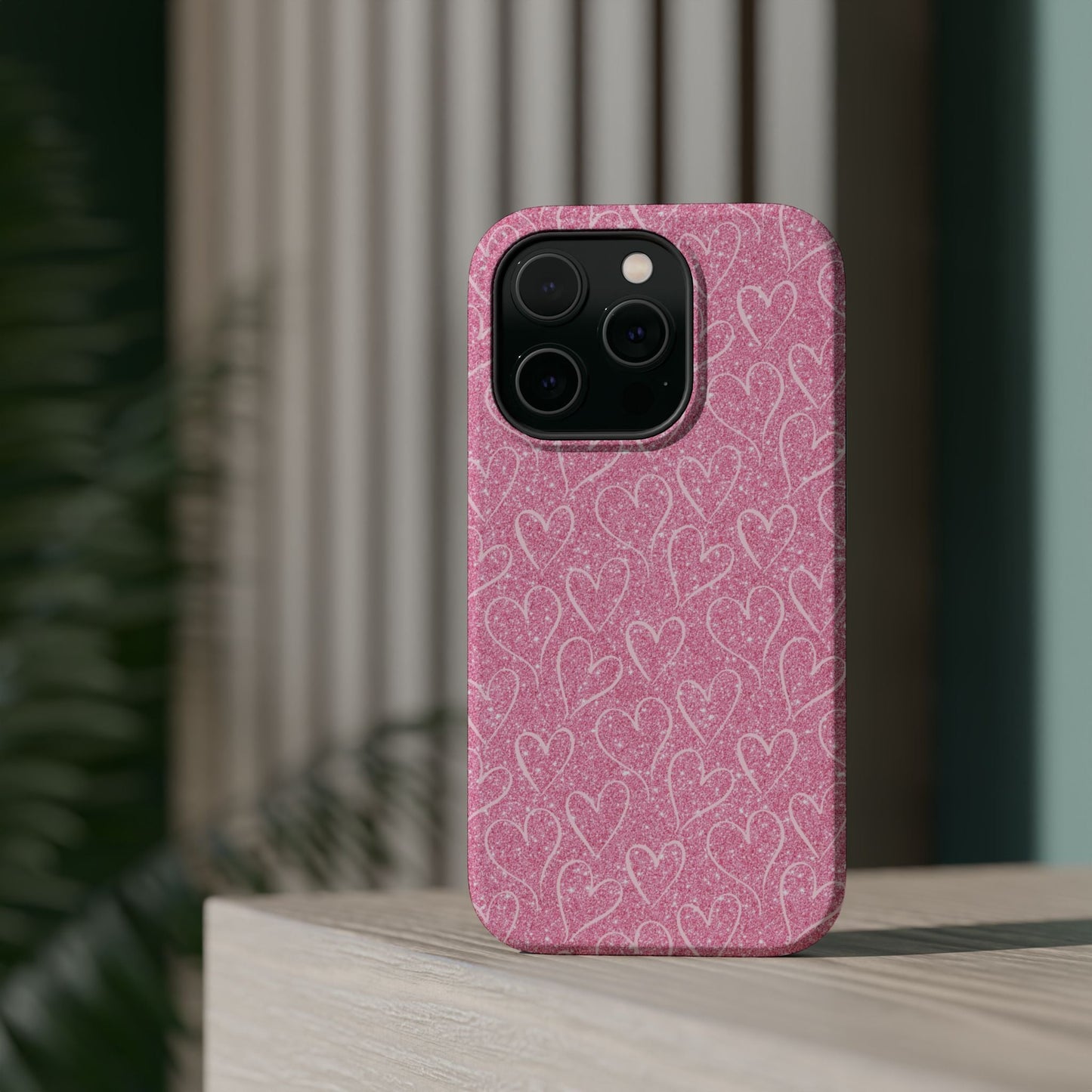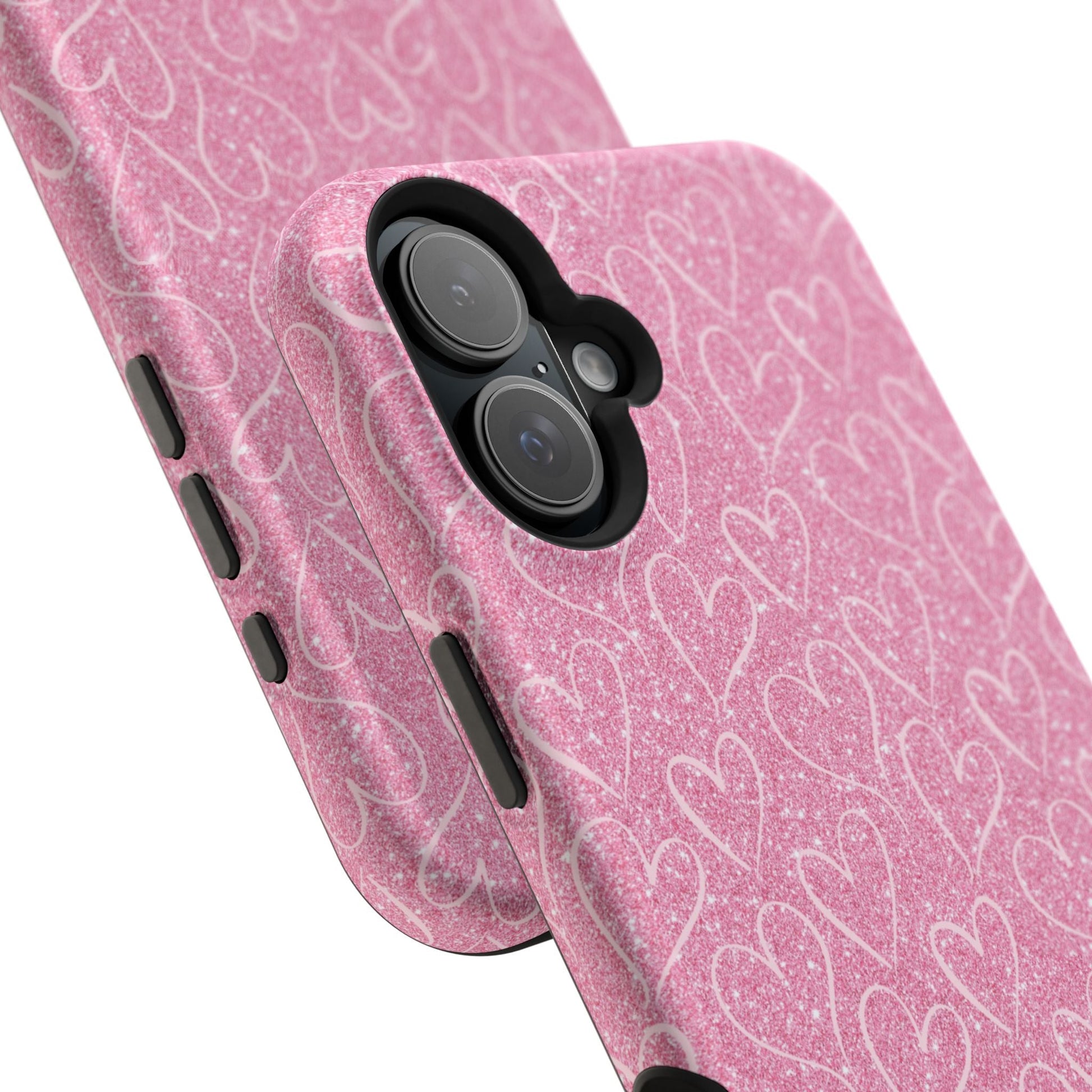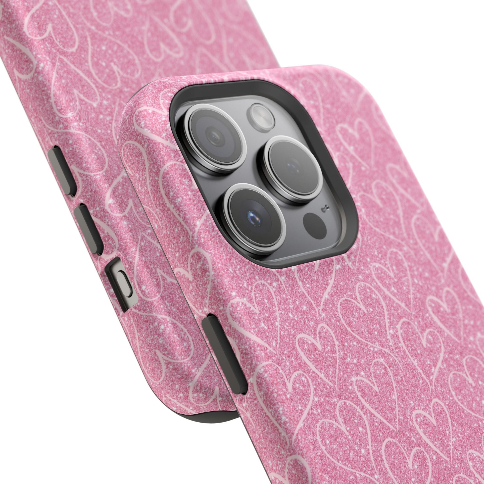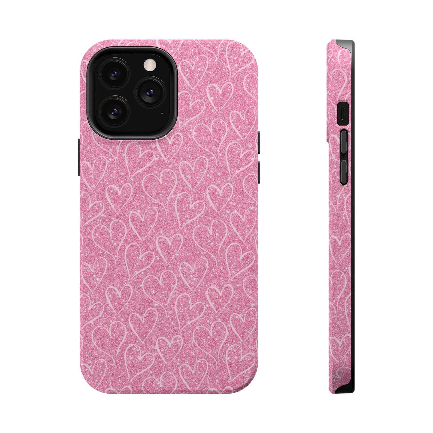 Embrace the allure of romance with our Shimmering Hearts MagSafe iPhone Case! This captivating design features a playful pattern of pink glitter hearts on a soft pink background, creating a dreamy and romantic vibe. It's the perfect case for those who love all thi...