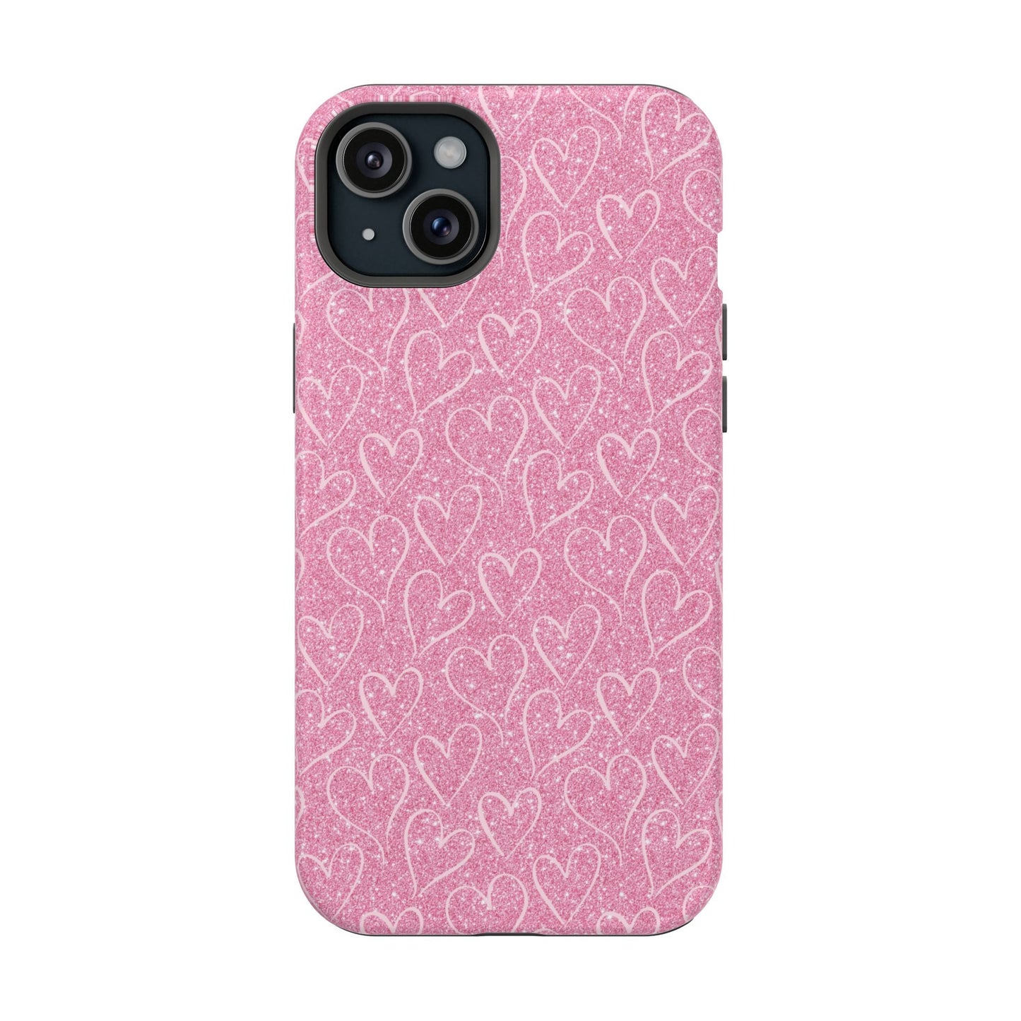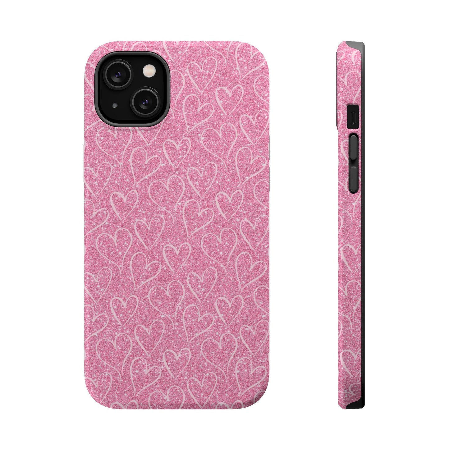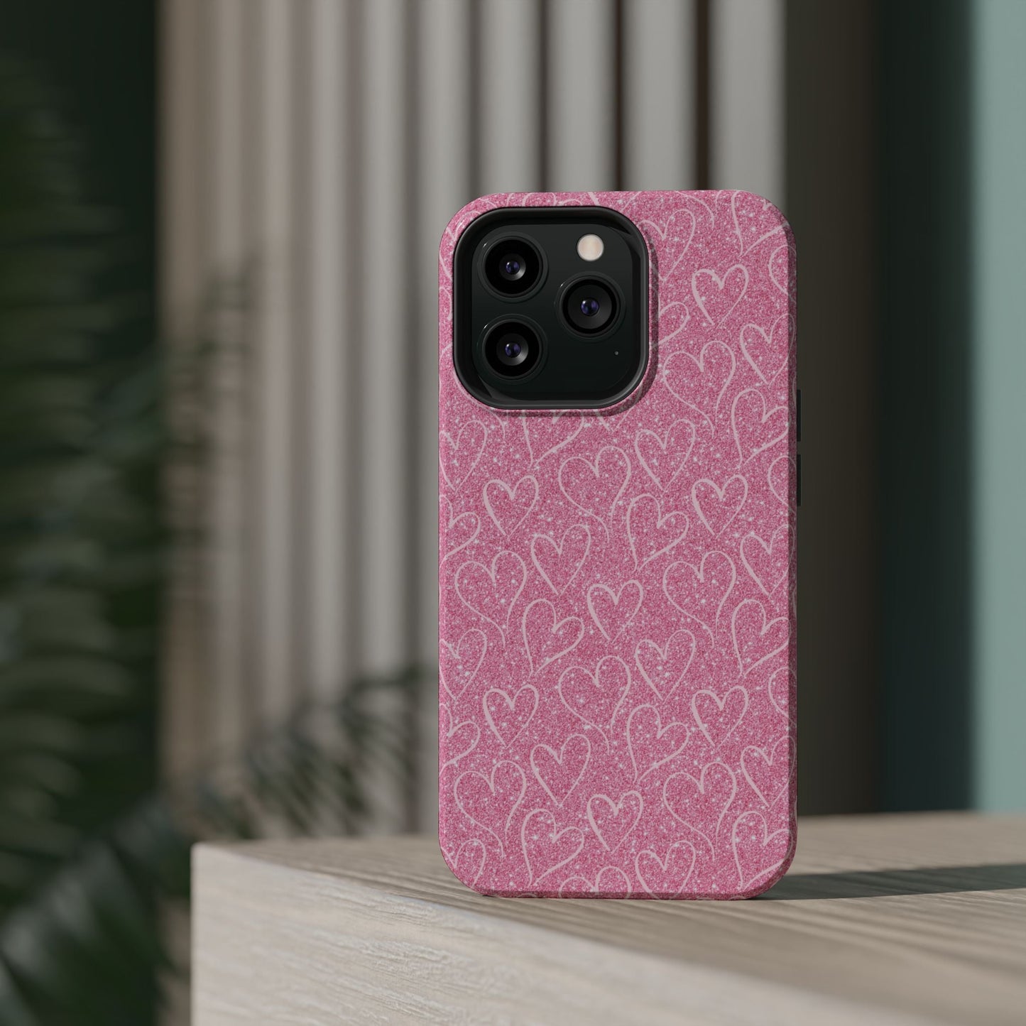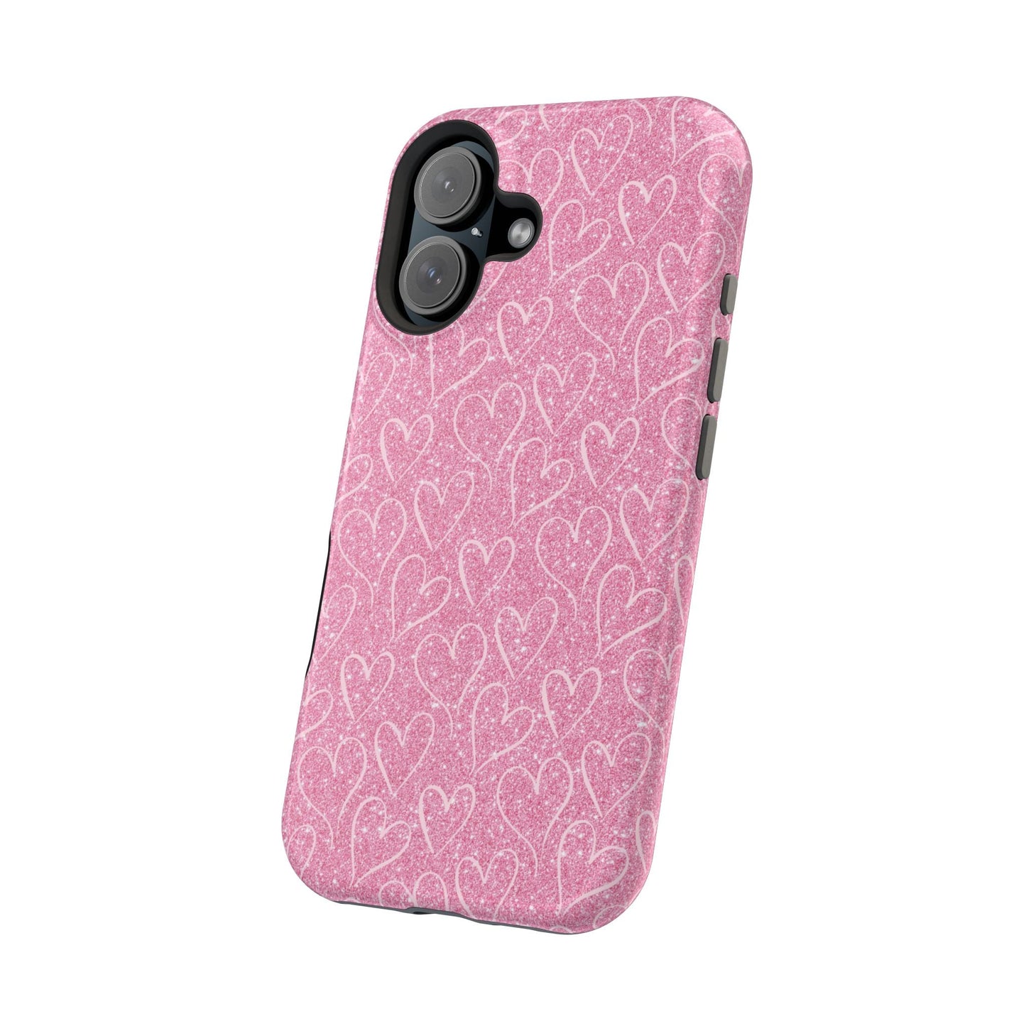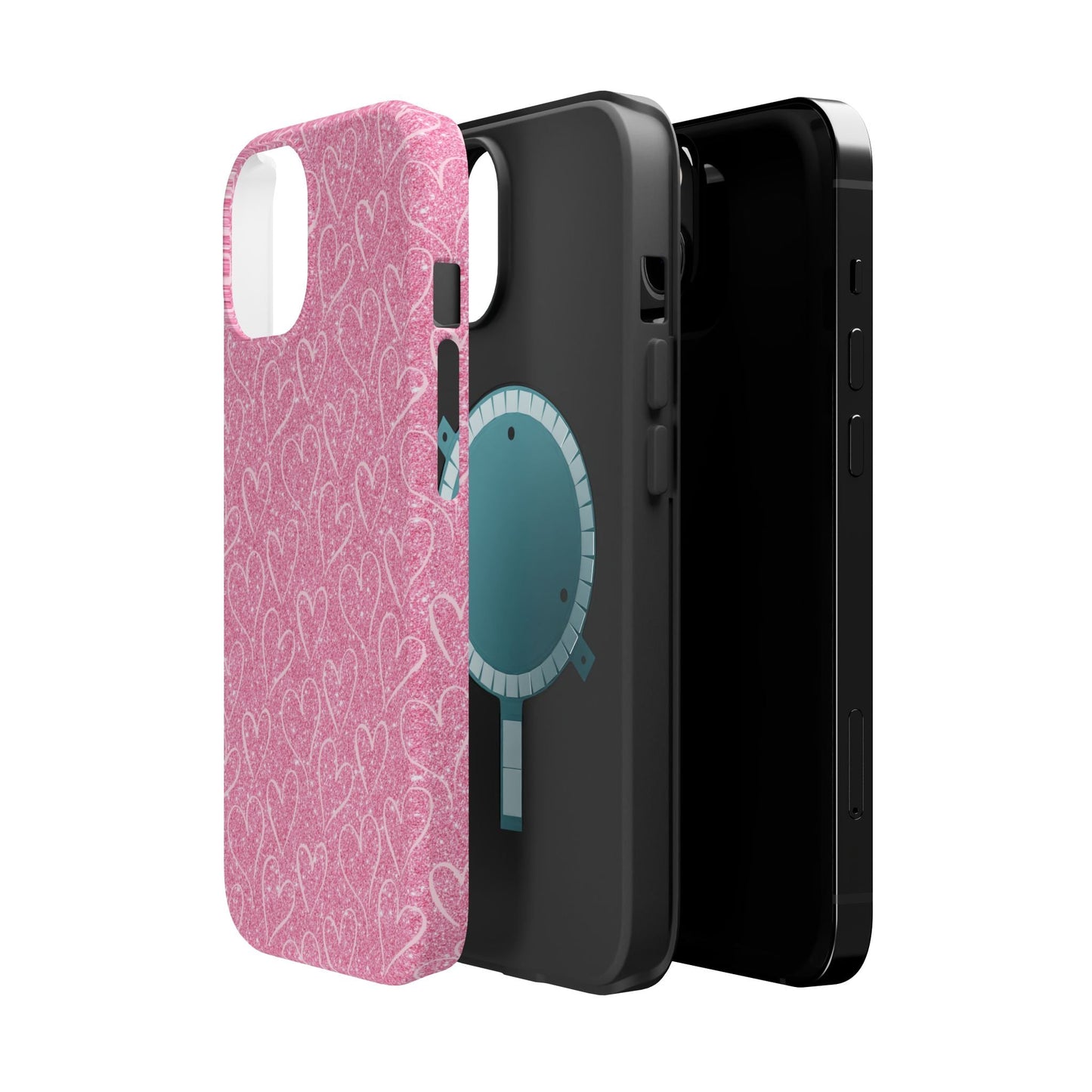 Embrace the allure of romance with our Shimmering Hearts MagSafe iPhone Case! This captivating design features a playful pattern of pink glitter hearts on a soft pink background, creating a dreamy and romantic vibe. It's the perfect case for those who love all thi...