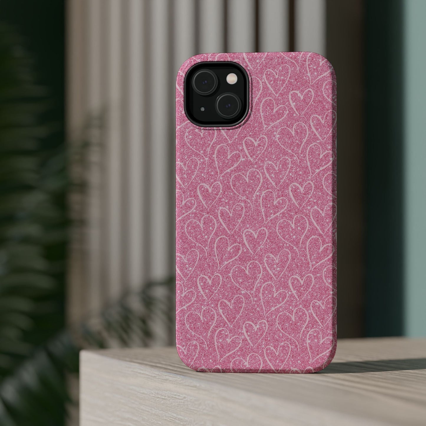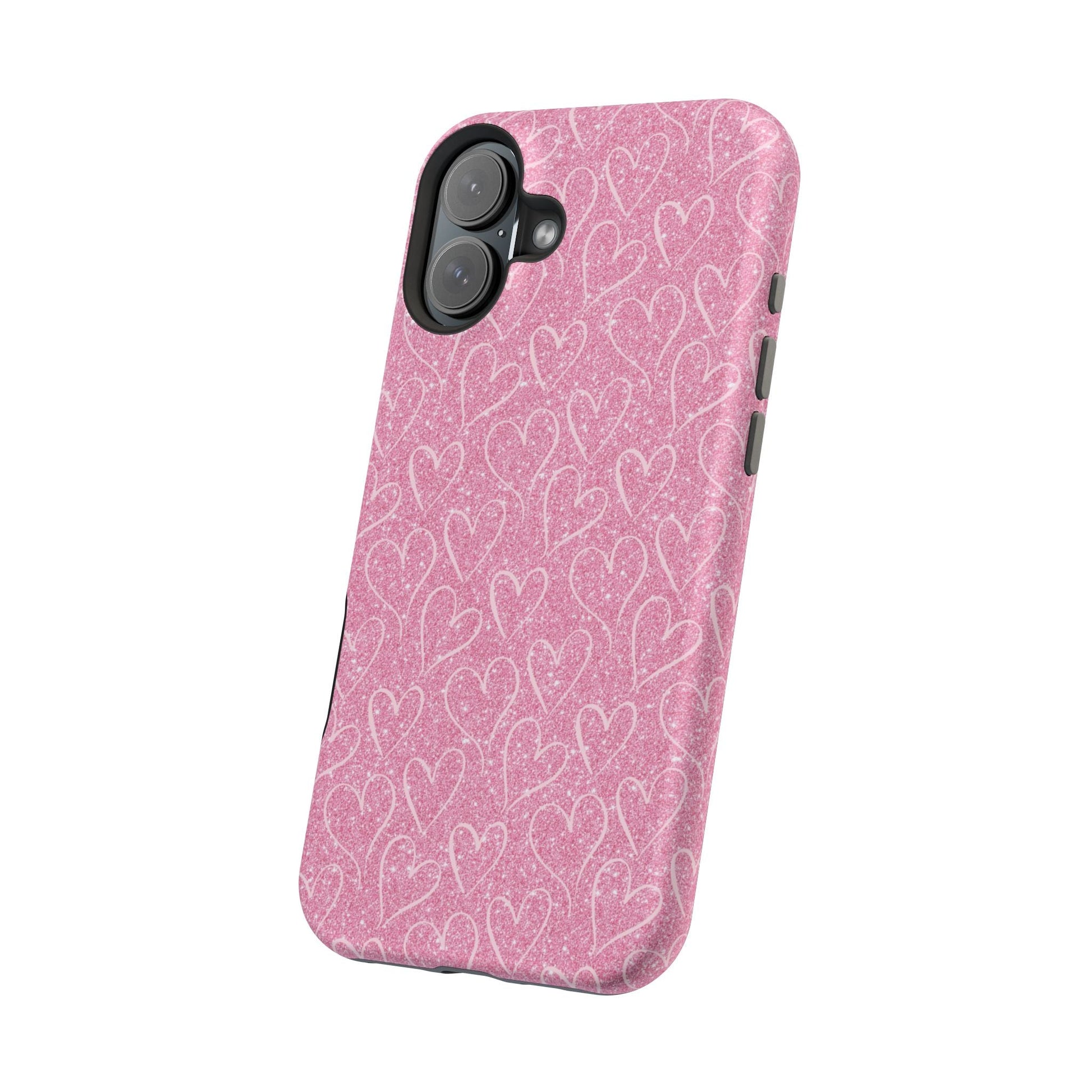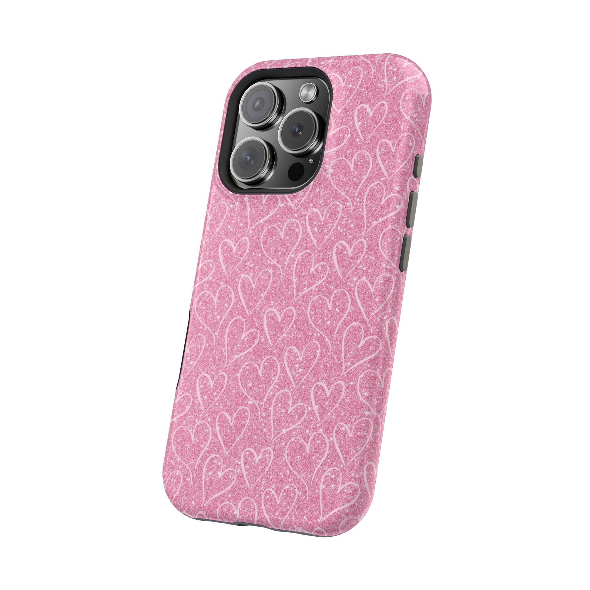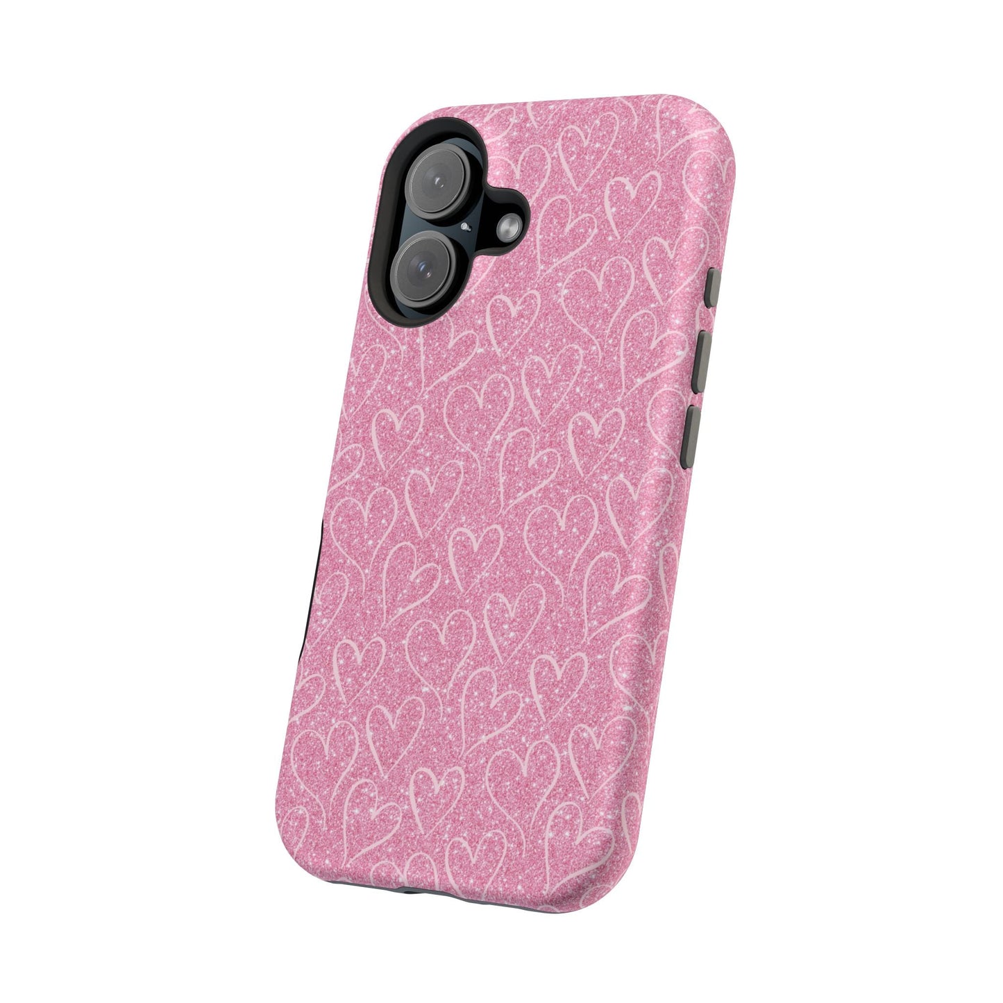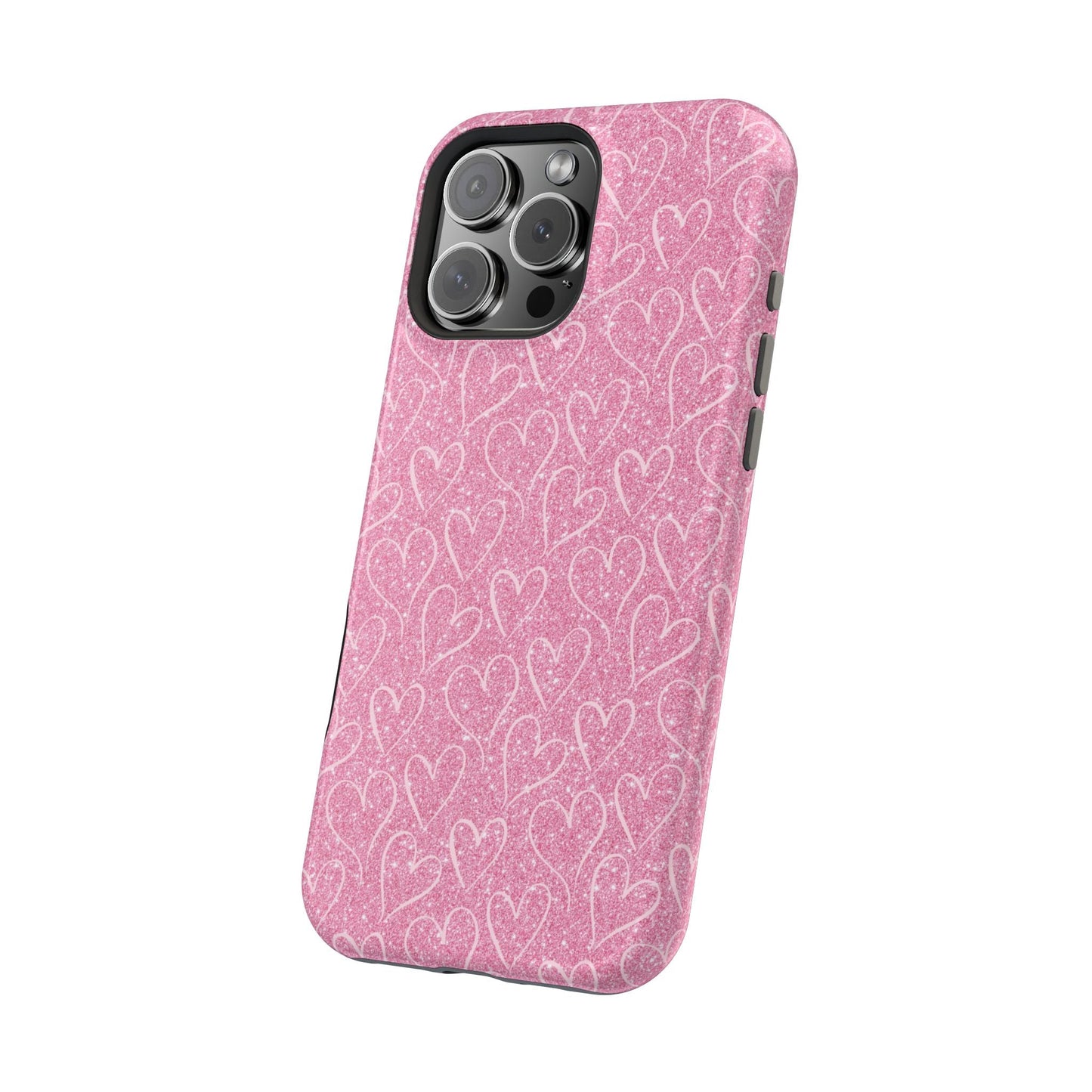 Embrace the allure of romance with our Shimmering Hearts MagSafe iPhone Case! This captivating design features a playful pattern of pink glitter hearts on a soft pink background, creating a dreamy and romantic vibe. It's the perfect case for those who love all thi...
