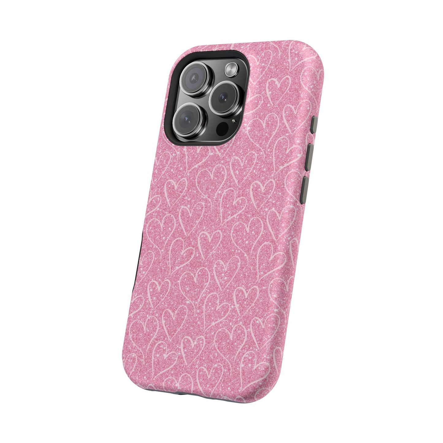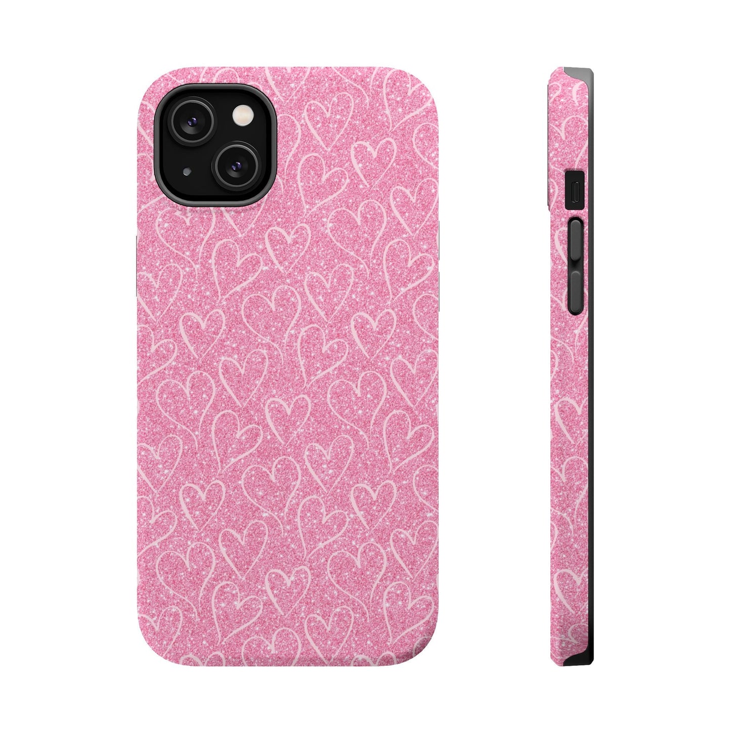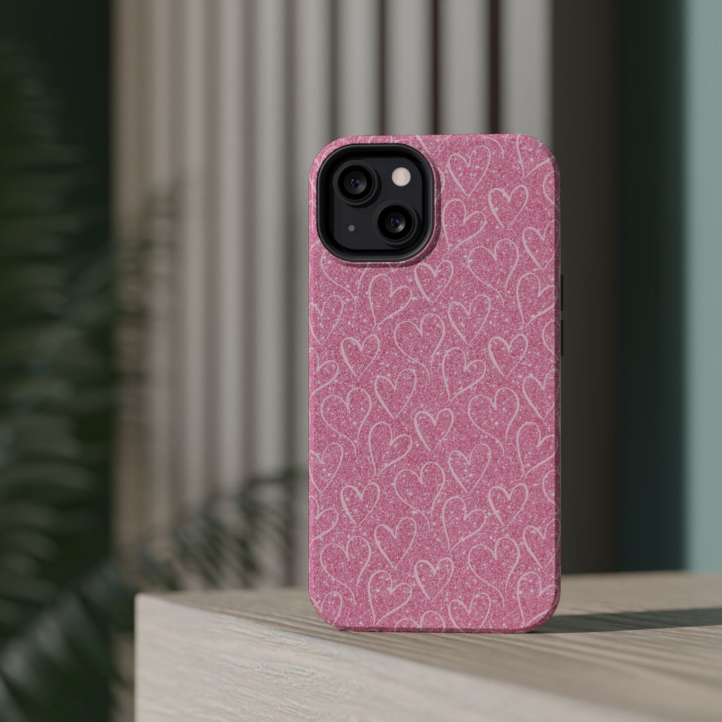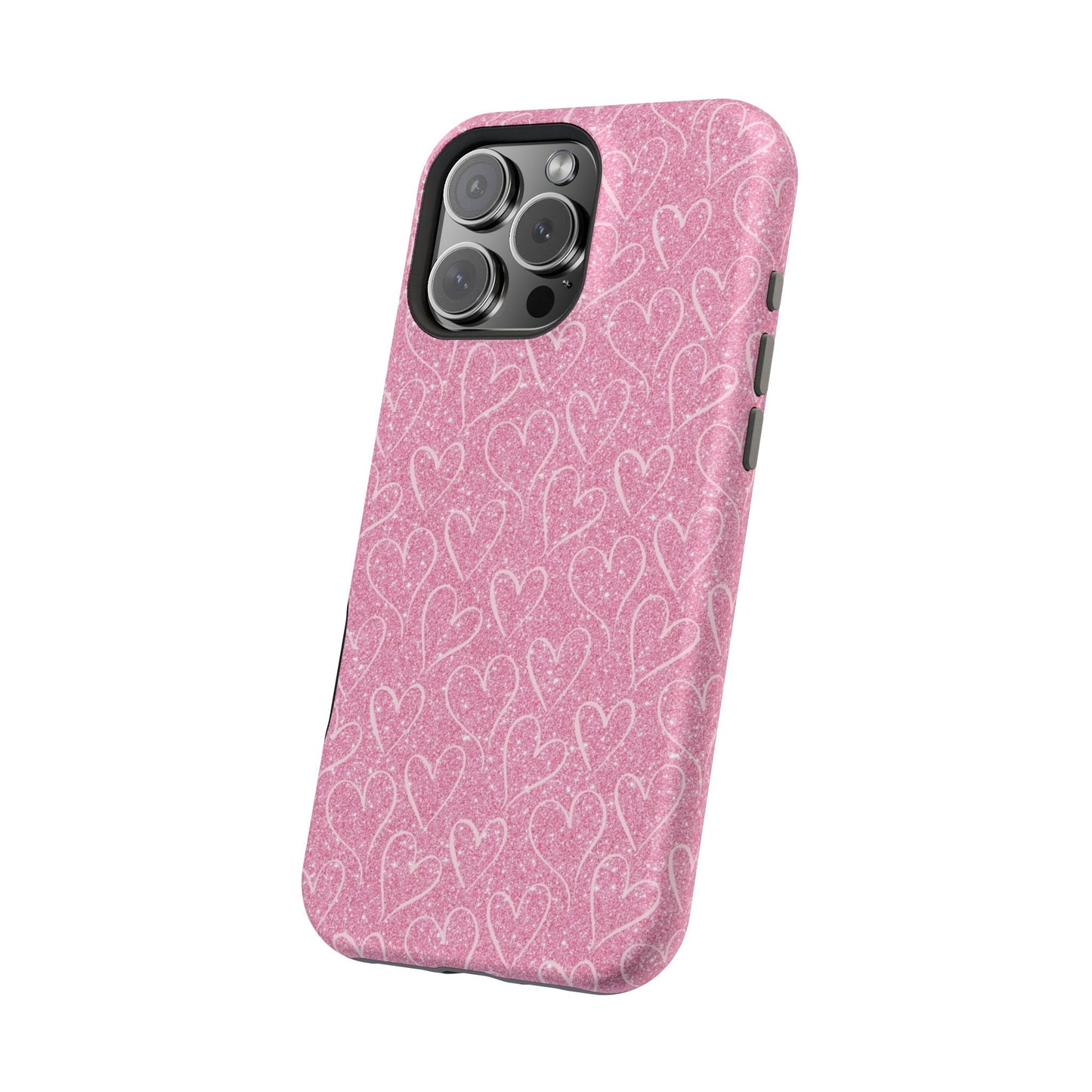 Embrace the allure of romance with our Shimmering Hearts MagSafe iPhone Case! This captivating design features a playful pattern of pink glitter hearts on a soft pink background, creating a dreamy and romantic vibe. It's the perfect case for those who love all thi...