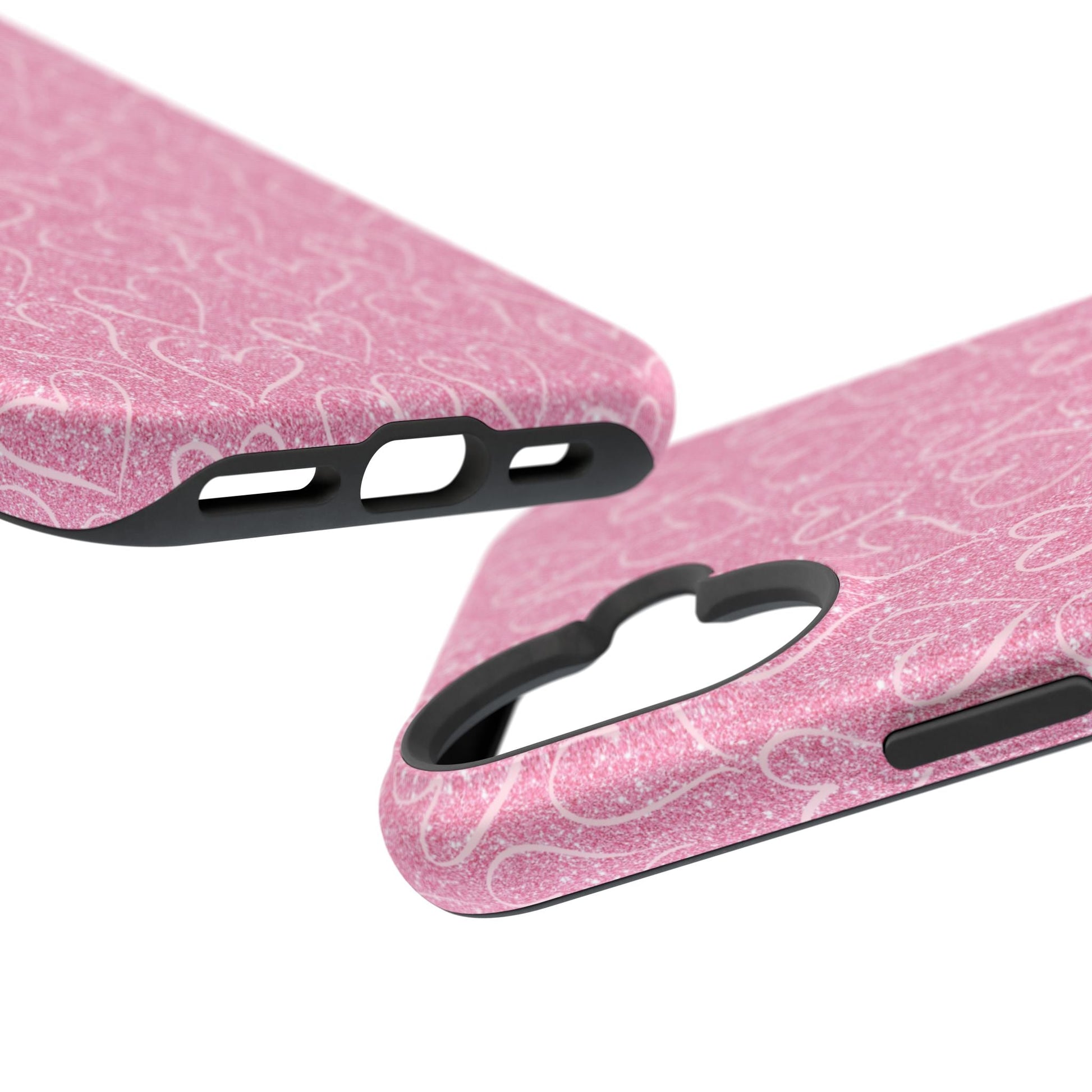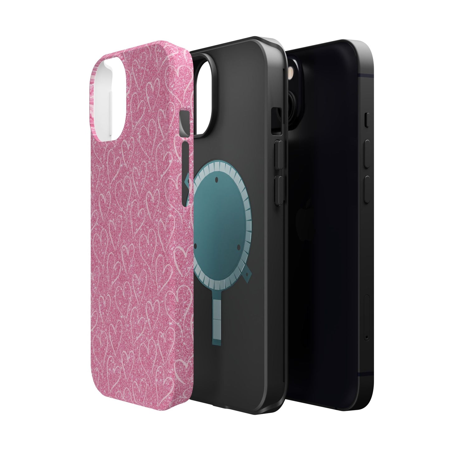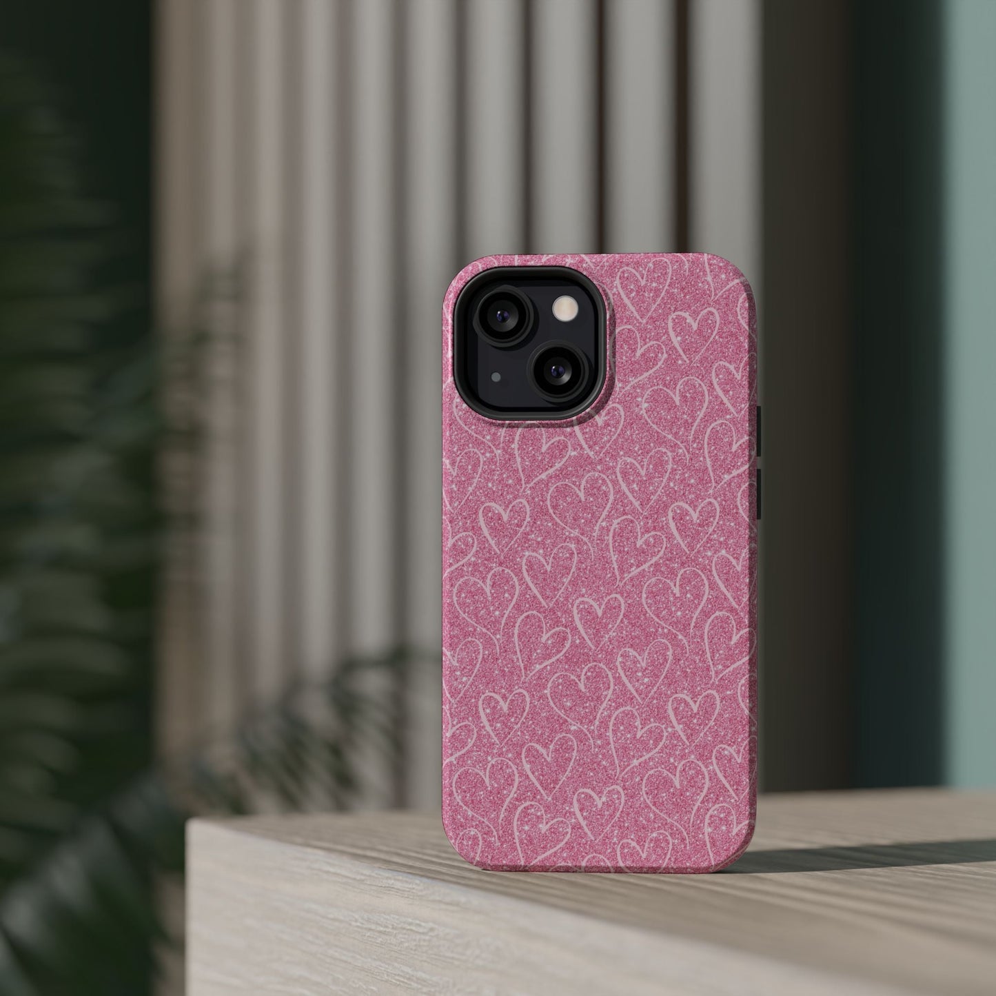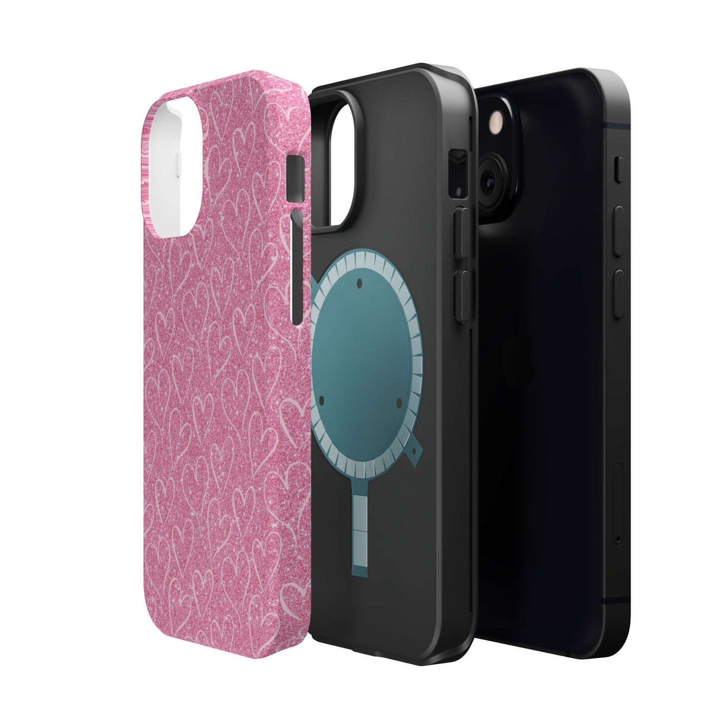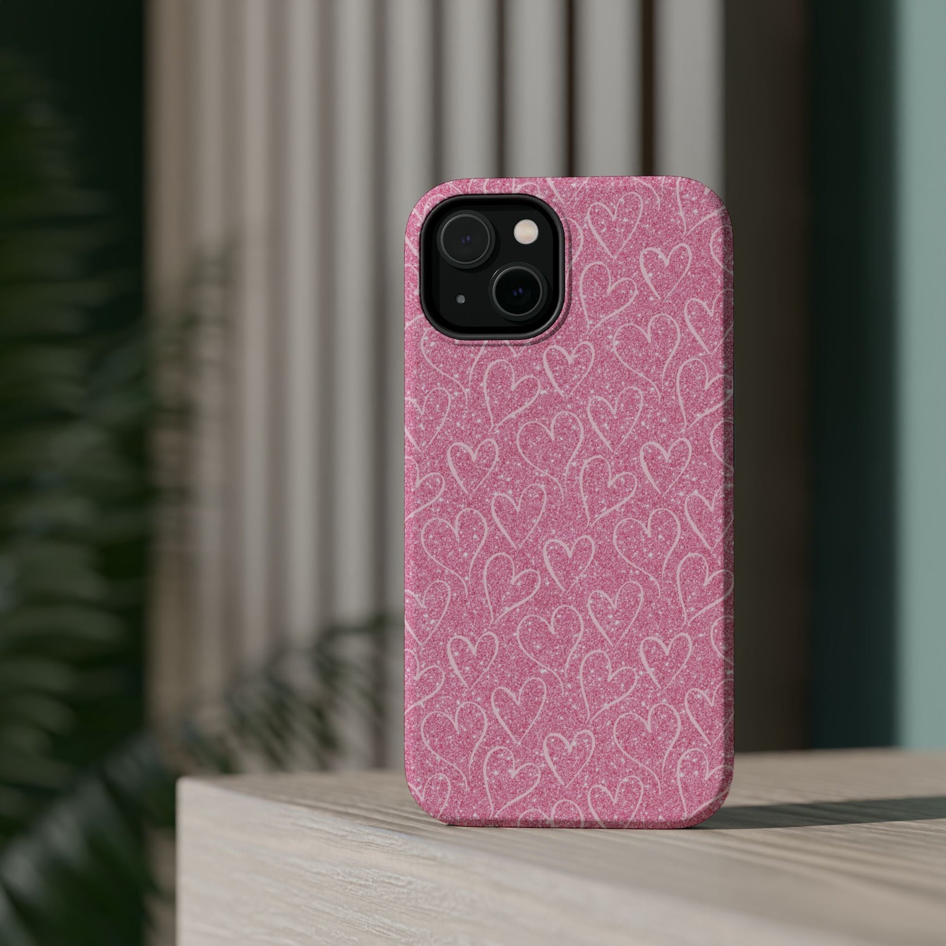 Embrace the allure of romance with our Shimmering Hearts MagSafe iPhone Case! This captivating design features a playful pattern of pink glitter hearts on a soft pink background, creating a dreamy and romantic vibe. It's the perfect case for those who love all thi...