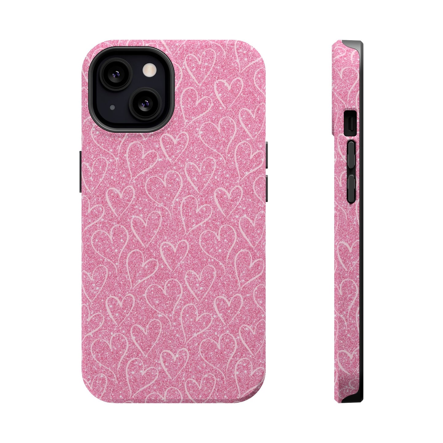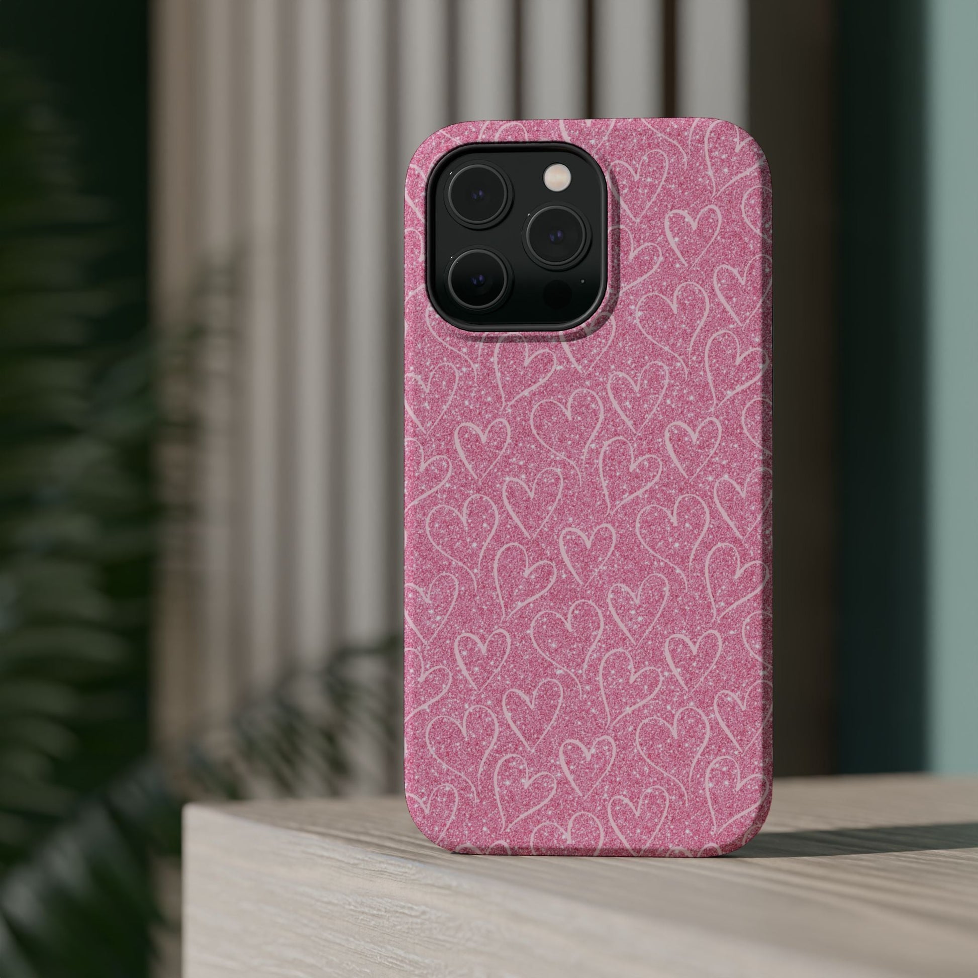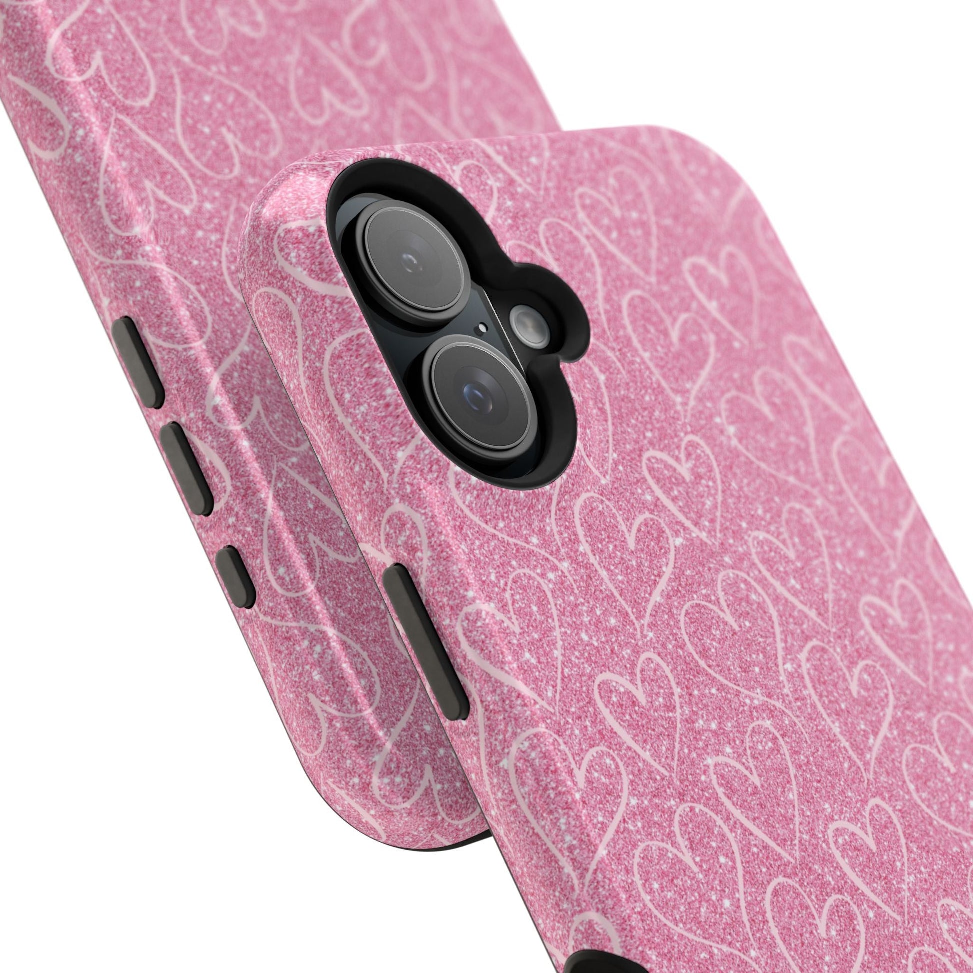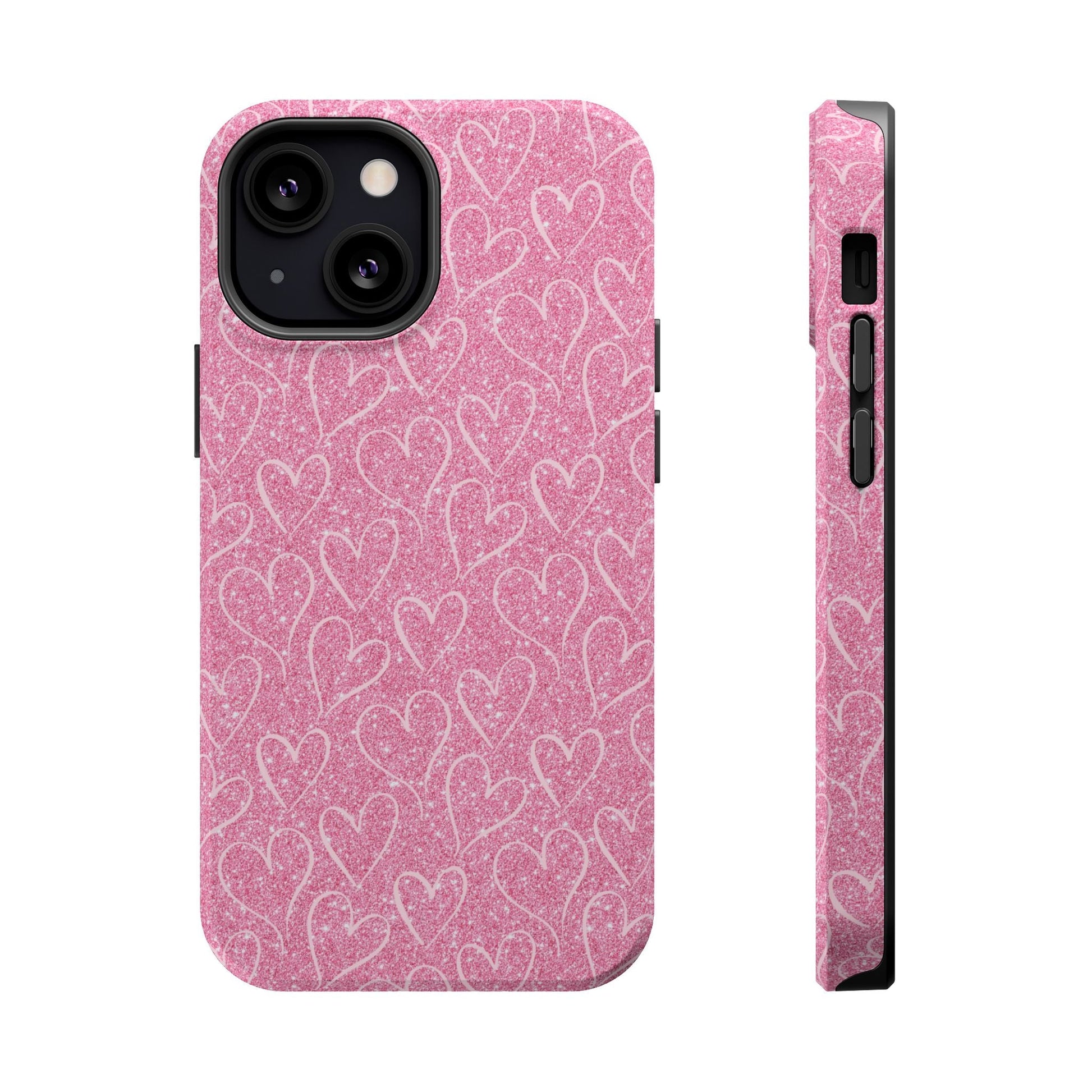 Embrace the allure of romance with our Shimmering Hearts MagSafe iPhone Case! This captivating design features a playful pattern of pink glitter hearts on a soft pink background, creating a dreamy and romantic vibe. It's the perfect case for those who love all things love and affection. Crafted with a dual-layer design, combining a shock-absorbing TPU inner layer and a sturdy polycarbonate outer shell, this case provides reliable protection against everyday bumps and drops. With its slim and lightweight profile, this case is perfect for those who want to keep their phone stylish and protected without adding bulk.