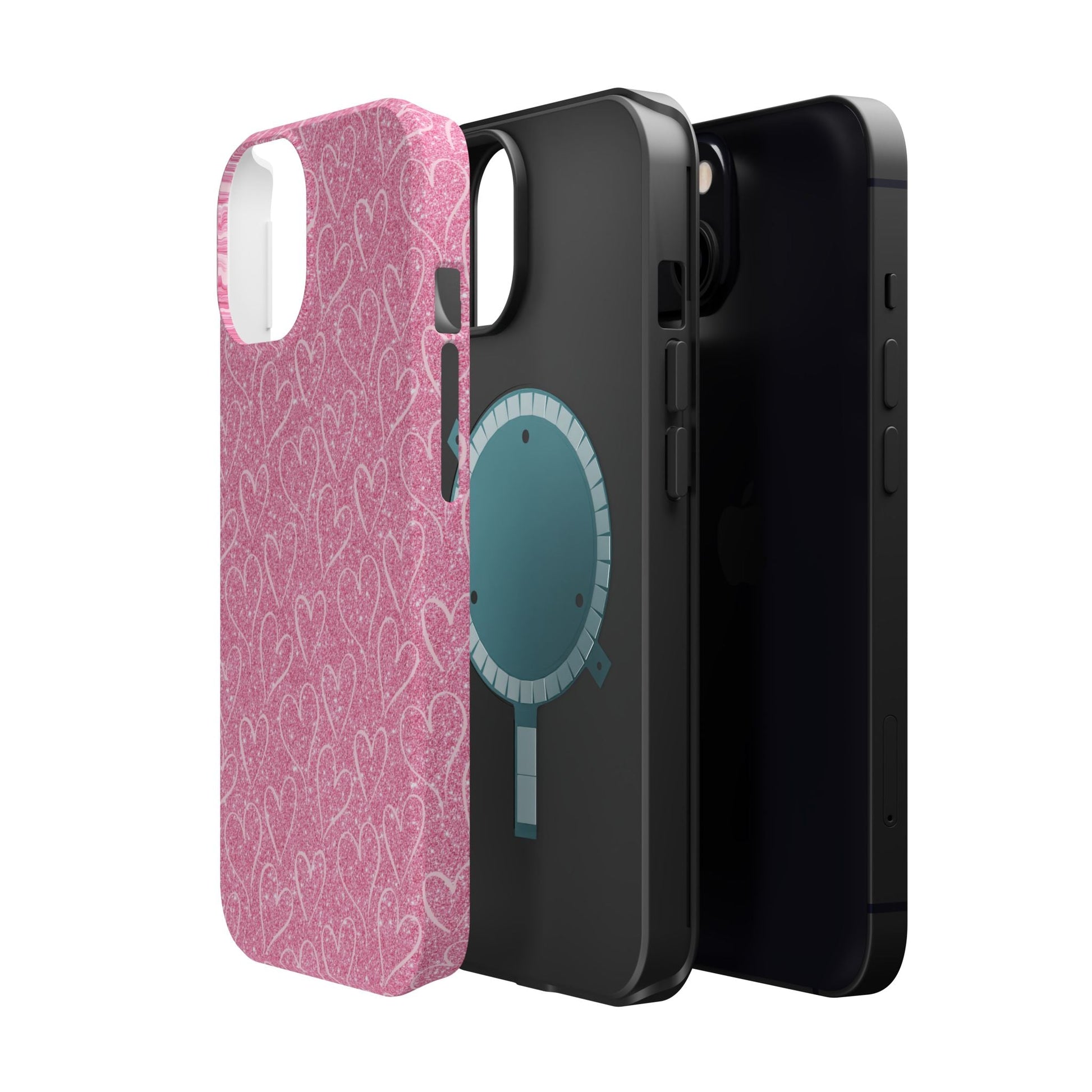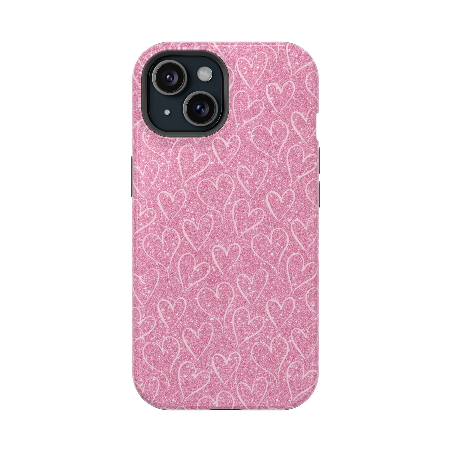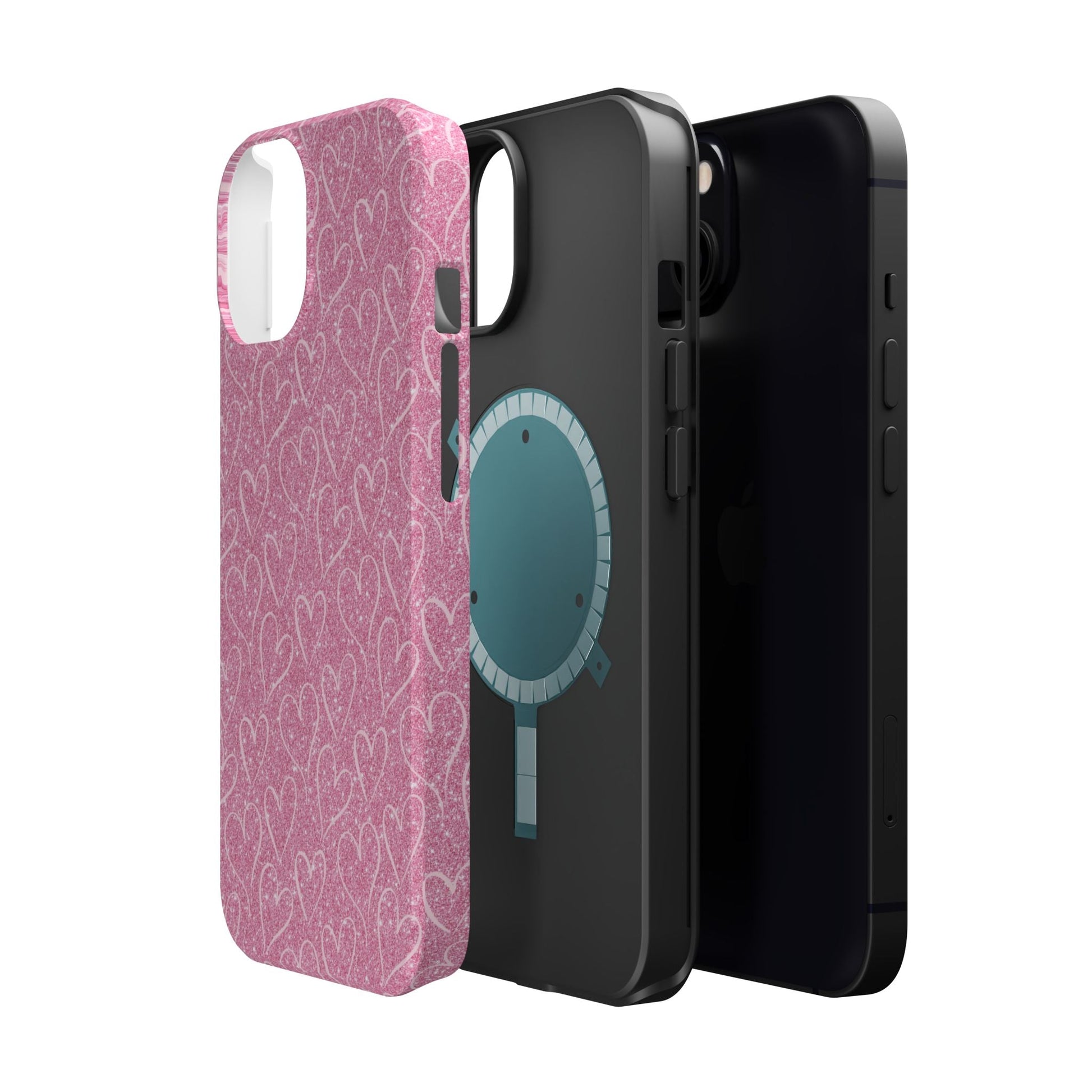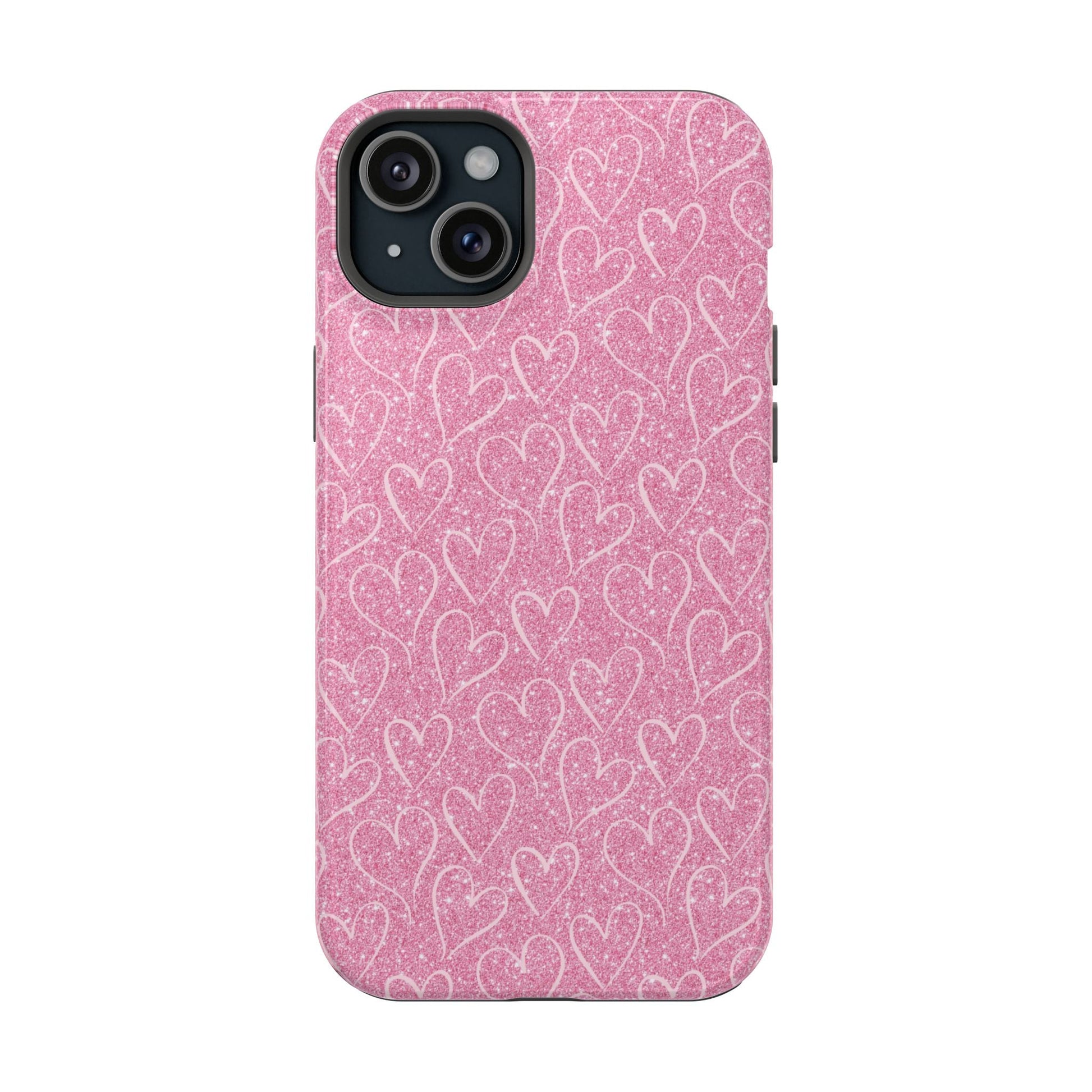 Embrace the allure of romance with our Shimmering Hearts MagSafe iPhone Case! This captivating design features a playful pattern of pink glitter hearts on a soft pink background, creating a dreamy and romantic vibe. It's the perfect case for those who love all things love and affection. Crafted with a dual-layer design, combining a shock-absorbing TPU inner layer and a sturdy polycarbonate outer shell, this case provides reliable protection against everyday bumps and drops. With its slim and lightweight profile, this case is perfect for those who want to keep their phone stylish and protected without adding bulk.