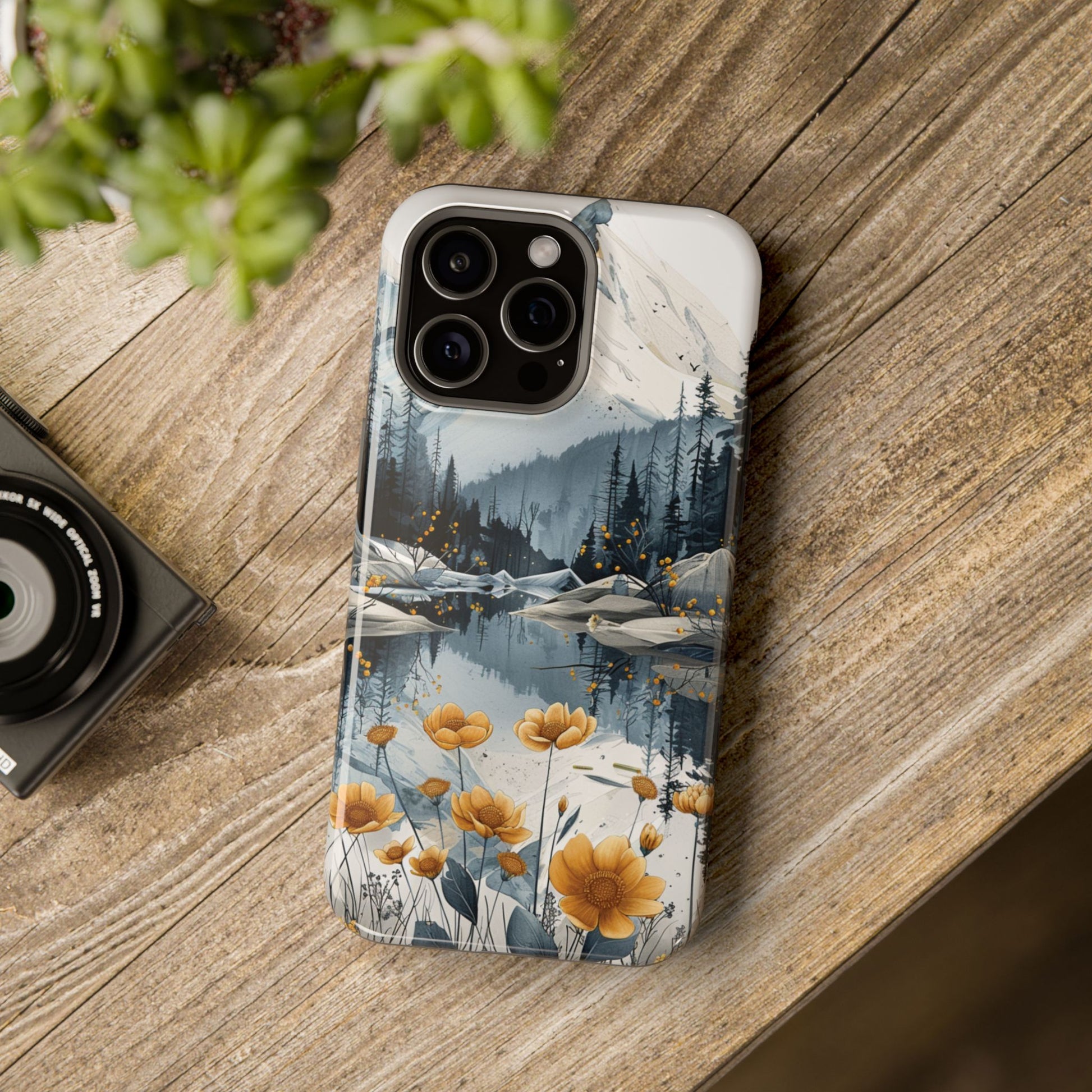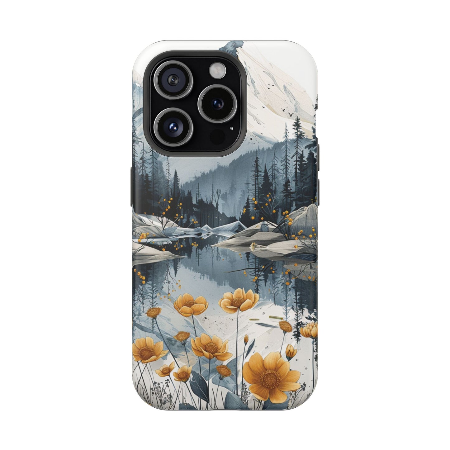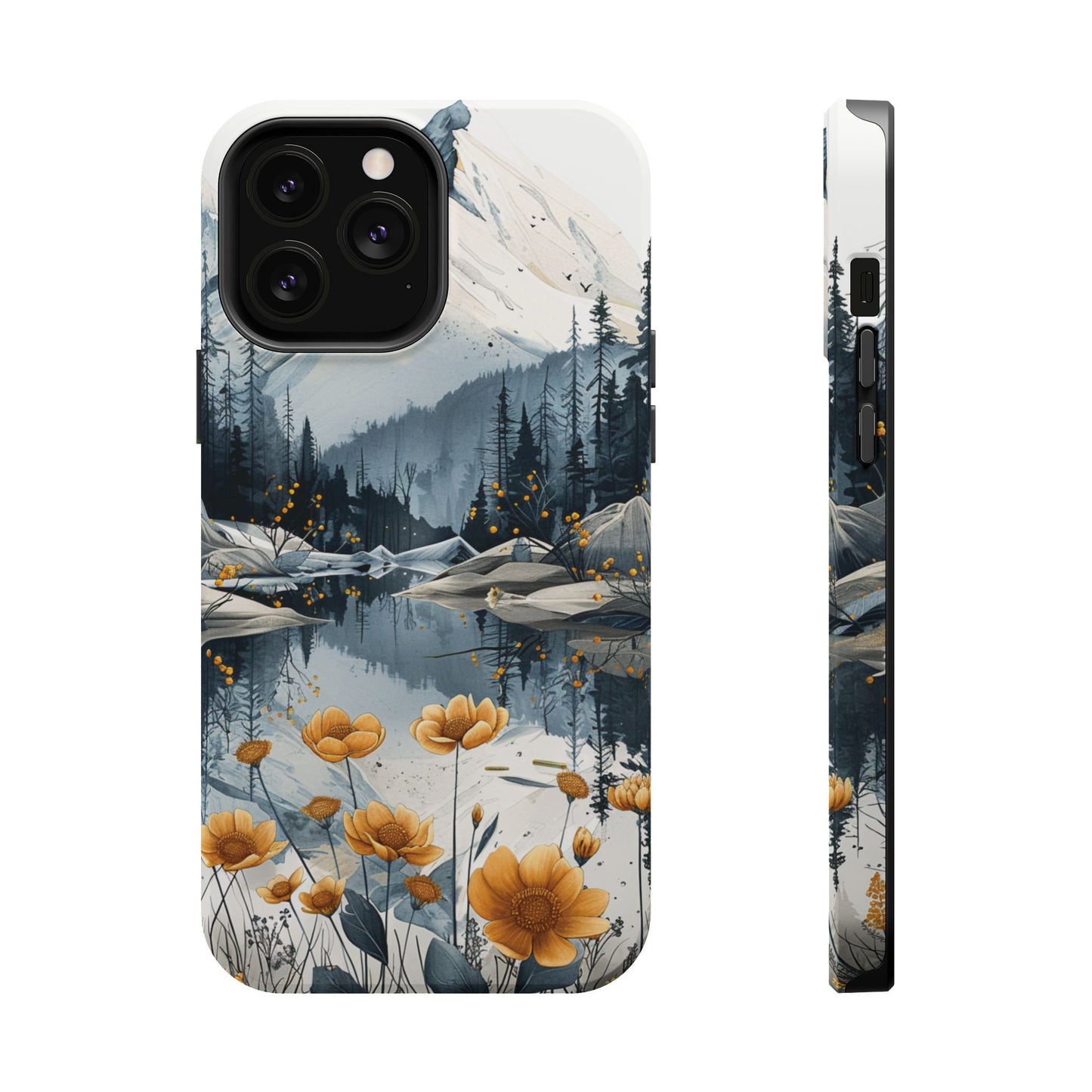 Revel in the sublime beauty of nature with our 'Alpine Serenity' MagSafe iPhone Case, a sanctuary of tranquility for your iPhone 15, 14, Plus, Pro, and Pro Max. This design draws inspiration from the untouched wilderness, featuring cool silver-tone mountains that rise majestically above a serene lake, dotted with the vibrant yellow of wildflowers.