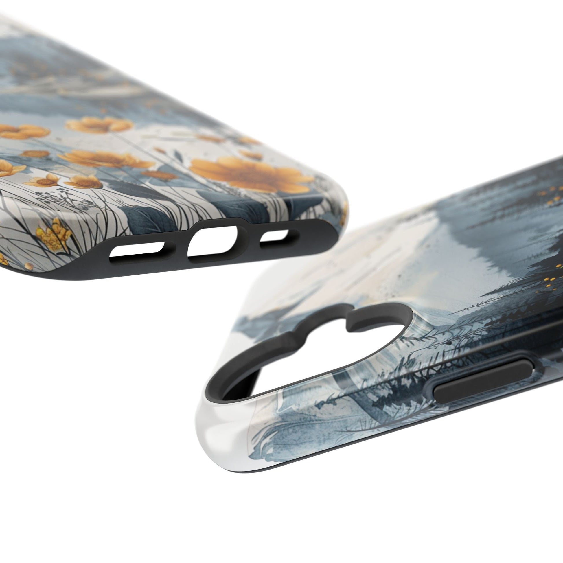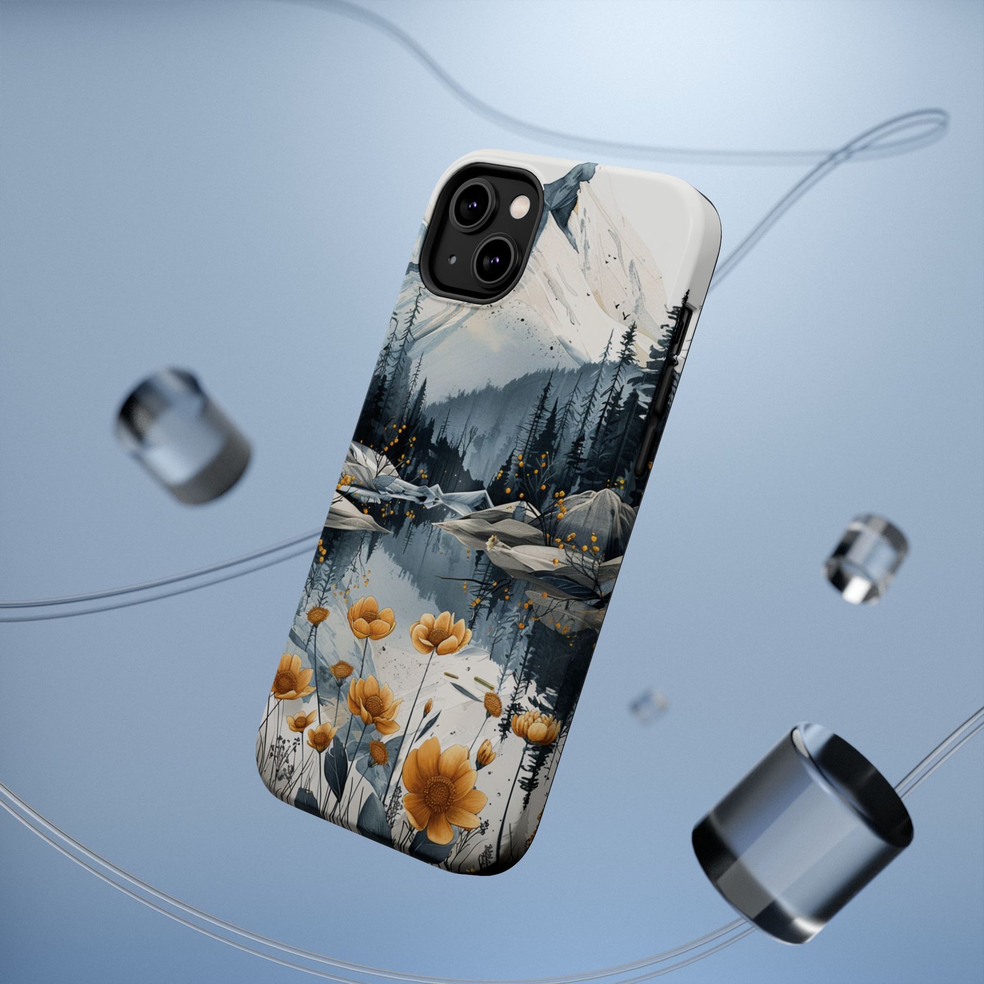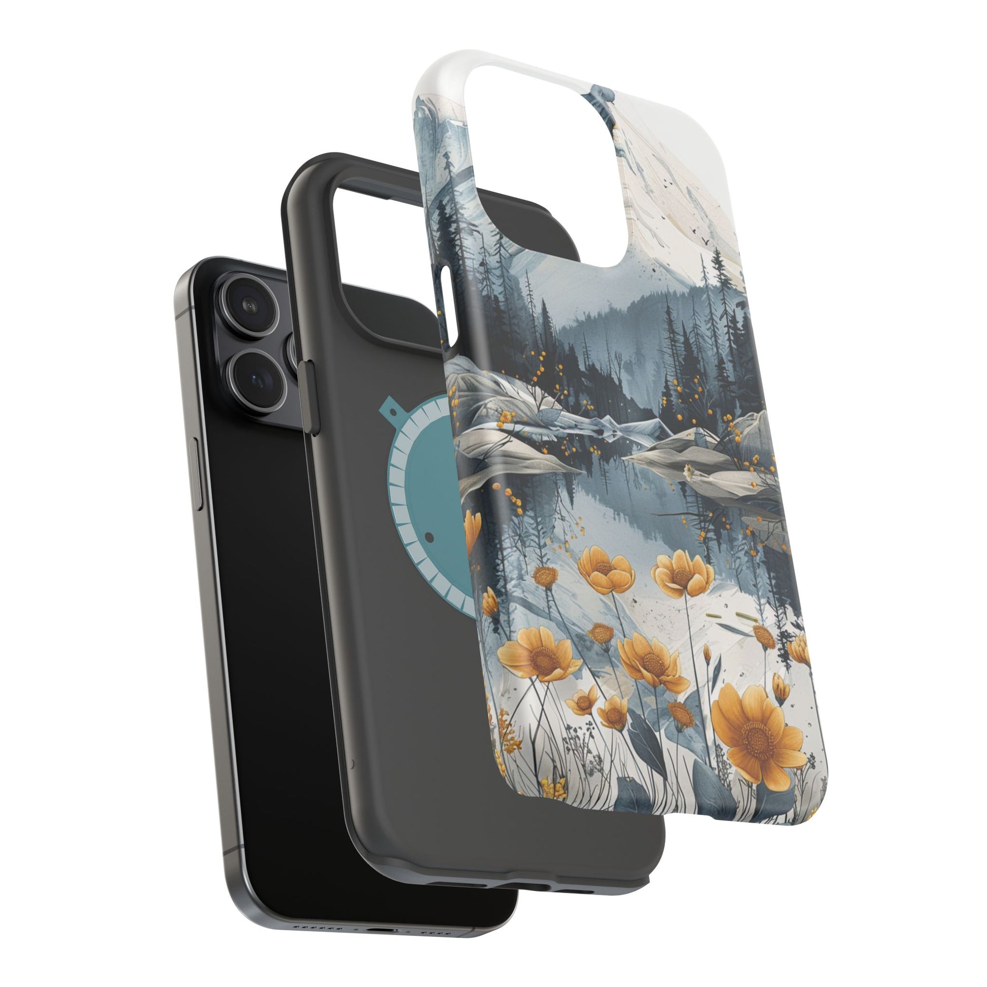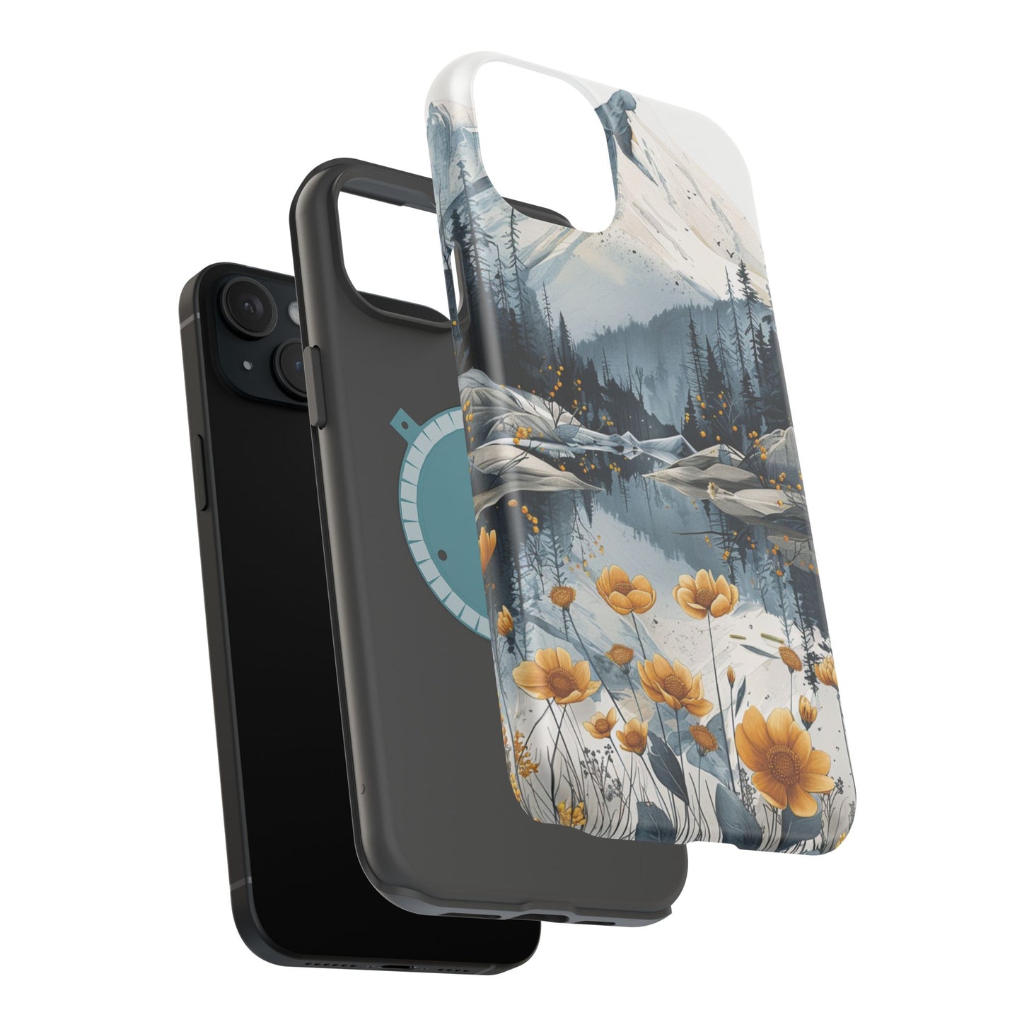 Revel in the sublime beauty of nature with our 'Alpine Serenity' MagSafe iPhone Case, a sanctuary of tranquility for your iPhone 15, 14, Plus, Pro, and Pro Max. This design draws inspiration from the untouched wilderness, featuring cool silver-tone mountains that rise majestically above a serene lake, dotted with the vibrant yellow of wildflowers.