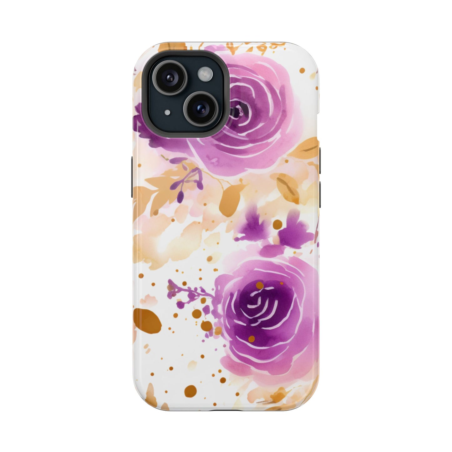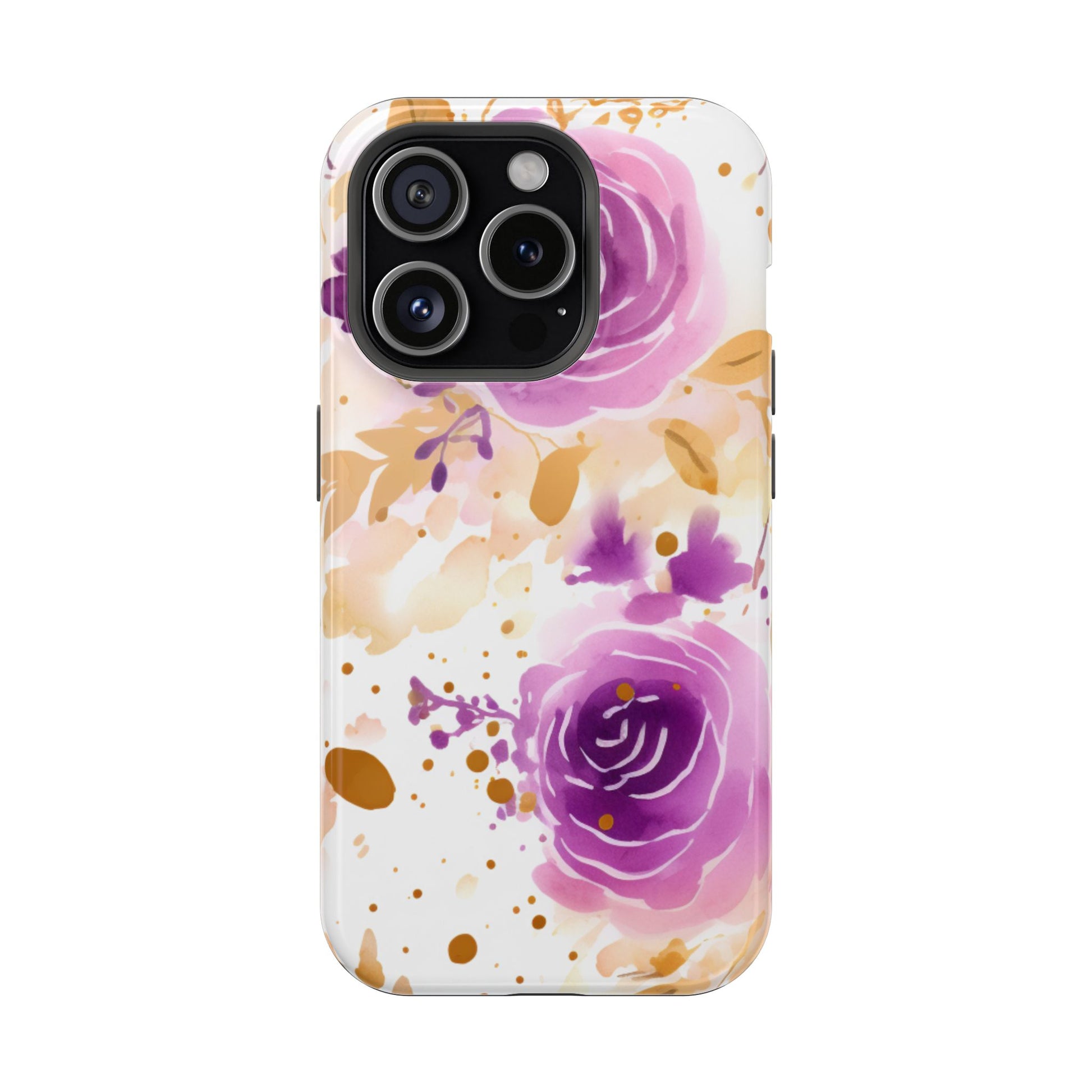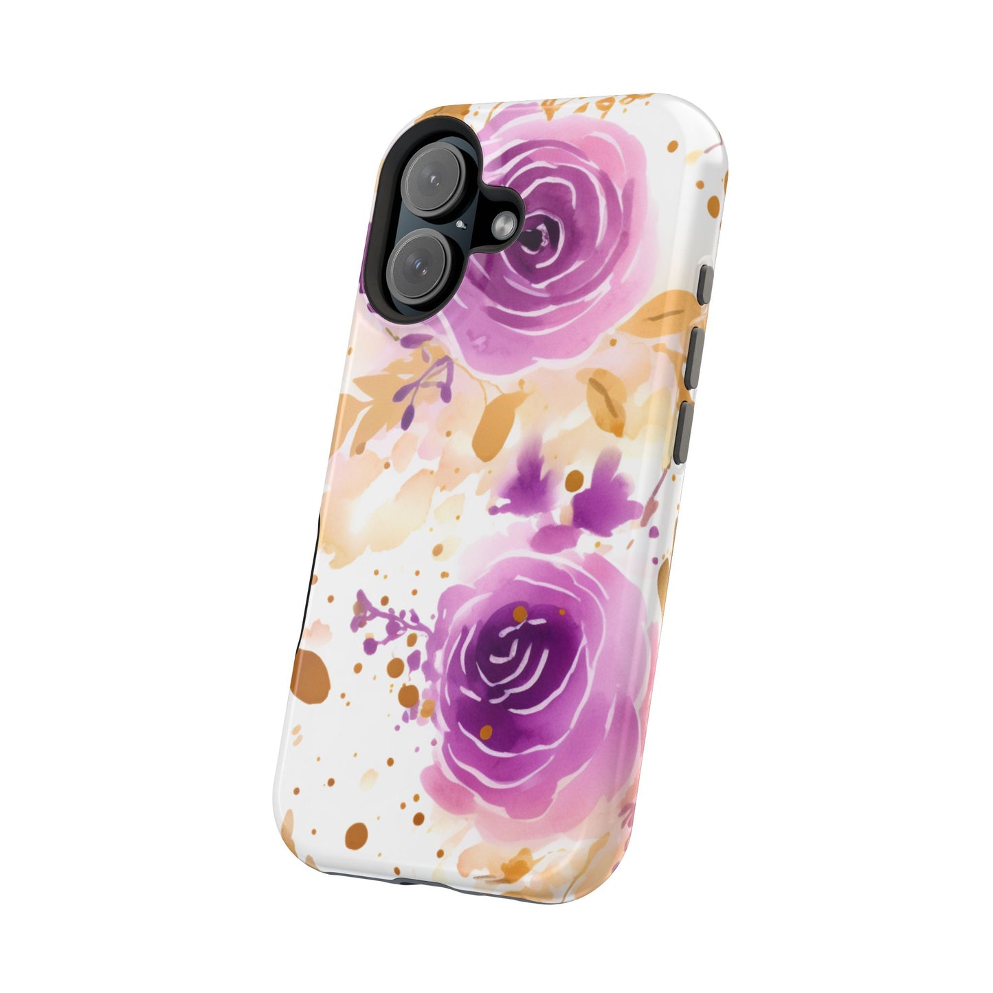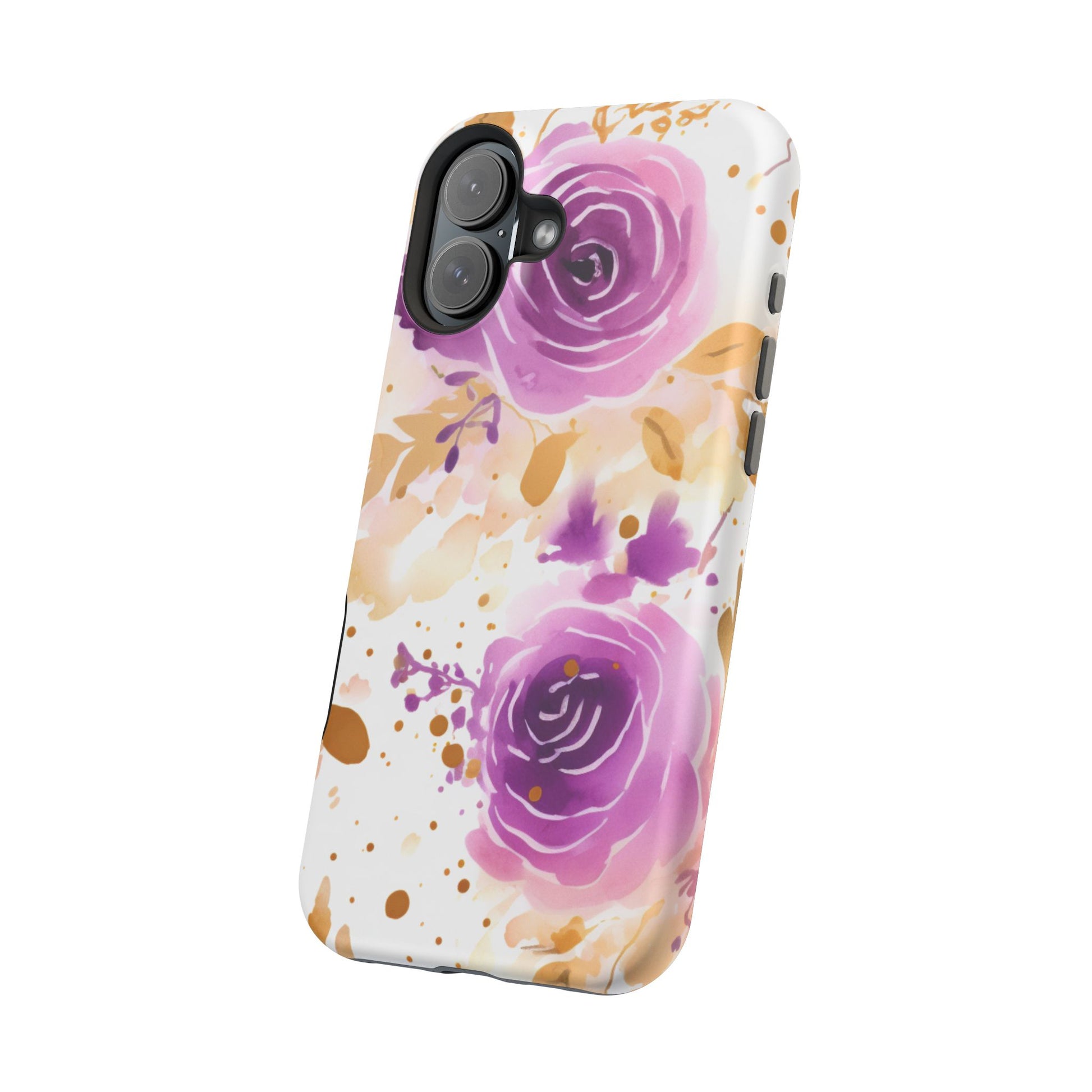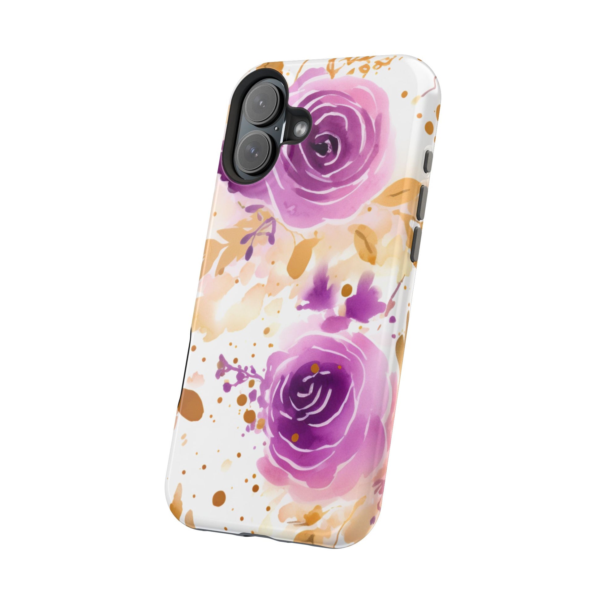 Add a touch of elegance to your phone with this Soft Purple & Gold Floral Splash MagSafe iPhone case. Featuring a whimsical watercolor design of soft purple roses blended with delicate gold leaves and splatter accents, this case creates a dreamy, artistic look. Perfect for flower lovers and those with an eye for gentle, feminine designs, this case enhances your iPhone’s style while providing robust protection. The delicate blend of lilac, violet, and blush tones with gold details makes this case a standout accessory for any occasion.