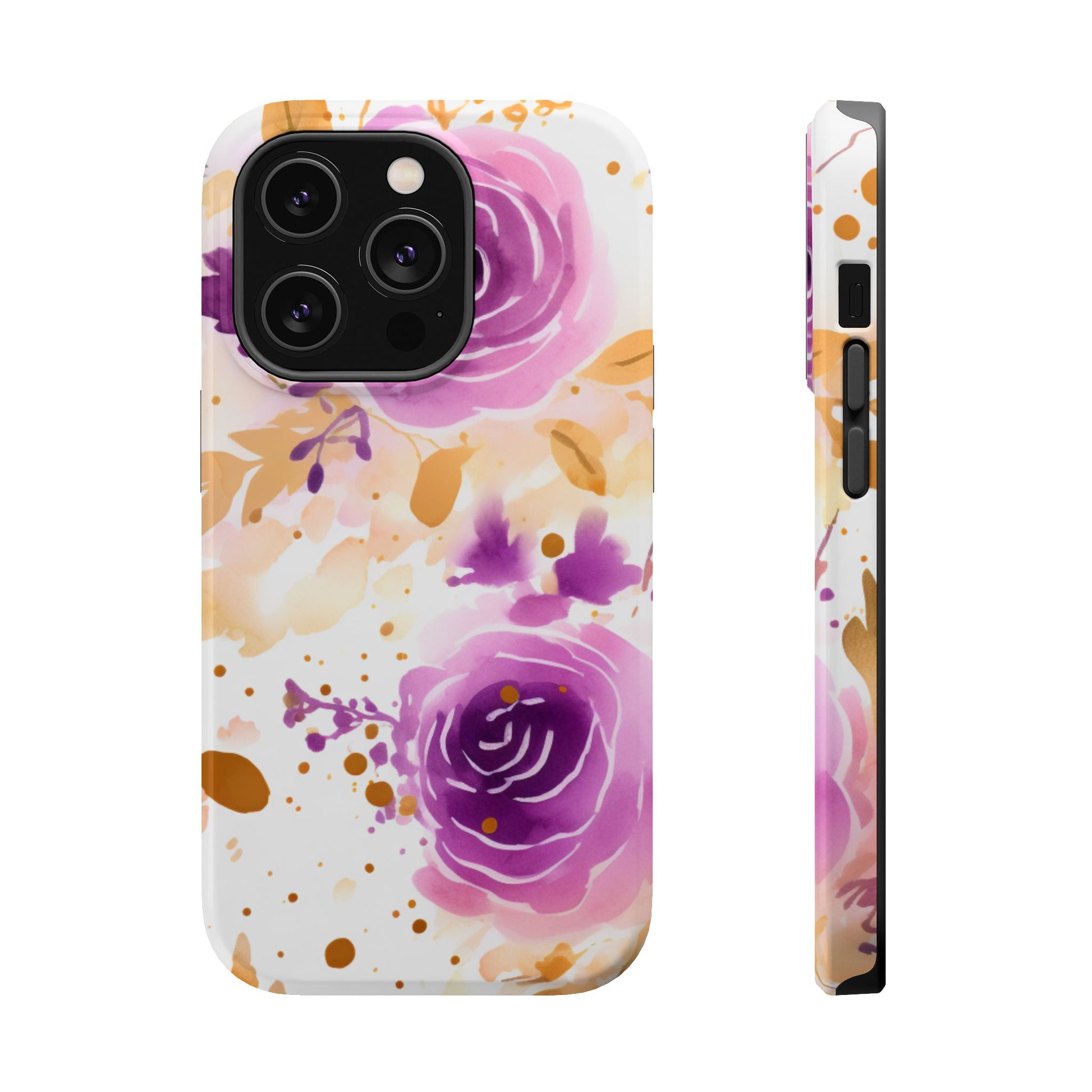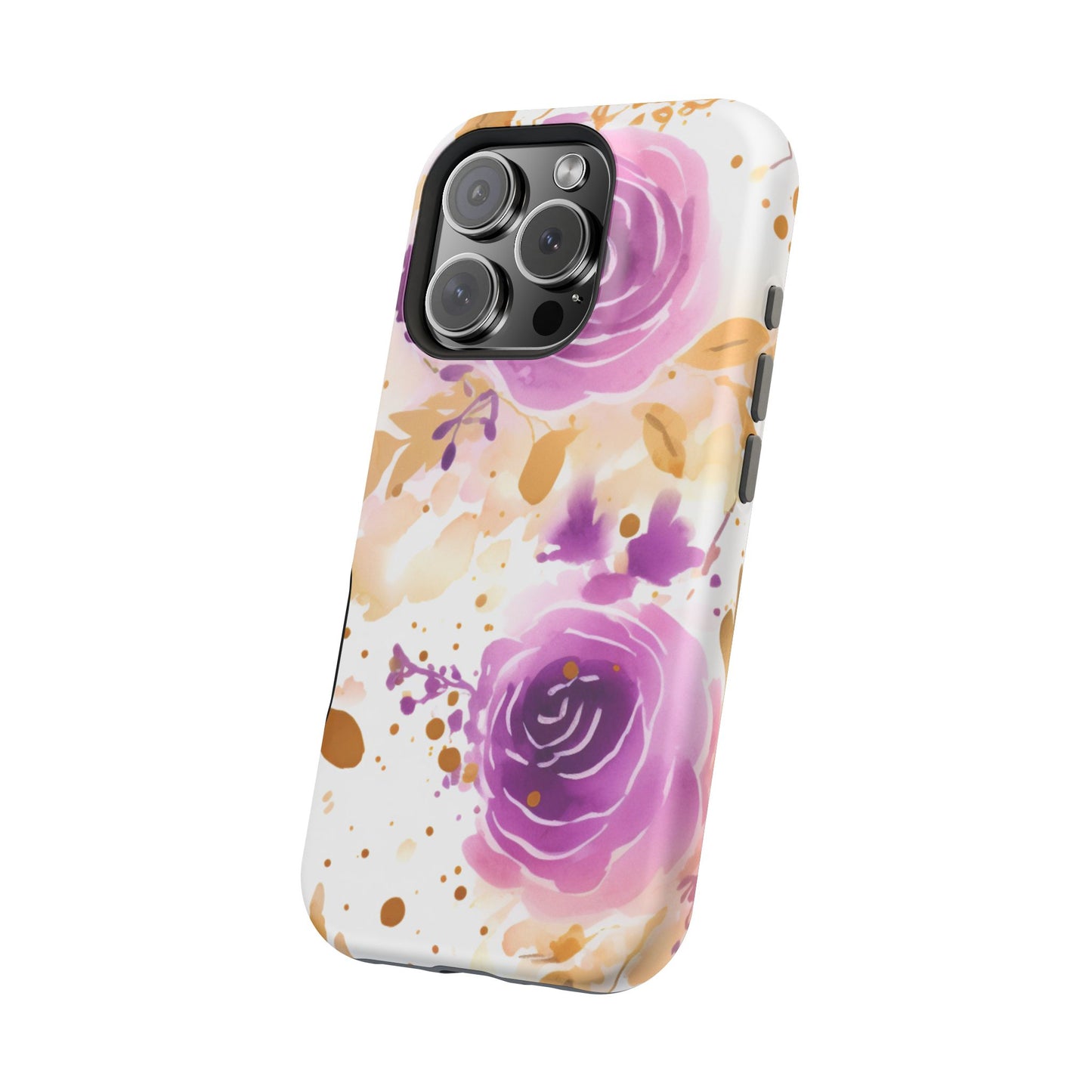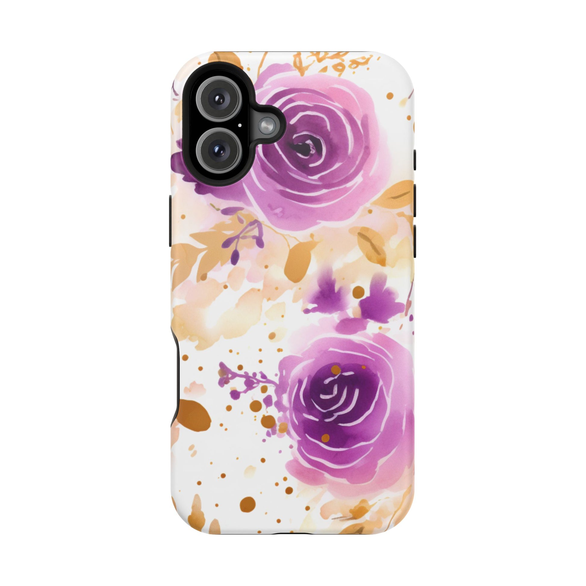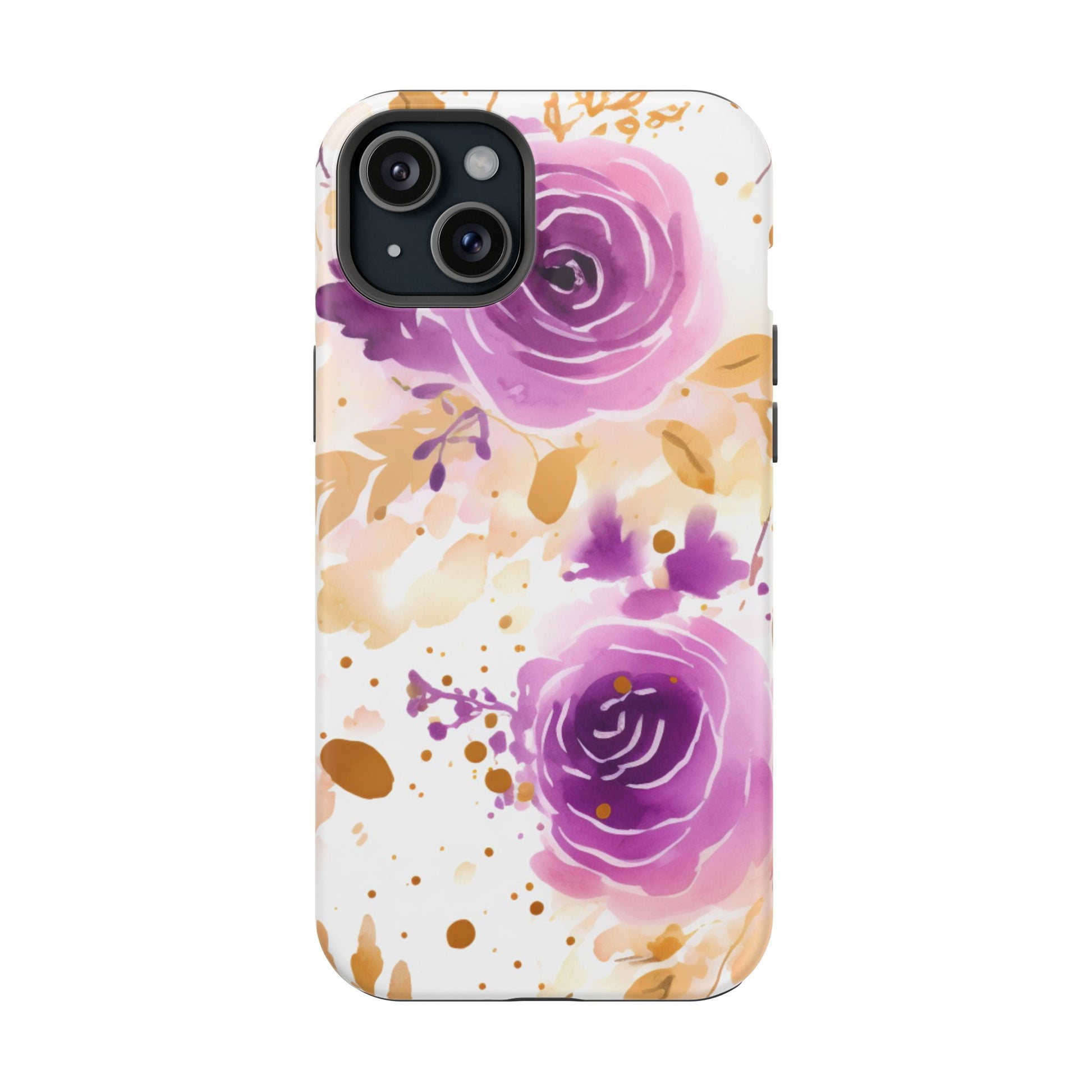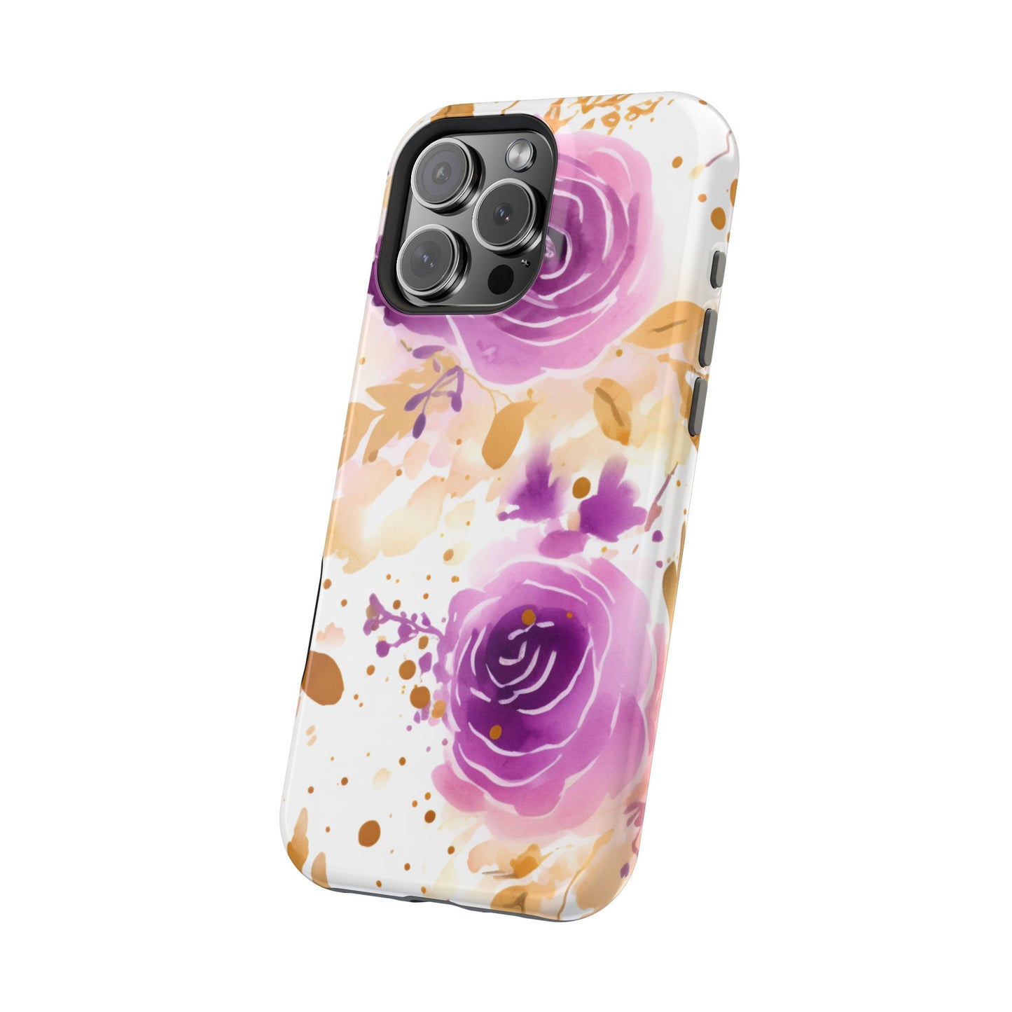 Add a touch of elegance to your phone with this Soft Purple & Gold Floral Splash MagSafe iPhone case. Featuring a whimsical watercolor design of soft purple roses blended with delicate gold leaves and splatter accents, this case creates a dreamy, artistic look. Perfect for flower lovers and those with an eye for gentle, feminine designs, this case enhances your iPhone’s style while providing robust protection. The delicate blend of lilac, violet, and blush tones with gold details makes this case a standout accessory for any occasion.