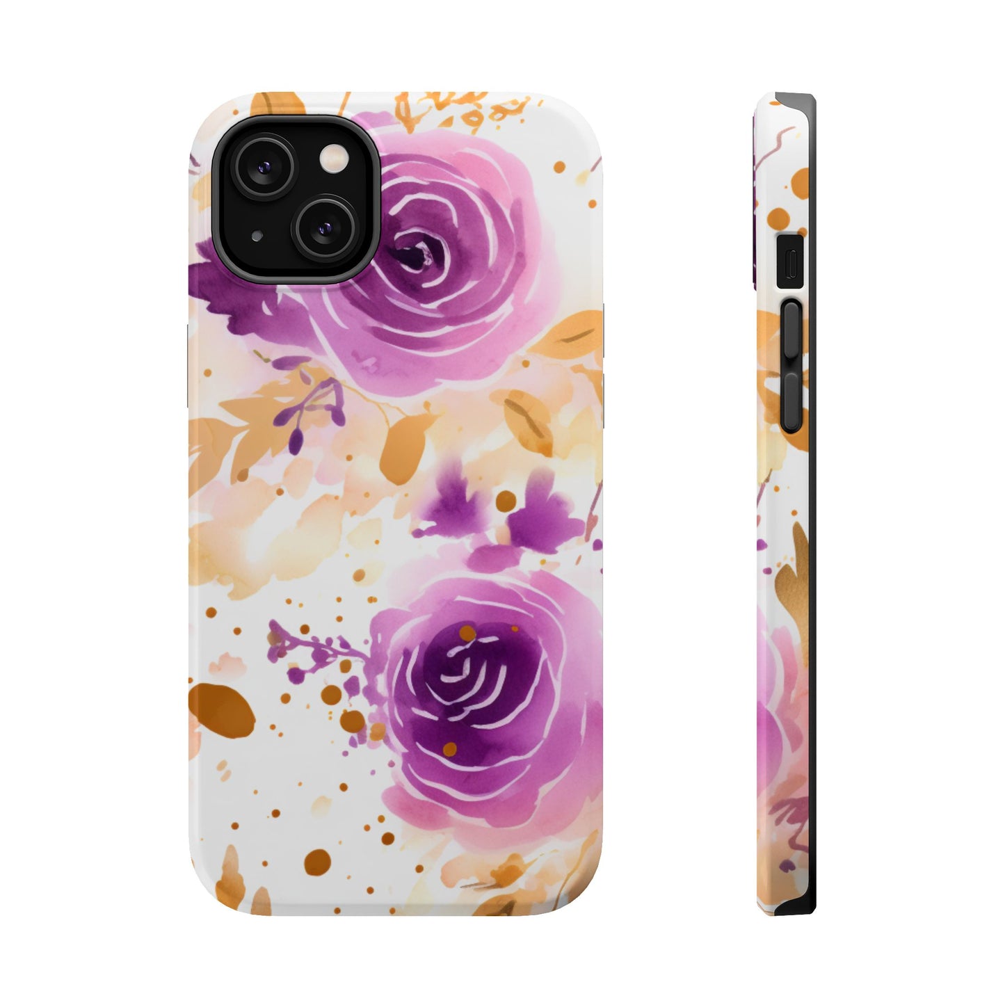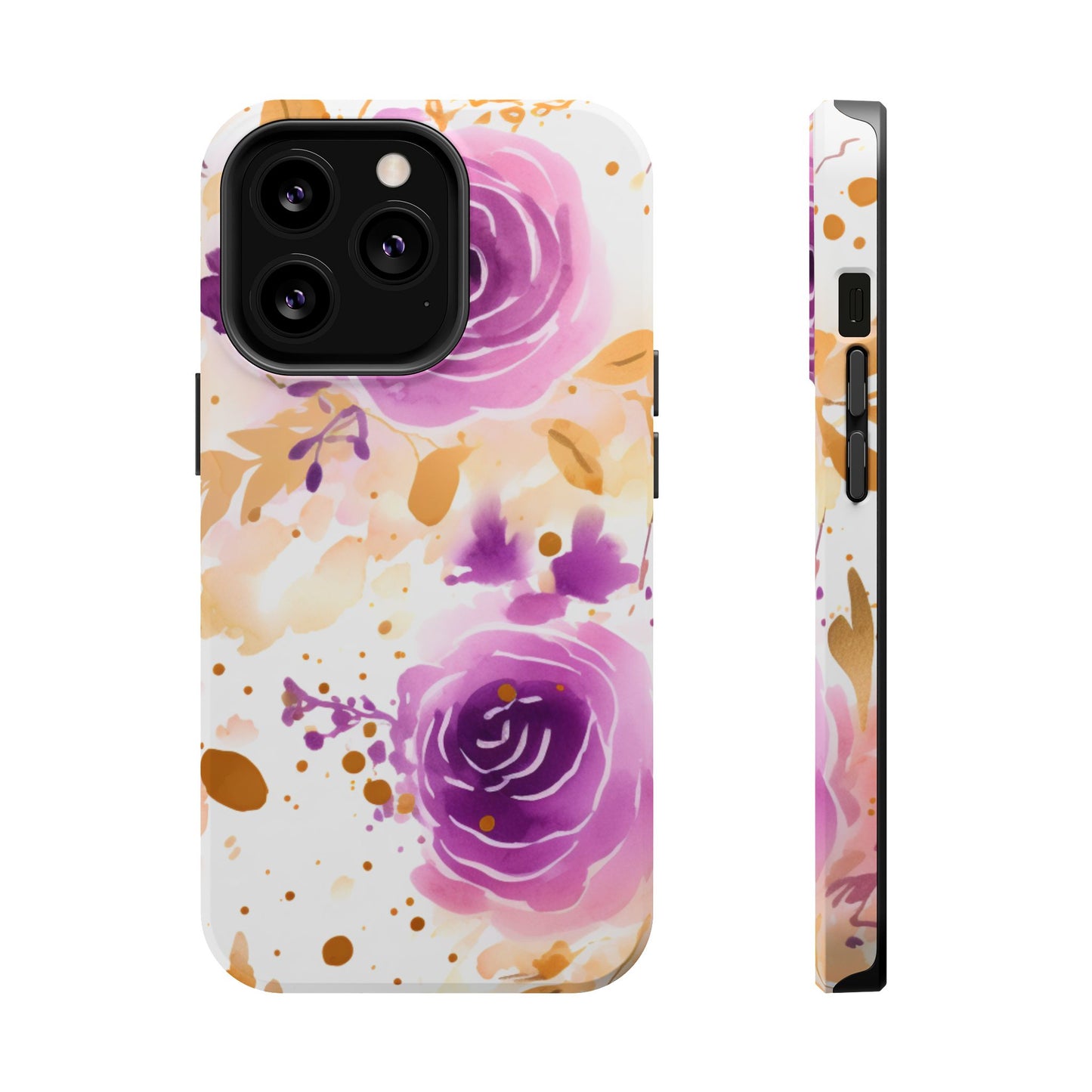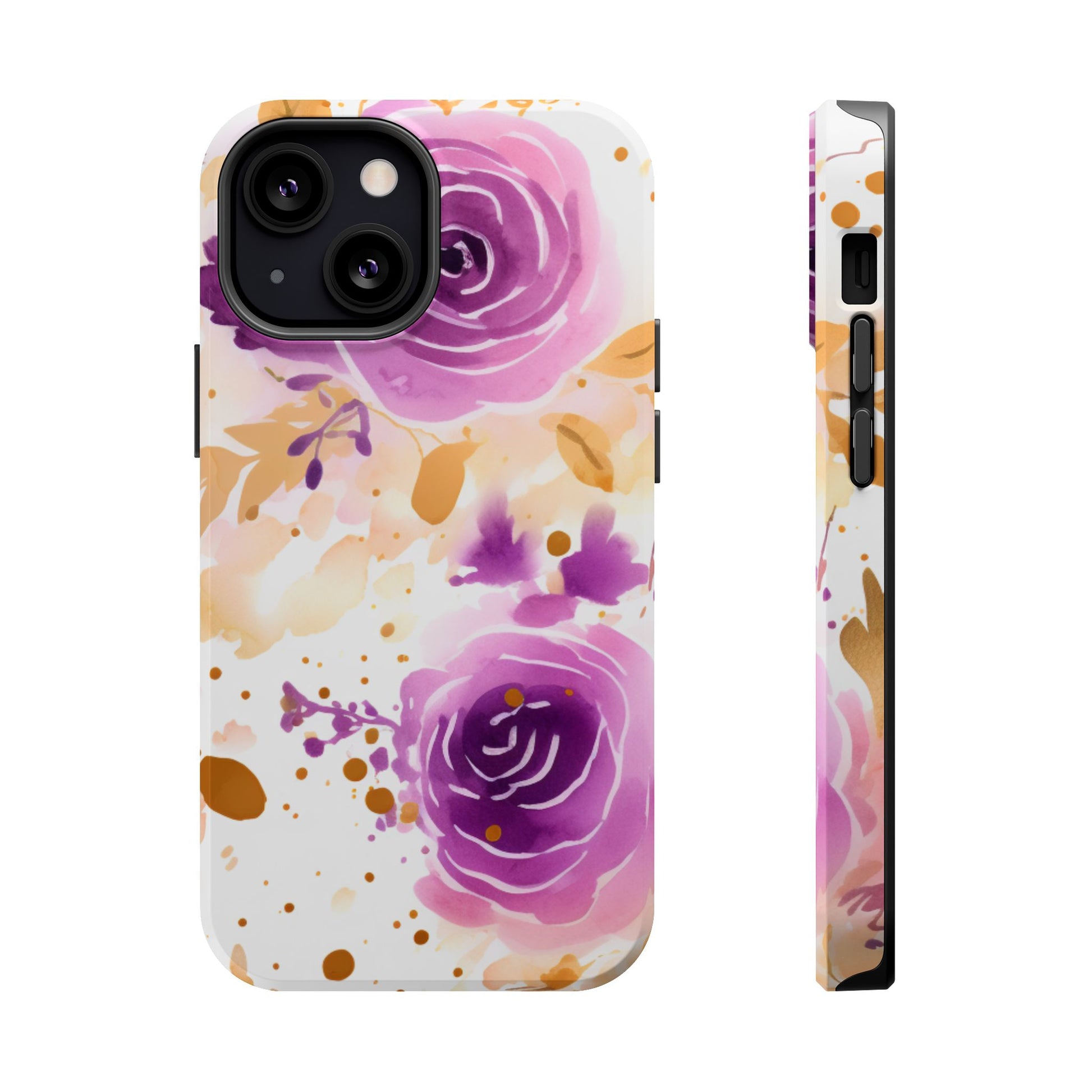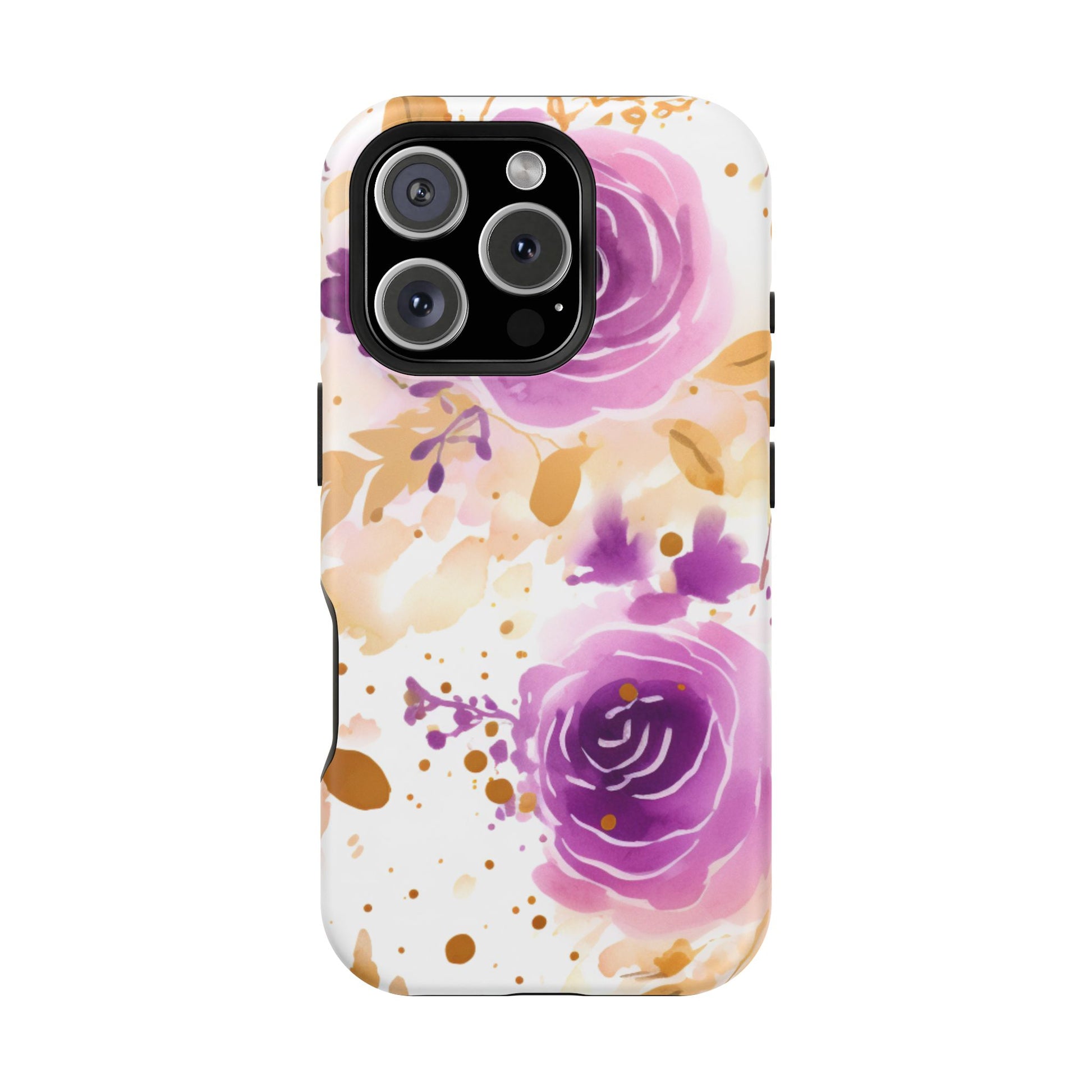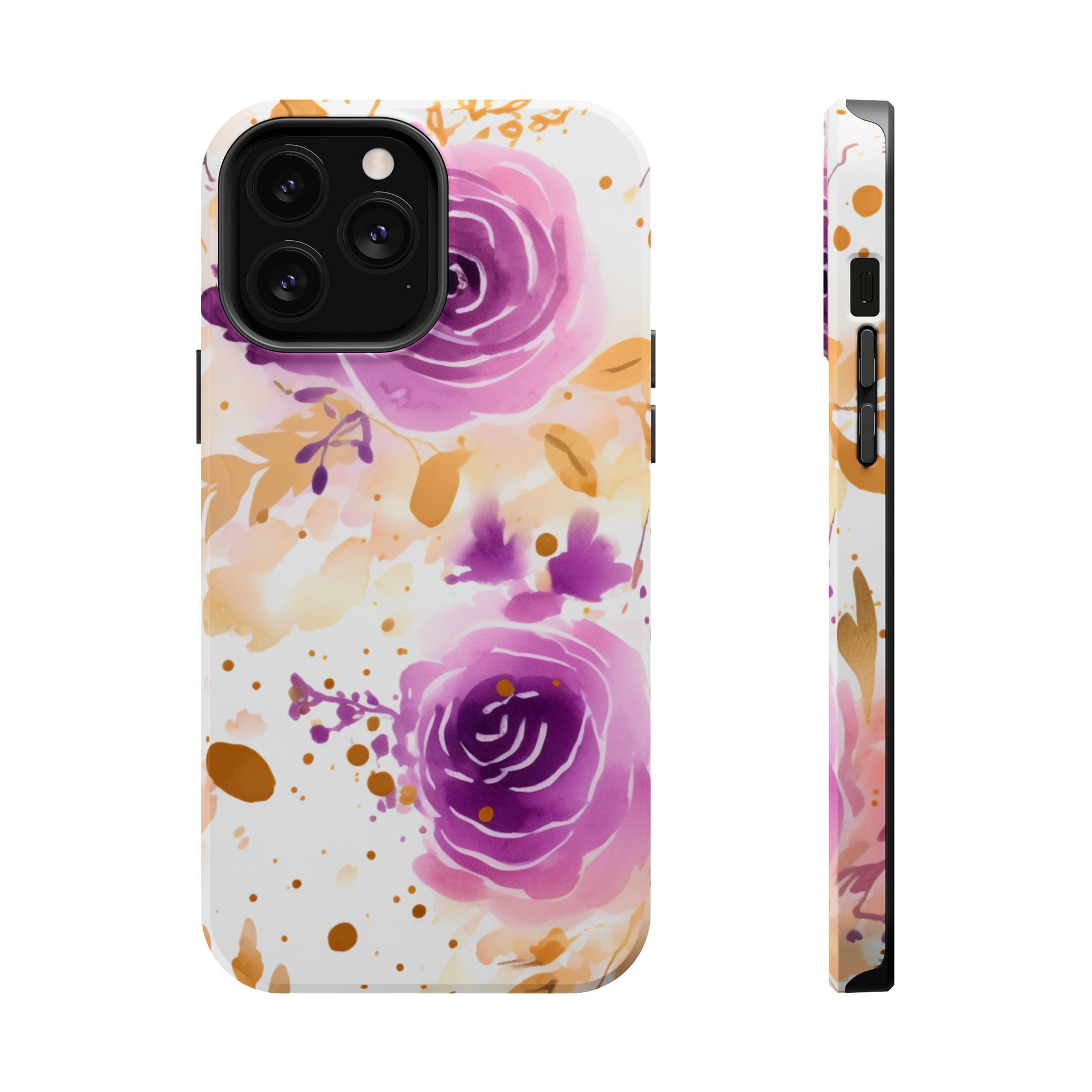 Add a touch of elegance to your phone with this Soft Purple & Gold Floral Splash MagSafe iPhone case. Featuring a whimsical watercolor design of soft purple roses blended with delicate gold leaves and splatter accents, this case creates a dreamy, artistic look. Perfect for flower lovers and those with an eye for gentle, feminine designs, this case enhances your iPhone’s style while providing robust protection. The delicate blend of lilac, violet, and blush tones with gold details makes this case a standout accessory for any occasion.