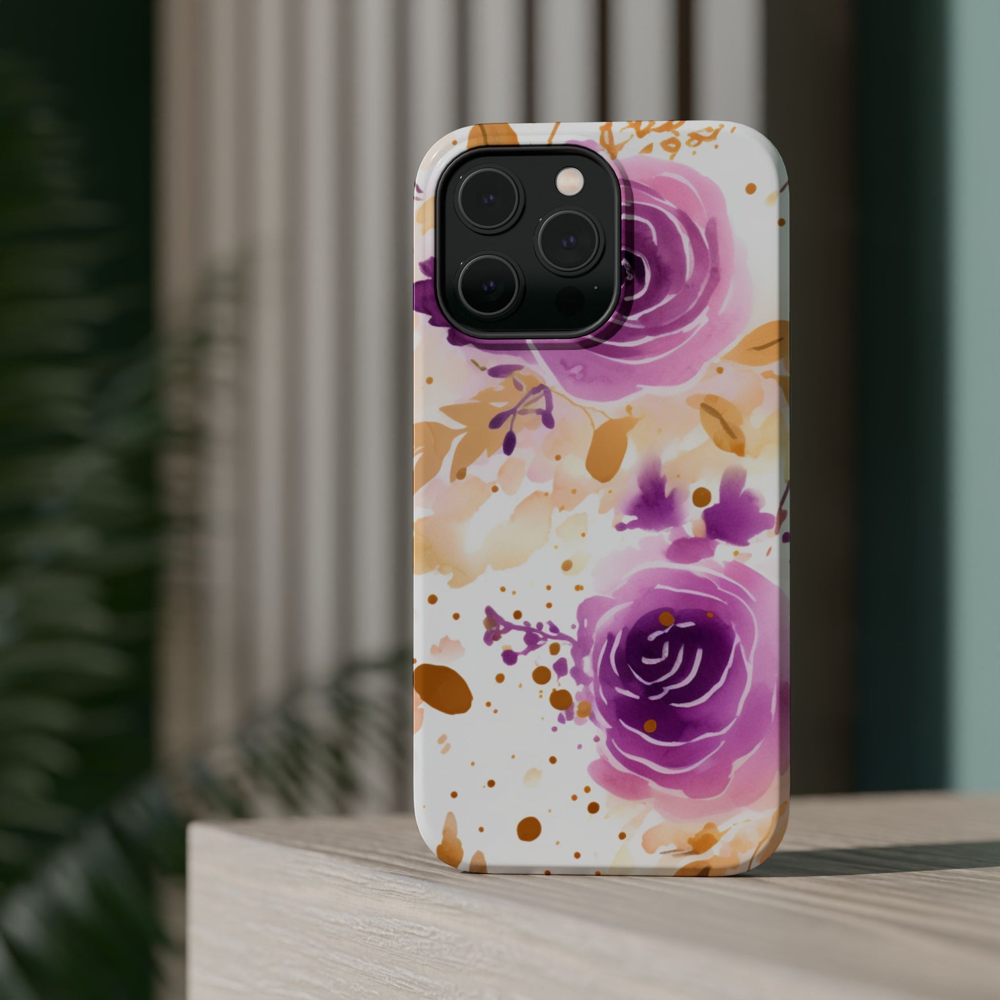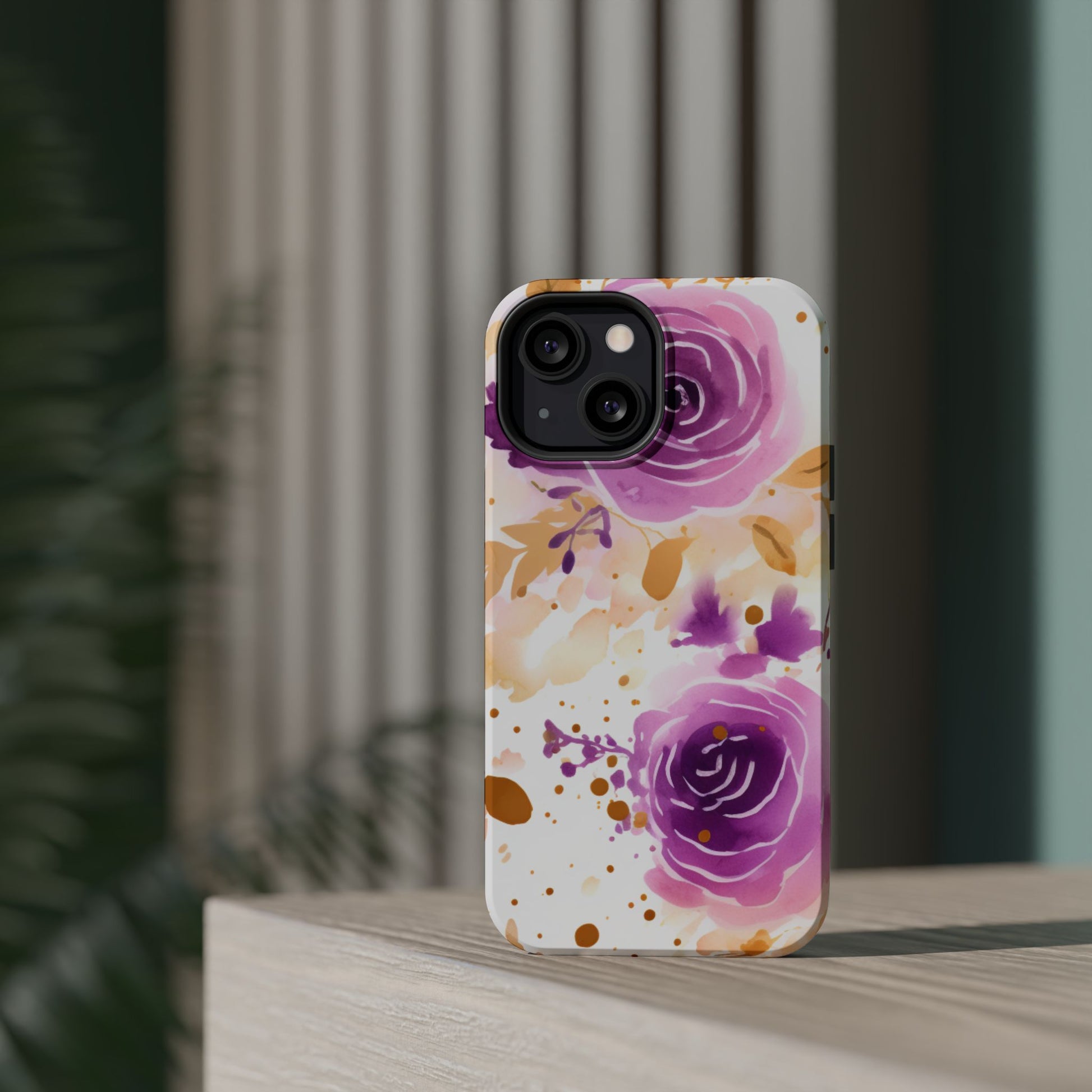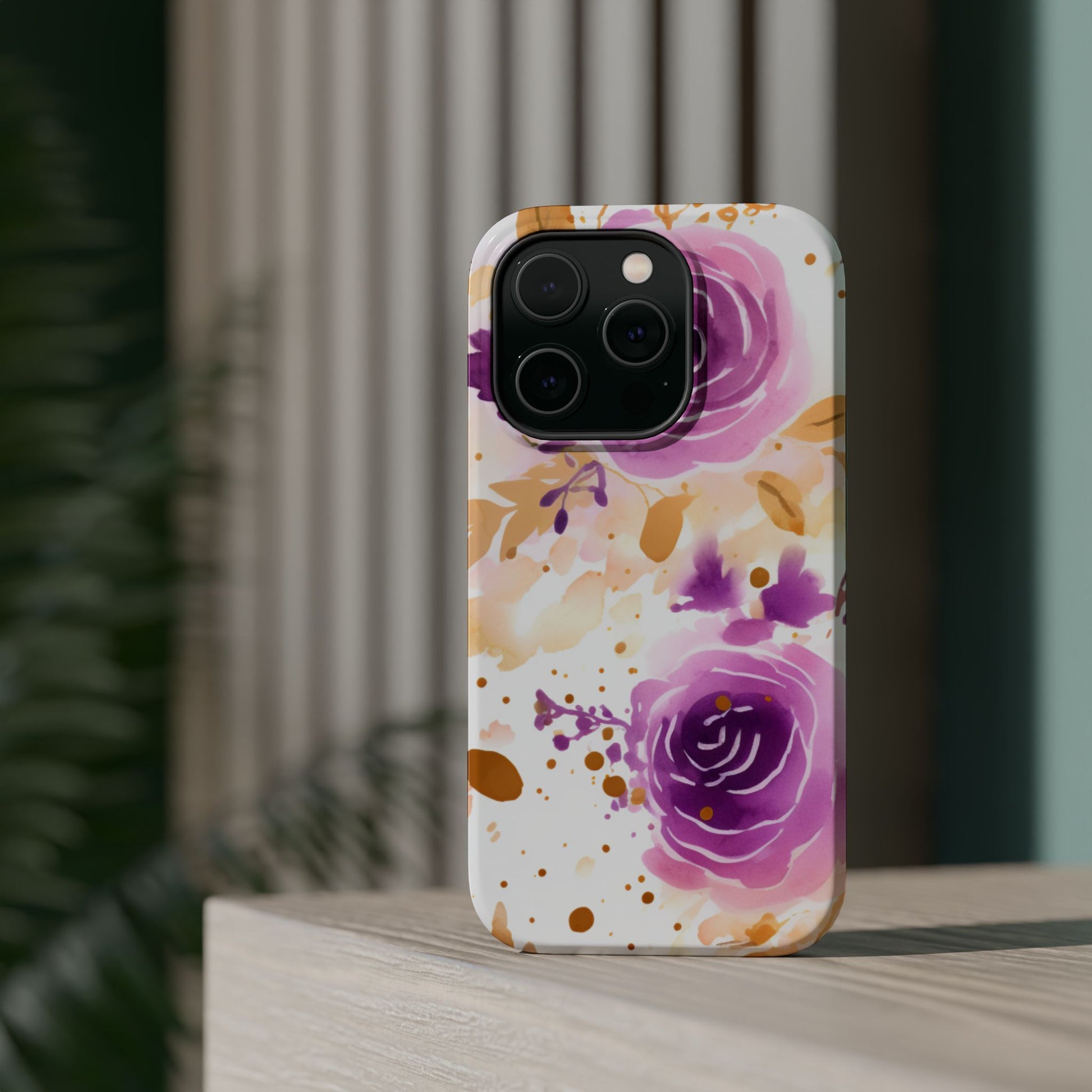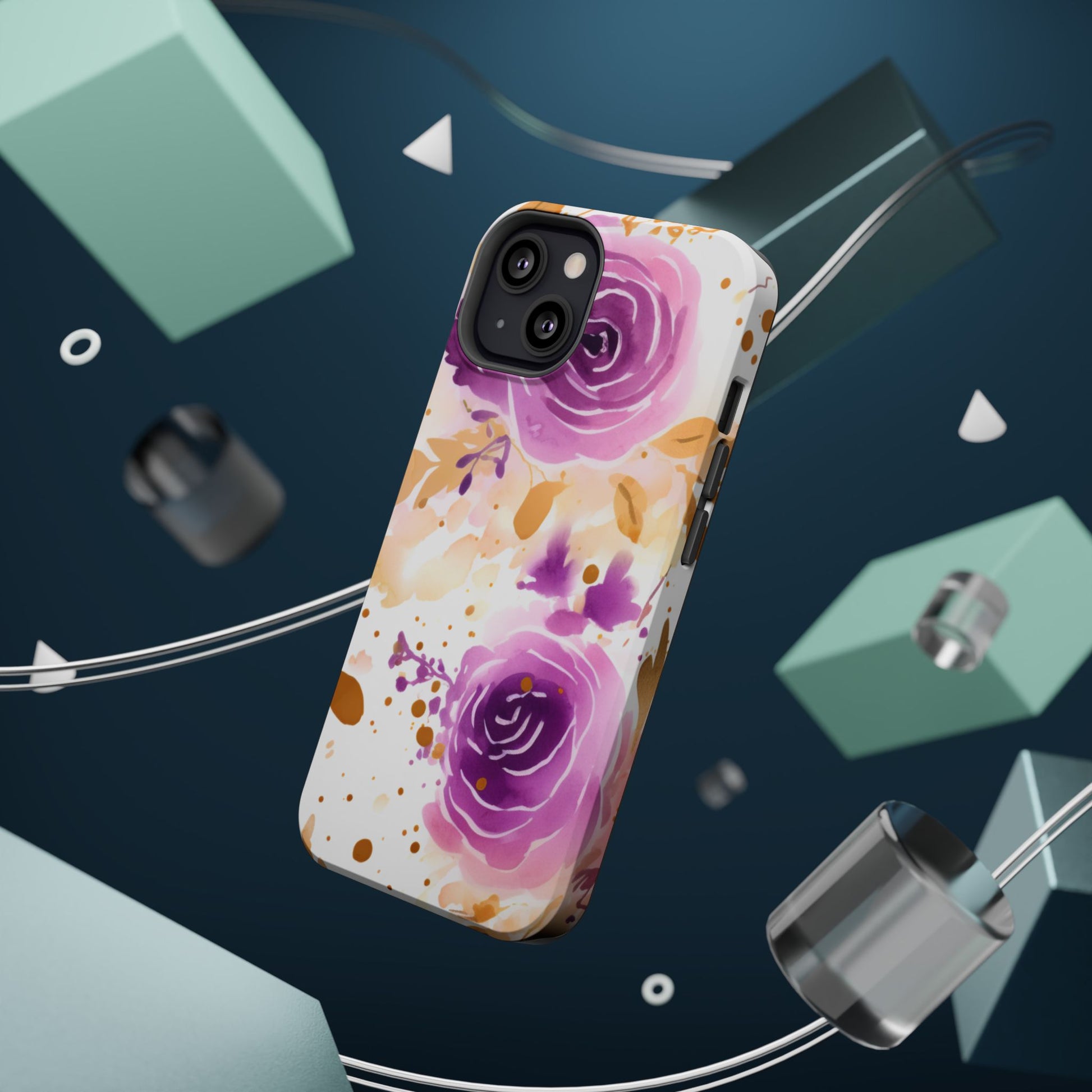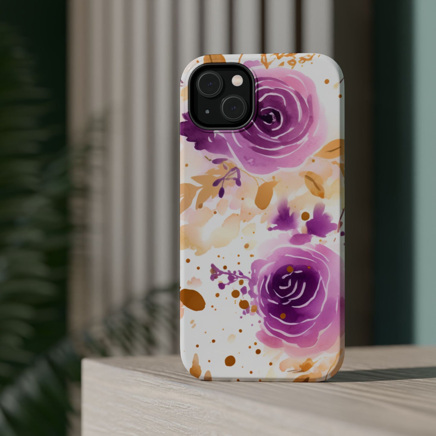 Add a touch of elegance to your phone with this Soft Purple & Gold Floral Splash MagSafe iPhone case. Featuring a whimsical watercolor design of soft purple roses blended with delicate gold leaves and splatter accents, this case creates a dreamy, artistic look. Perfect for flower lovers and those with an eye for gentle, feminine designs, this case enhances your iPhone’s style while providing robust protection. The delicate blend of lilac, violet, and blush tones with gold details makes this case a standout accessory for any occasion.