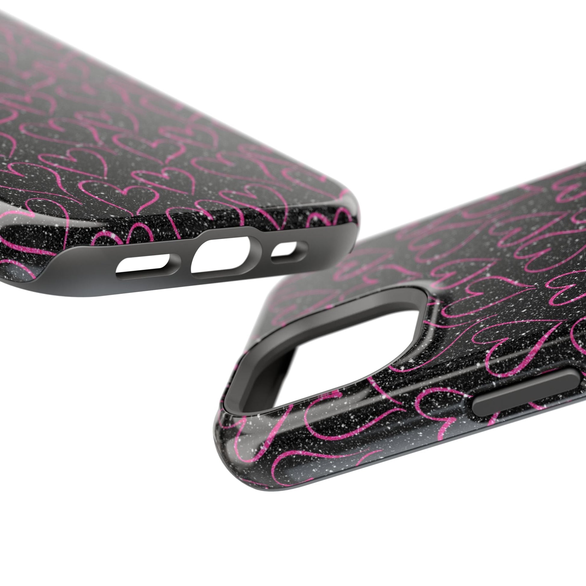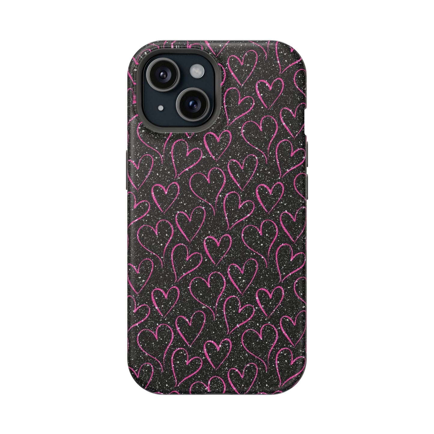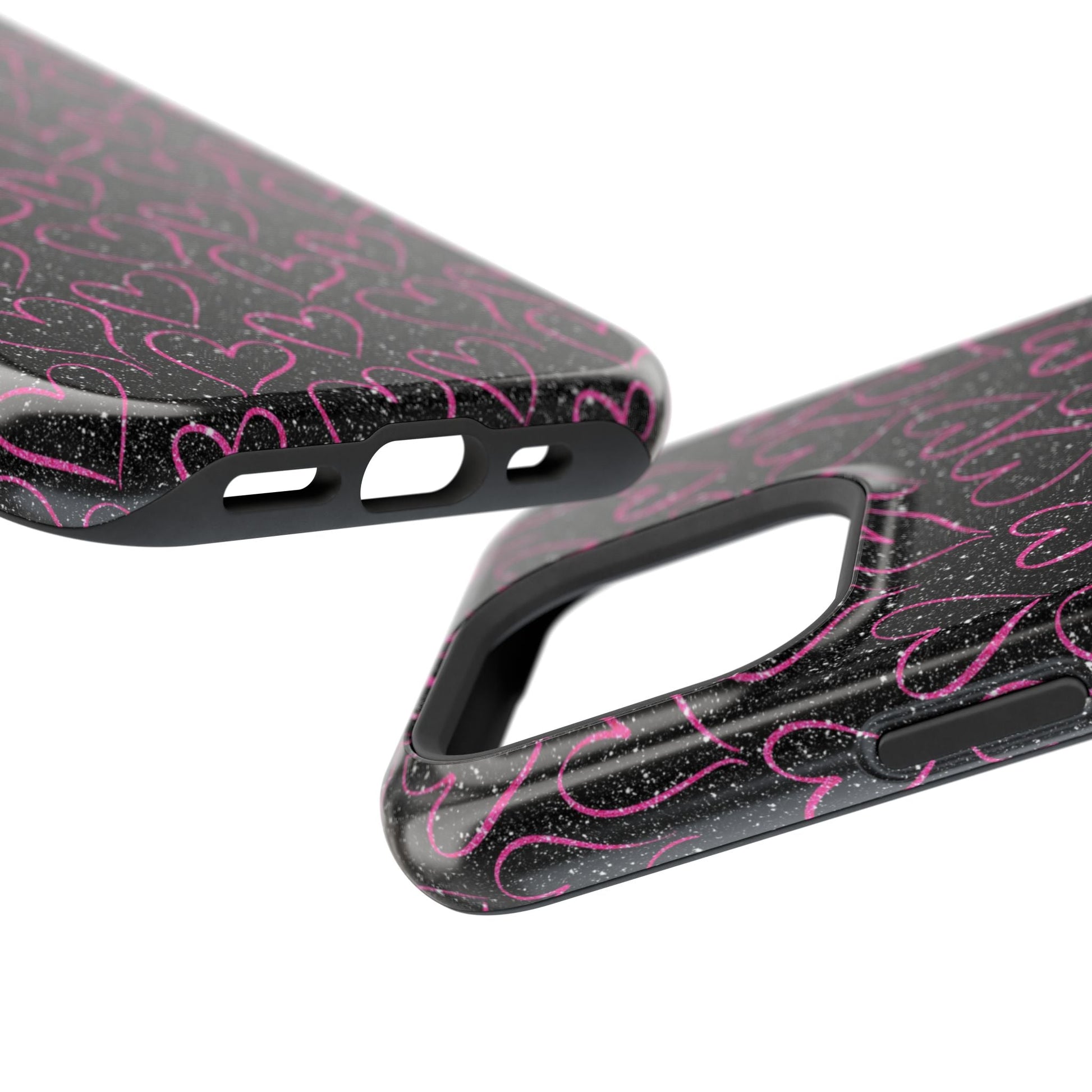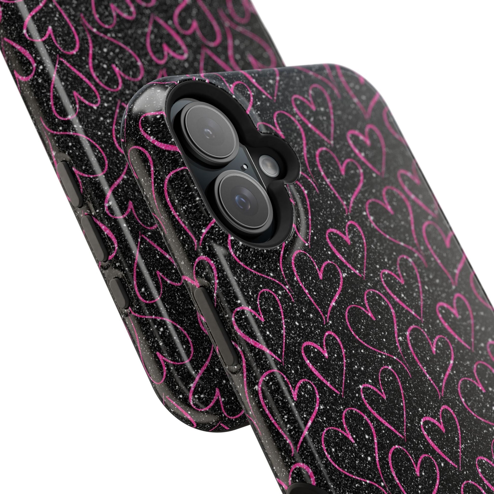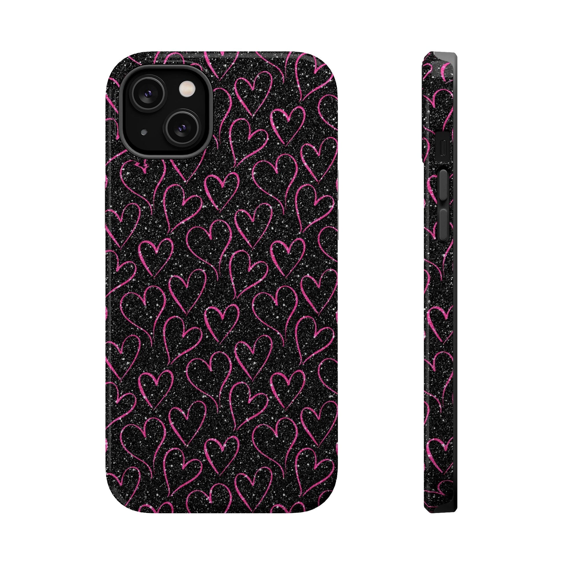 Sparkle and shine with our Sparkling Pink Hearts MagSafe iPhone Case! This dazzling design features a playful pattern of pink glitter hearts on a black background, creating a glamorous and romantic vibe. It's the perfect case for those who love to sparkle and shine. Crafted with a dual-layer design, combining a shock-absorbing TPU inner layer and a sturdy polycarbonate outer shell, this case provides reliable protection against everyday bumps and drops. With its slim and lightweight profile, this case is perfect for those who want to keep their phone stylish and protected without adding bulk.