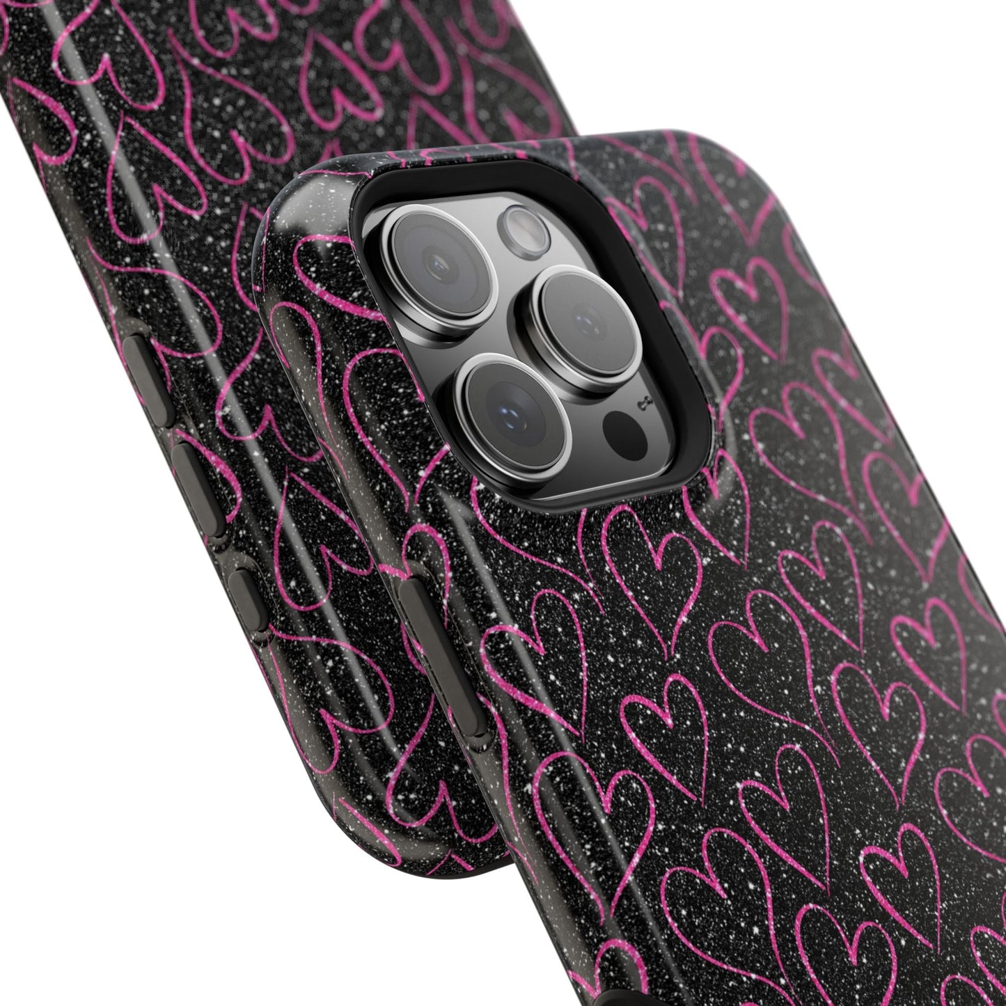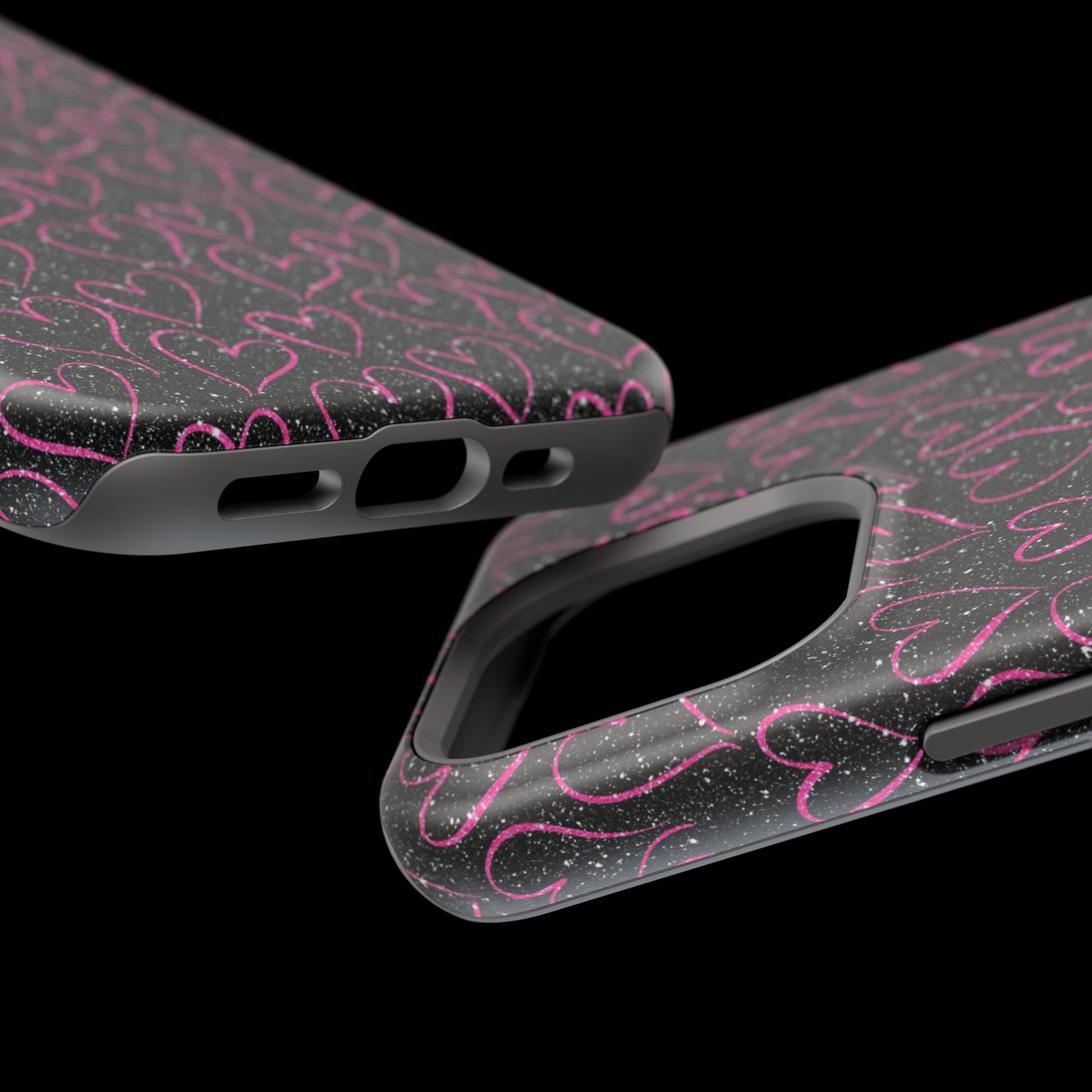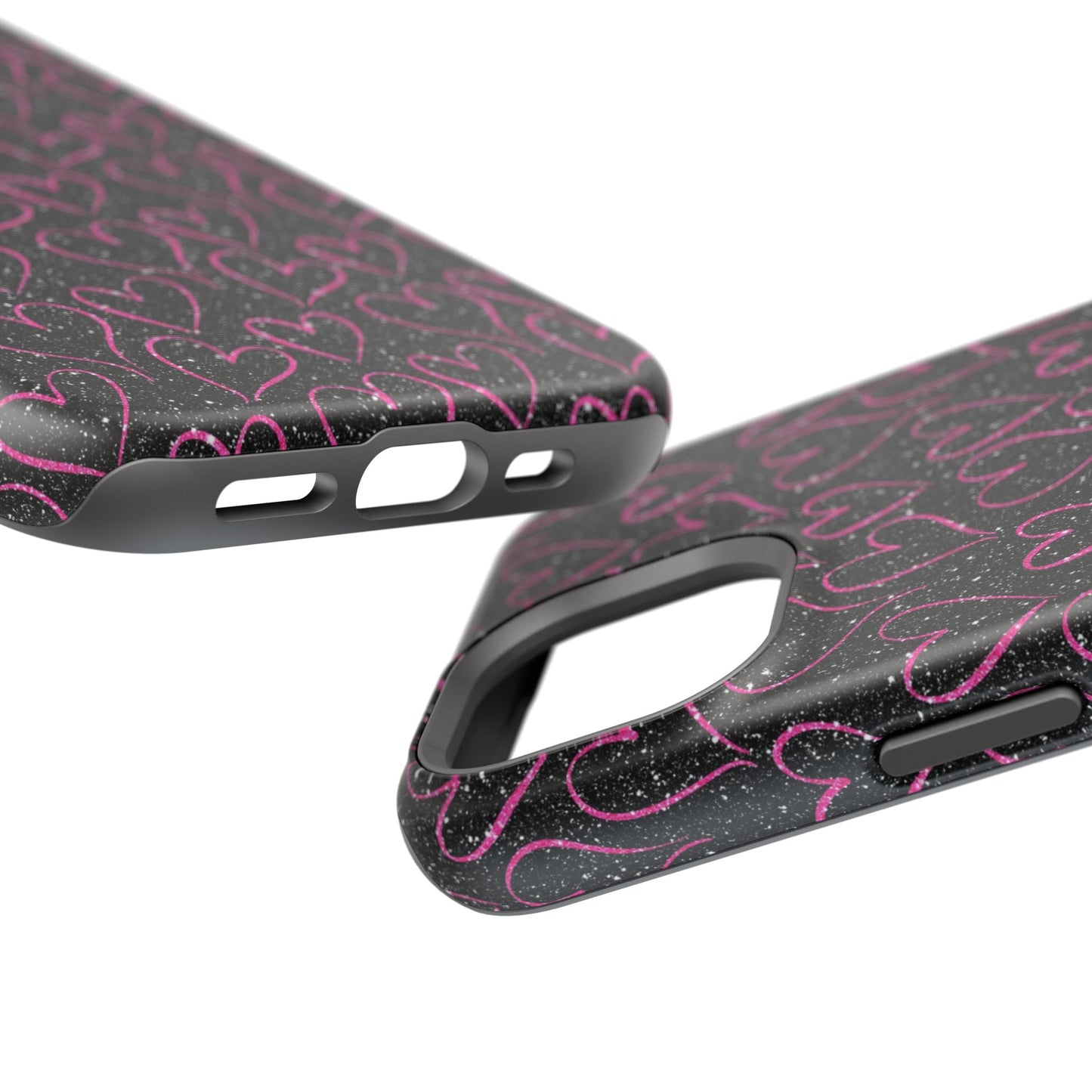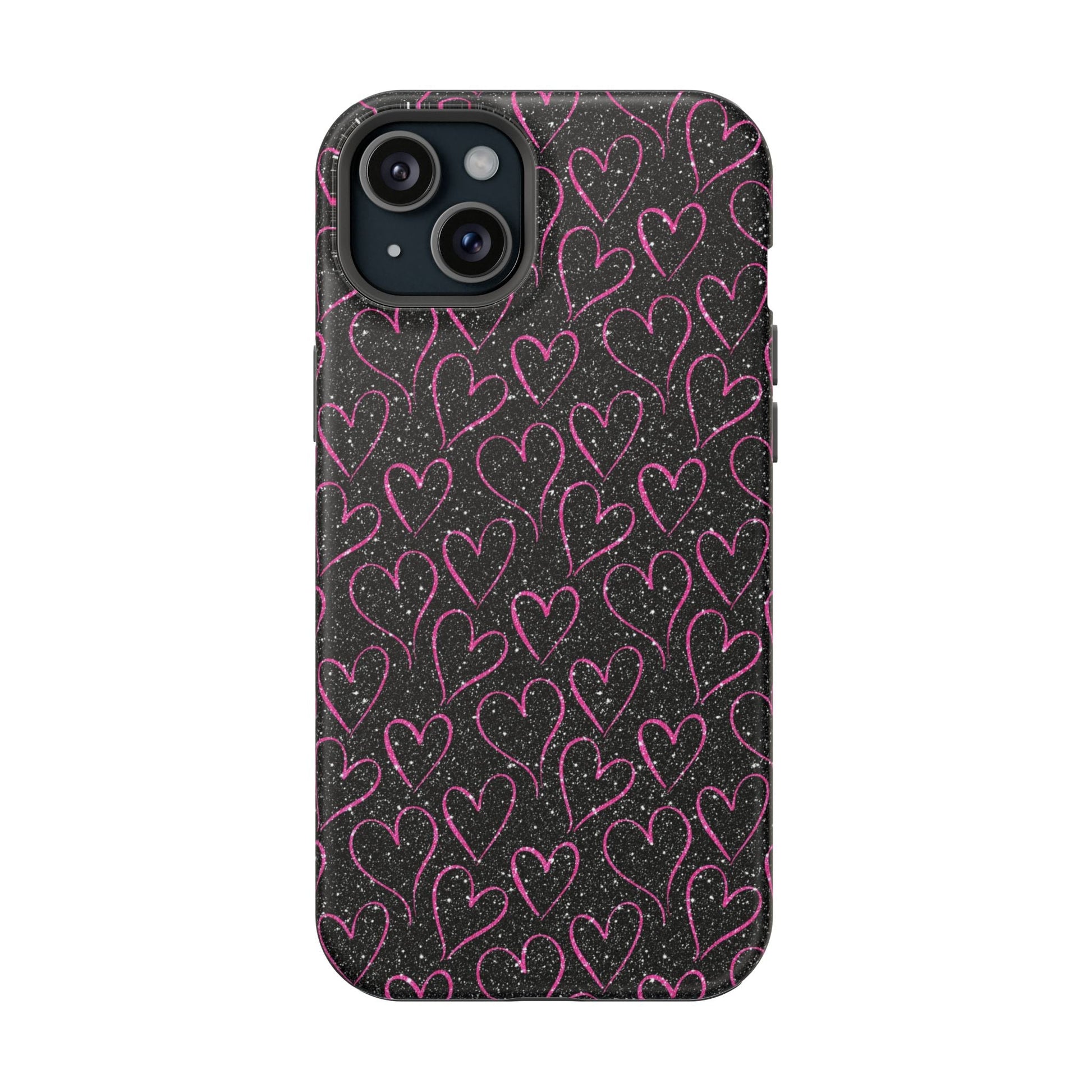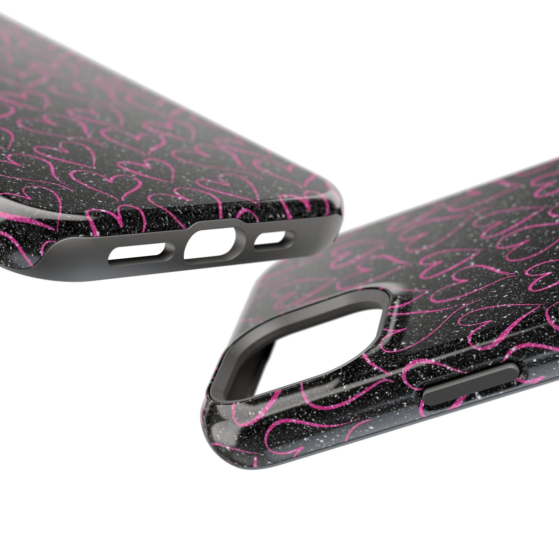 Sparkle and shine with our Sparkling Pink Hearts MagSafe iPhone Case! This dazzling design features a playful pattern of pink glitter hearts on a black background, creating a glamorous and romantic vibe. It's the perfect case for those who love to sparkle and shine. Crafted with a dual-layer design, combining a shock-absorbing TPU inner layer and a sturdy polycarbonate outer shell, this case provides reliable protection against everyday bumps and drops. With its slim and lightweight profile, this case is perfect for those who want to keep their phone stylish and protected without adding bulk.