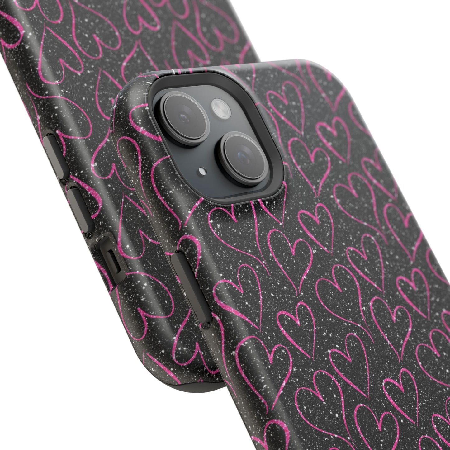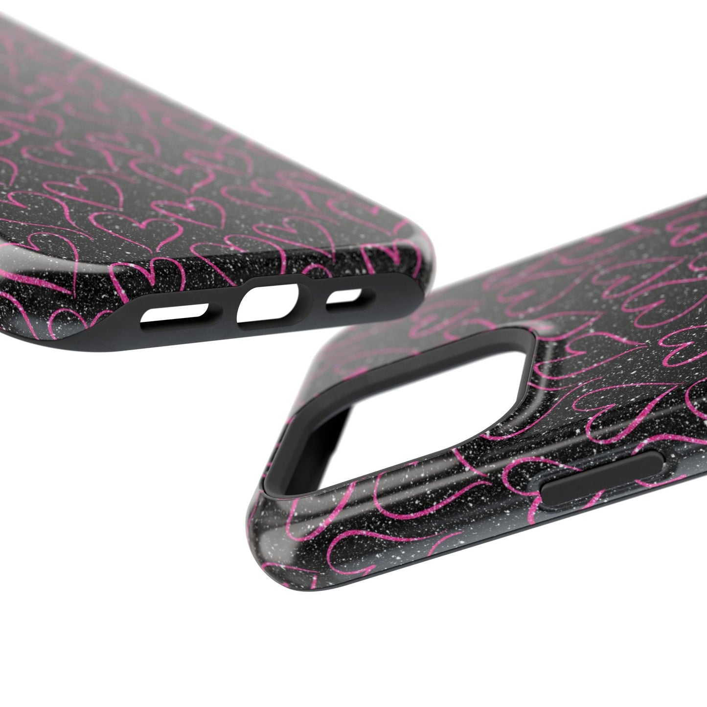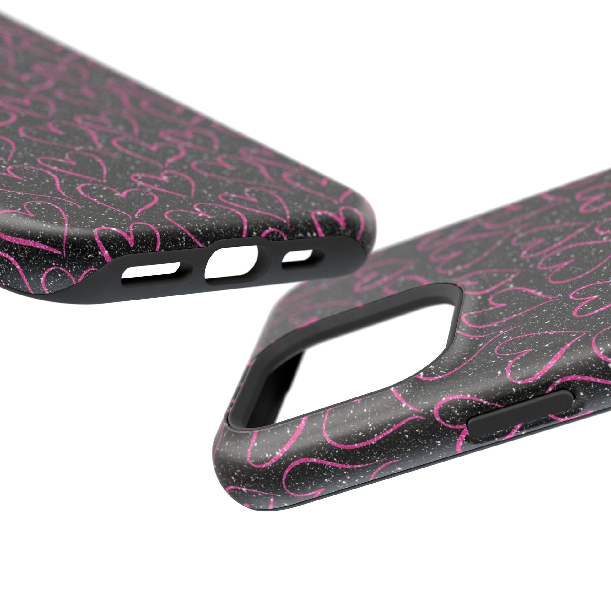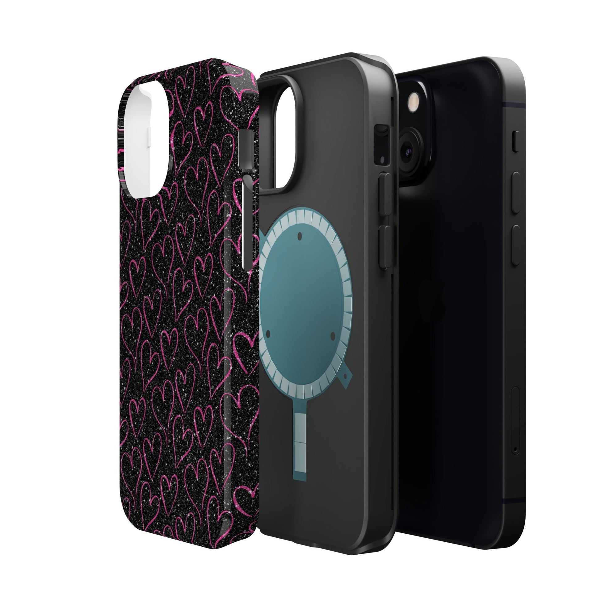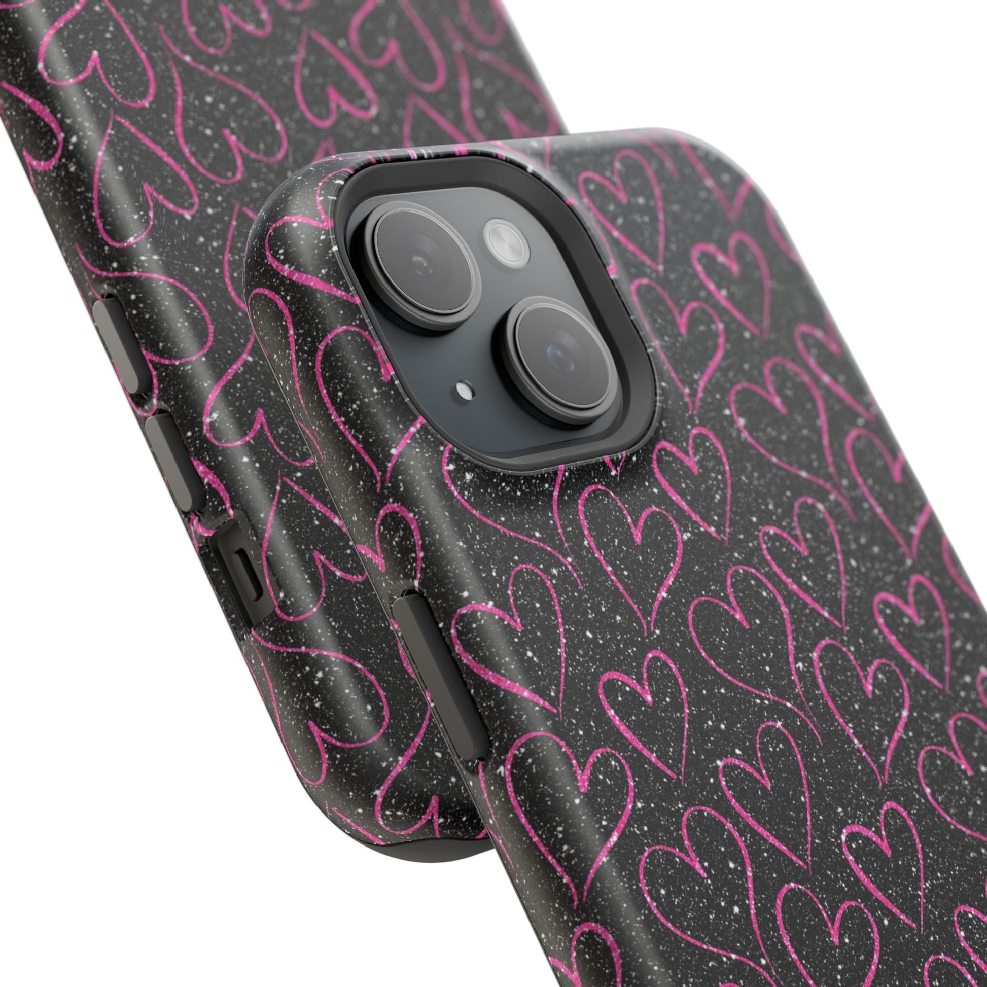 Sparkle and shine with our Sparkling Pink Hearts MagSafe iPhone Case! This dazzling design features a playful pattern of pink glitter hearts on a black background, creating a glamorous and romantic vibe. It's the perfect case for those who love to sparkle and shine. Crafted with a dual-layer design, combining a shock-absorbing TPU inner layer and a sturdy polycarbonate outer shell, this case provides reliable protection against everyday bumps and drops. With its slim and lightweight profile, this case is perfect for those who want to keep their phone stylish and protected without adding bulk.