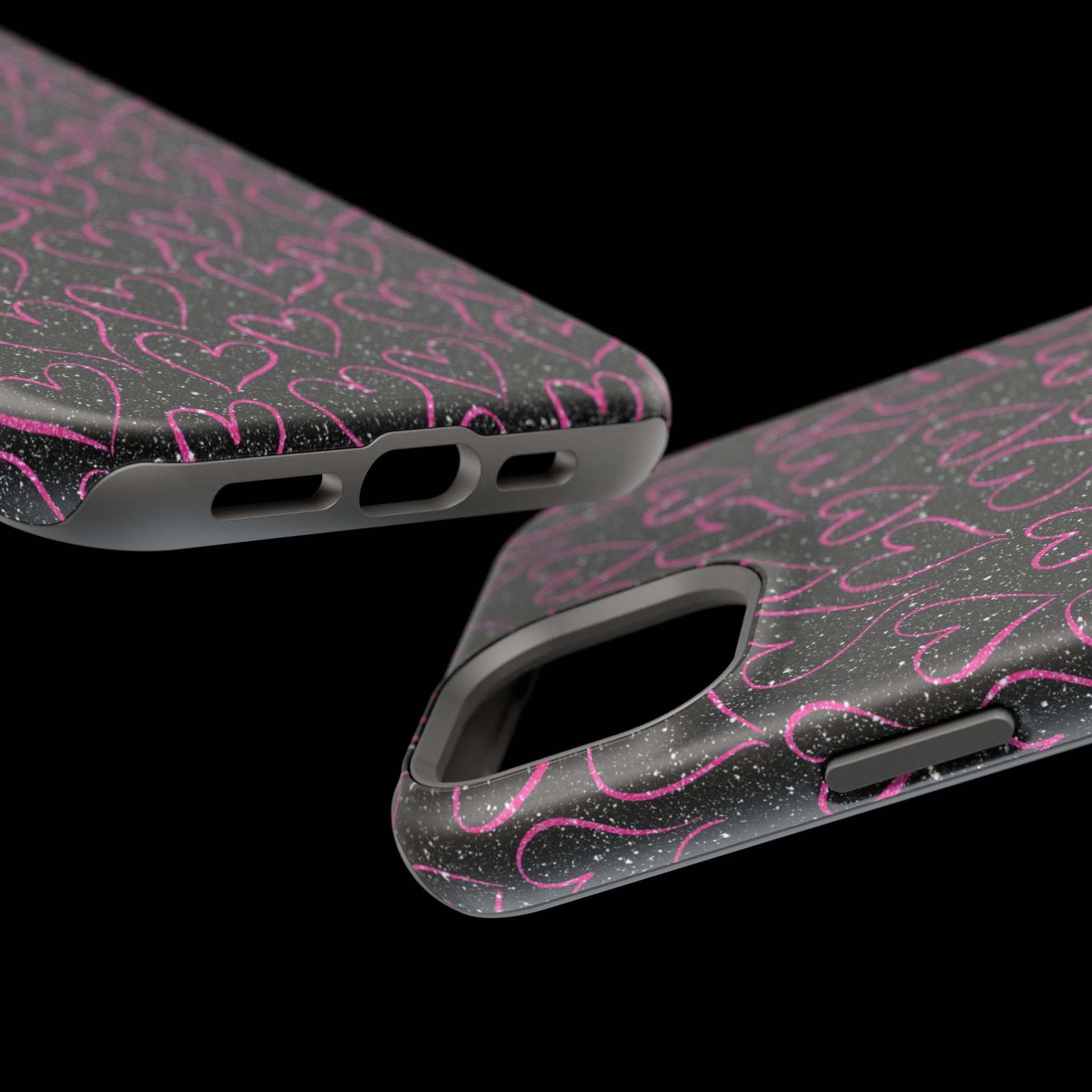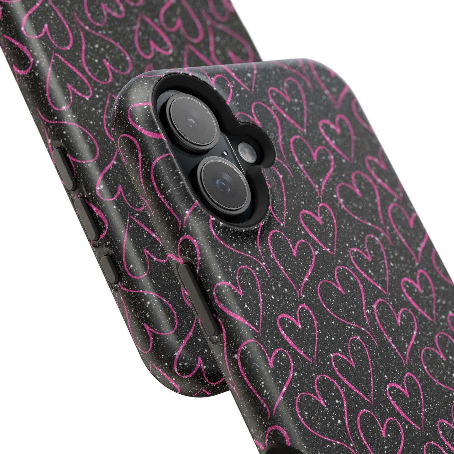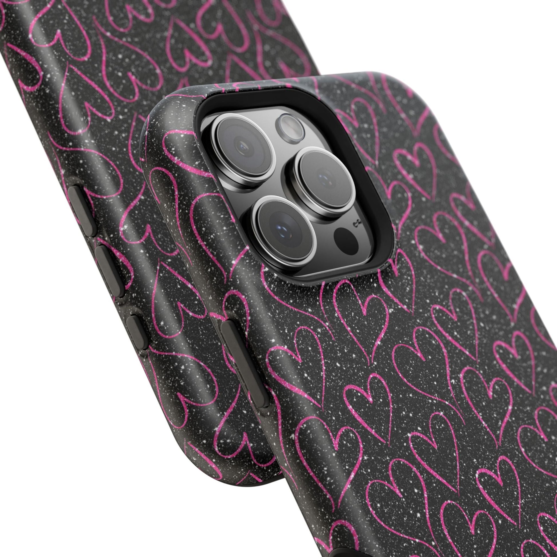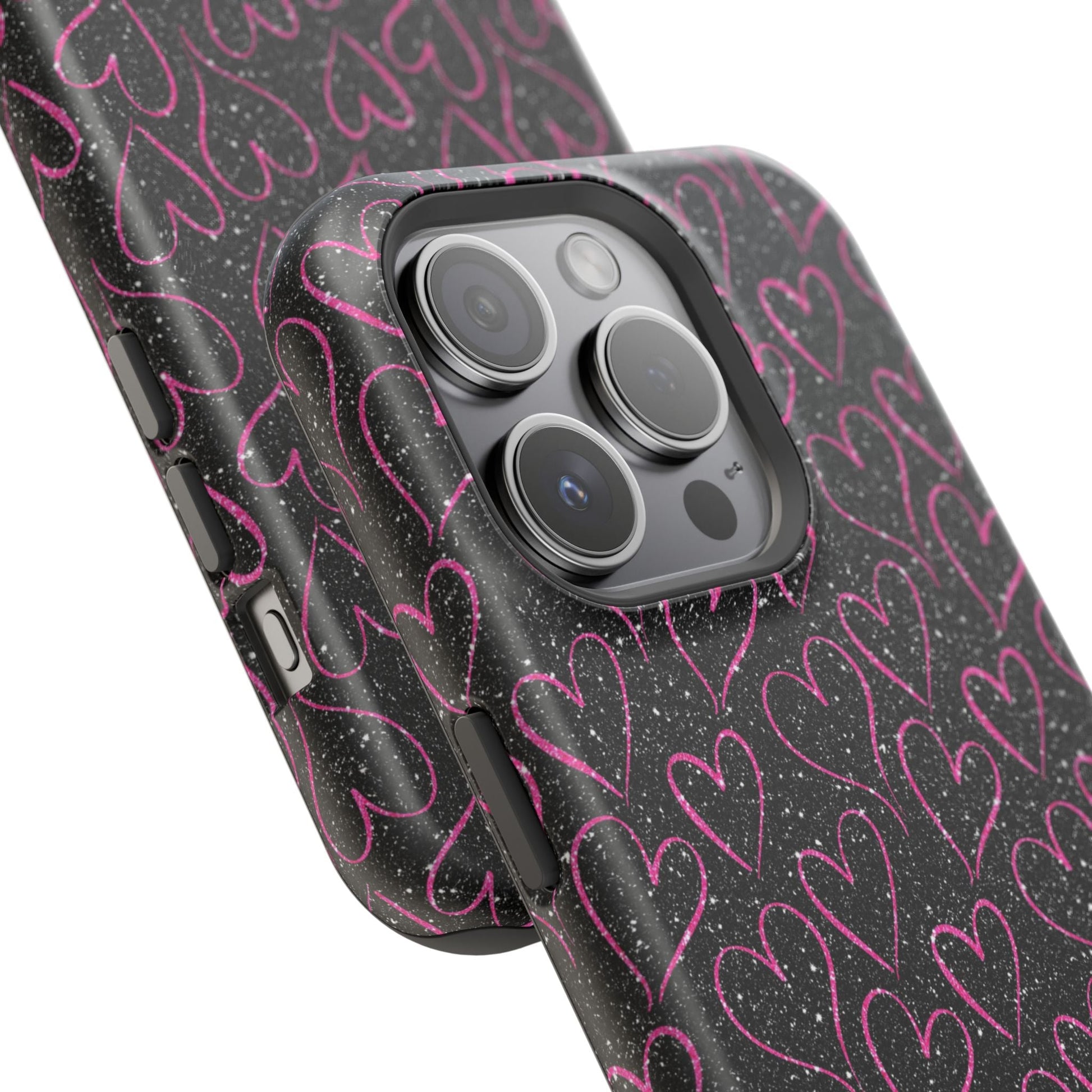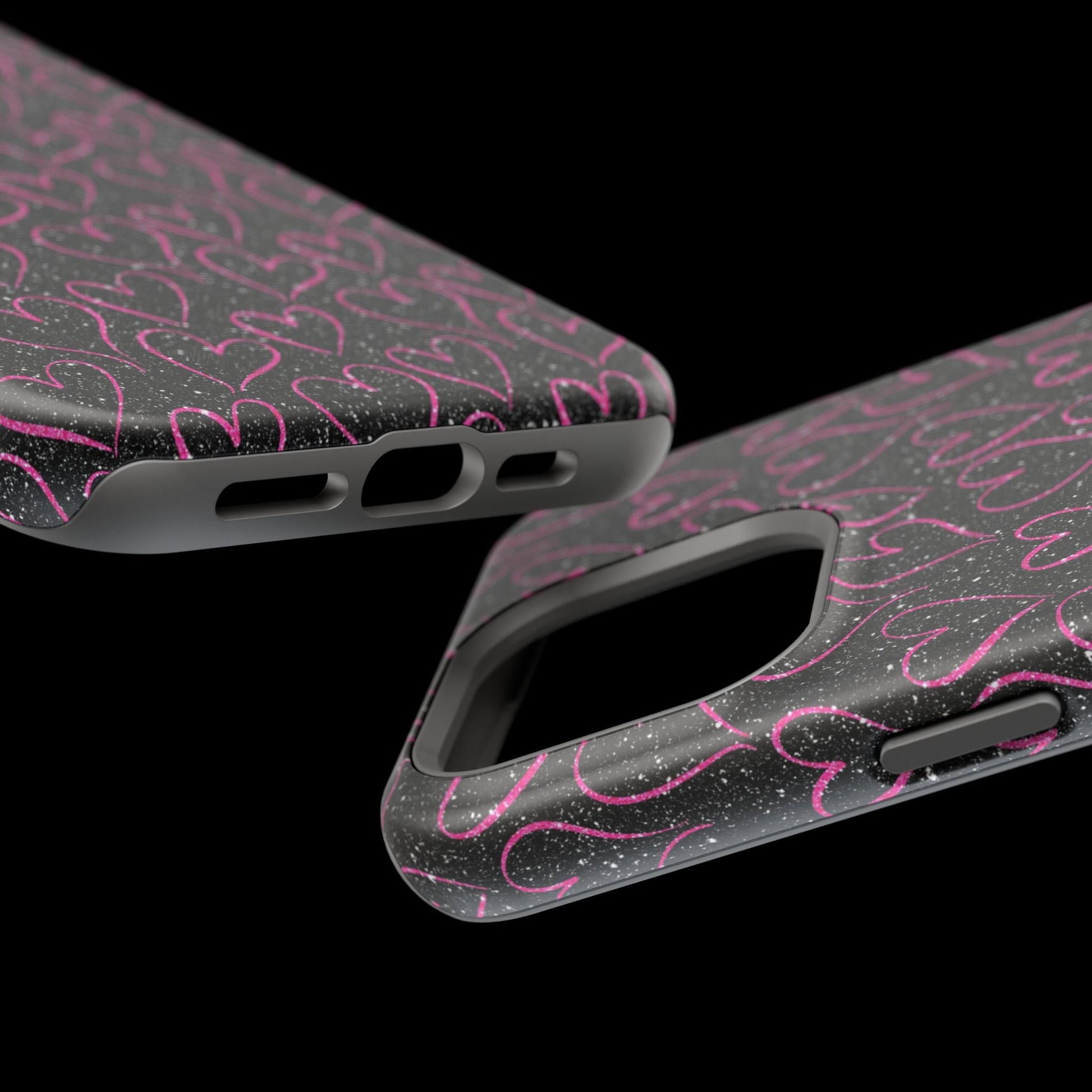 Sparkle and shine with our Sparkling Pink Hearts MagSafe iPhone Case! This dazzling design features a playful pattern of pink glitter hearts on a black background, creating a glamorous and romantic vibe. It's the perfect case for those who love to sparkle and shine. Crafted with a dual-layer design, combining a shock-absorbing TPU inner layer and a sturdy polycarbonate outer shell, this case provides reliable protection against everyday bumps and drops. With its slim and lightweight profile, this case is perfect for those who want to keep their phone stylish and protected without adding bulk.