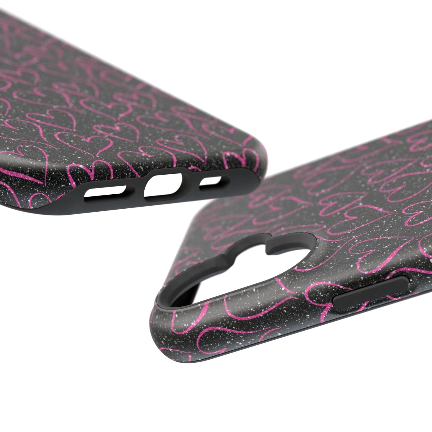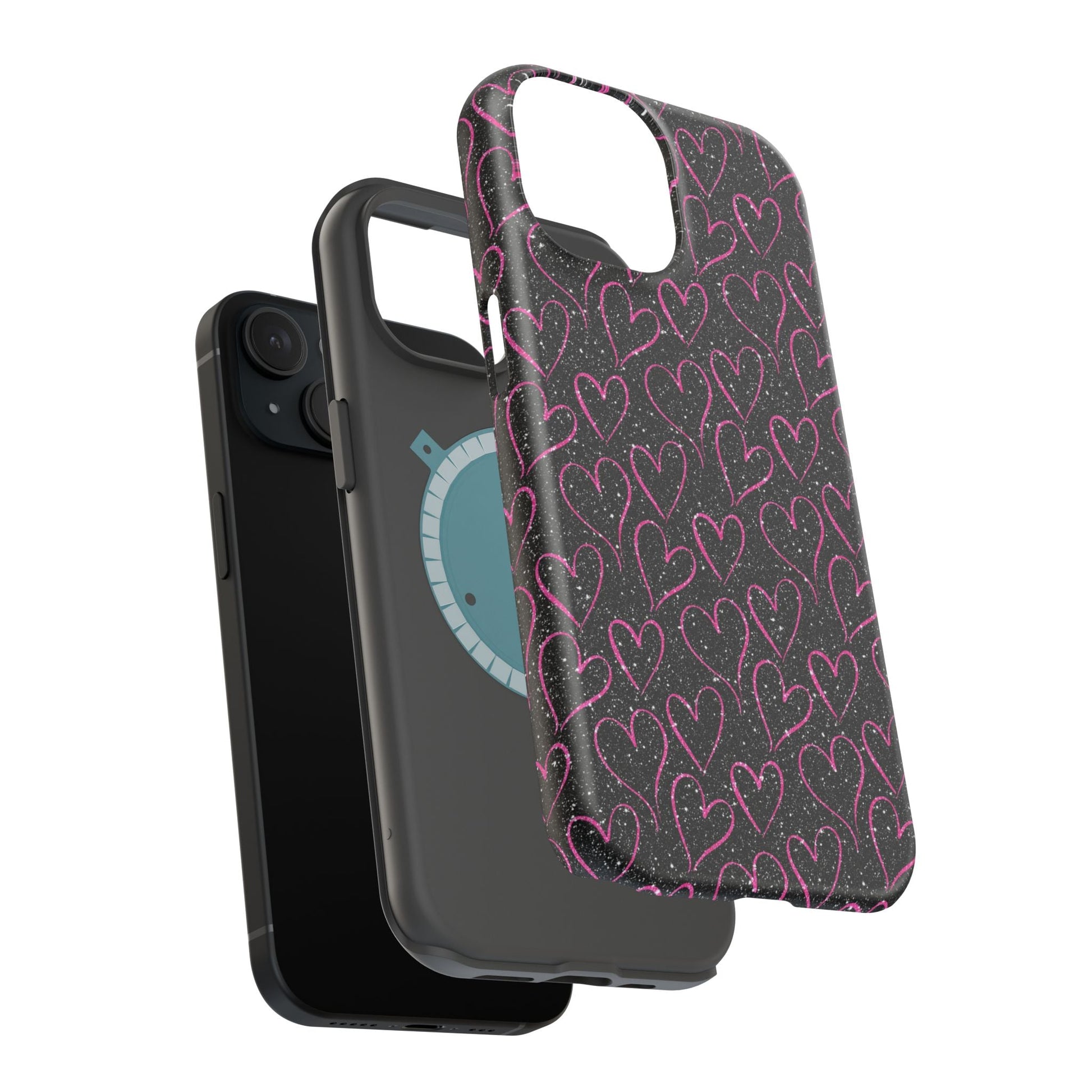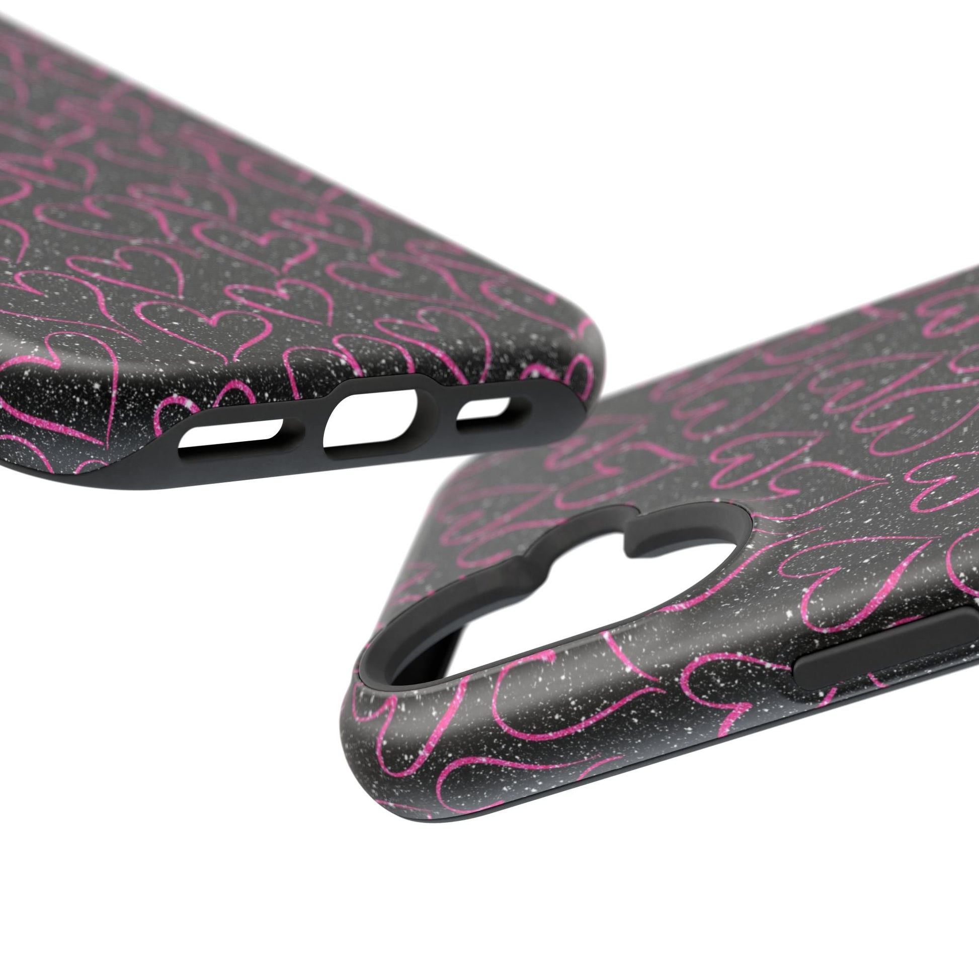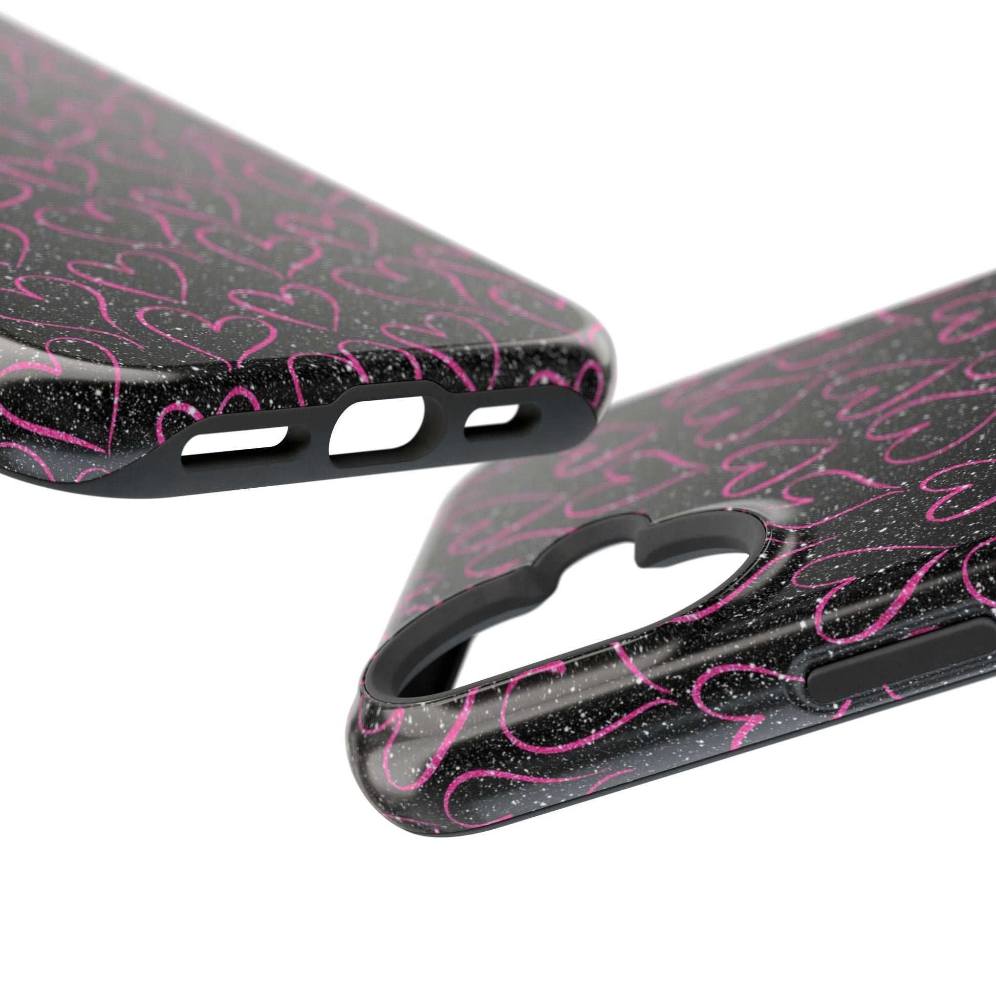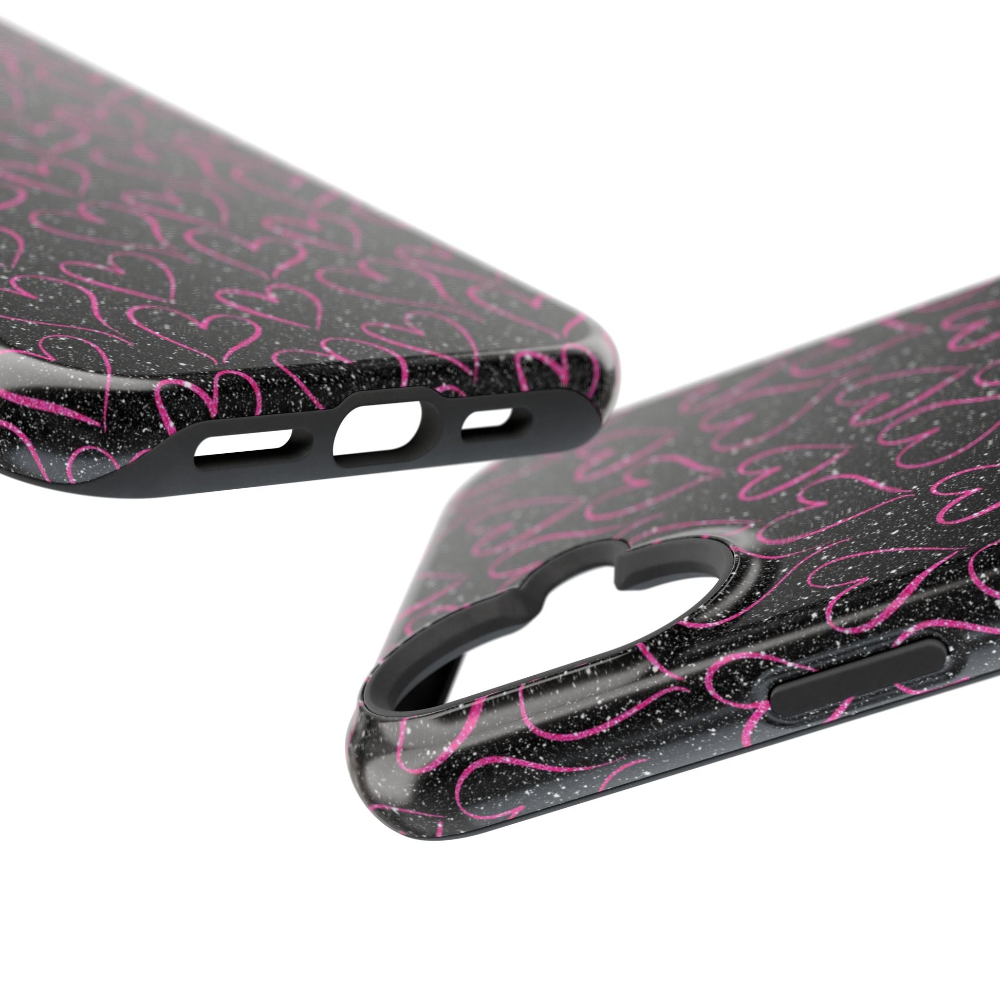 Sparkle and shine with our Sparkling Pink Hearts MagSafe iPhone Case! This dazzling design features a playful pattern of pink glitter hearts on a black background, creating a glamorous and romantic vibe. It's the perfect case for those who love to sparkle and shine. Crafted with a dual-layer design, combining a shock-absorbing TPU inner layer and a sturdy polycarbonate outer shell, this case provides reliable protection against everyday bumps and drops. With its slim and lightweight profile, this case is perfect for those who want to keep their phone stylish and protected without adding bulk.