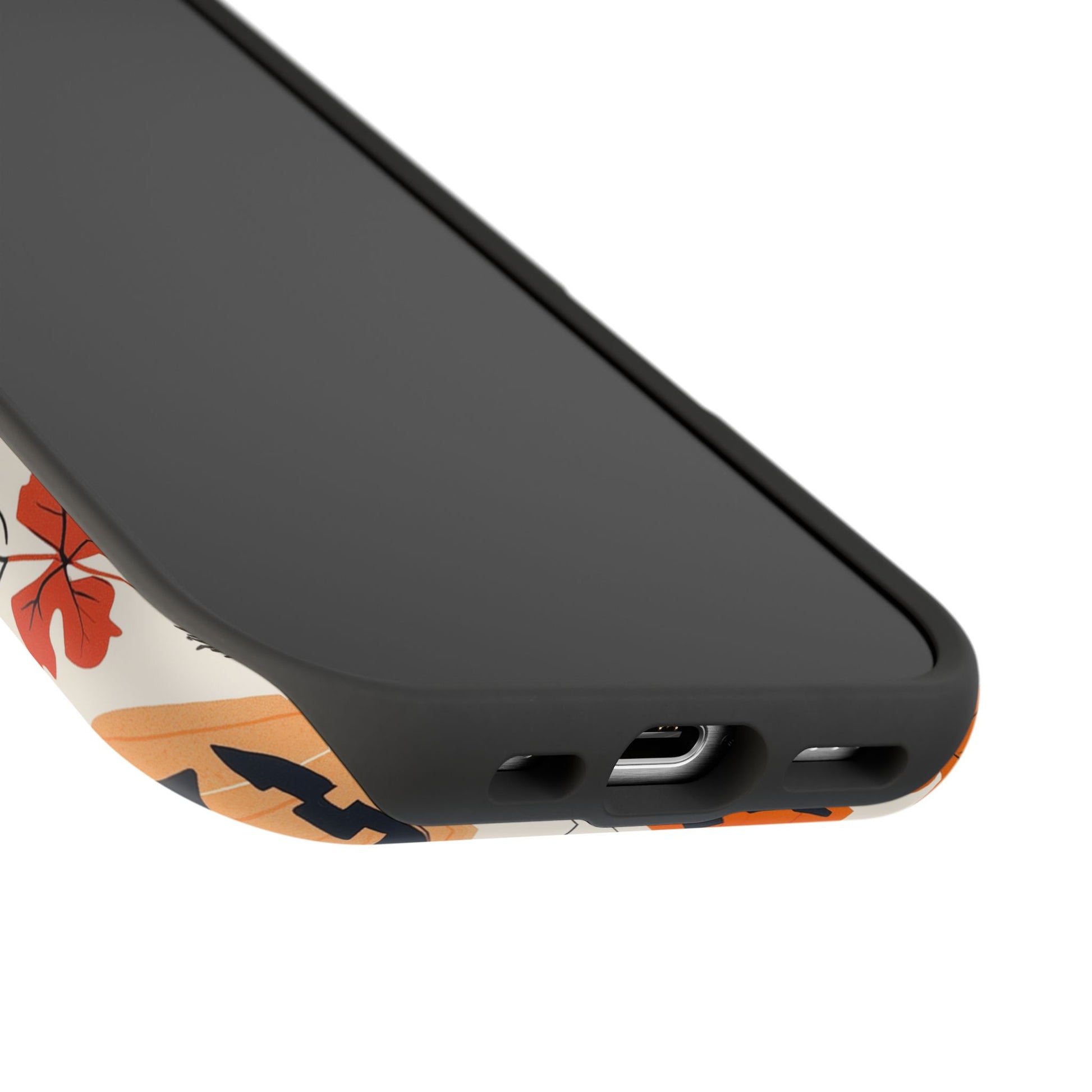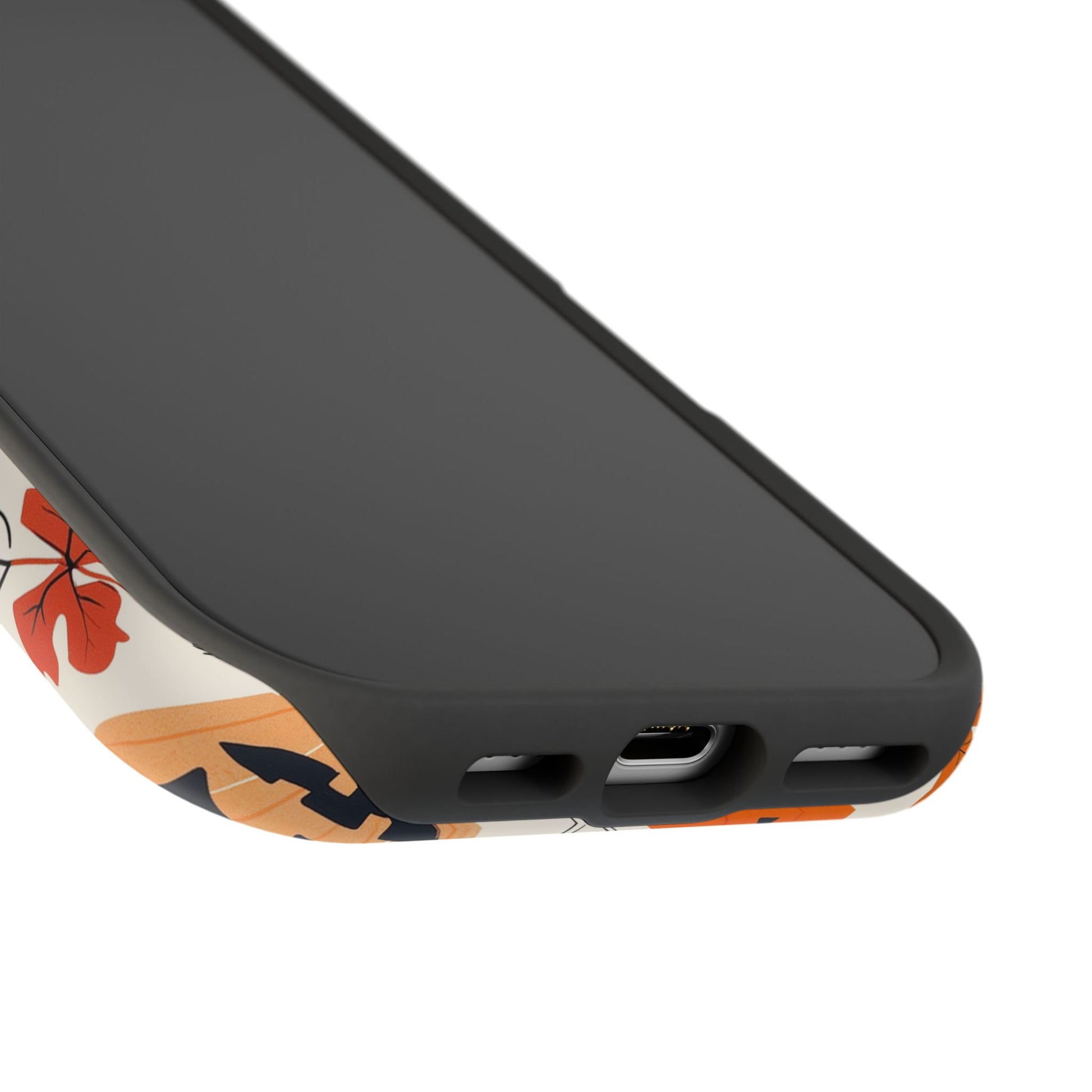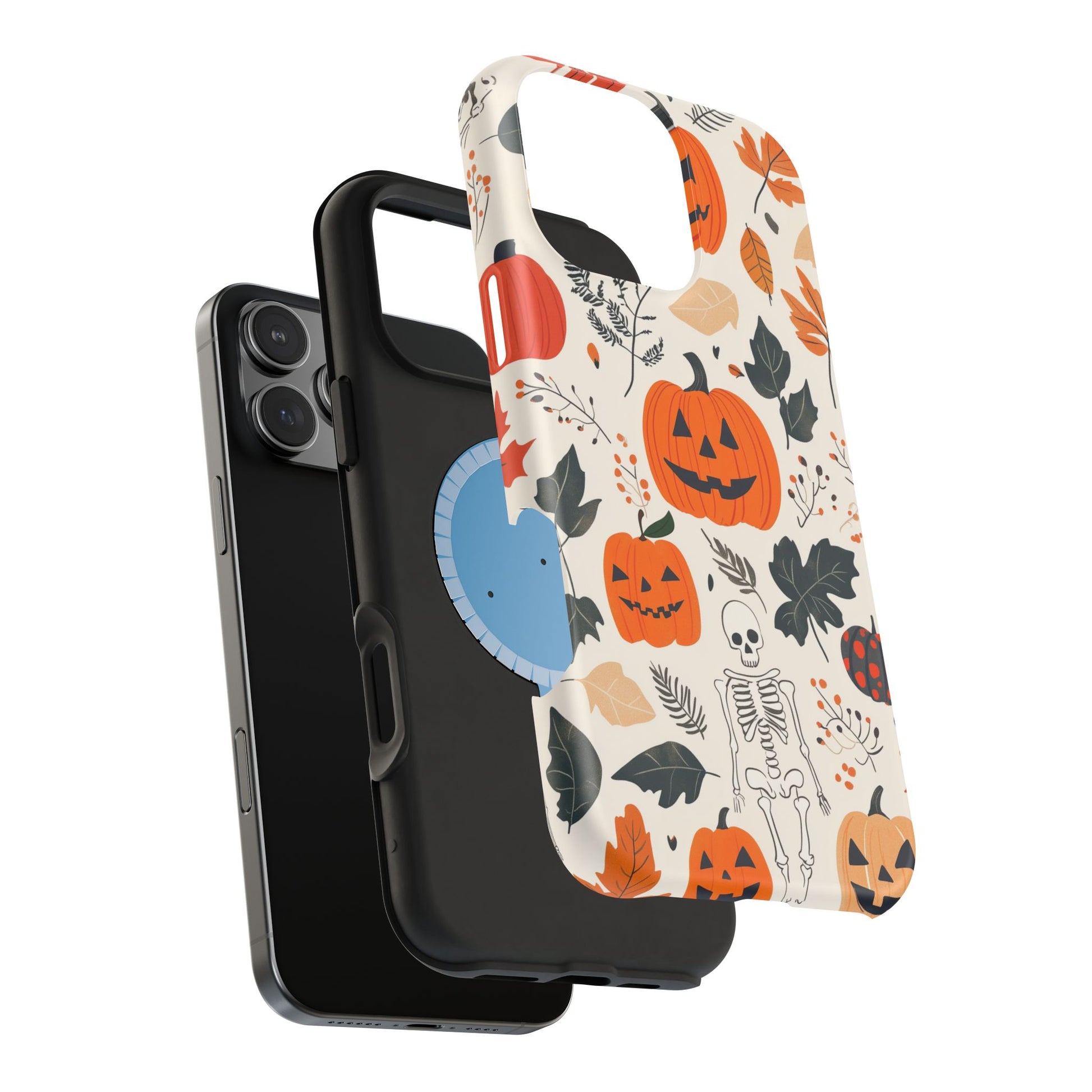 Celebrate Halloween with our Spooky Pumpkin & Skeleton MagSafe  iPhone Case. This case features an array of classic Halloween symbols, including jack-o'-lanterns, skeletons, and autumn leaves, perfect for adding a seasonal touch to your device.