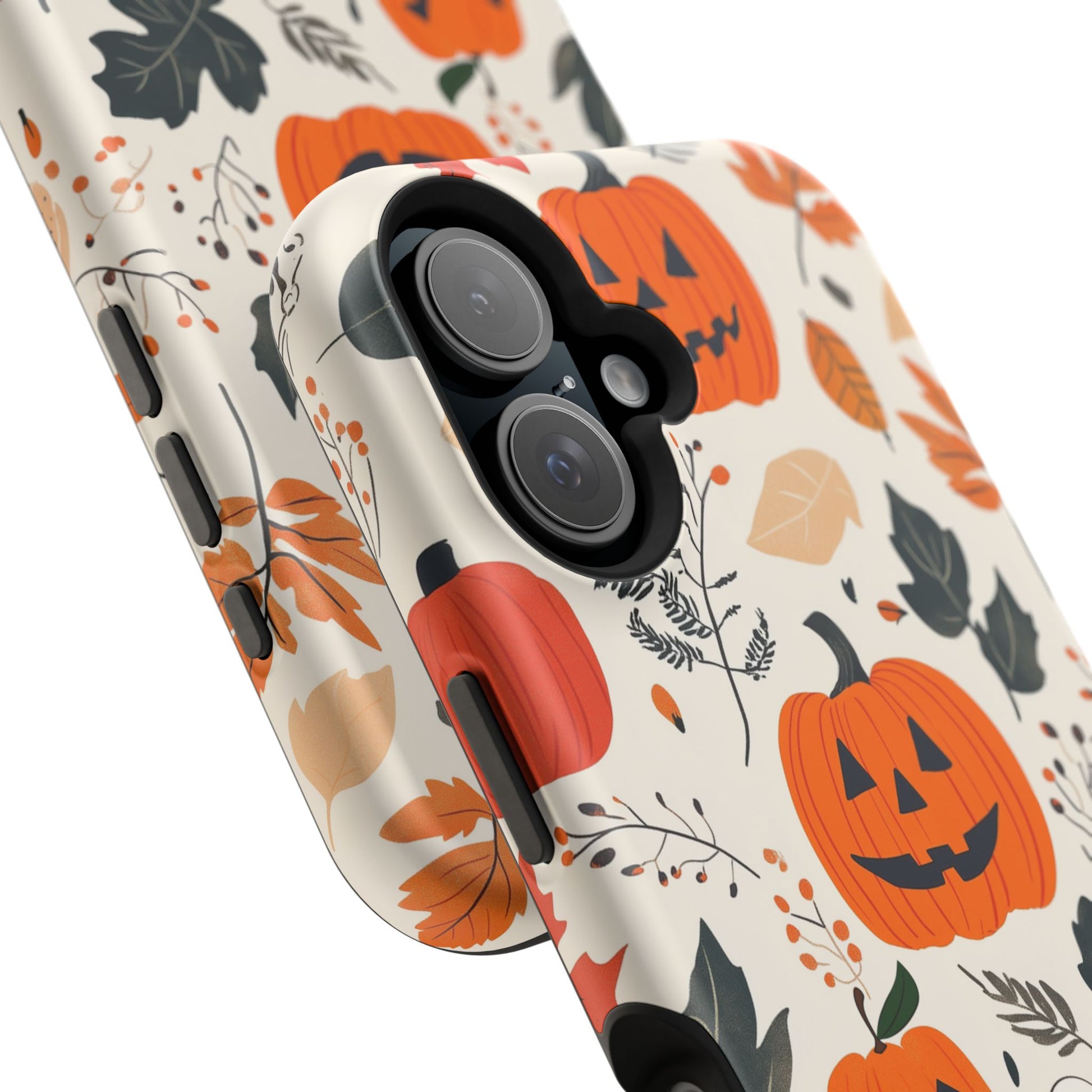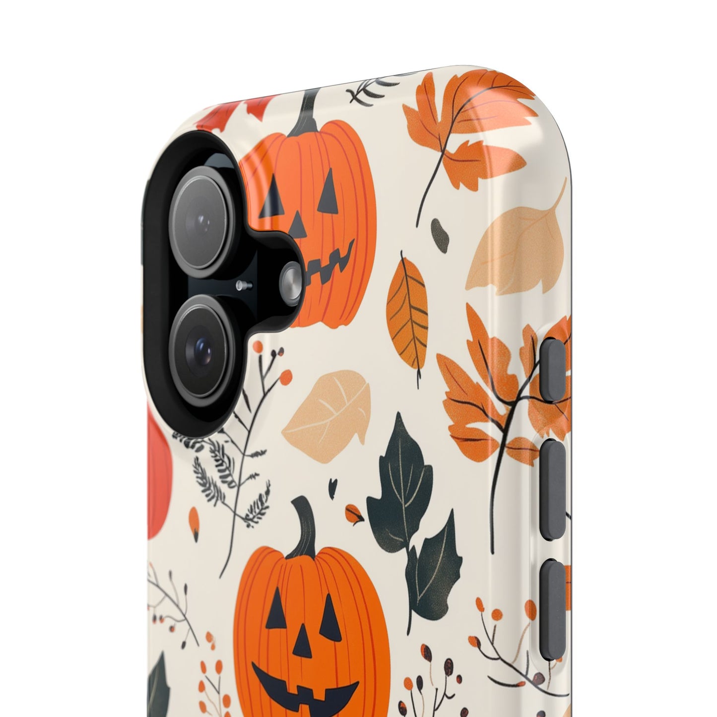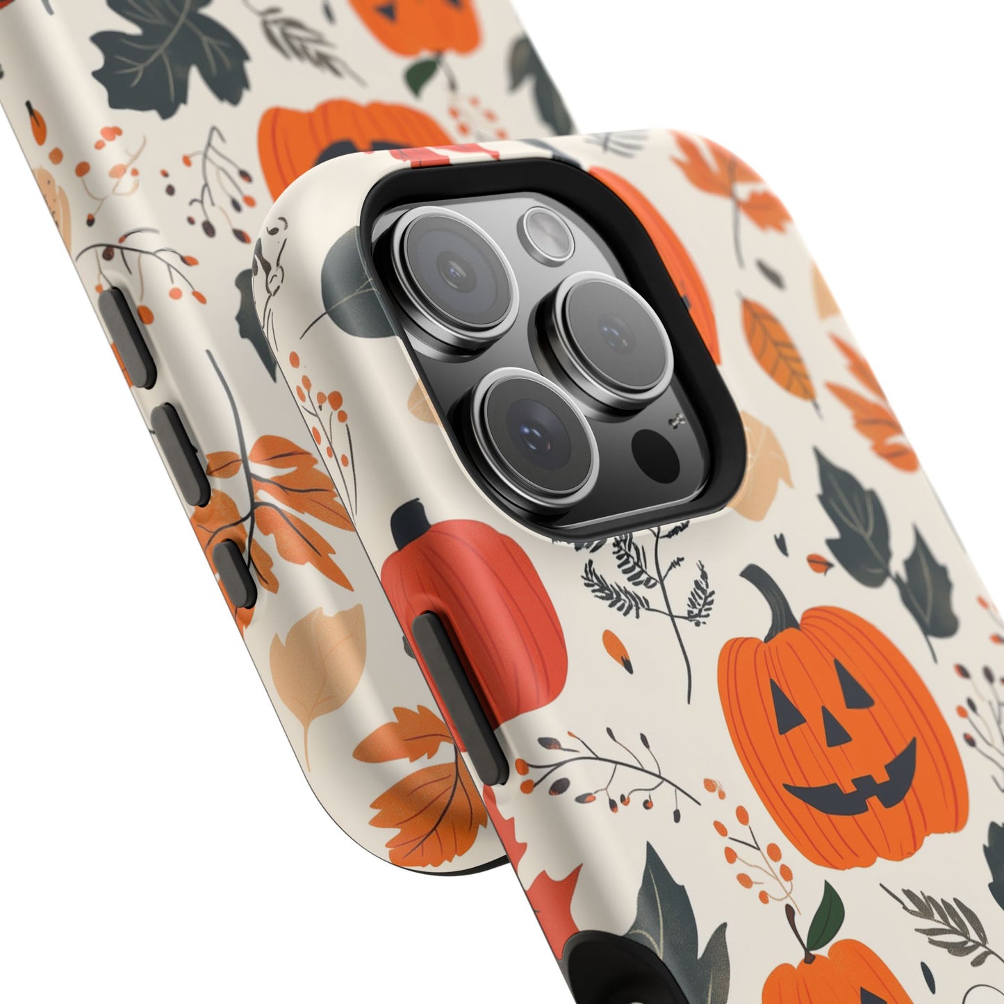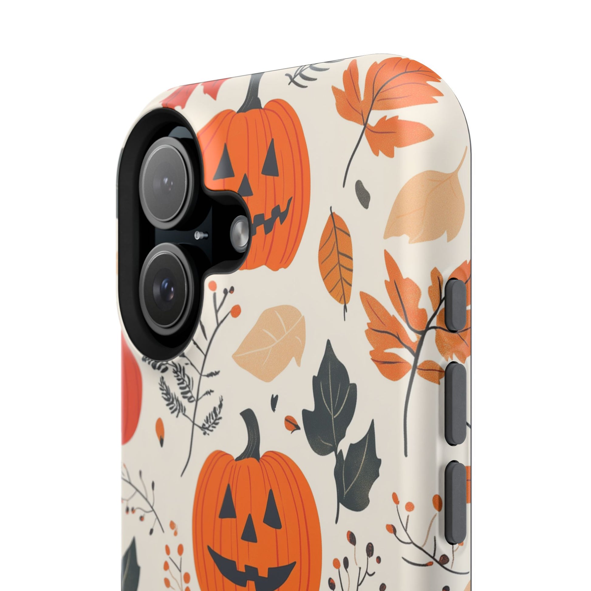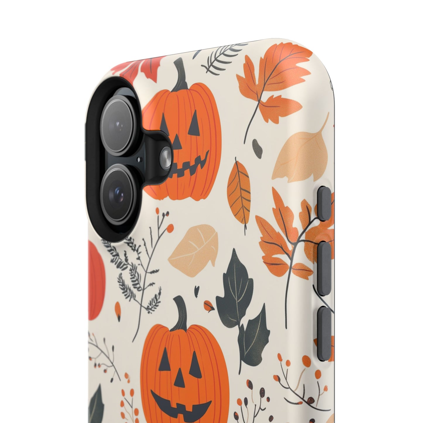 Celebrate Halloween with our Spooky Pumpkin & Skeleton MagSafe  iPhone Case. This case features an array of classic Halloween symbols, including jack-o'-lanterns, skeletons, and autumn leaves, perfect for adding a seasonal touch to your de...
