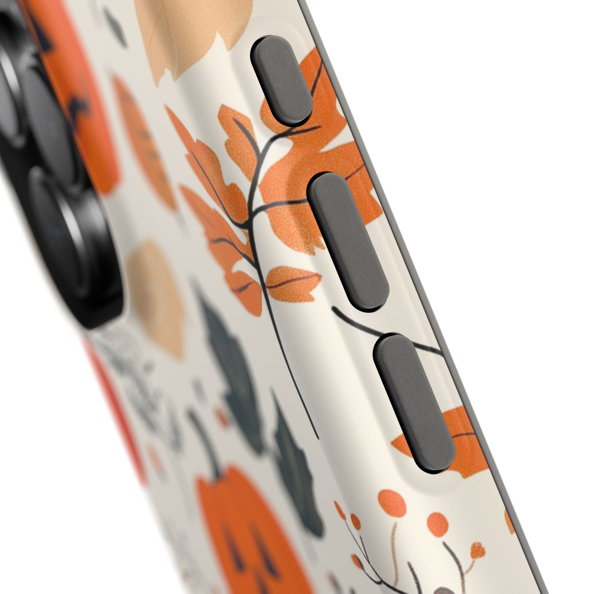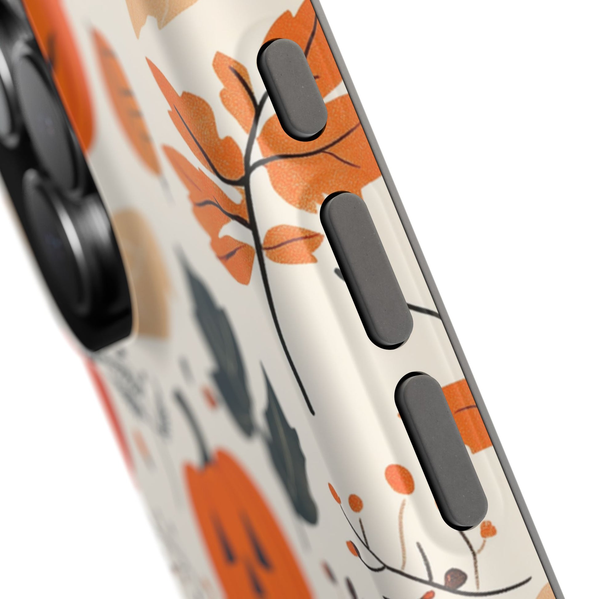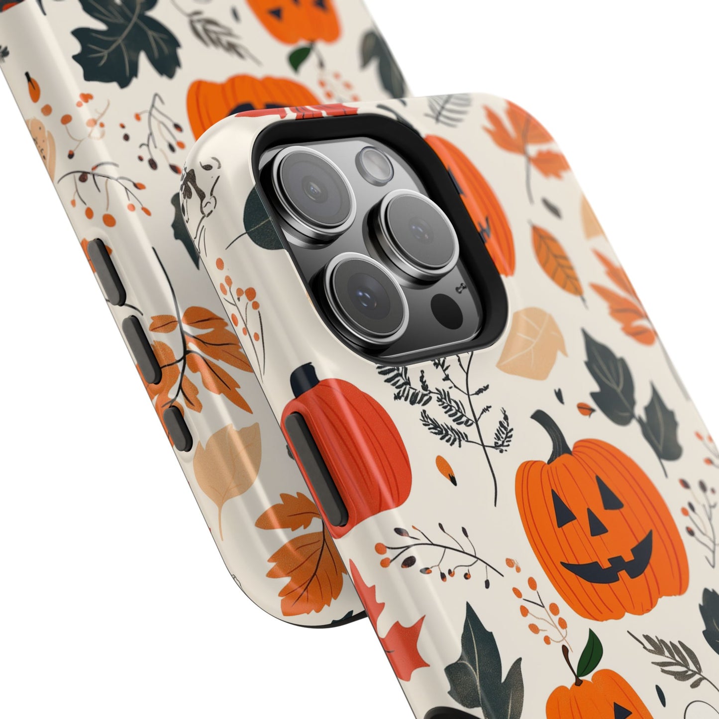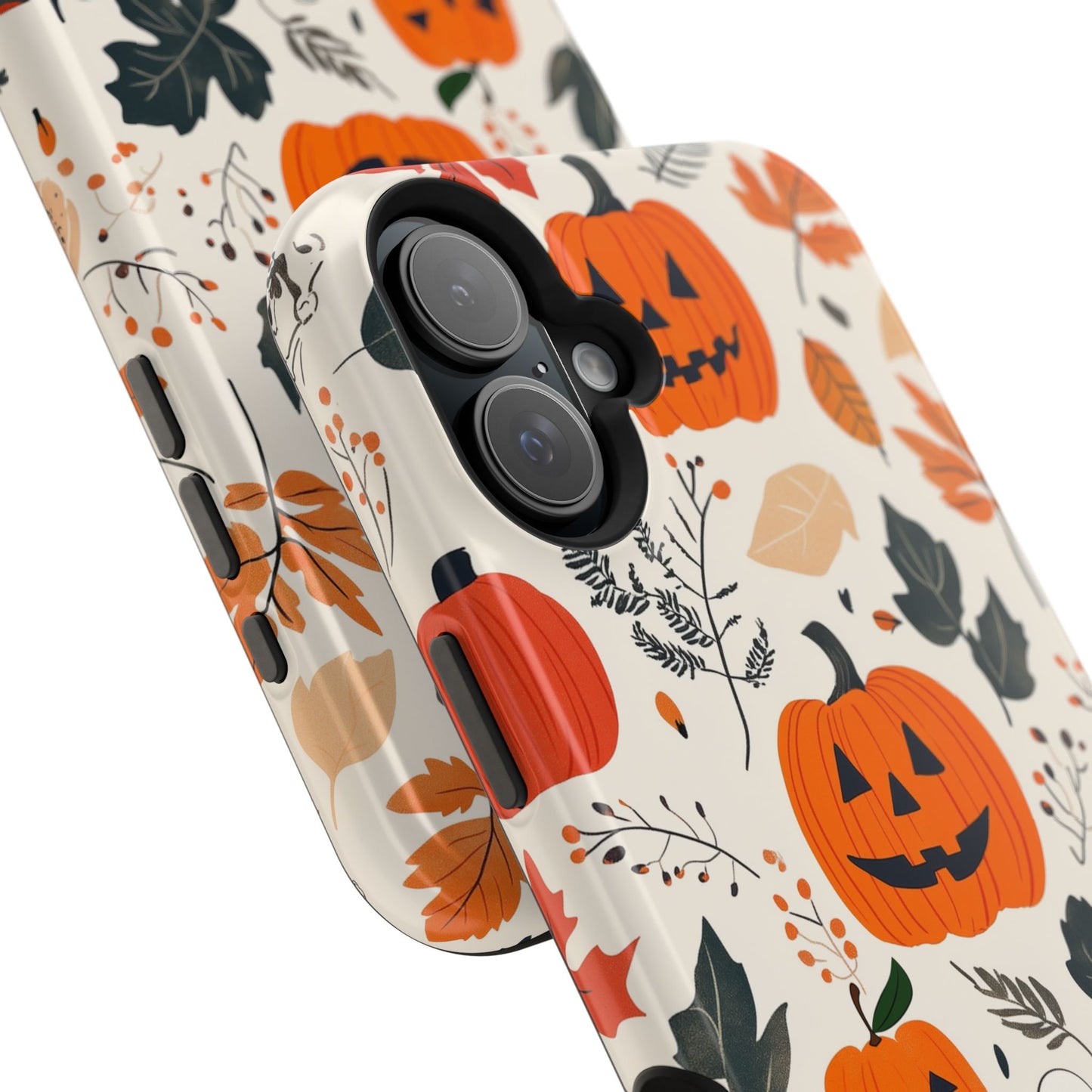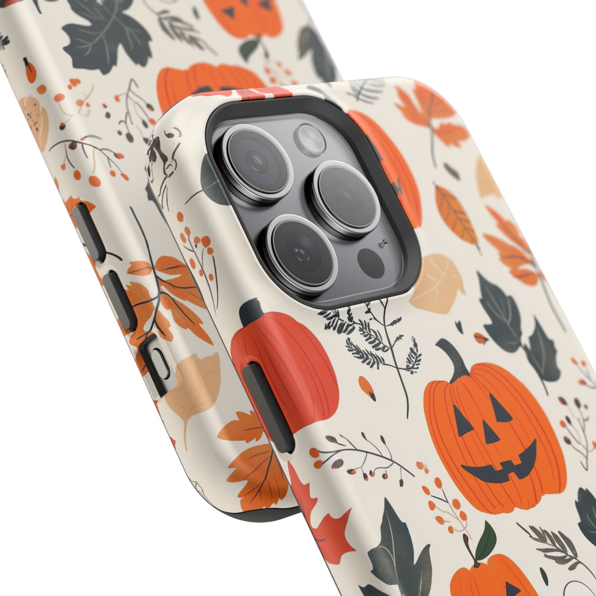 Celebrate Halloween with our Spooky Pumpkin & Skeleton MagSafe  iPhone Case. This case features an array of classic Halloween symbols, including jack-o'-lanterns, skeletons, and autumn leaves, perfect for adding a seasonal touch to your de...