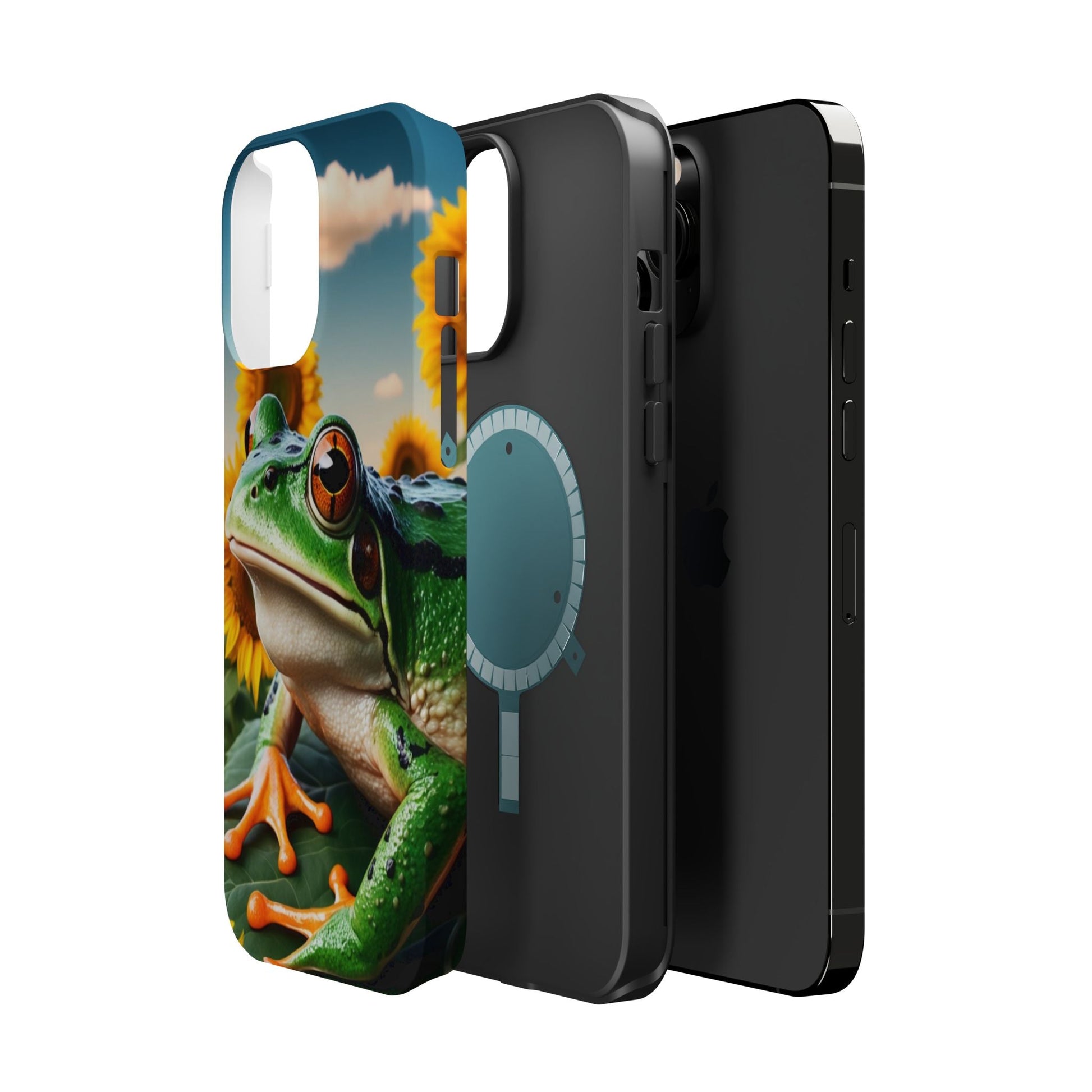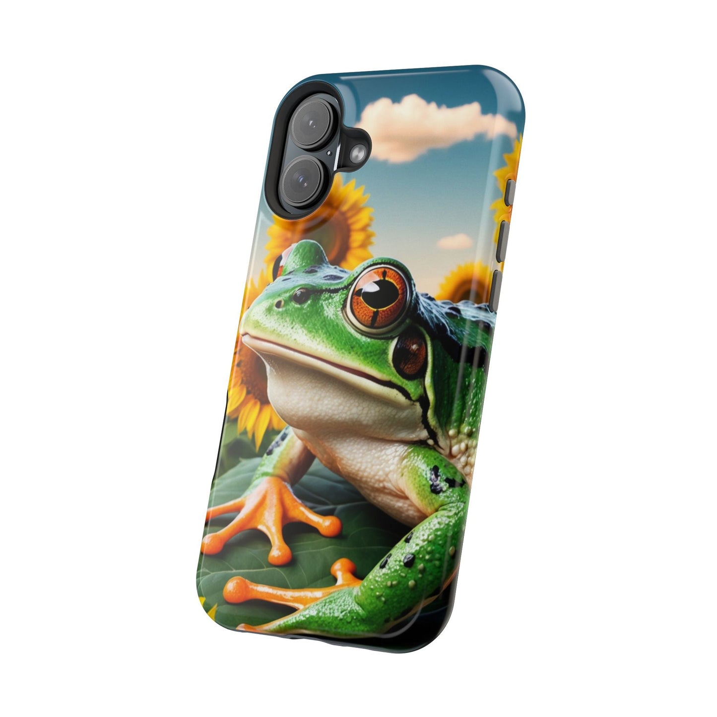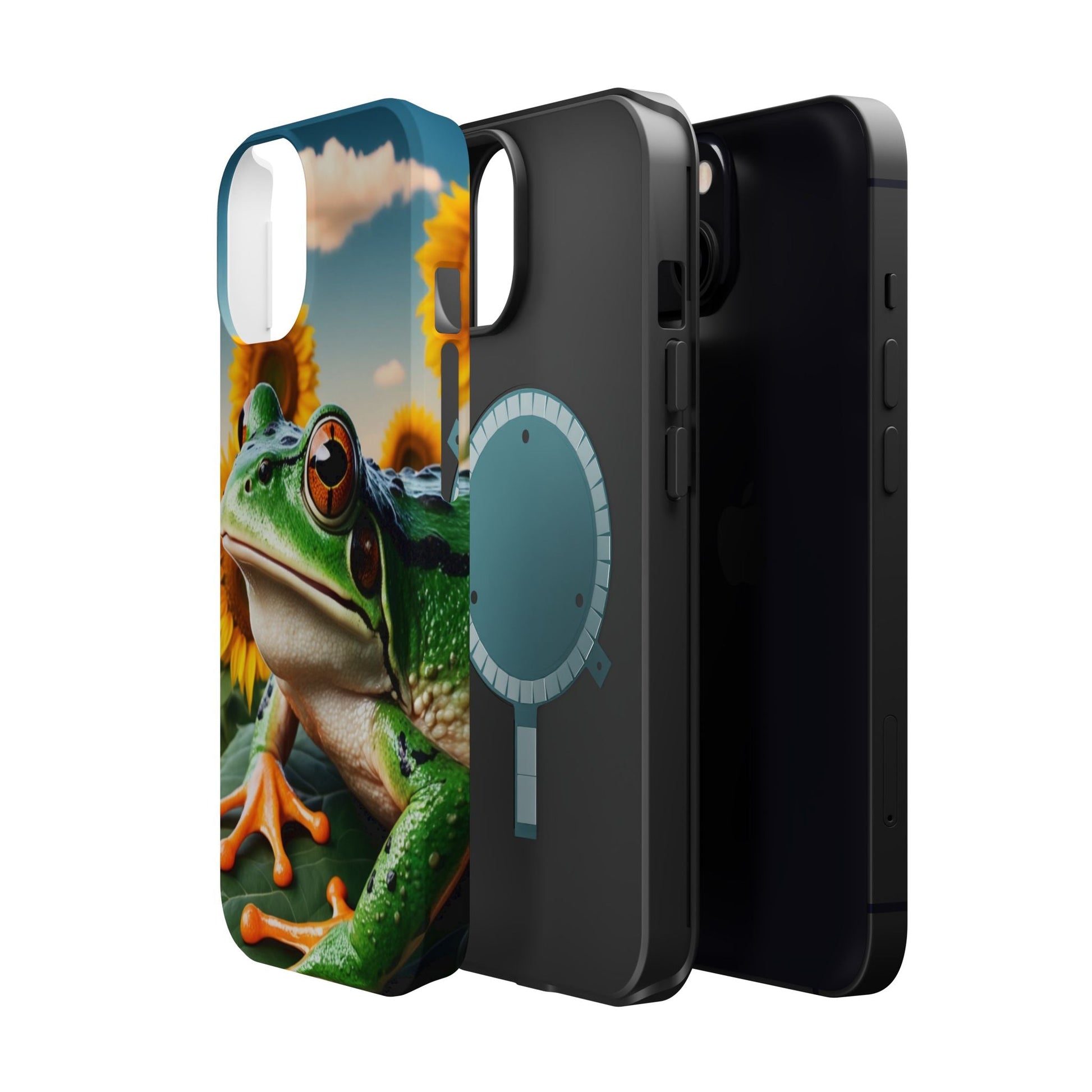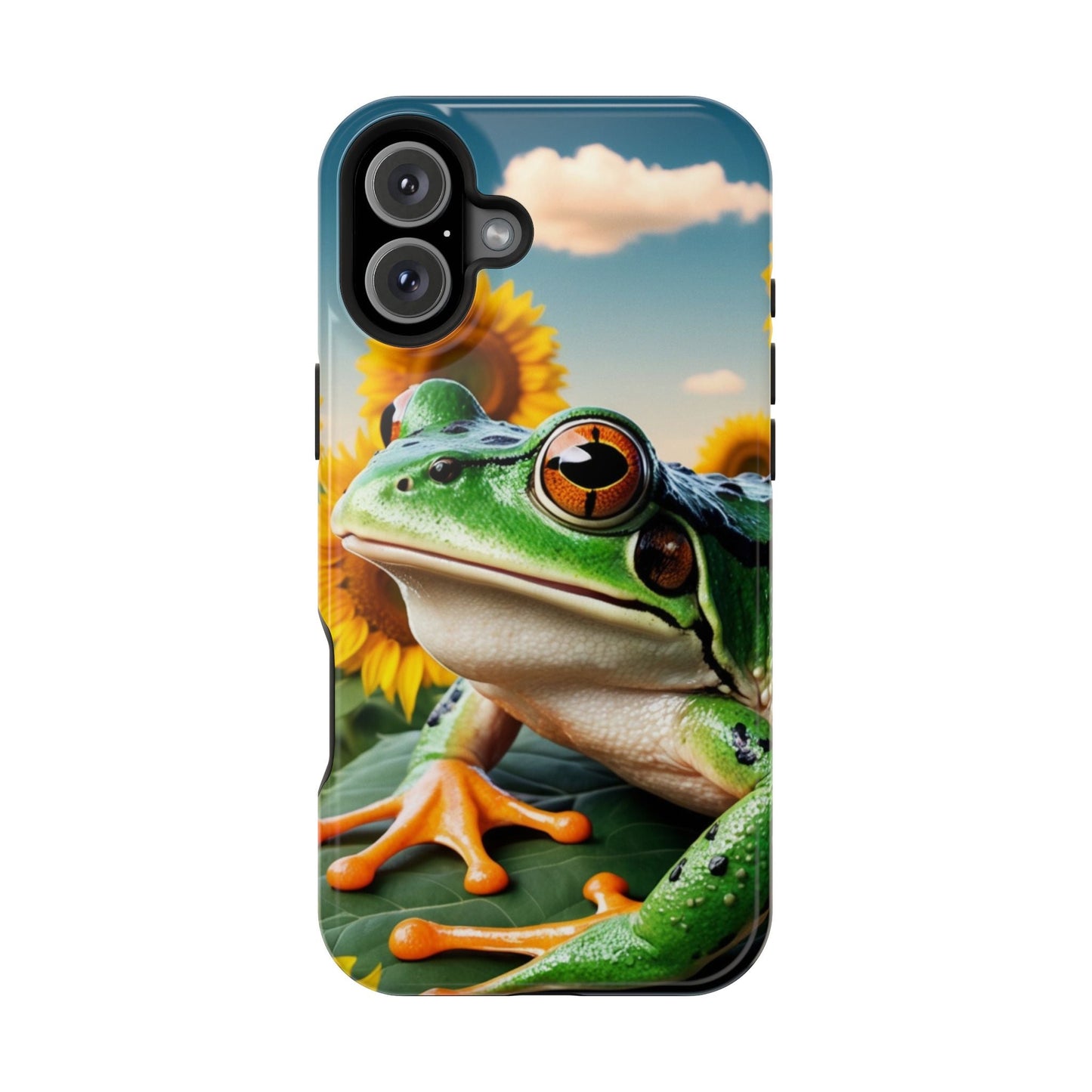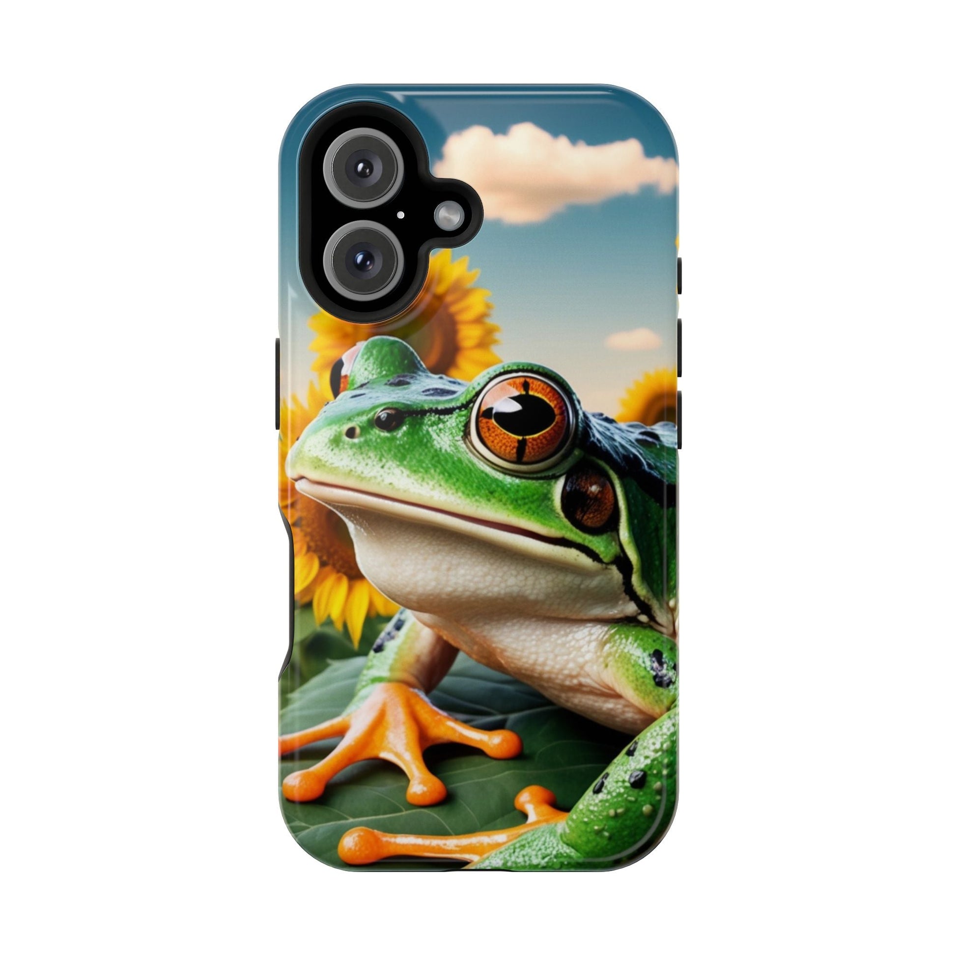 Let nature and sunshine inspire your daily vibe with the Sunflower Frog Aesthetic MagSafe iPhone Case! This beautifully detailed case showcases a lush, golden sunflower field with a realistic tree frog sitting among the leaves, bringing a whimsical yet elegant touch to your phone. Built with MagSafe-compatible magnets, it allows for fast, easy wireless charging while the shock-absorbing TPU bumper and raised edges keep your phone safe from drops and scratches.