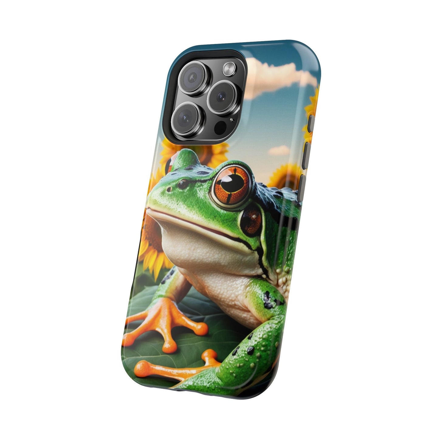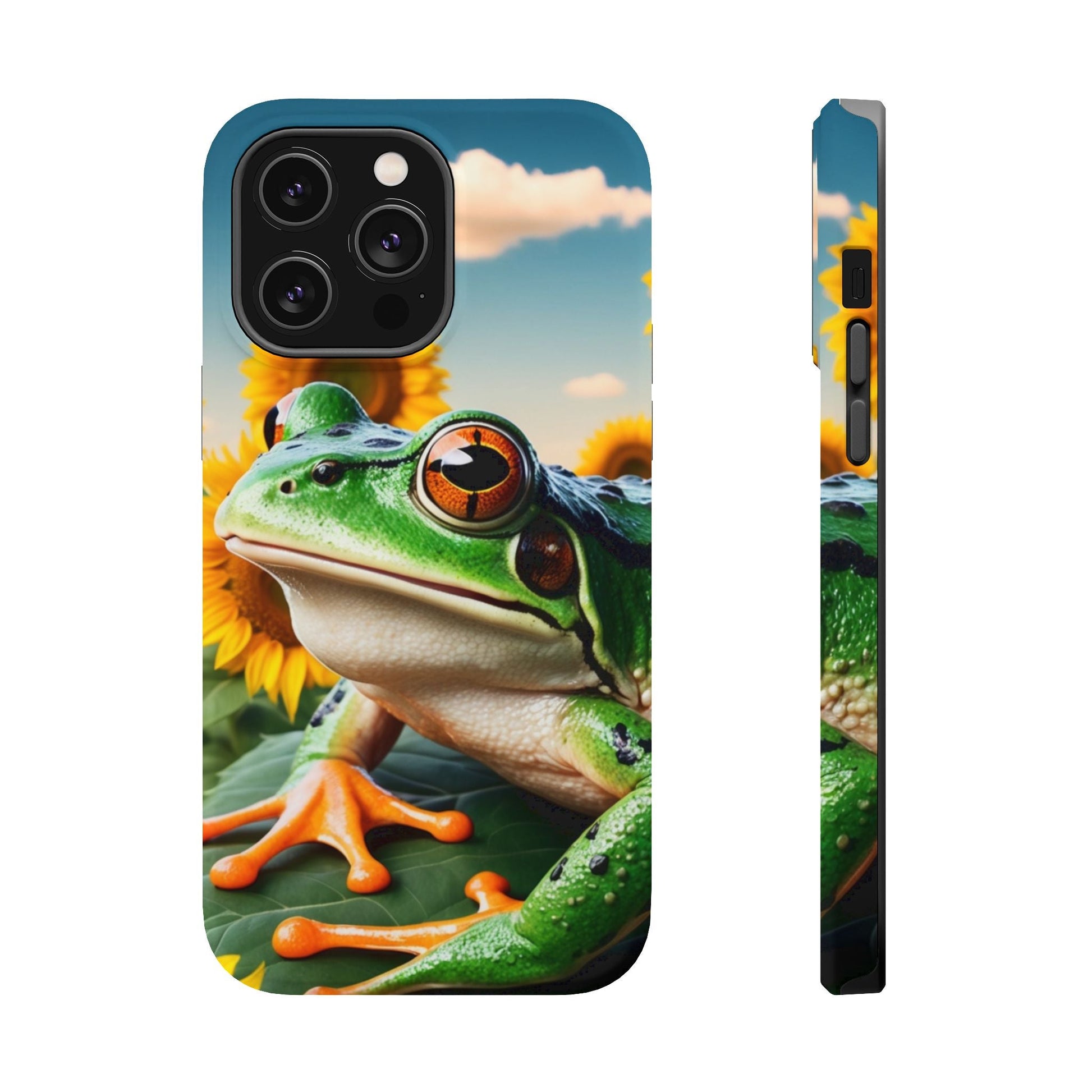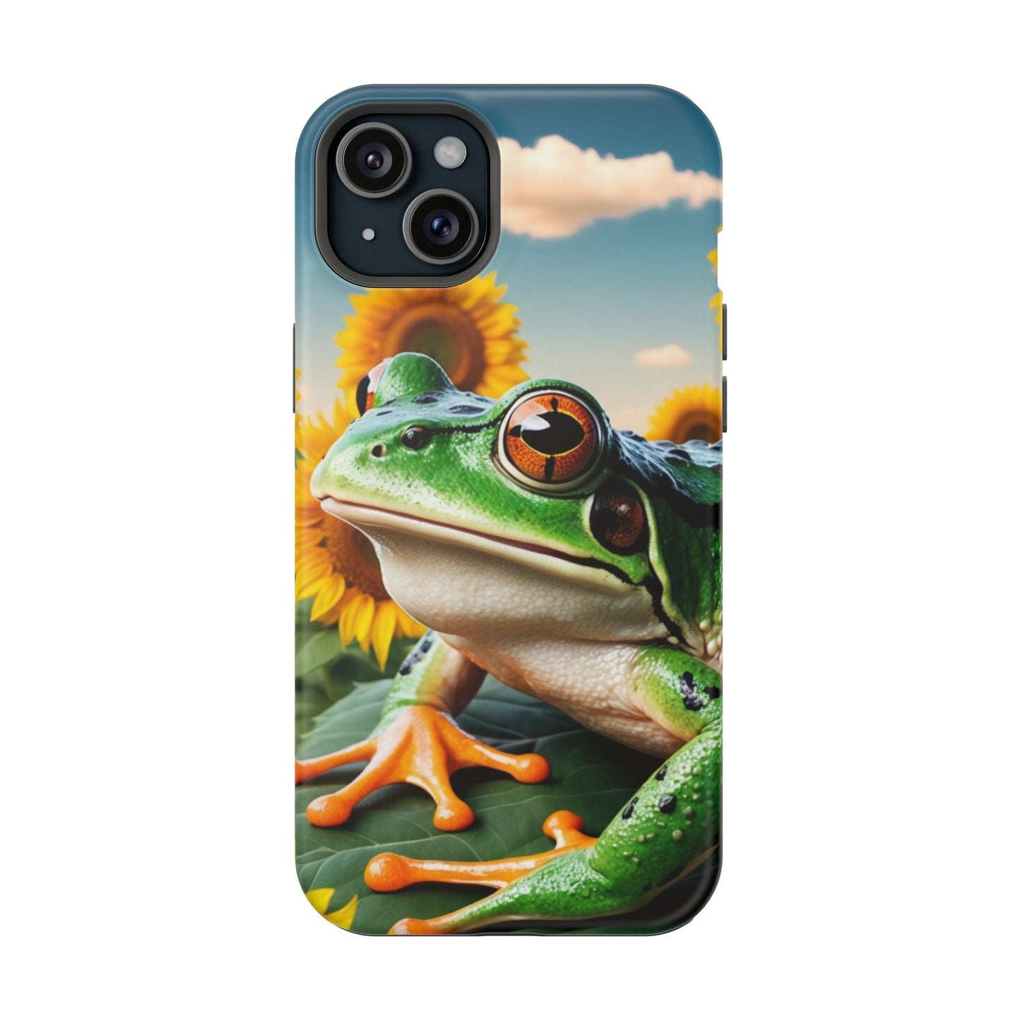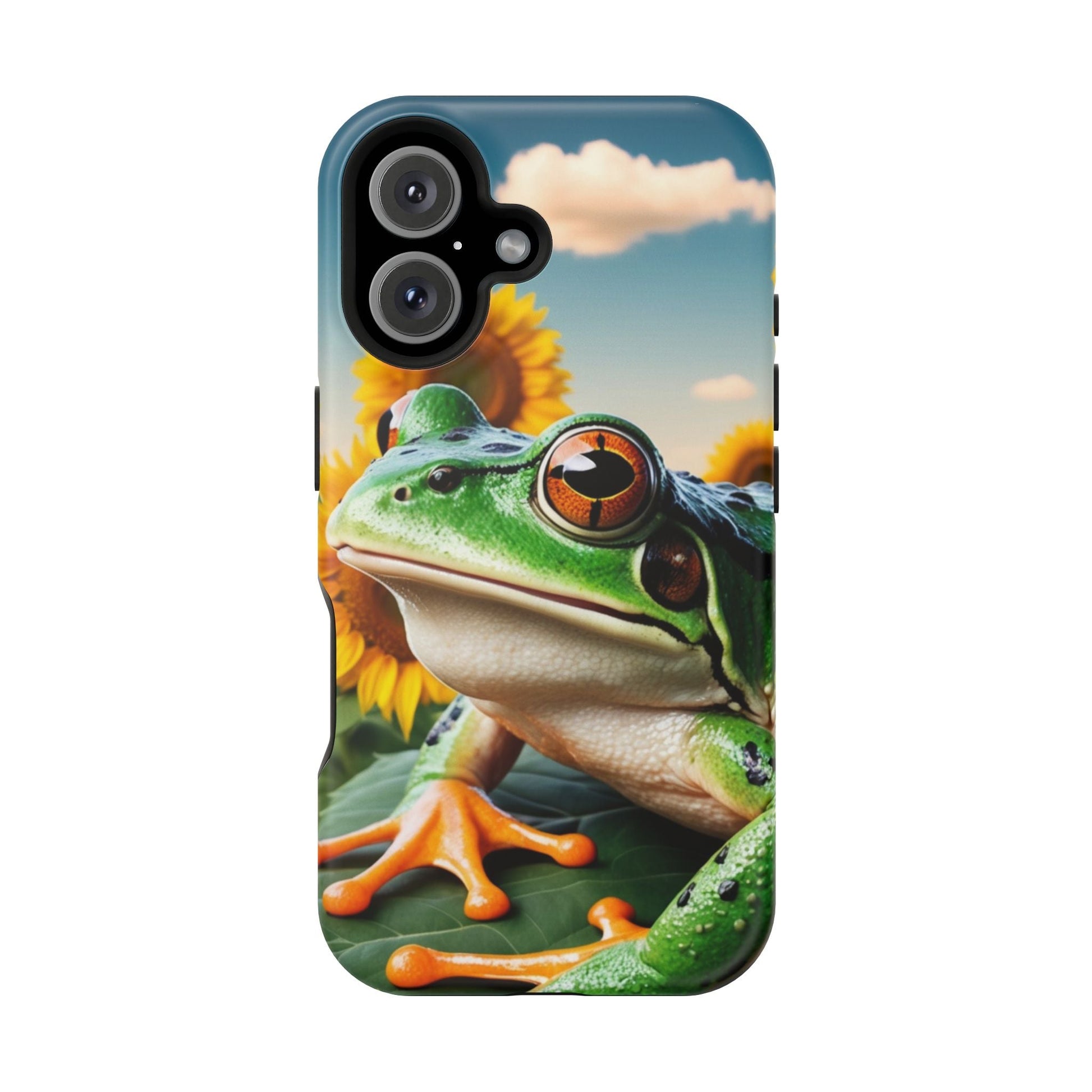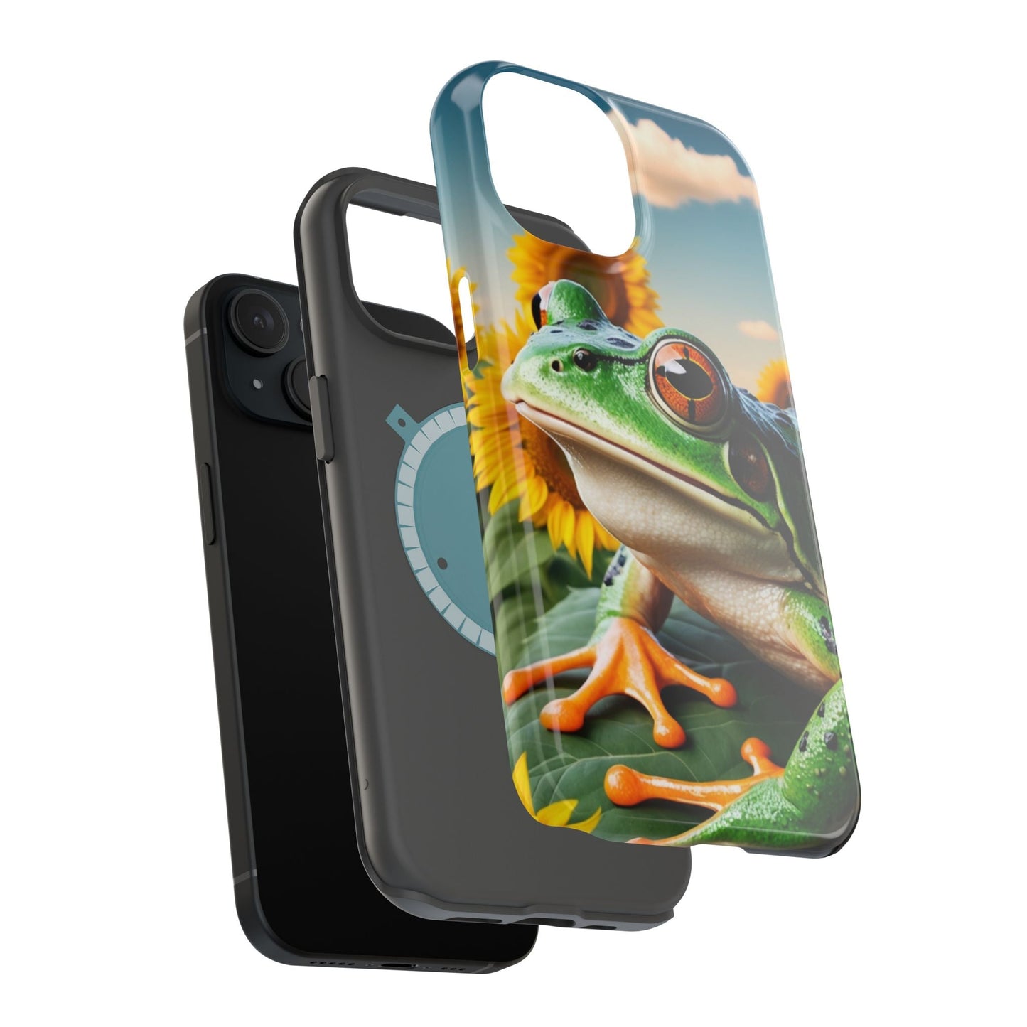 Let nature and sunshine inspire your daily vibe with the Sunflower Frog Aesthetic MagSafe iPhone Case! This beautifully detailed case showcases a lush, golden sunflower field with a realistic tree frog sitting among the leaves, bringing a whimsical yet elegant touch to your phone. Built with MagSafe-compatible magnets, it allows for fast, easy wireless charging while the shock-absorbing TPU bumper and raised edges keep your phone safe from drops and scratches.